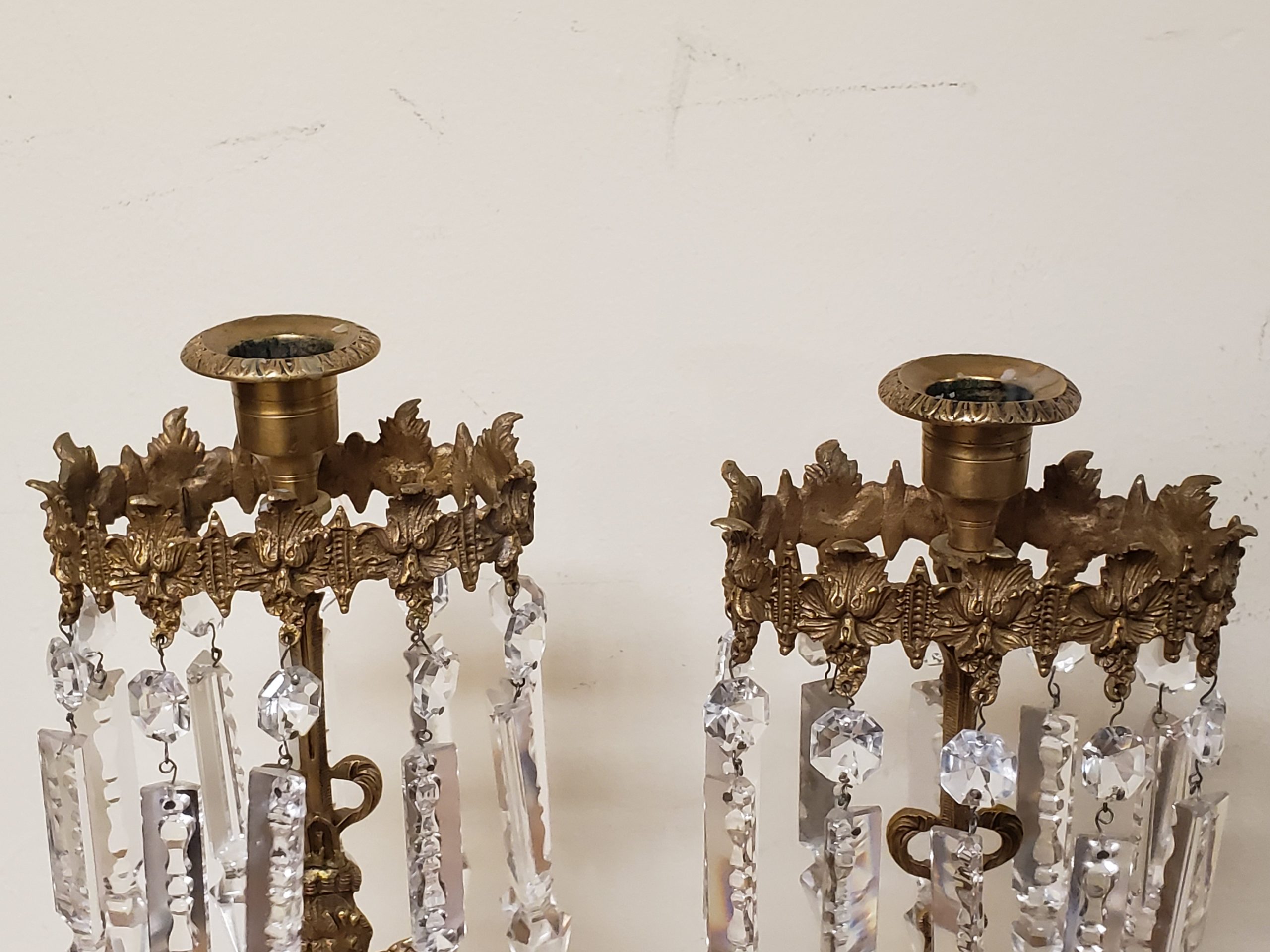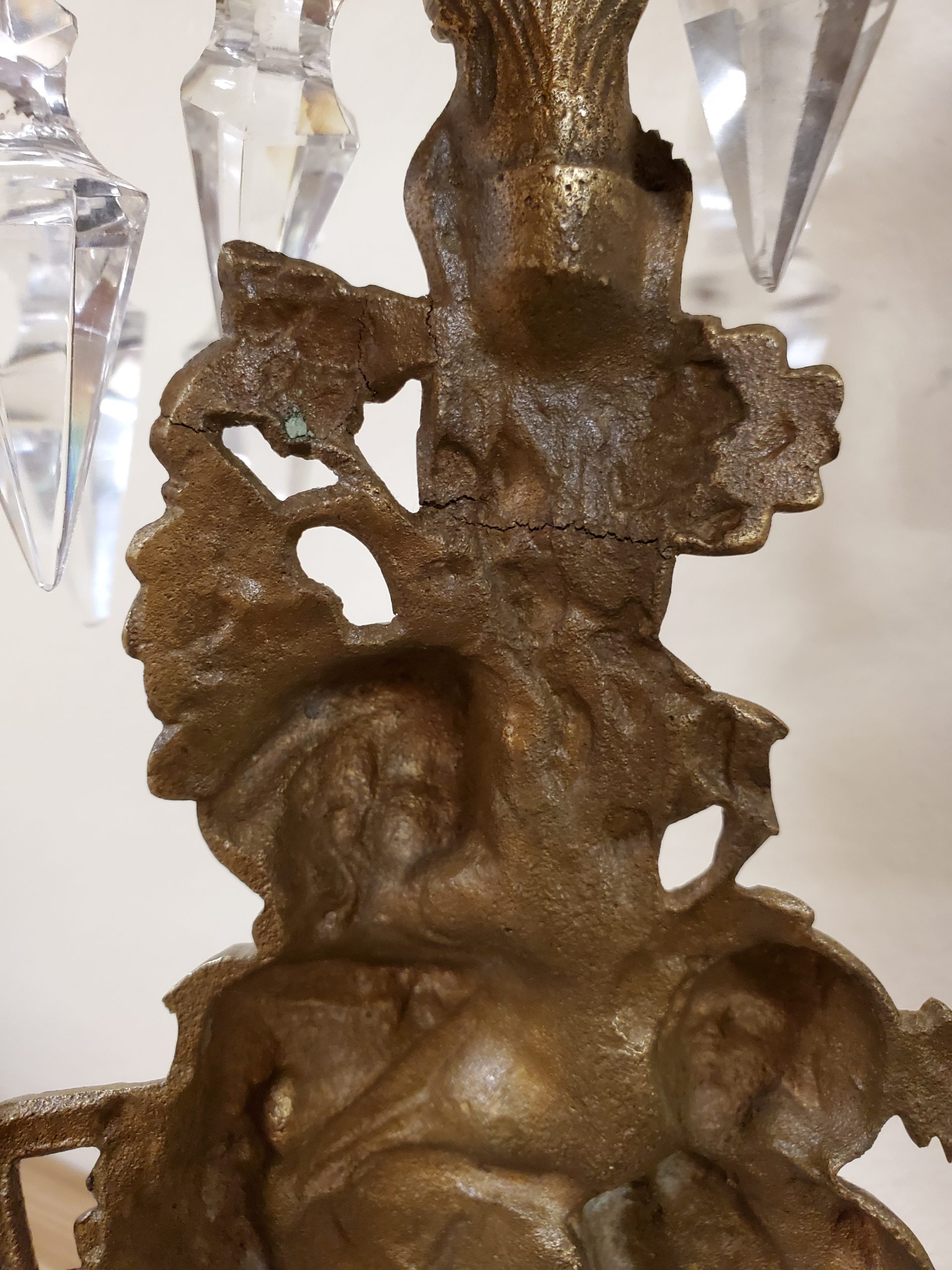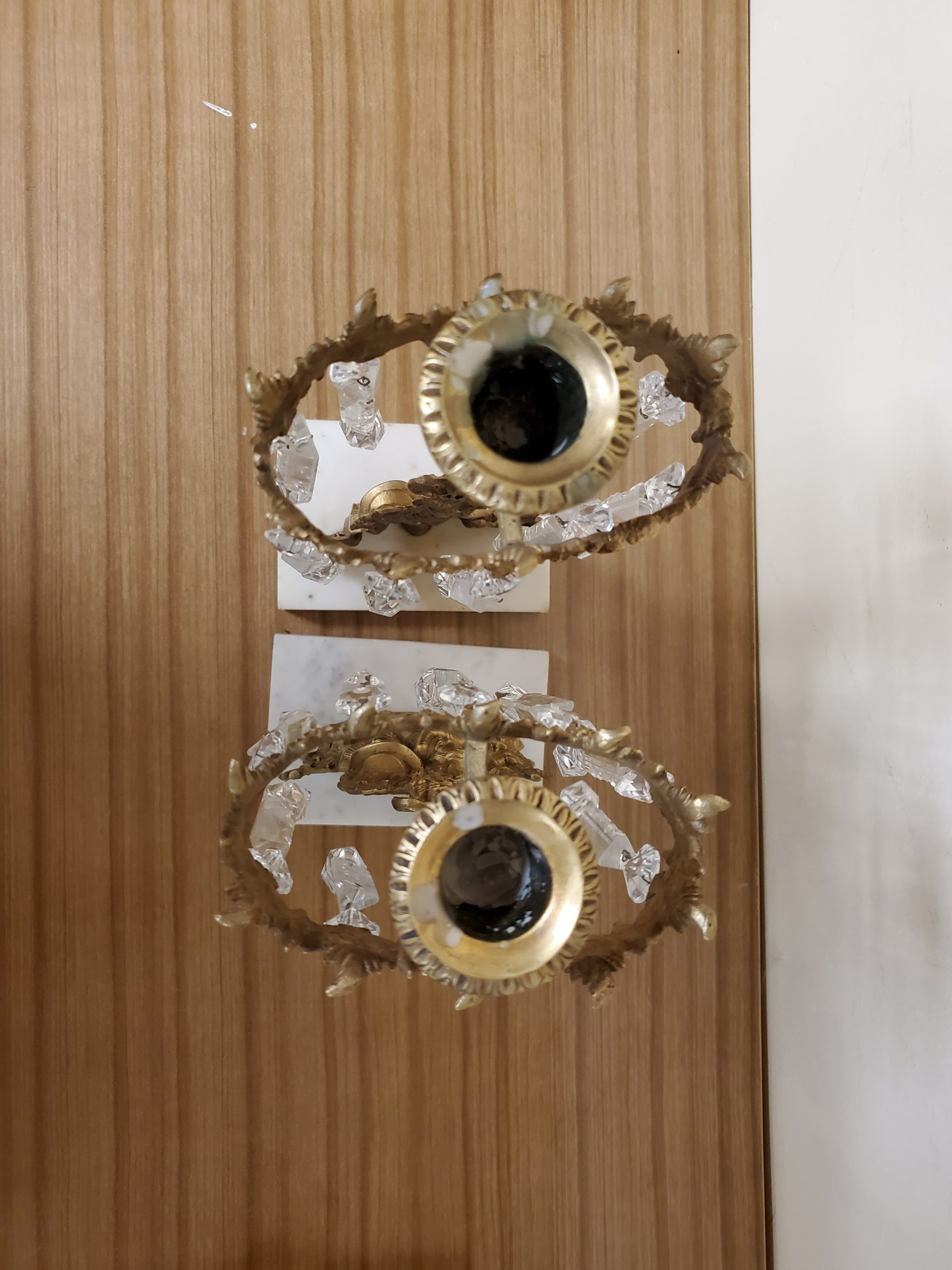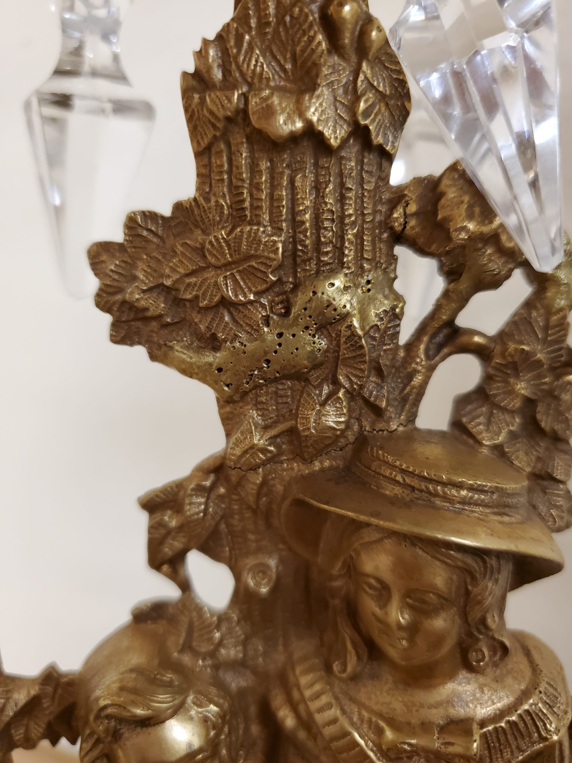 Antique pair of Victorian brass candelabras (candle holders) figural gilt metal girandole depicting a couple leaning against a trellis fence, that reaches up to form the encircled top with hanging crystal prisms, on white marble base. From the late 19th century.