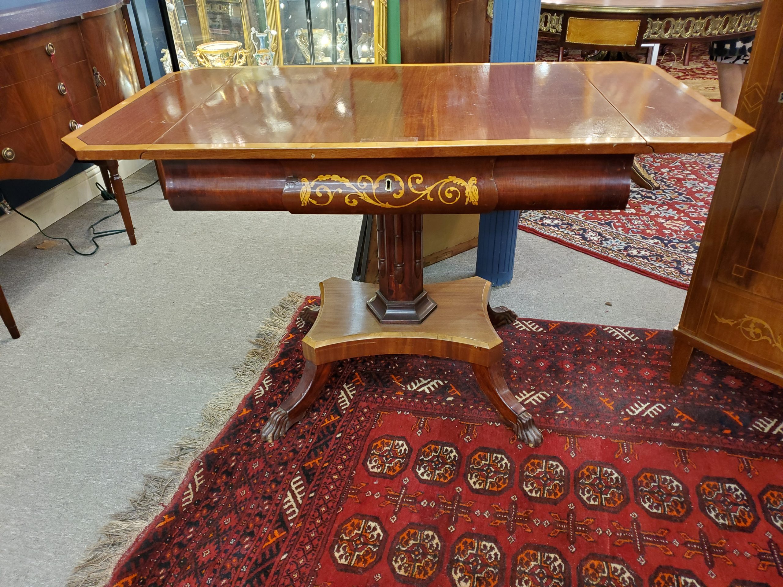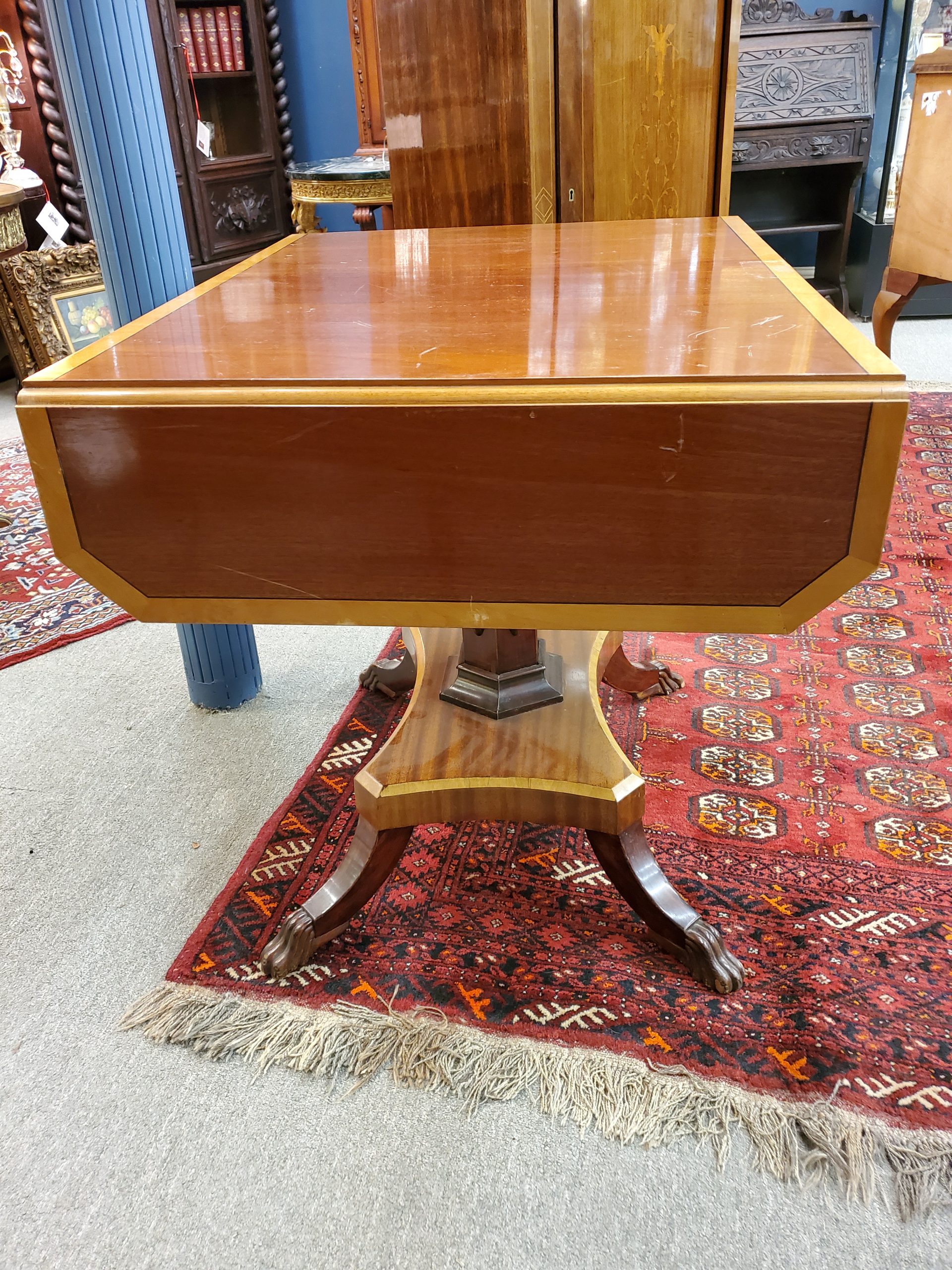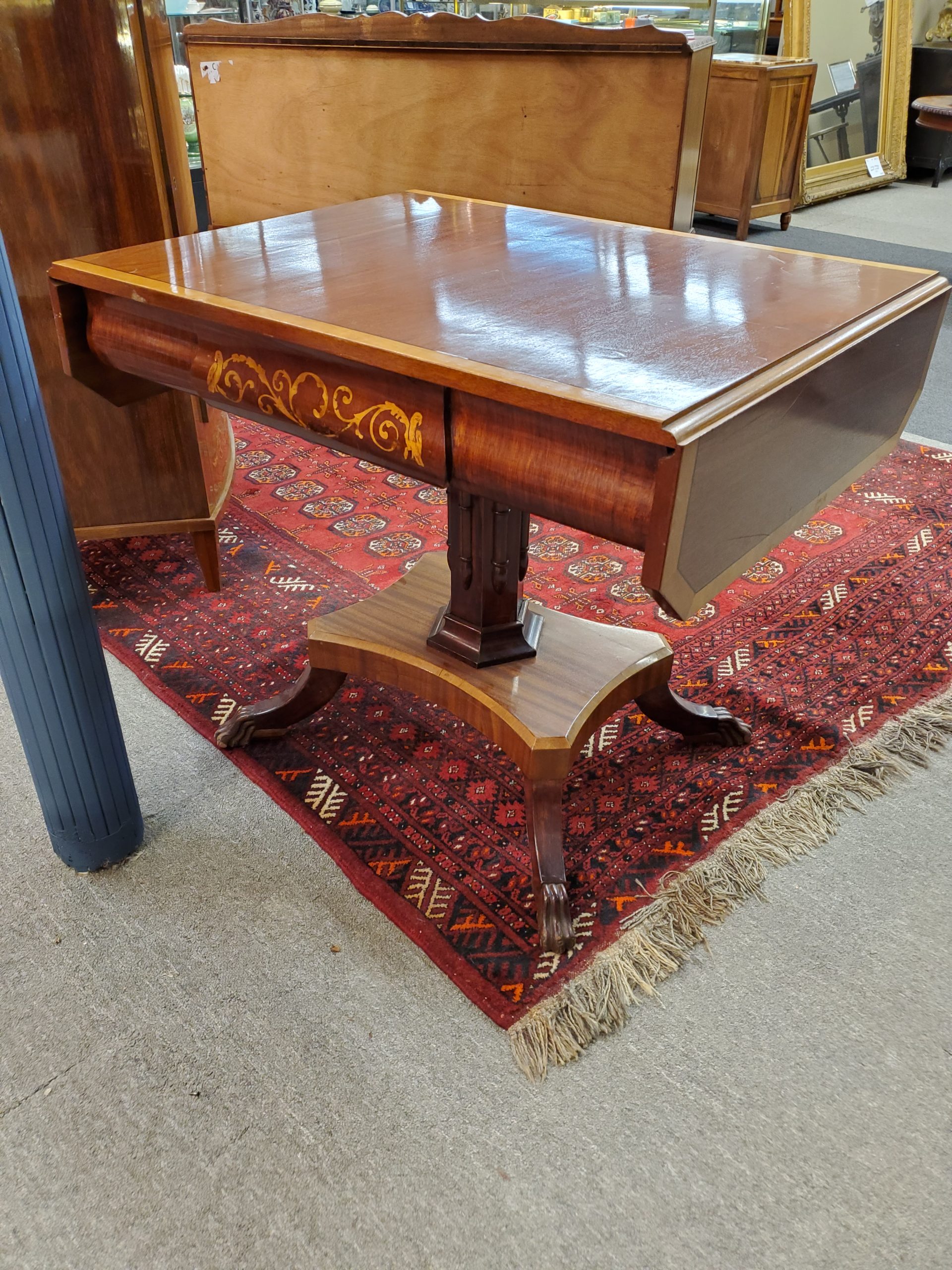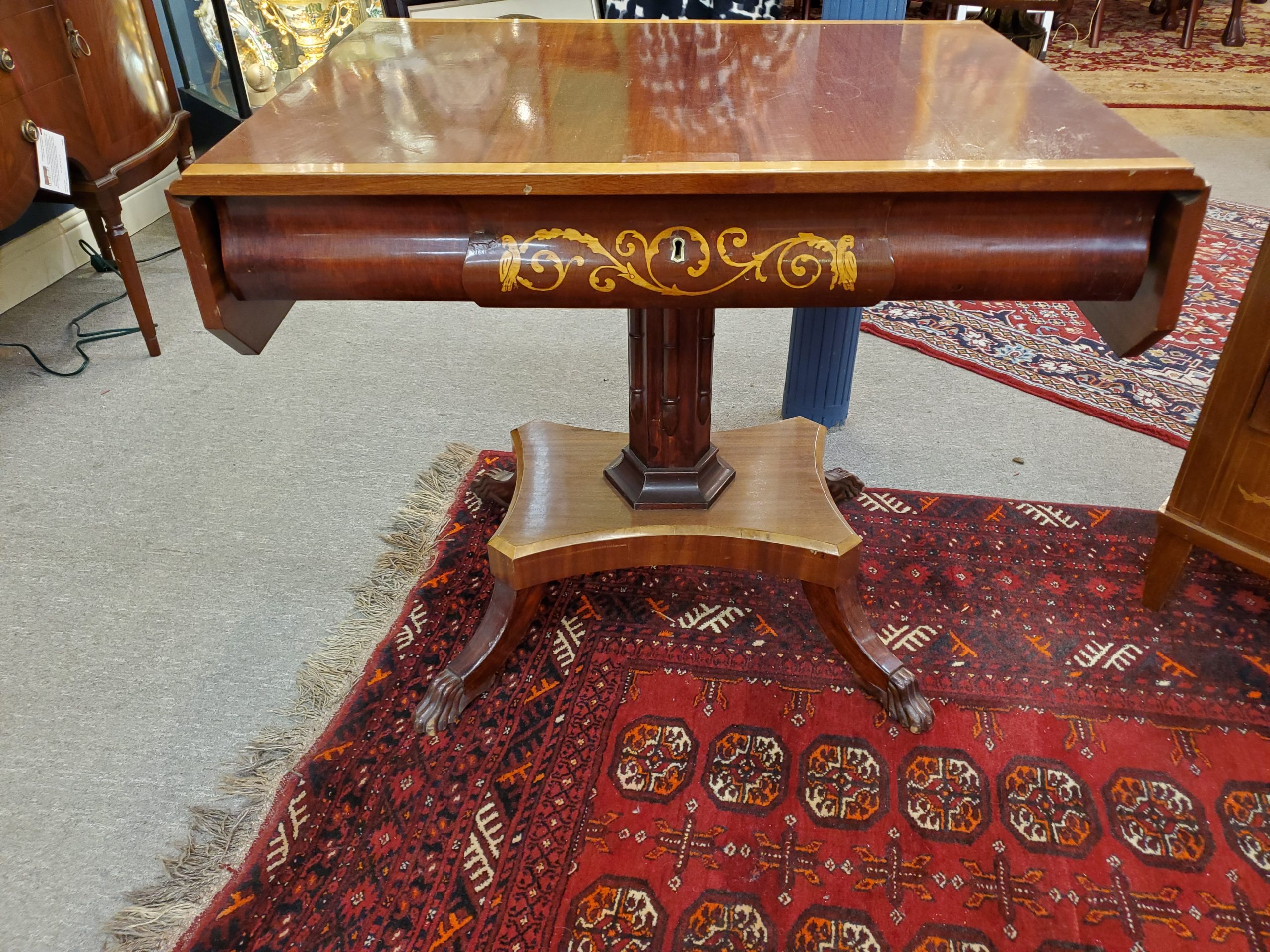 Antique regency style mahogany Pembroke table with inlaid top, front, and back, single dovetail drawer, the leaves have a wooden support underneath, the top is supported by a pedestal that rests on a platform, ending in paw feet.