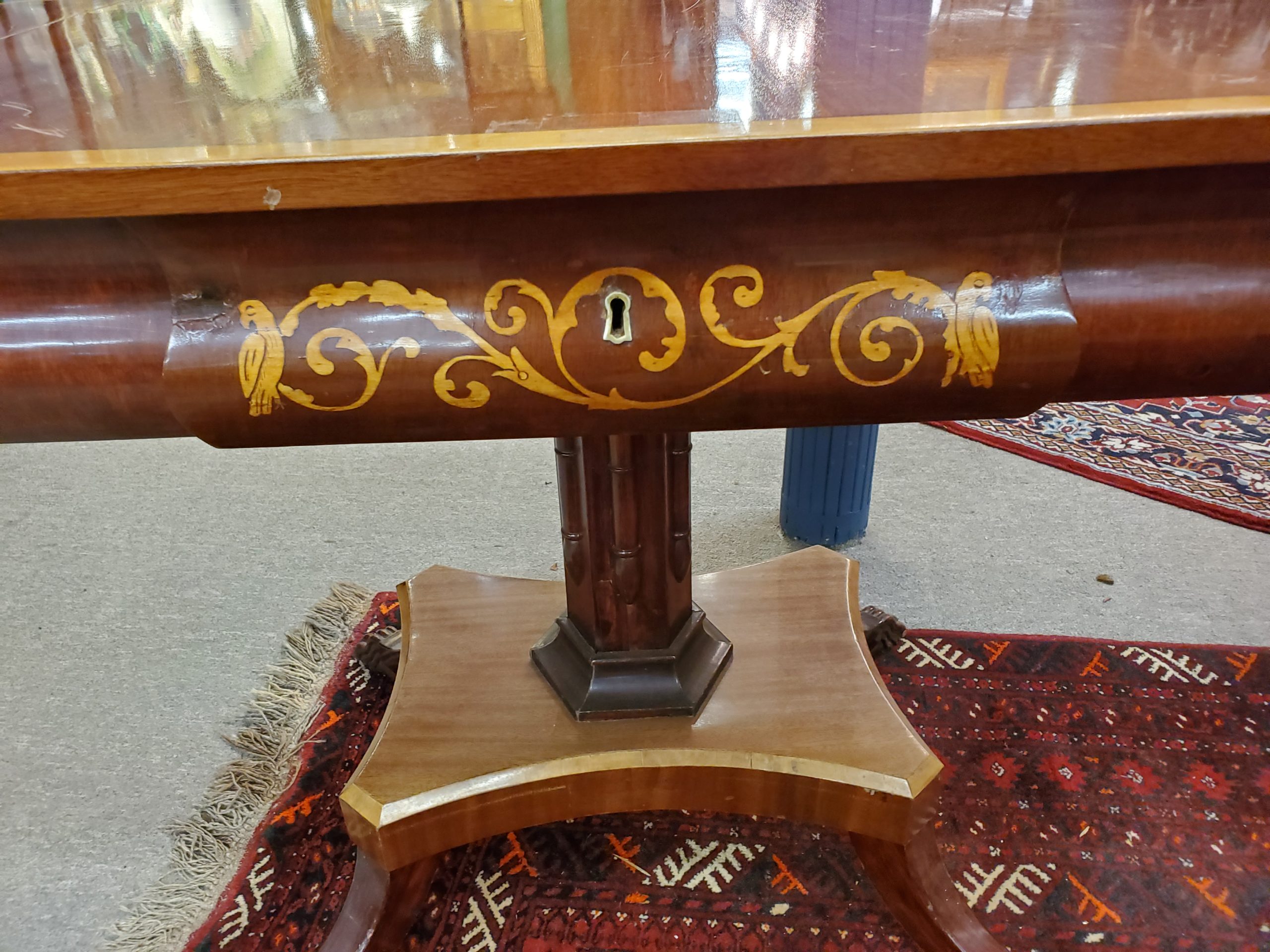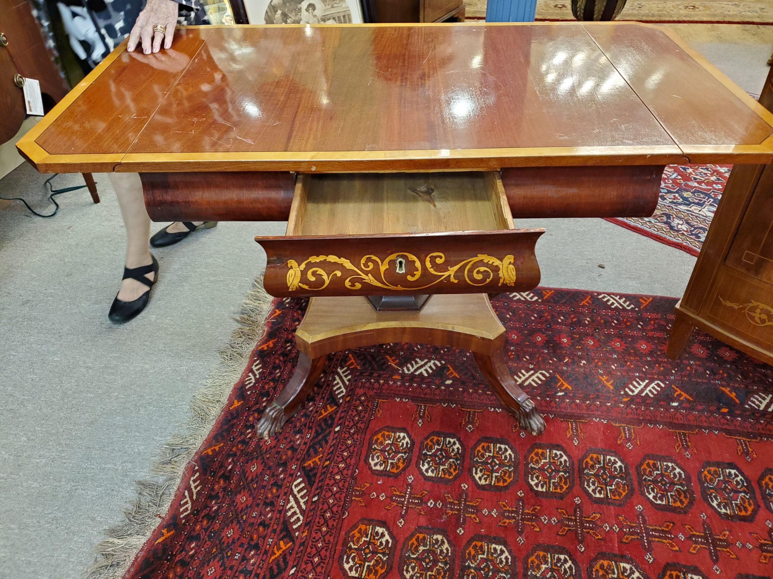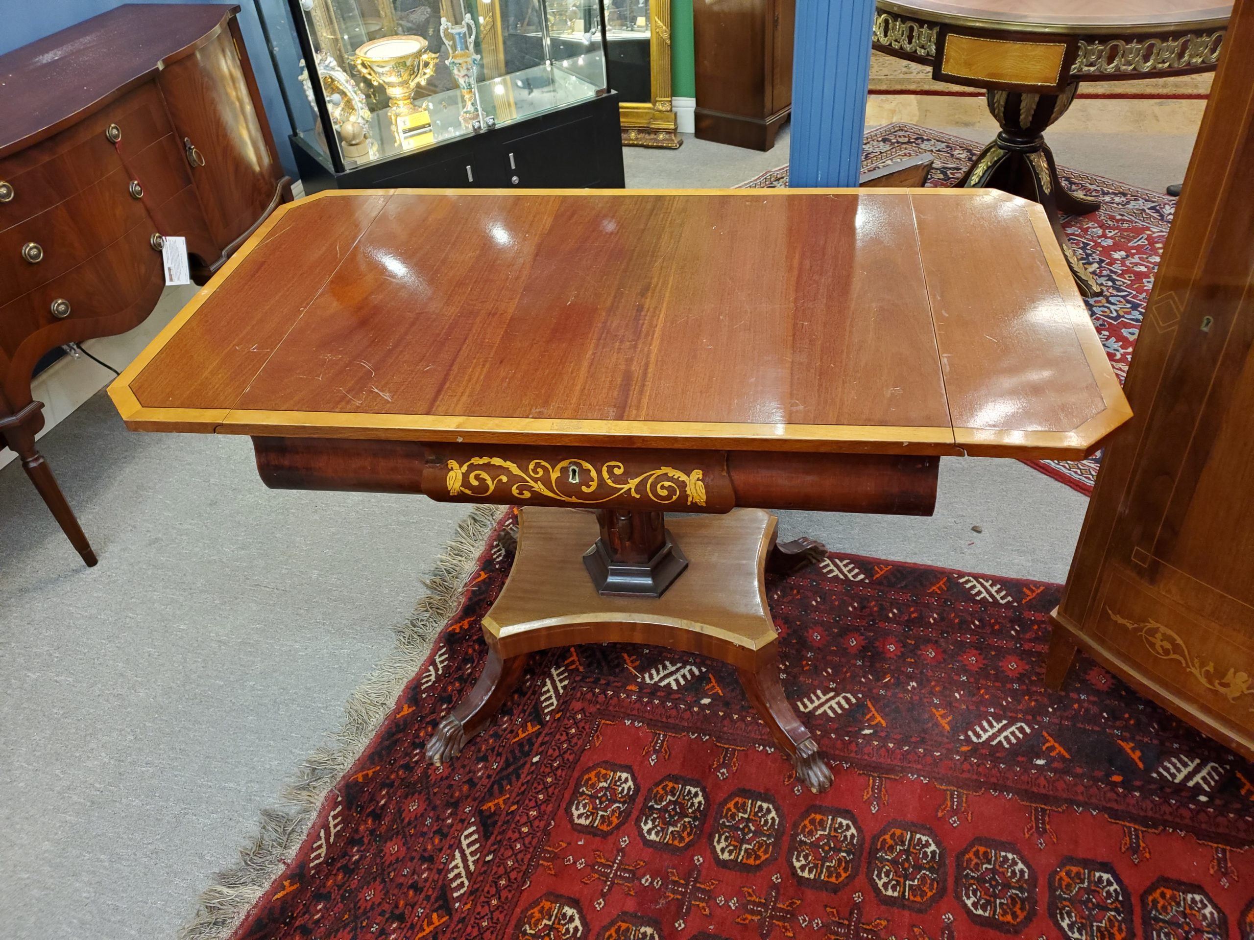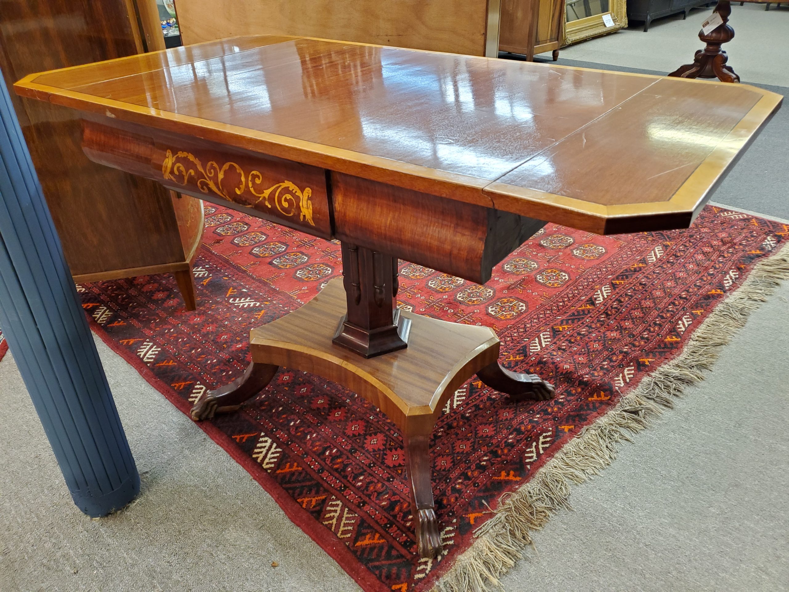 Antique regency style mahogany Pembroke table with inlaid top, front, and back, single dovetail drawer, the leaves have a wooden support underneath, the top is supported by a pedestal that rests on a platform, ending in paw feet.