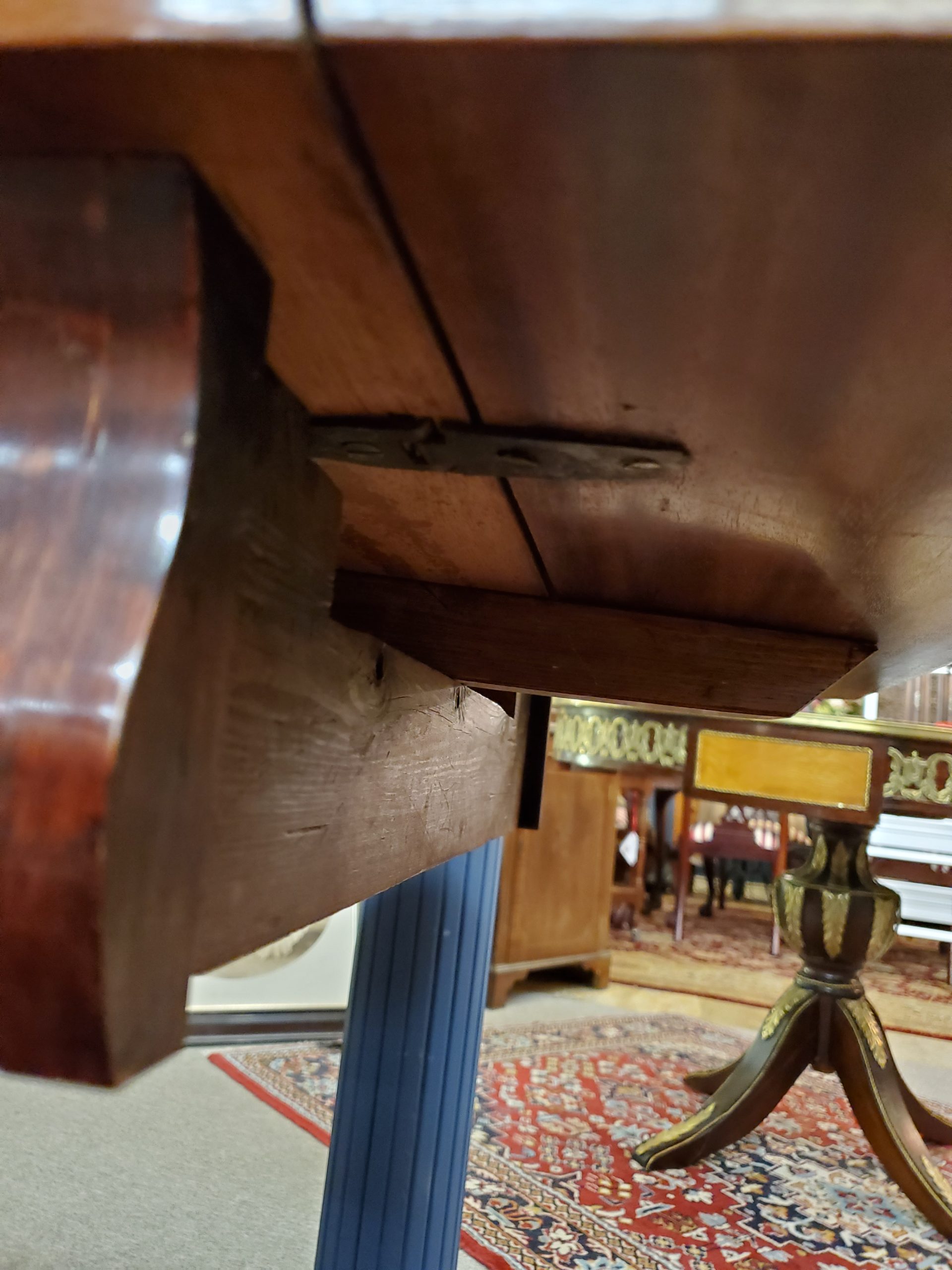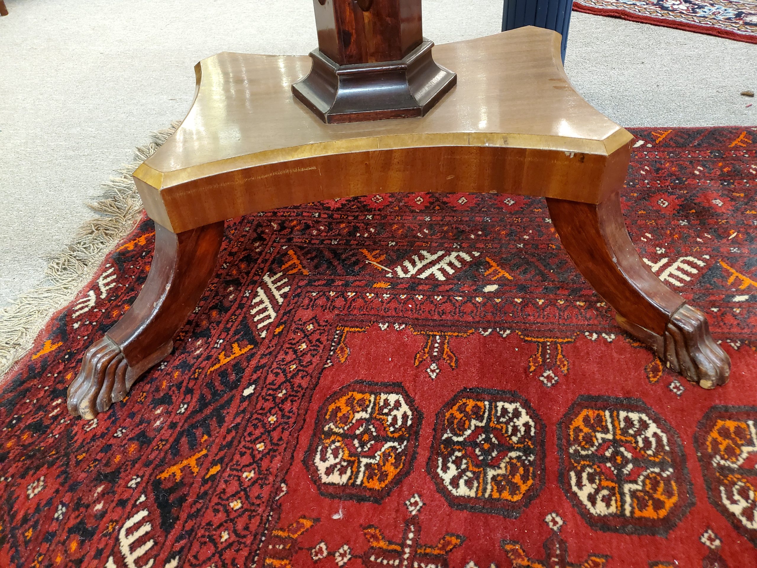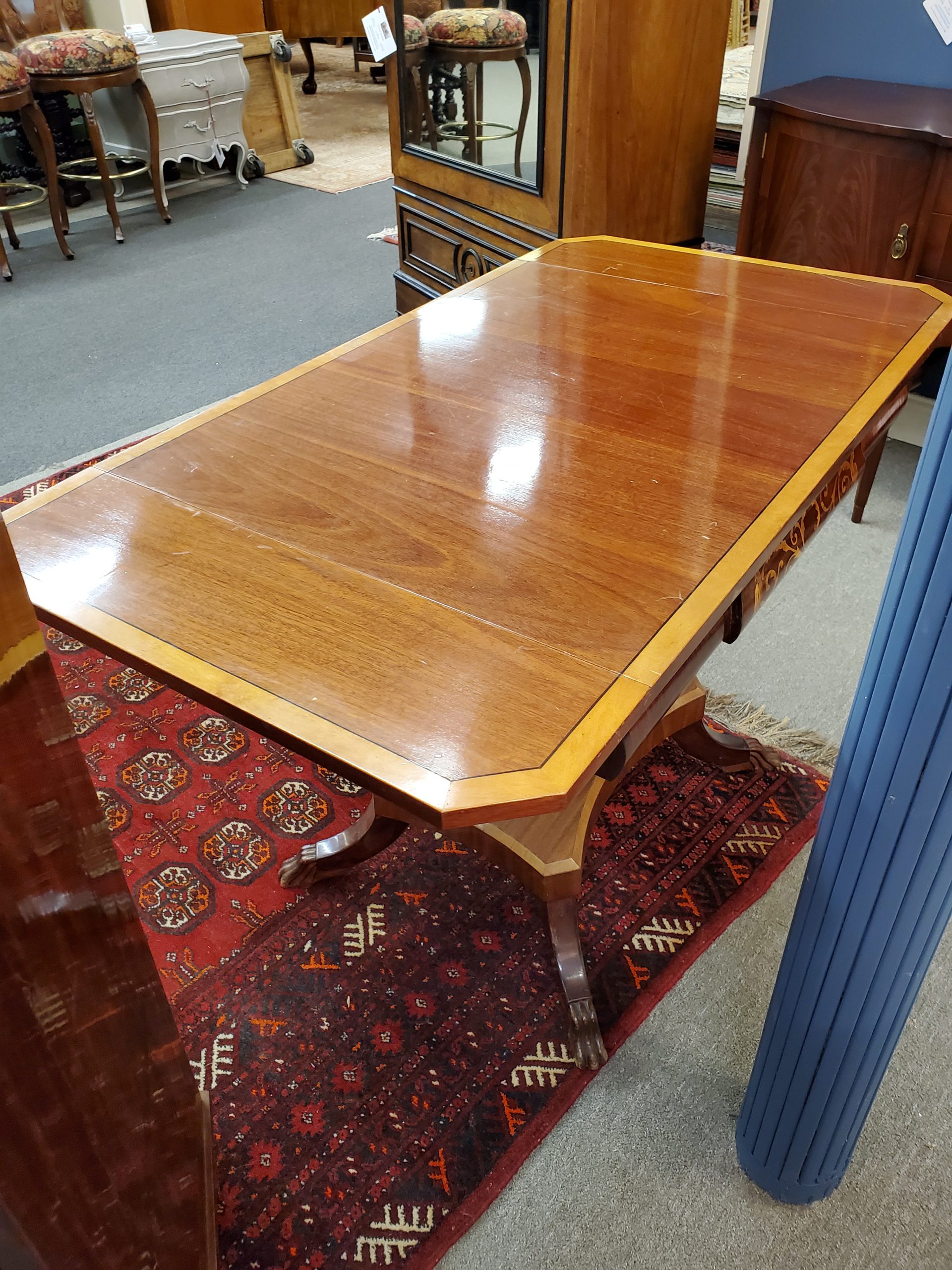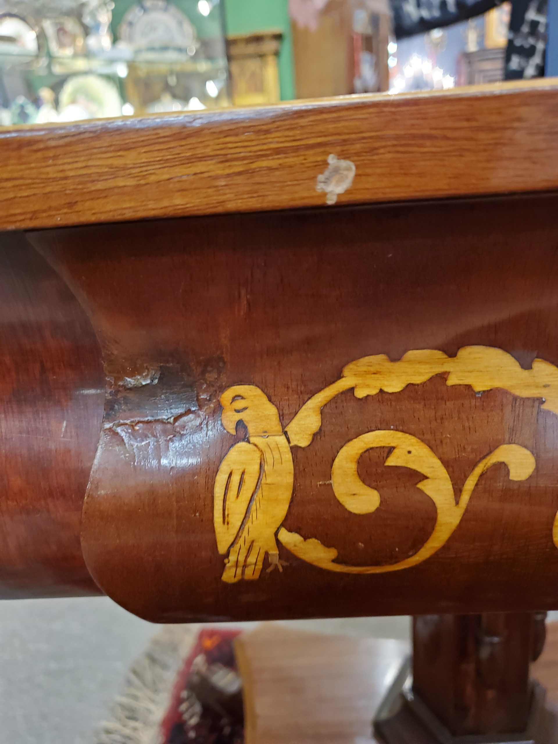 Antique regency style mahogany Pembroke table with inlaid top, front, and back, single dovetail drawer, the leaves have a wooden support underneath, the top is supported by a pedestal that rests on a platform, ending in paw feet.