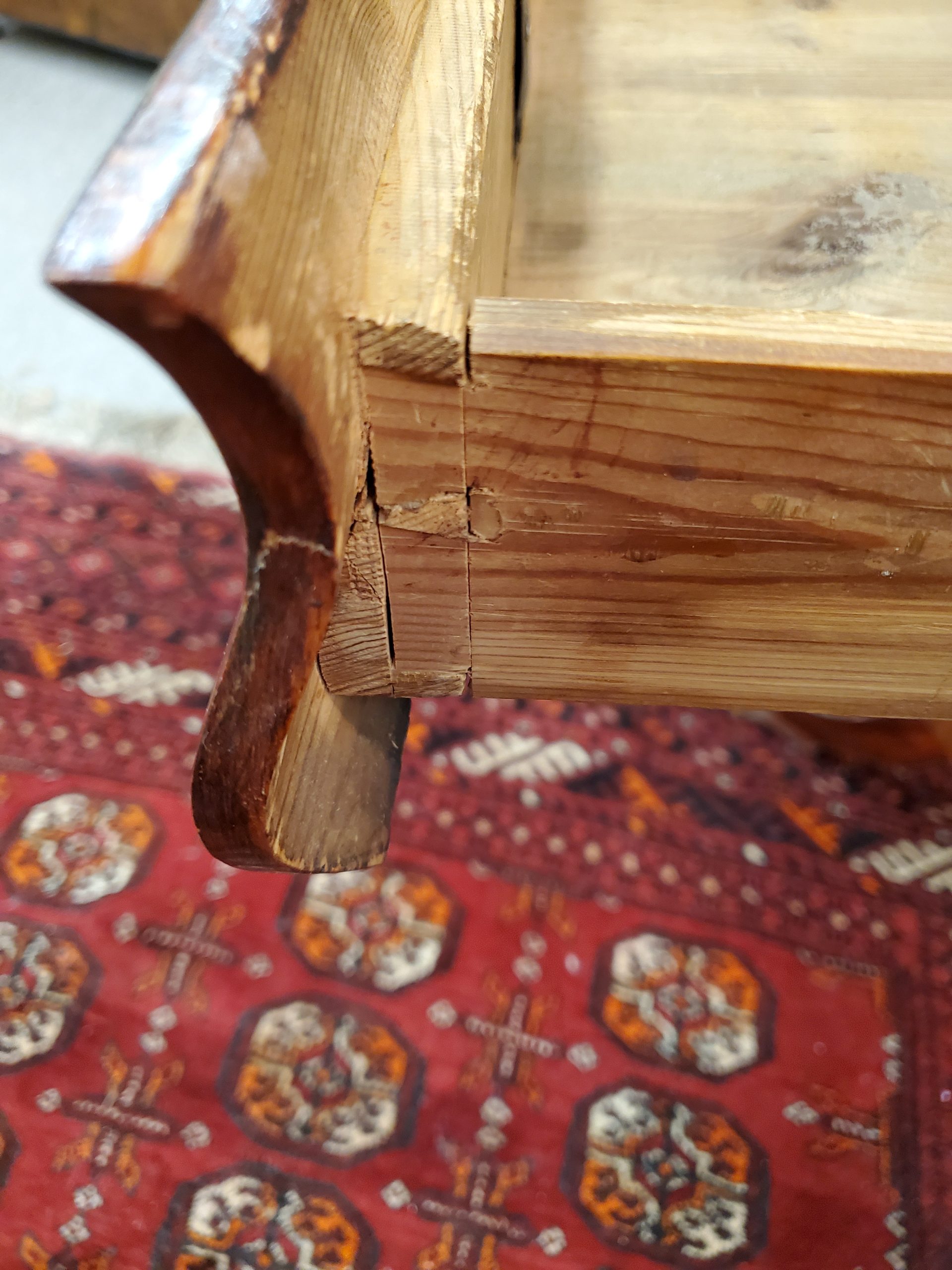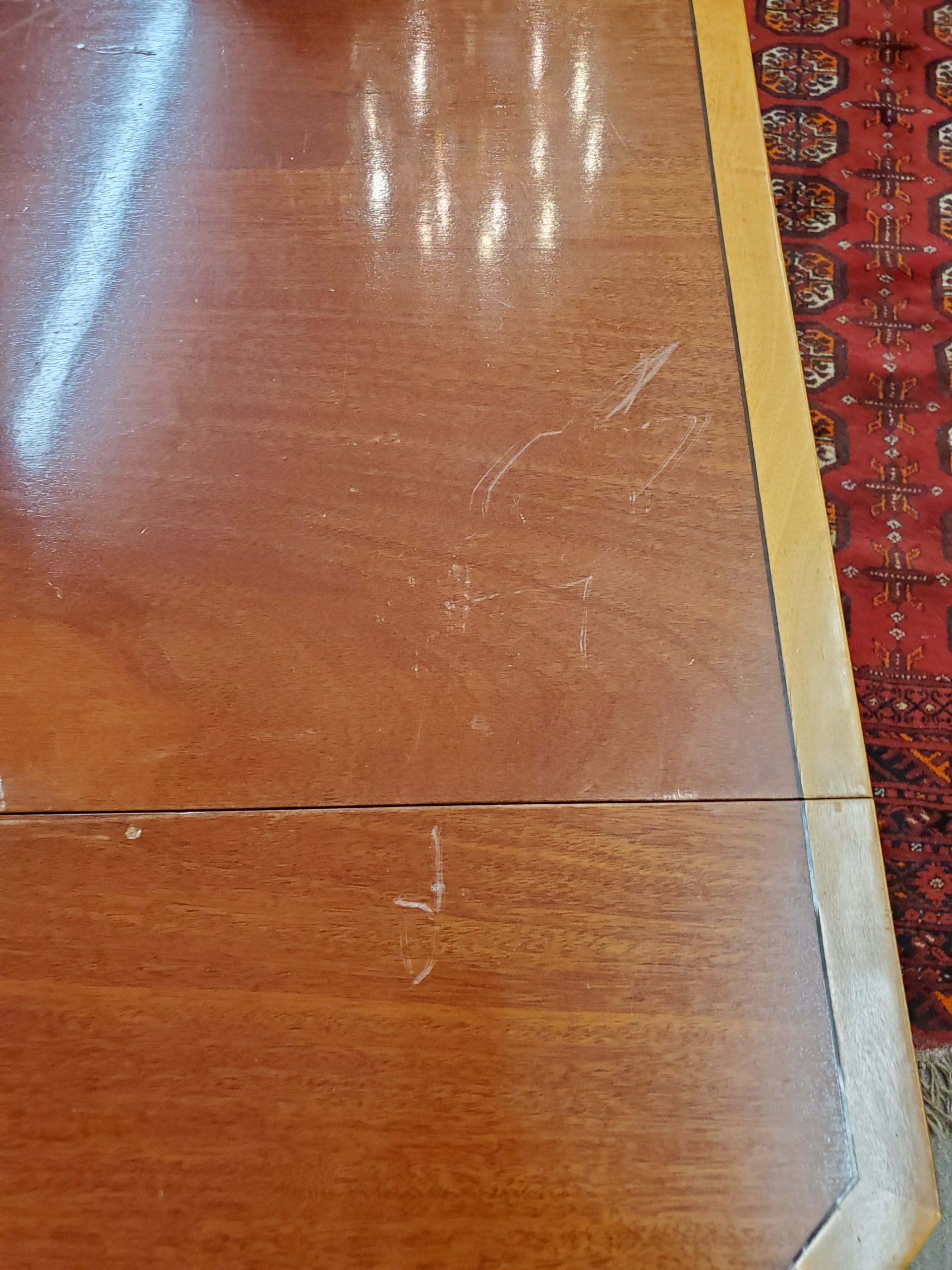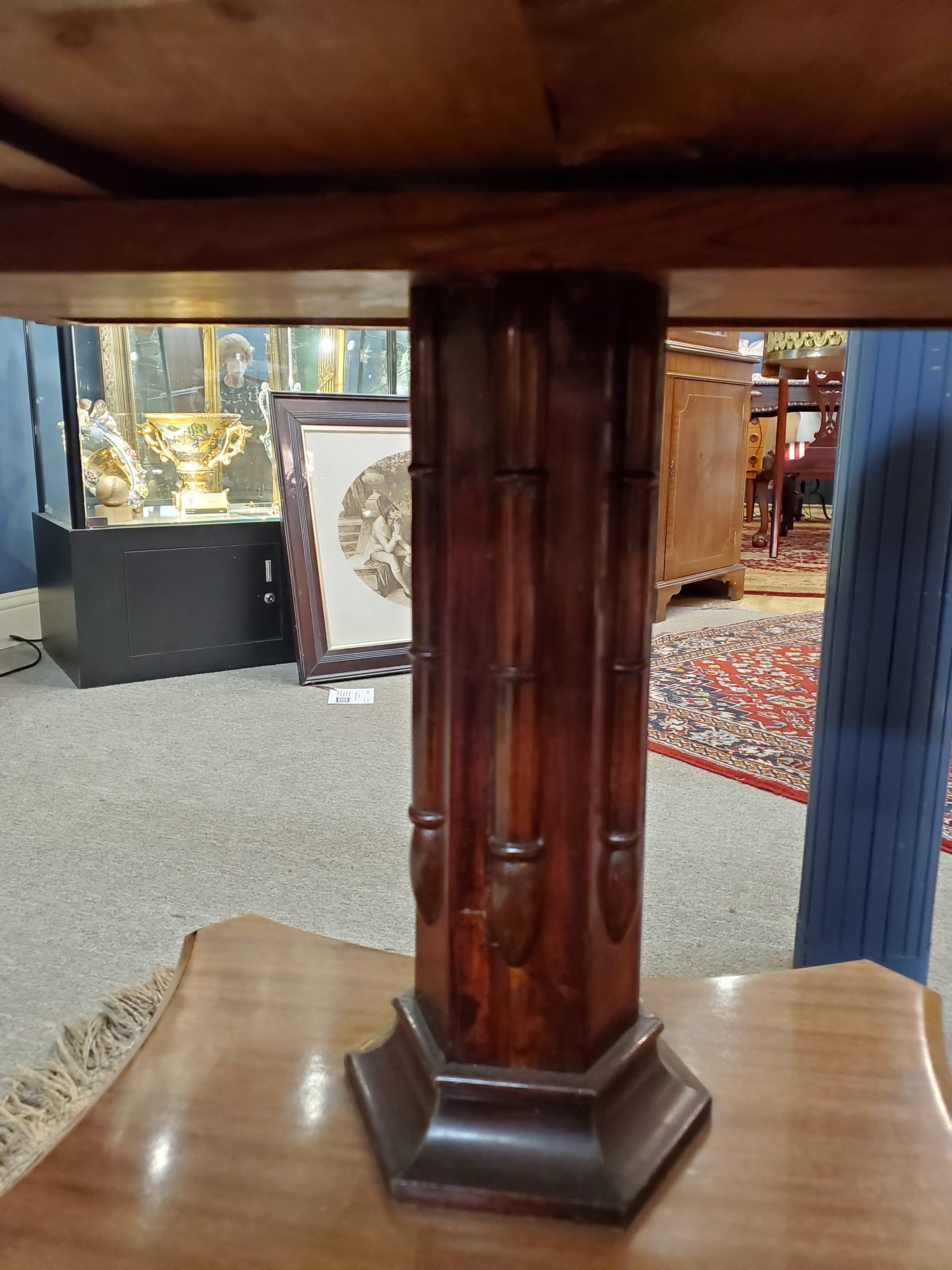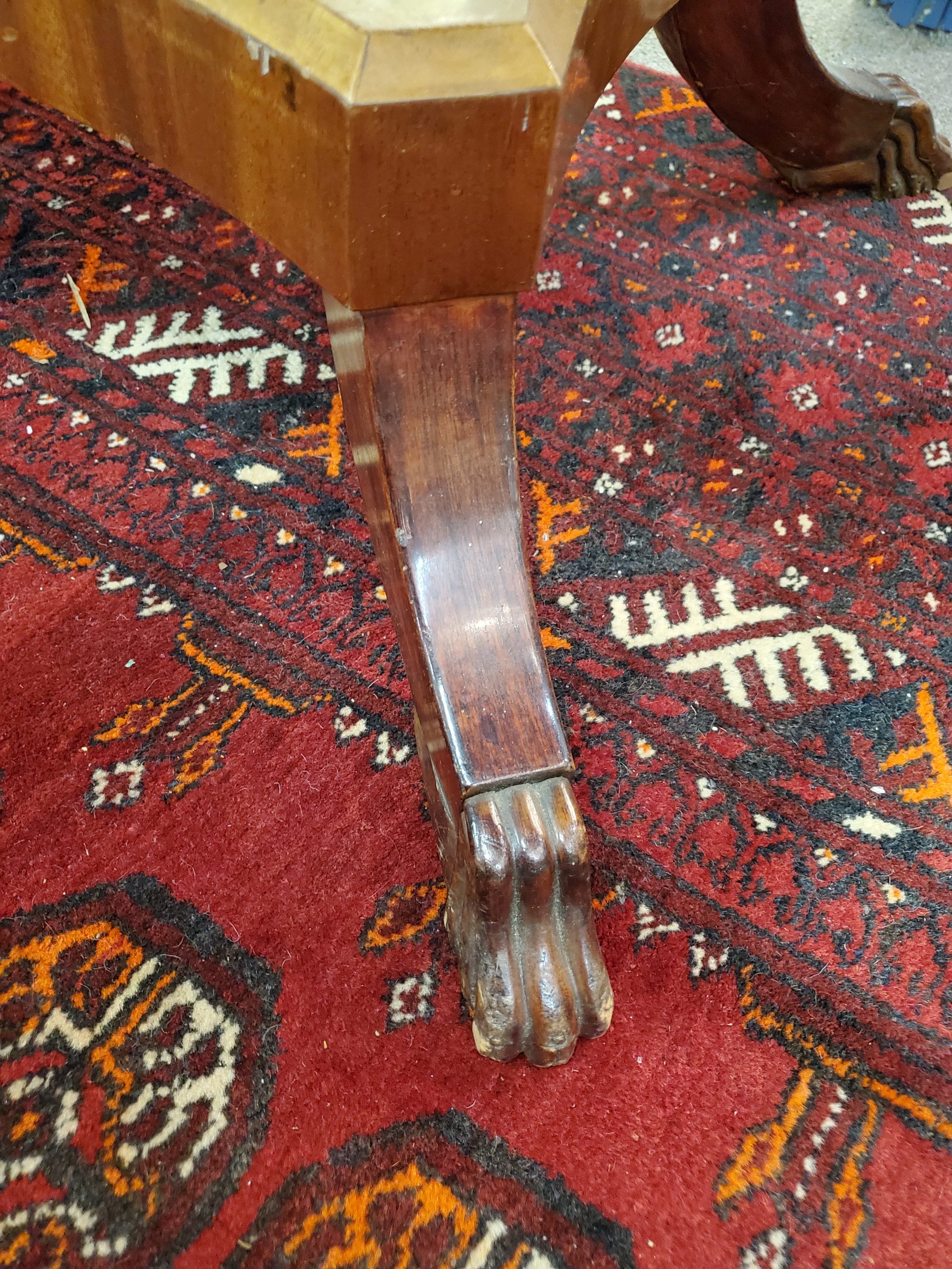 Antique regency style mahogany Pembroke table with inlaid top, front, and back, single dovetail drawer, the leaves have a wooden support underneath, the top is supported by a pedestal that rests on a platform, ending in paw feet.