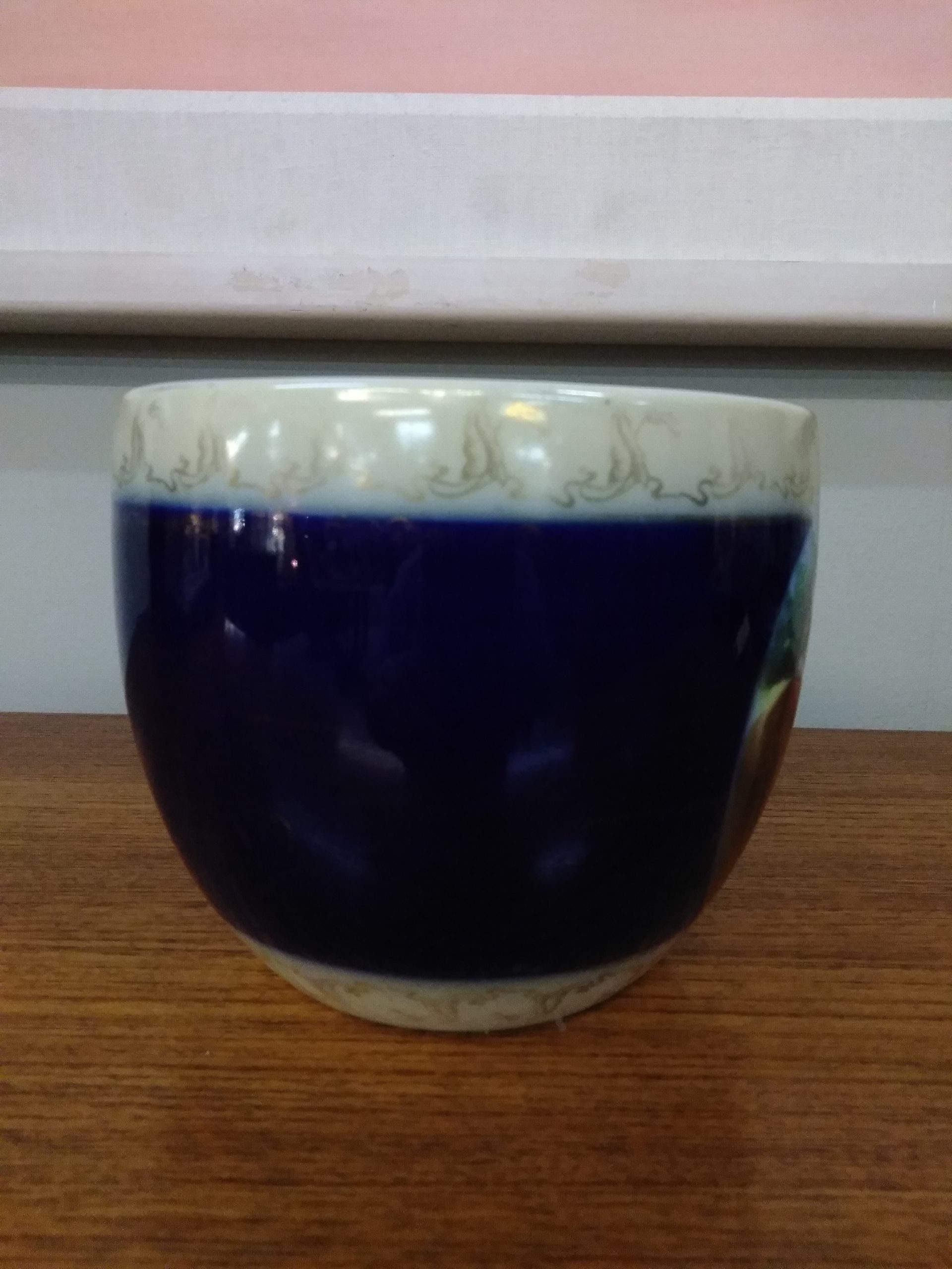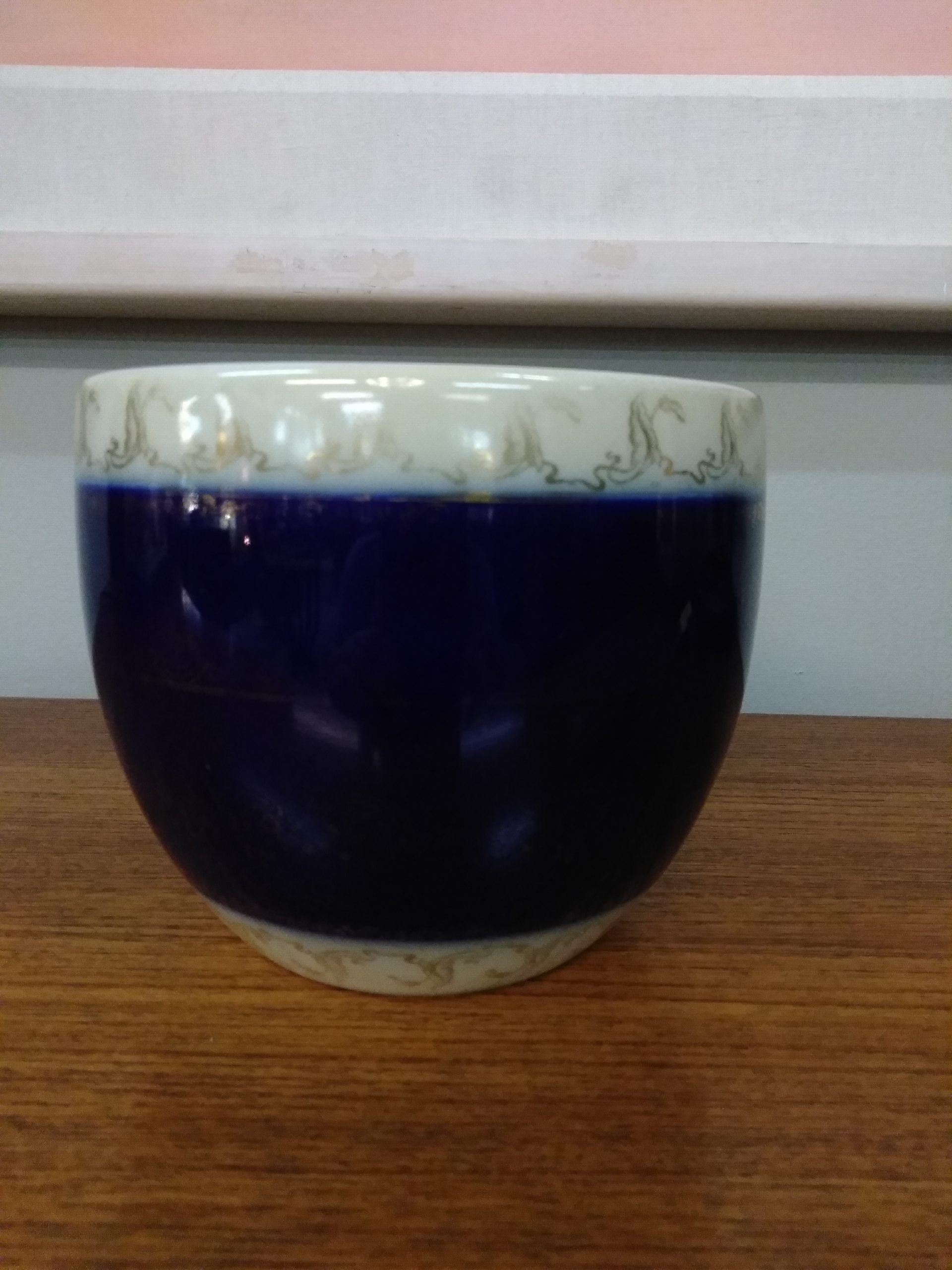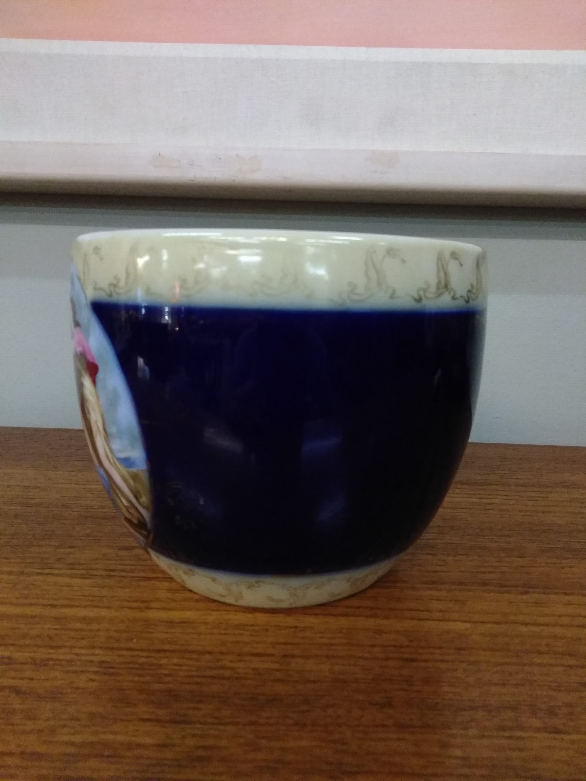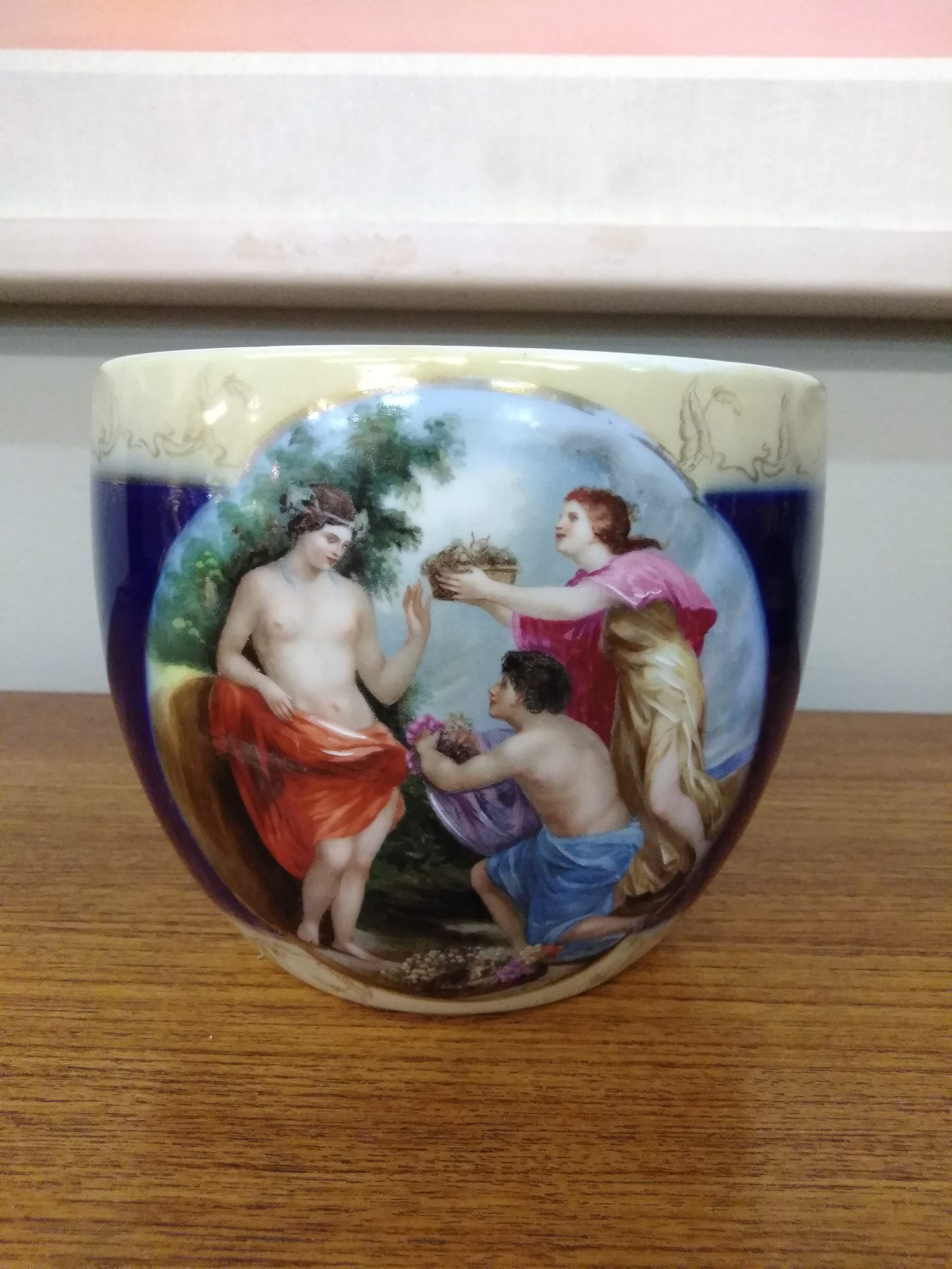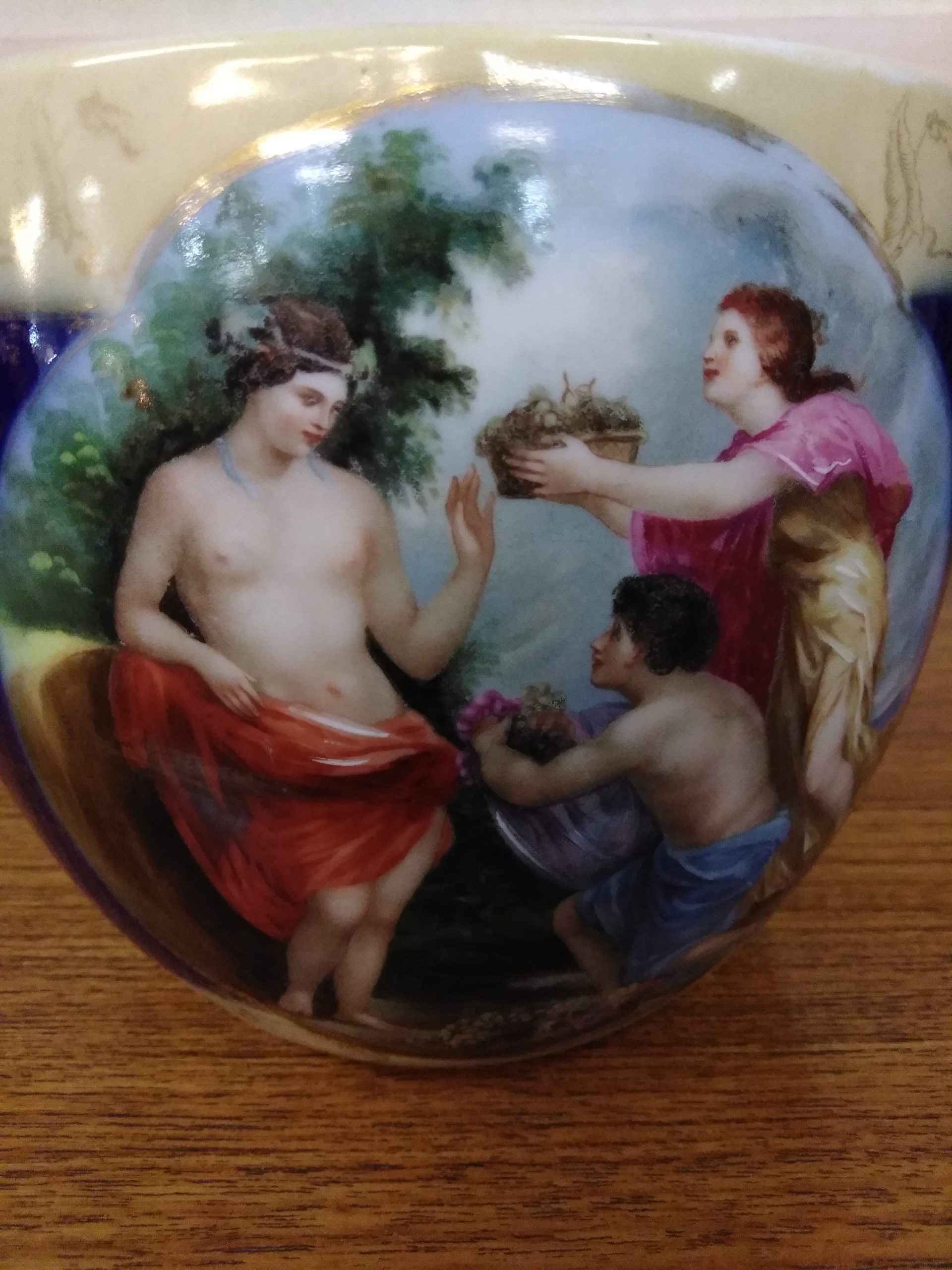 Beautiful antique Royal Vienna porcelain bowl with gold details and cobalt blue background.