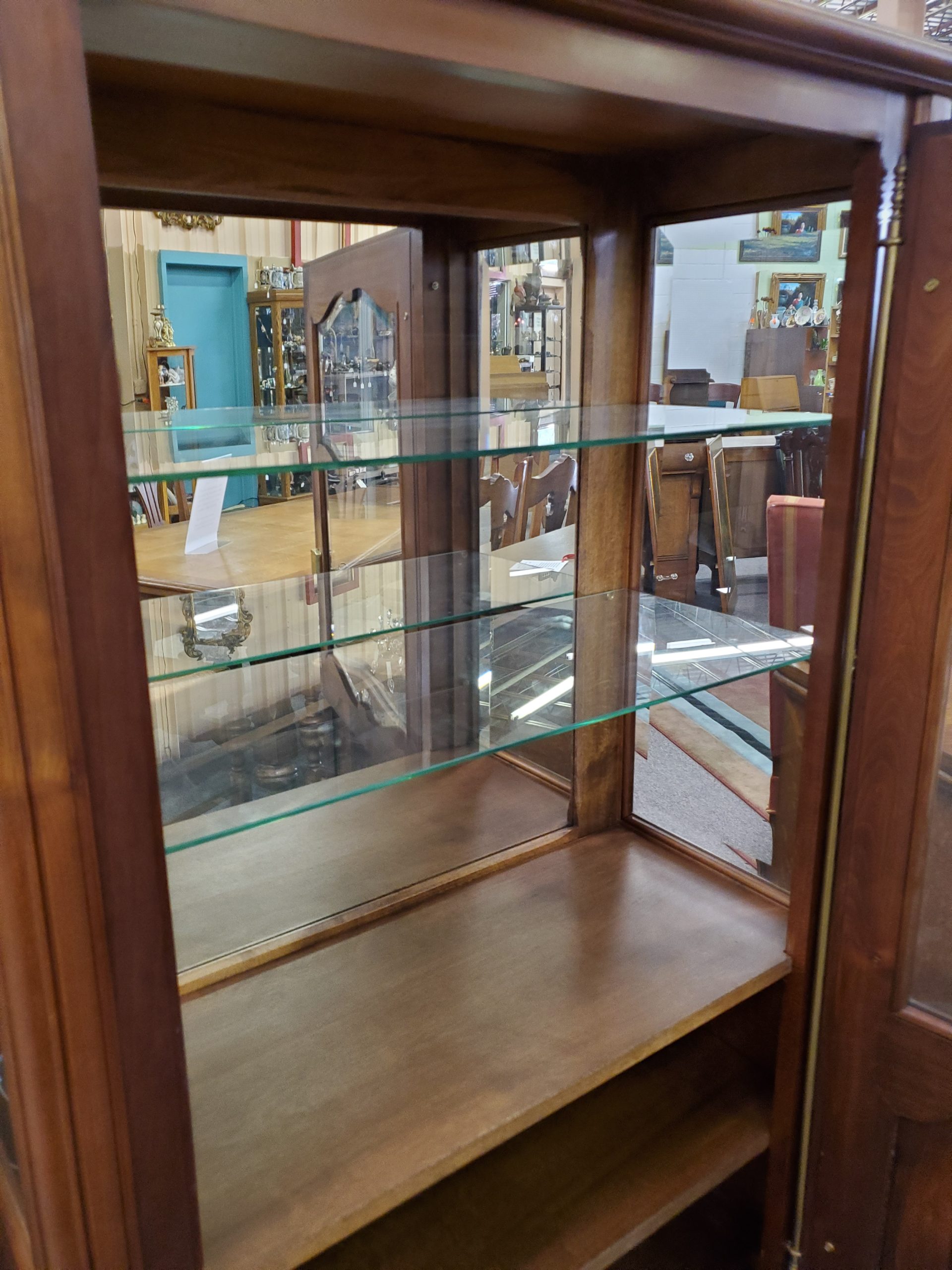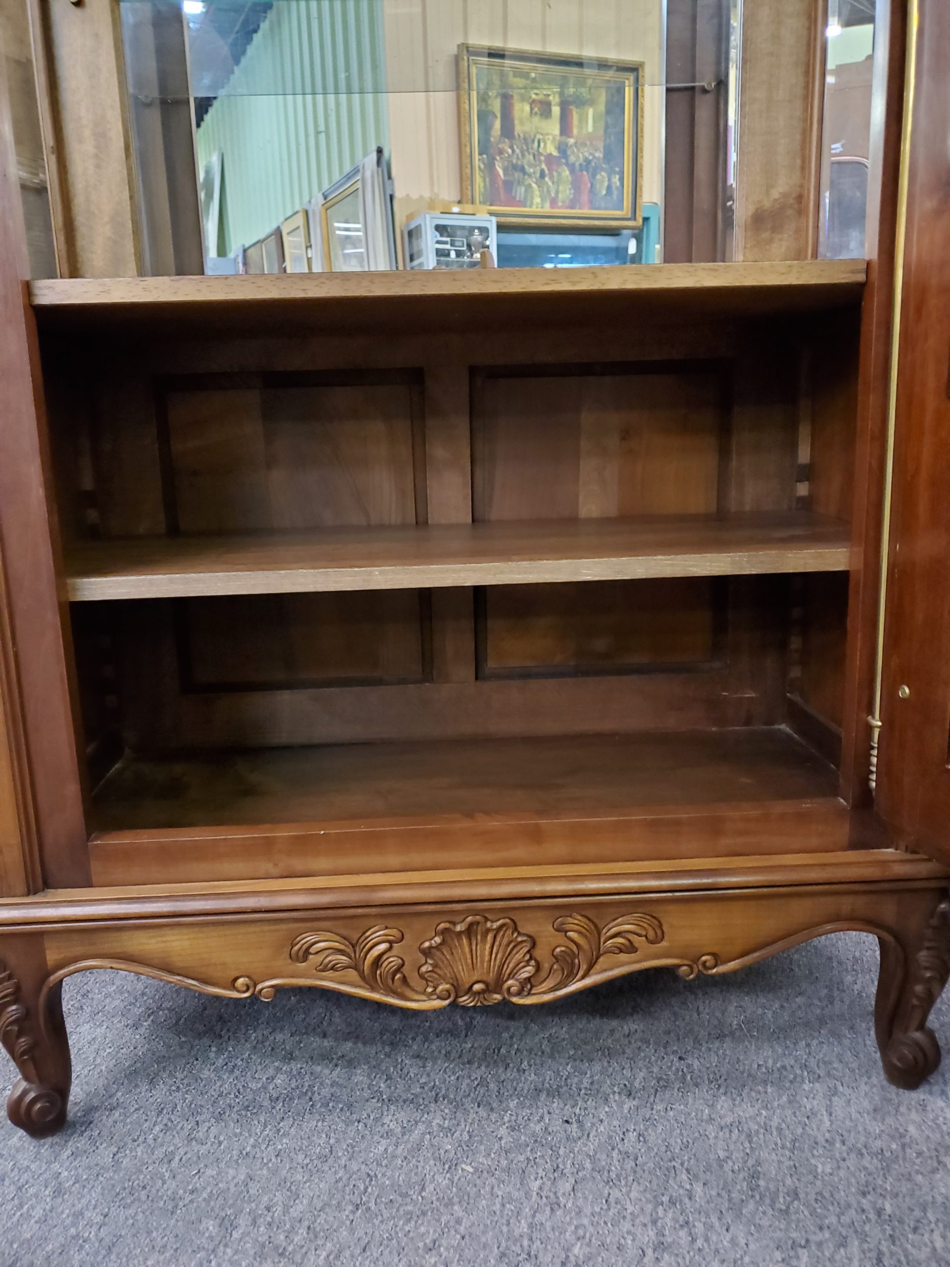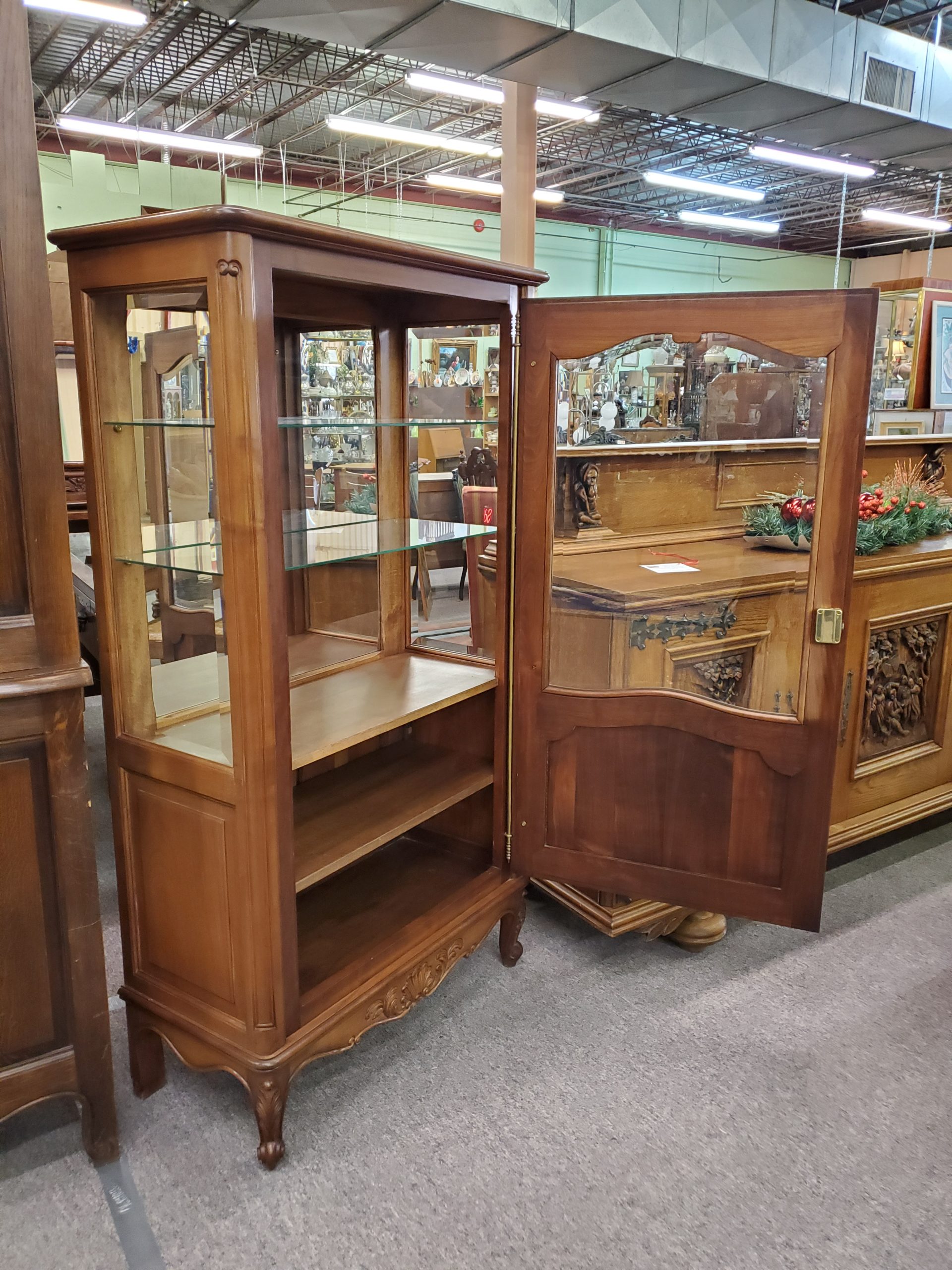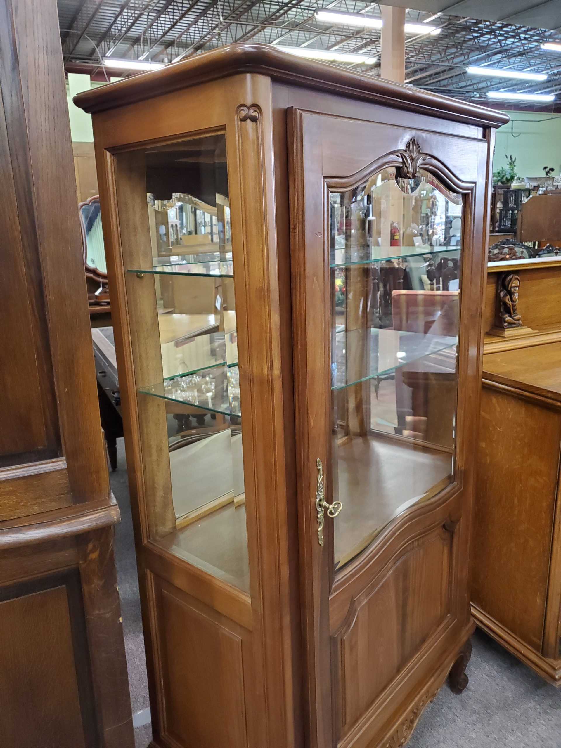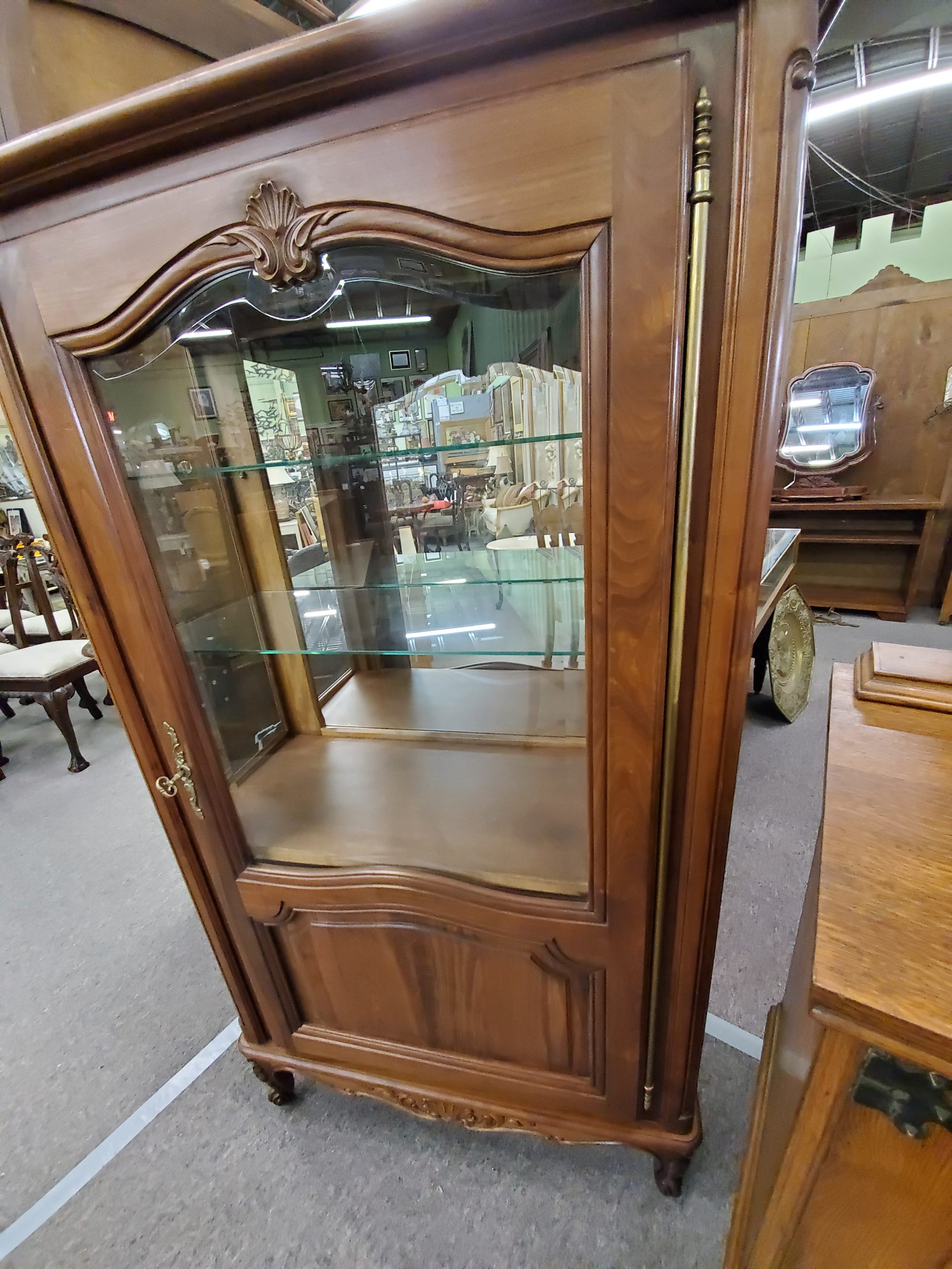 Antique vitrine, featuring a single beveled glass door with a wooden plank at the bottom of the display area that separates a lower storage space, this remains hidden by the solid panel of the door, the door opens to reveal glass shelves and mirrored back, ending in cabriole legs.