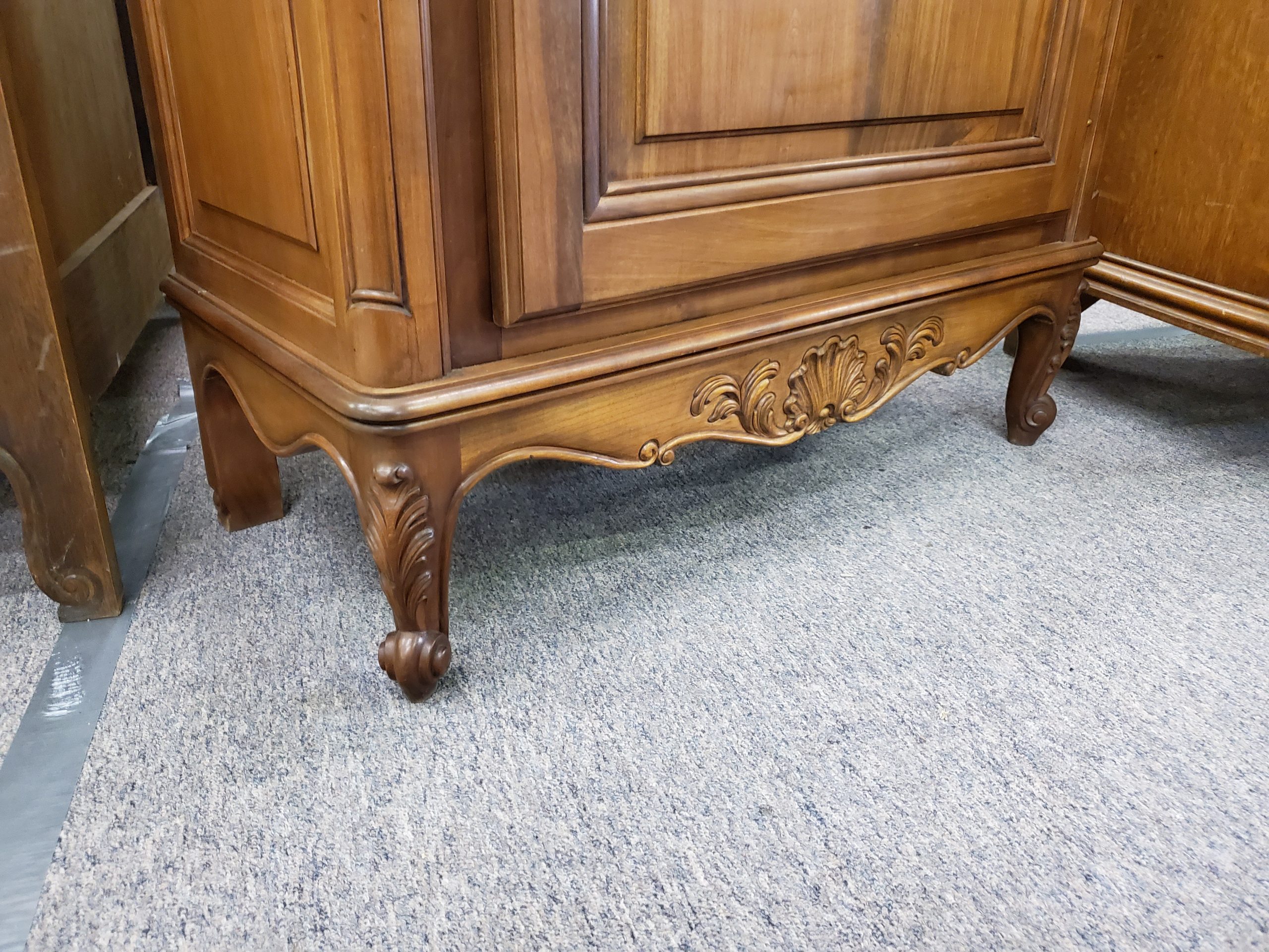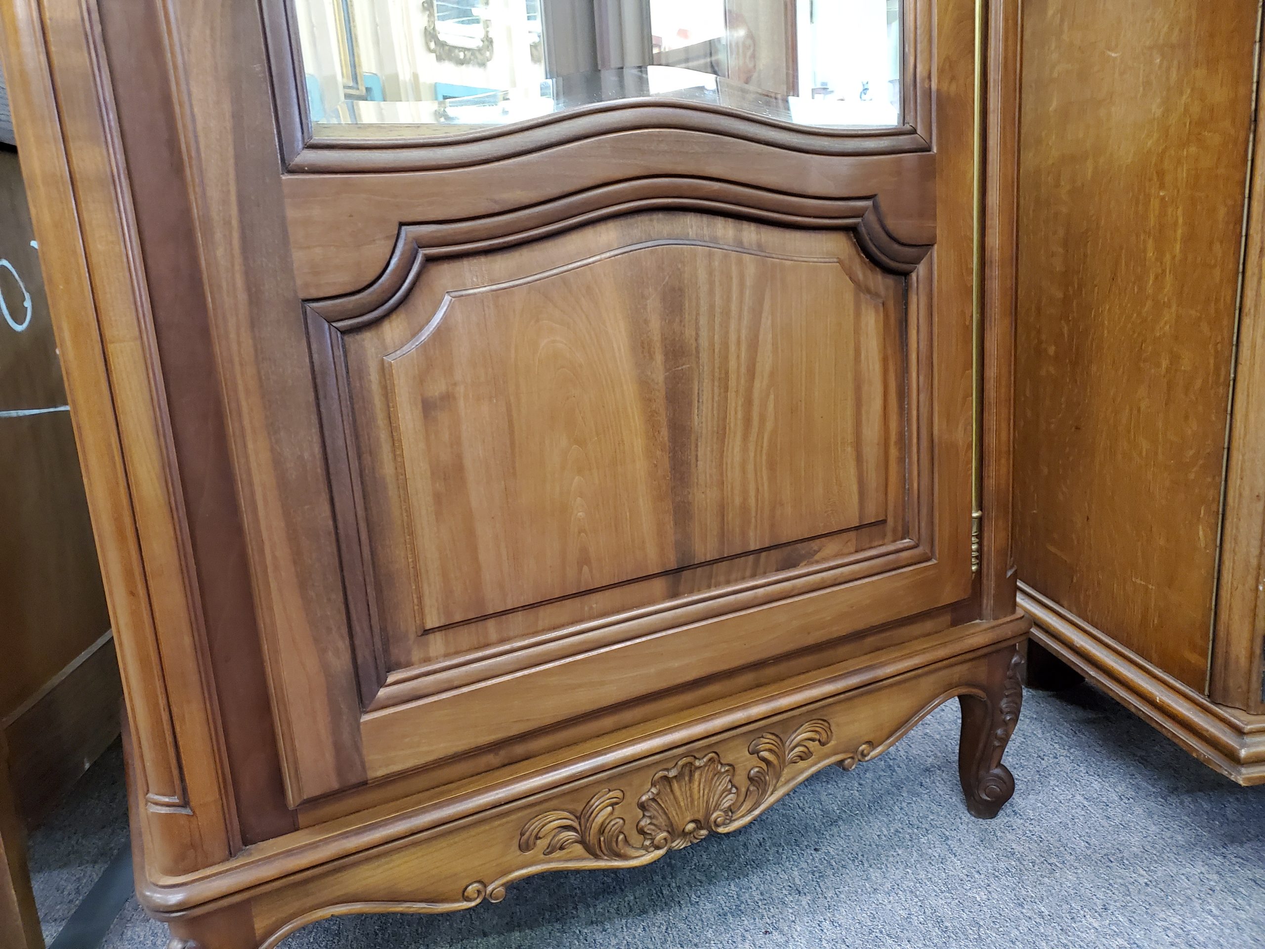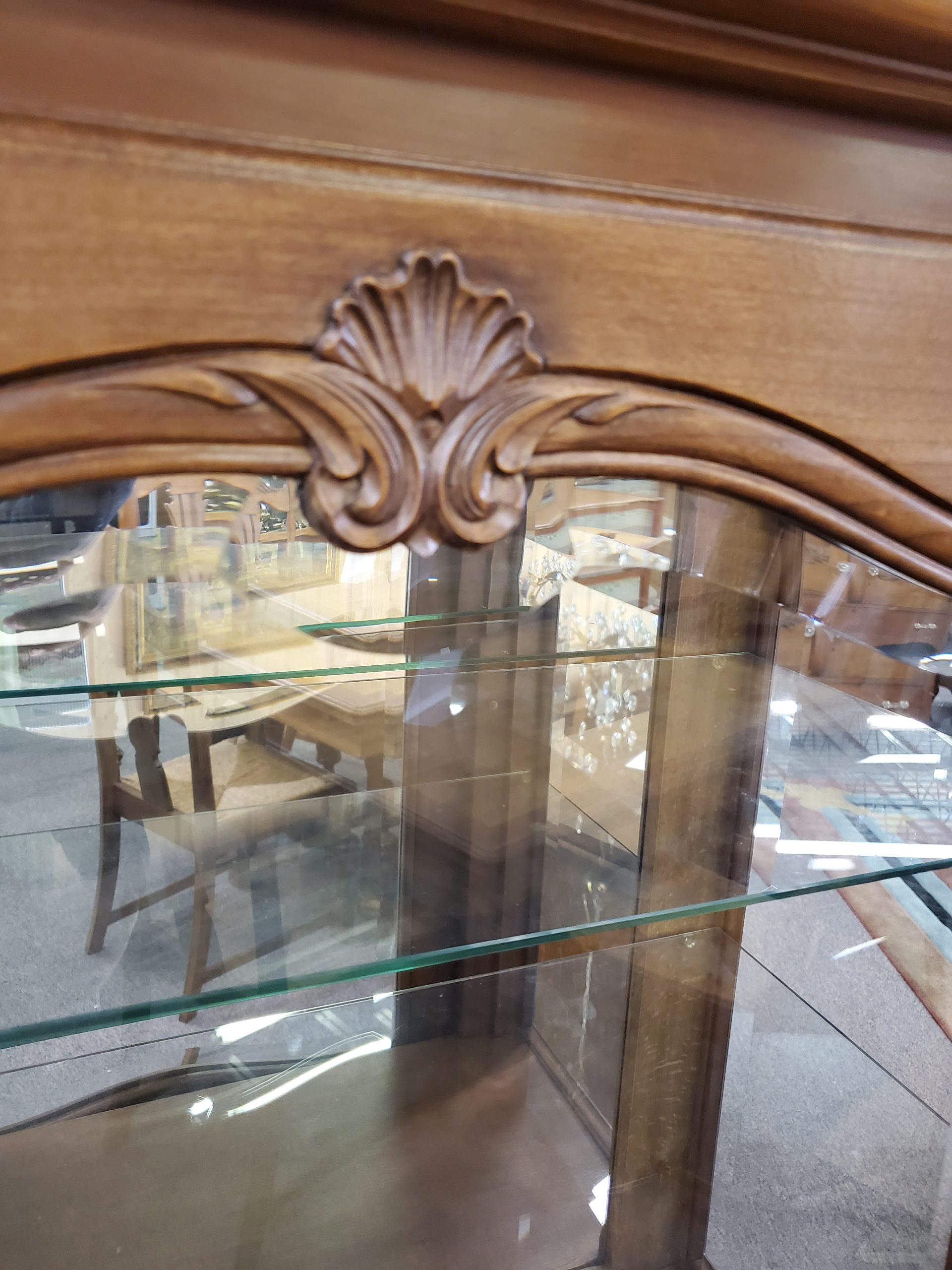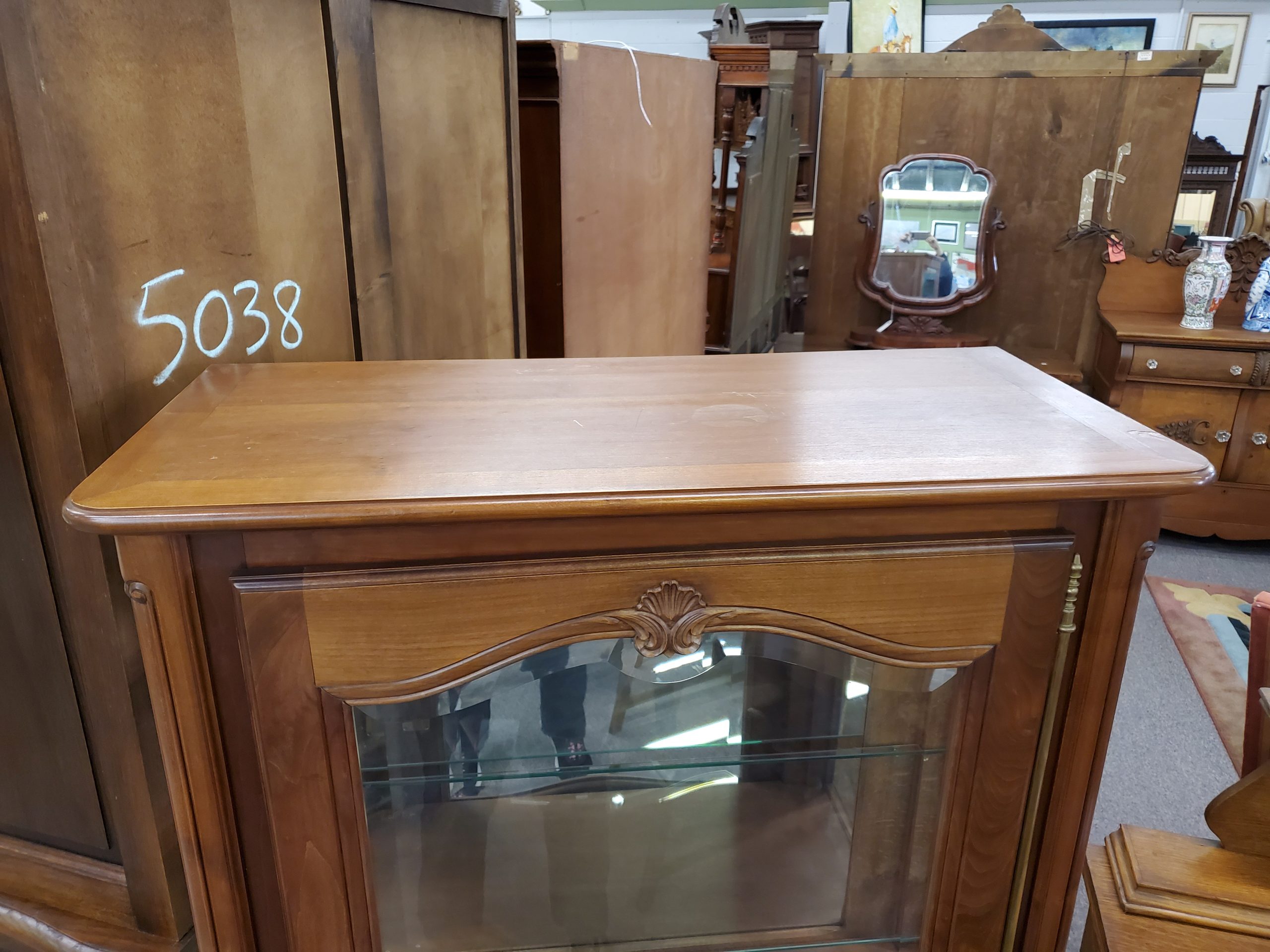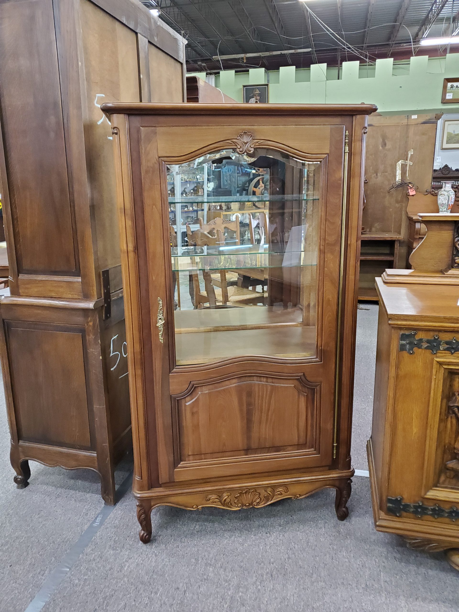 Antique vitrine, featuring a single beveled glass door with a wooden plank at the bottom of the display area that separates a lower storage space, this remains hidden by the solid panel of the door, the door opens to reveal glass shelves and mirrored back, ending in cabriole legs.