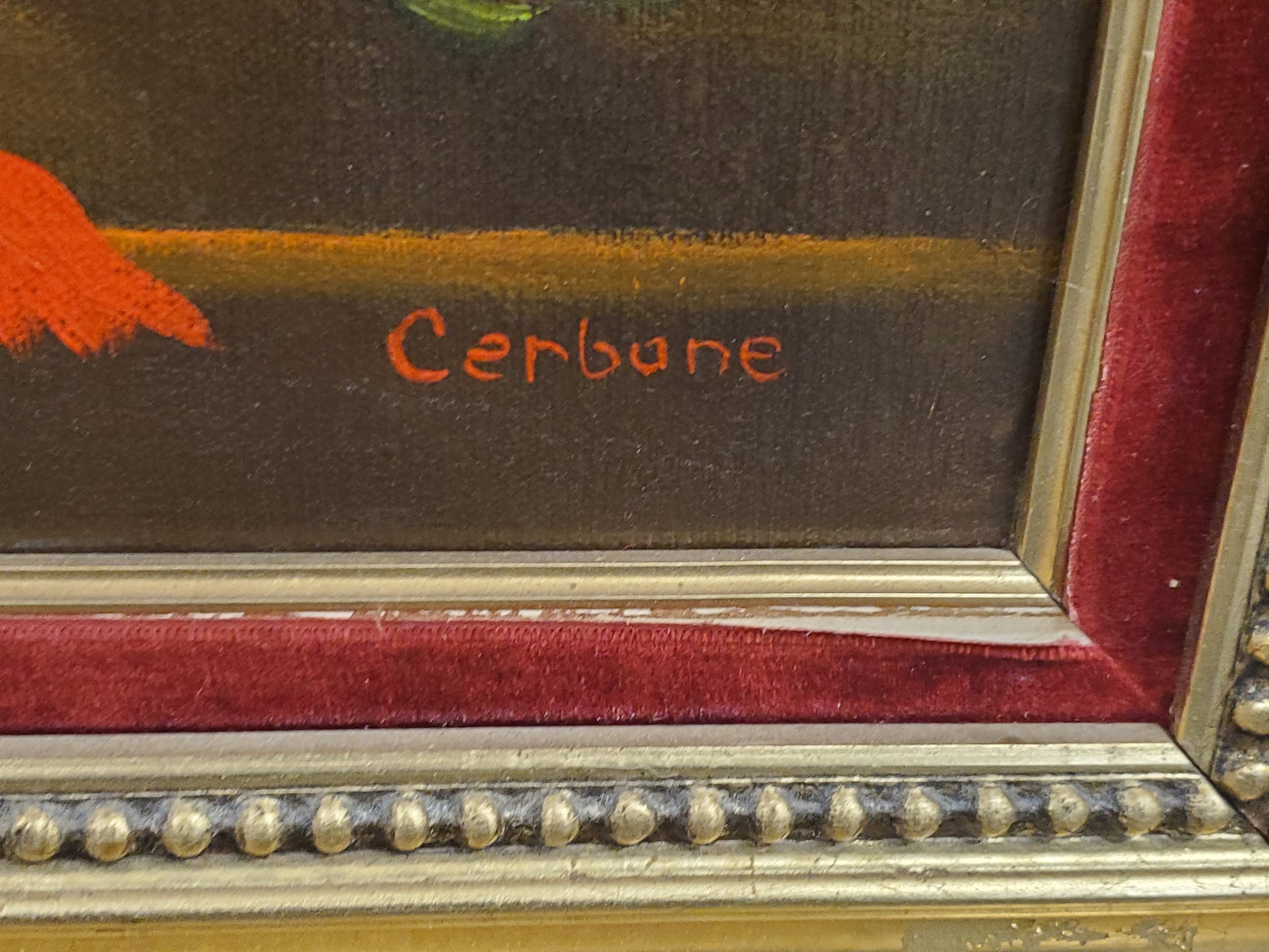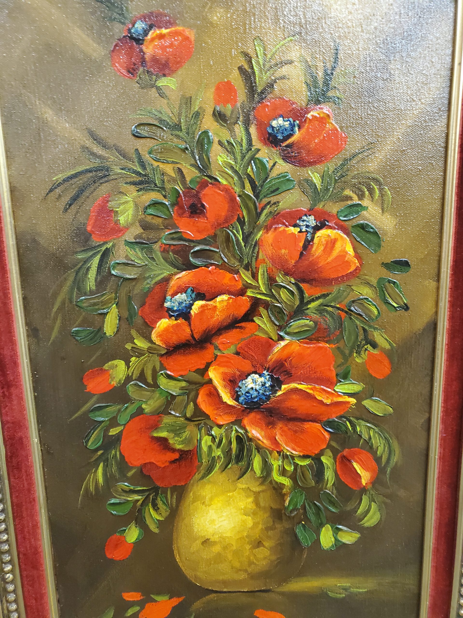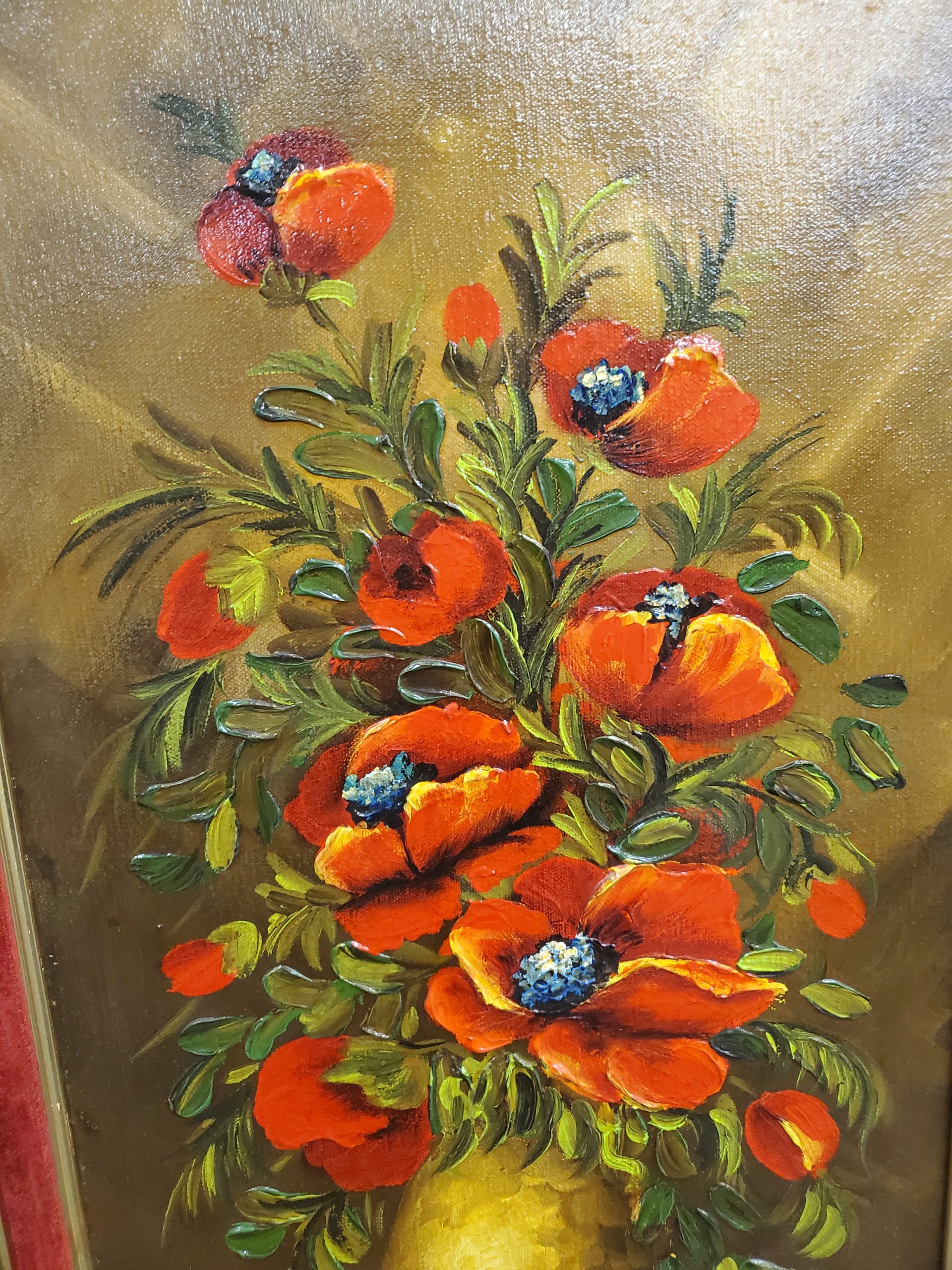 Still life oil on canvas depicting beautiful red flowers in a gold vase with a golden background surrounded with red velvet in an ornate gold frame. Signed lower left Cerbone. Circa 1920’s.