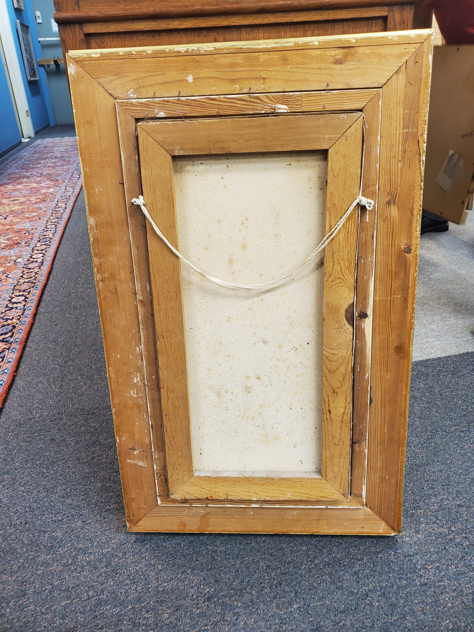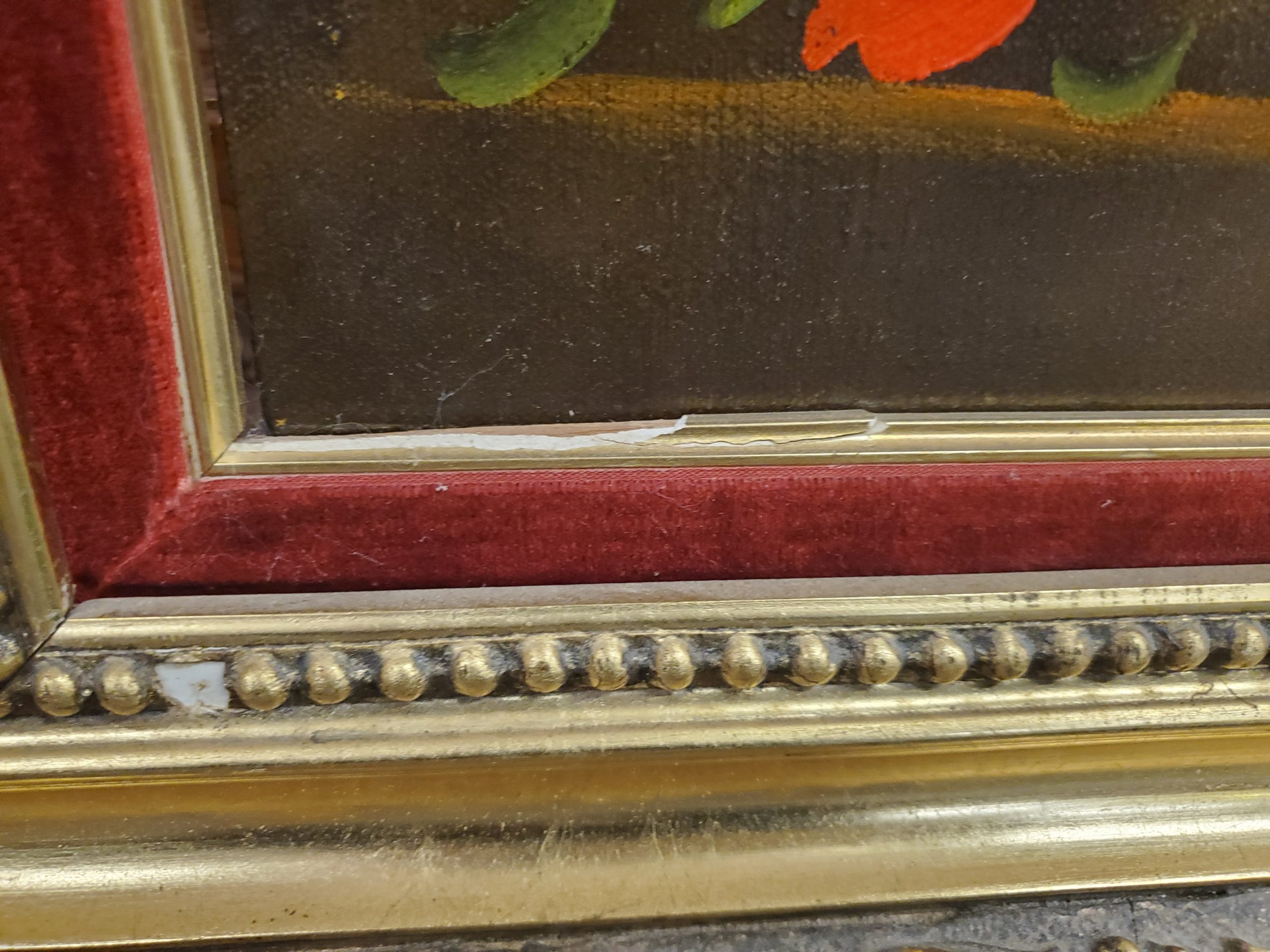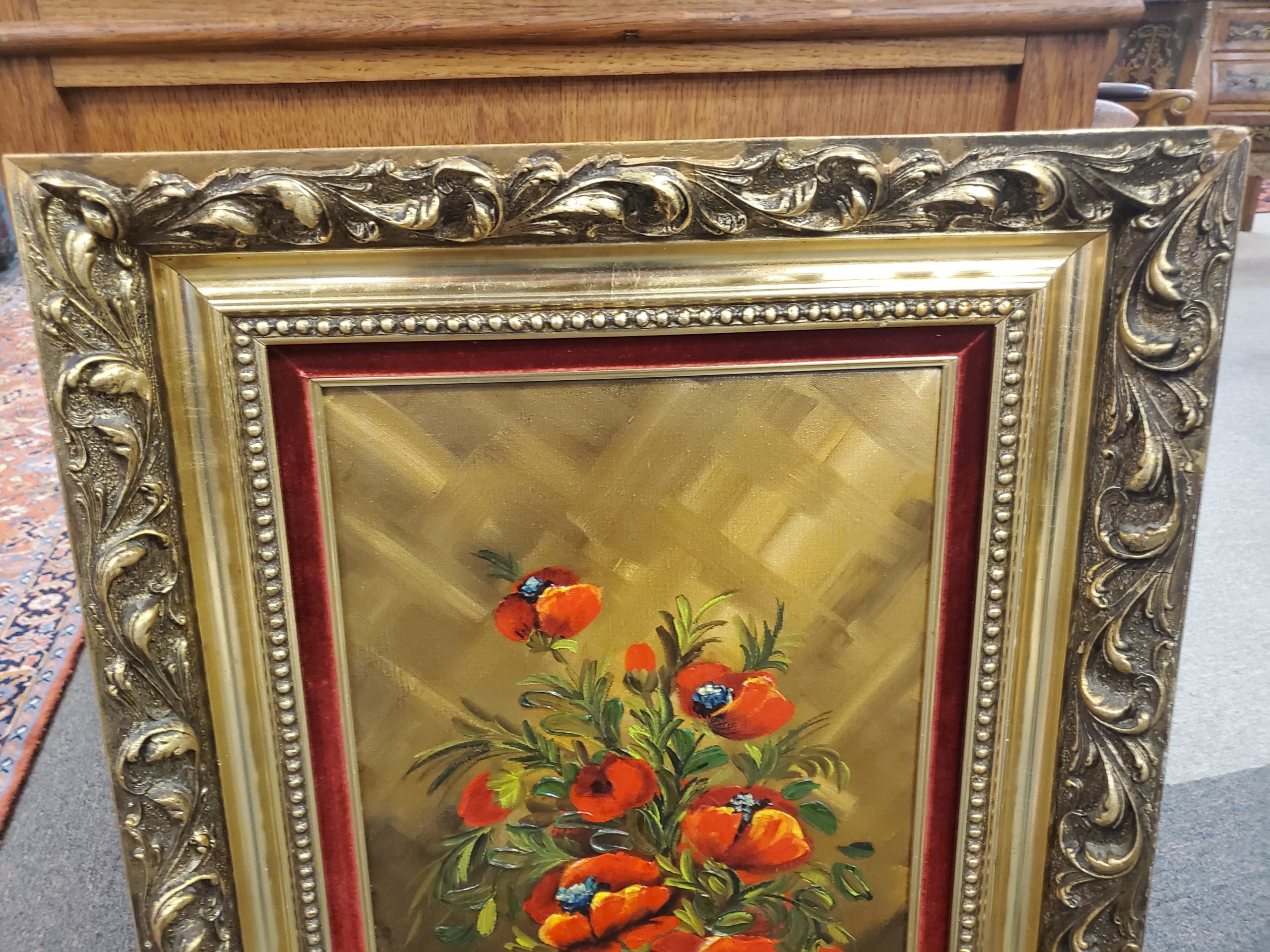 Still life oil on canvas depicting beautiful red flowers in a gold vase with a golden background surrounded with red velvet in an ornate gold frame. Signed lower left Cerbone. Circa 1920’s.