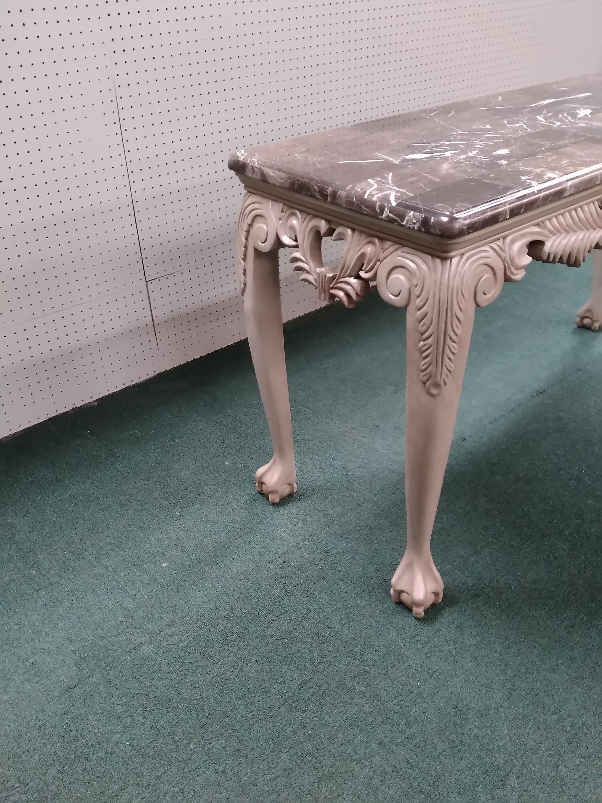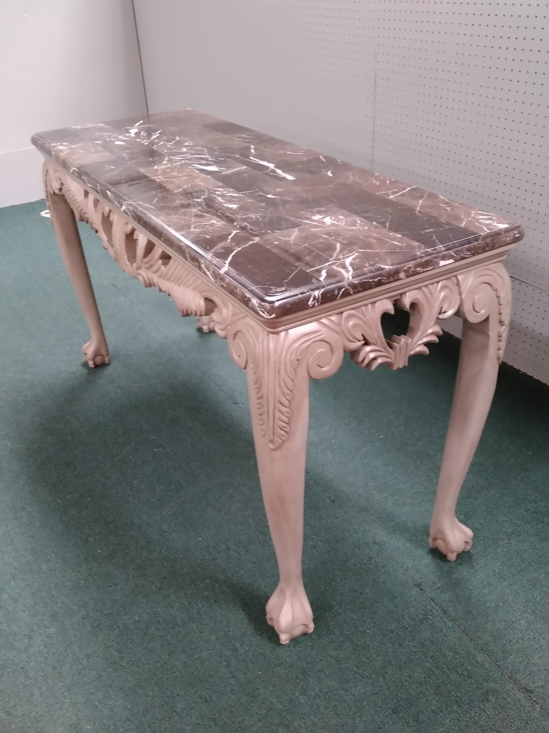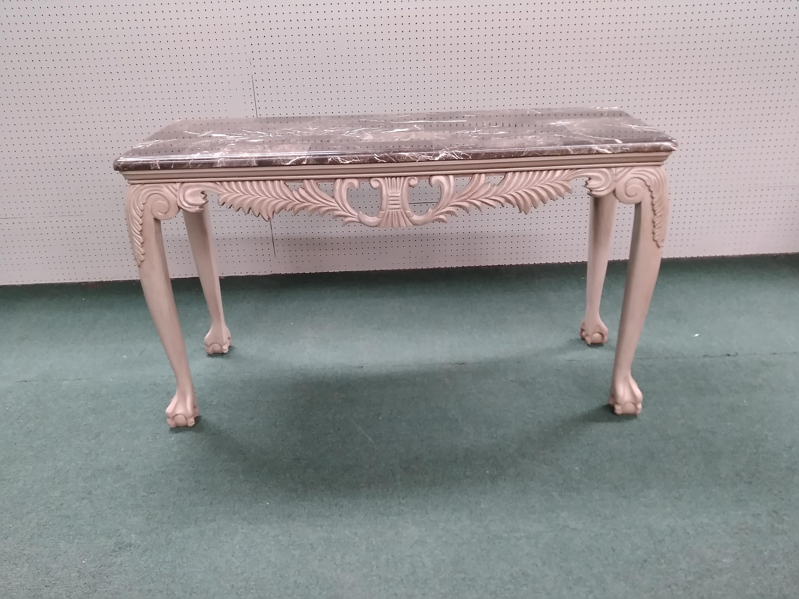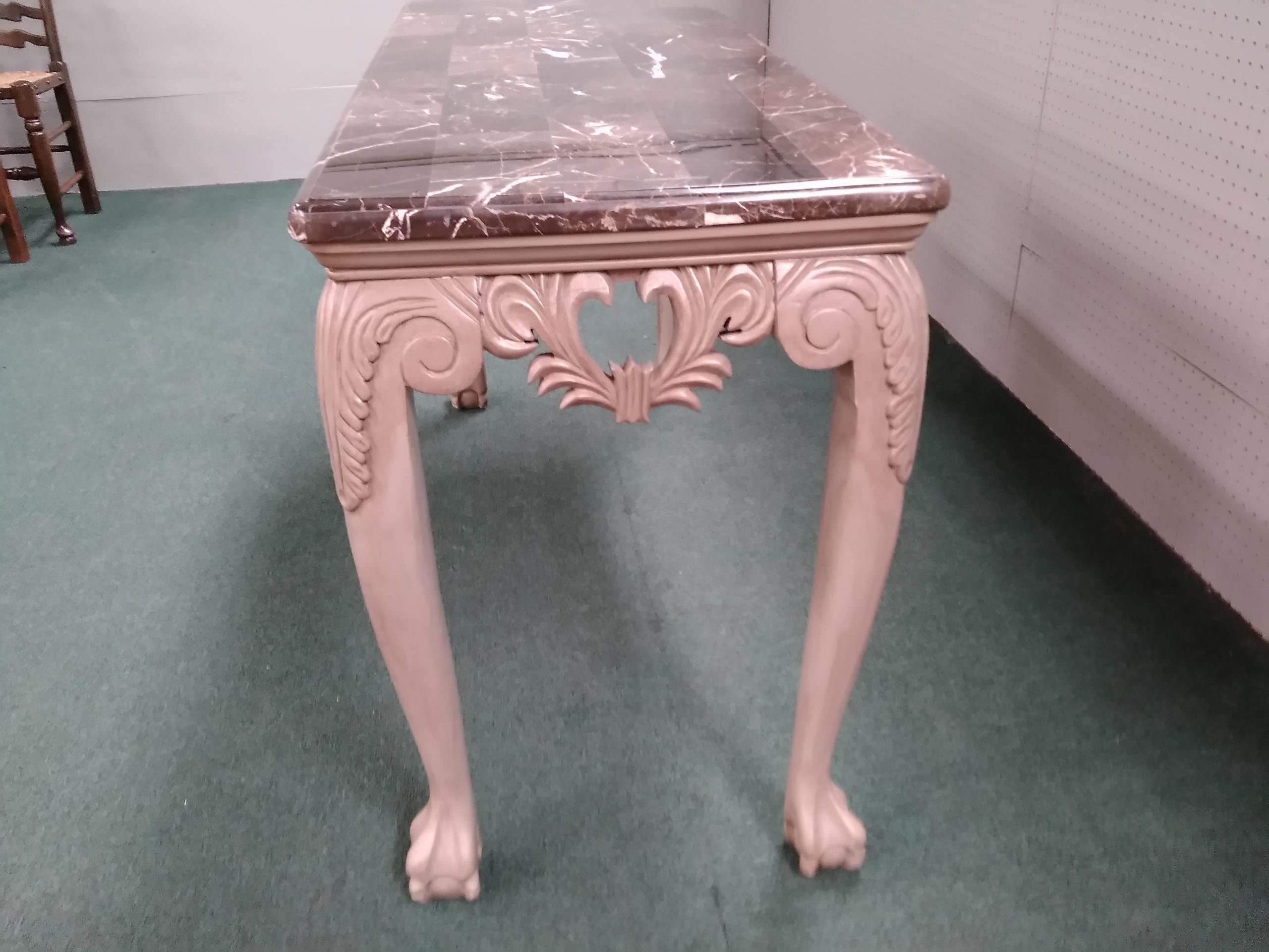 Features faux marble top, elegant carved frame work ending in ball and claw feet.
