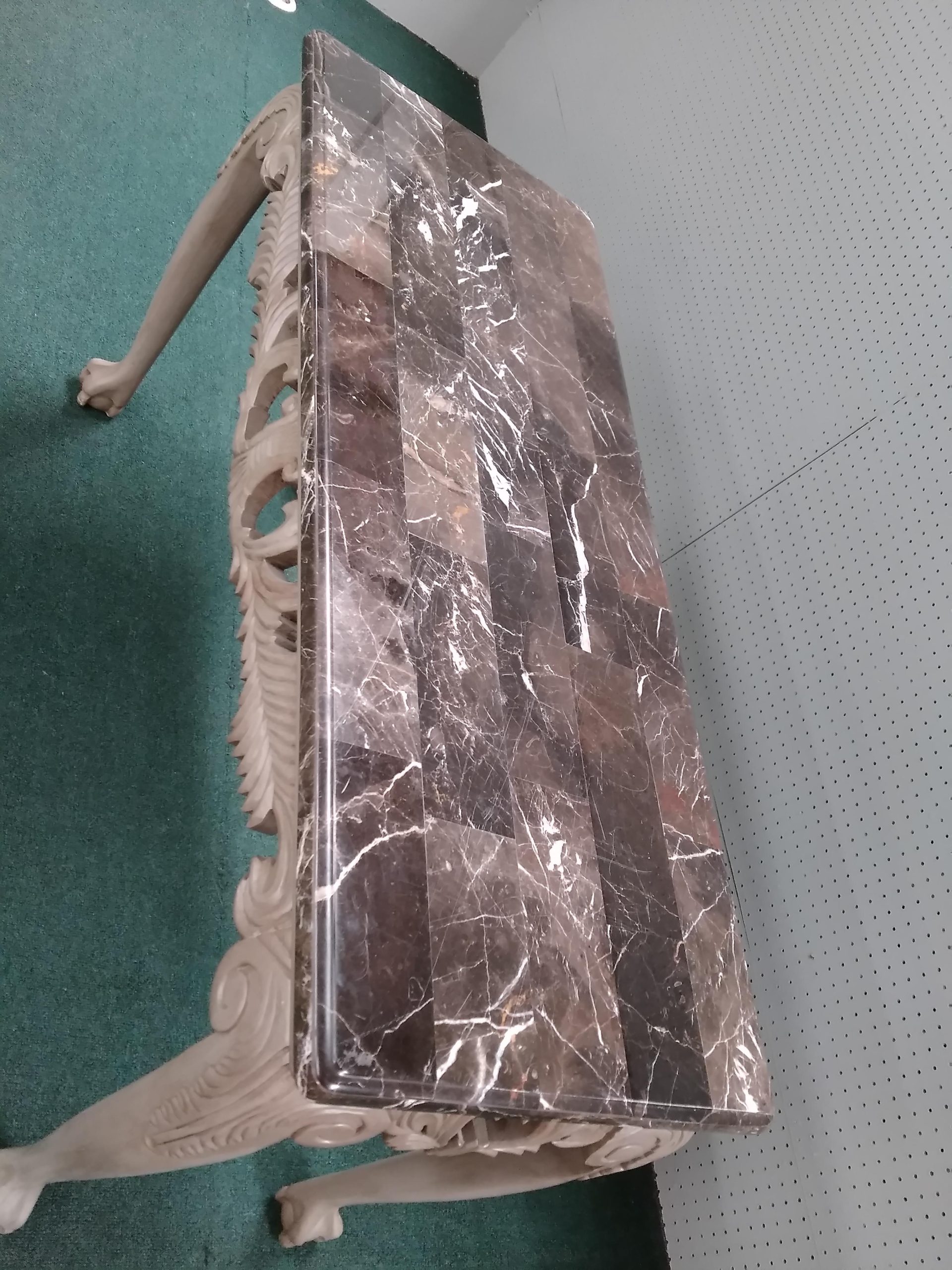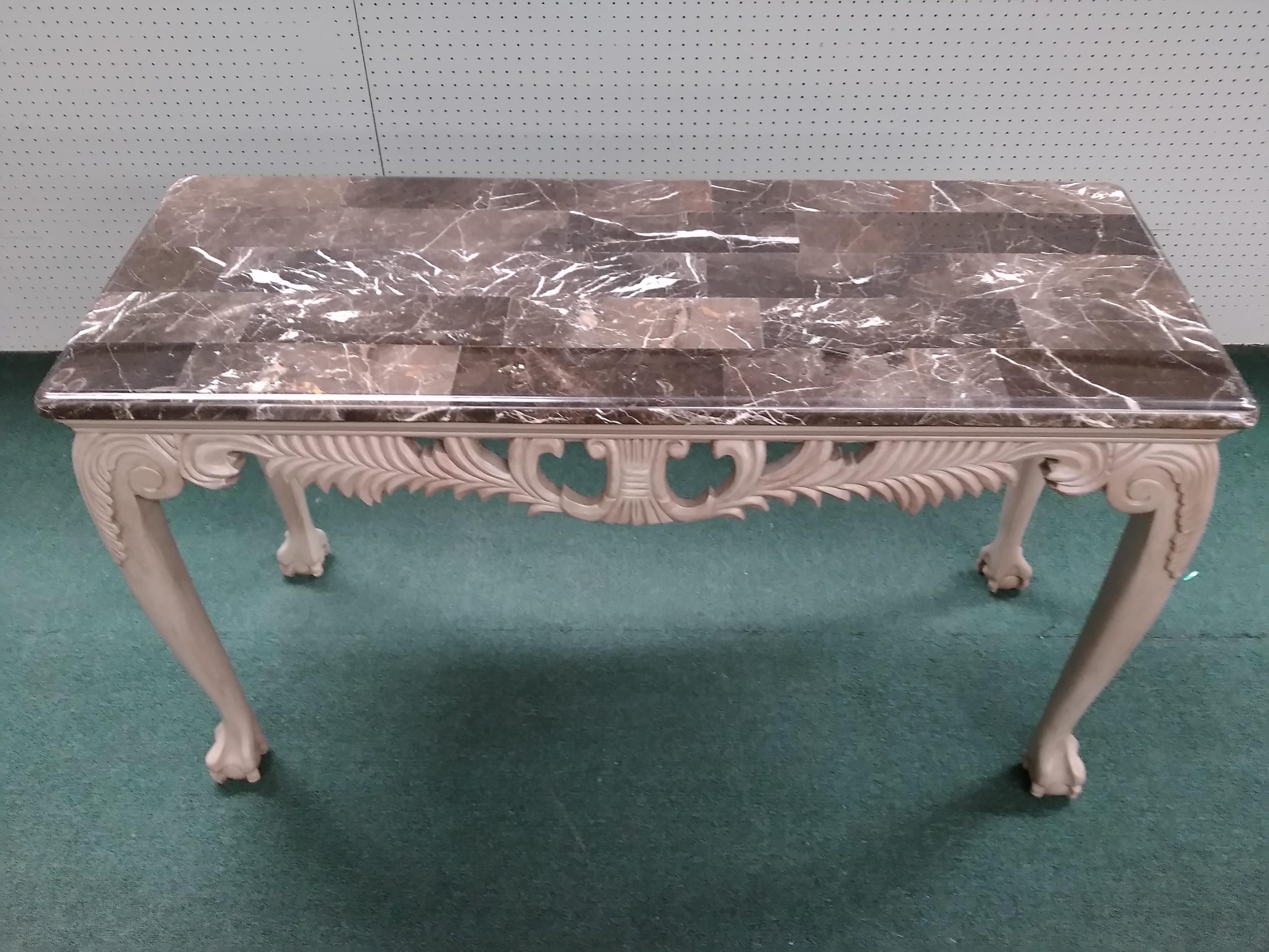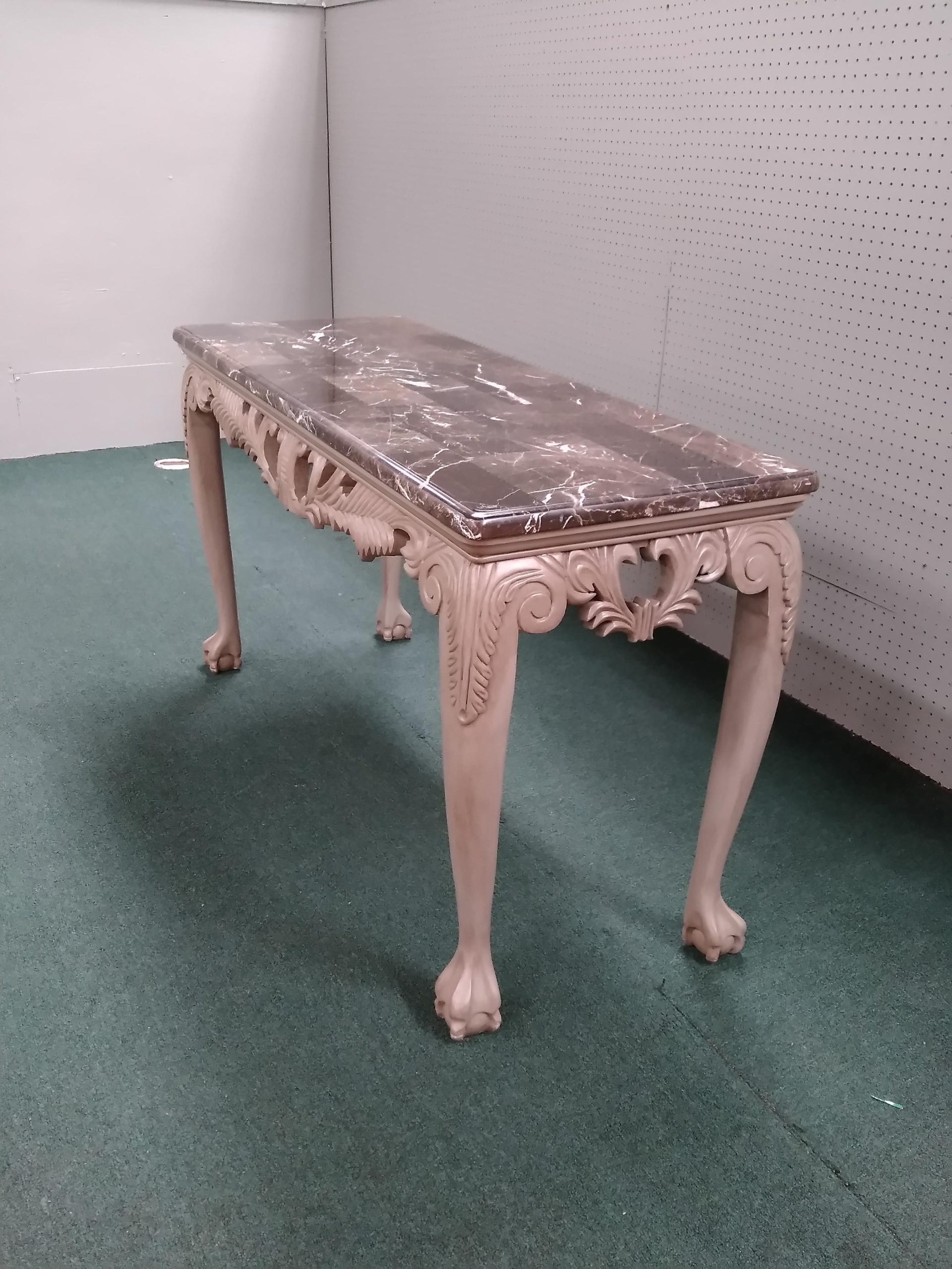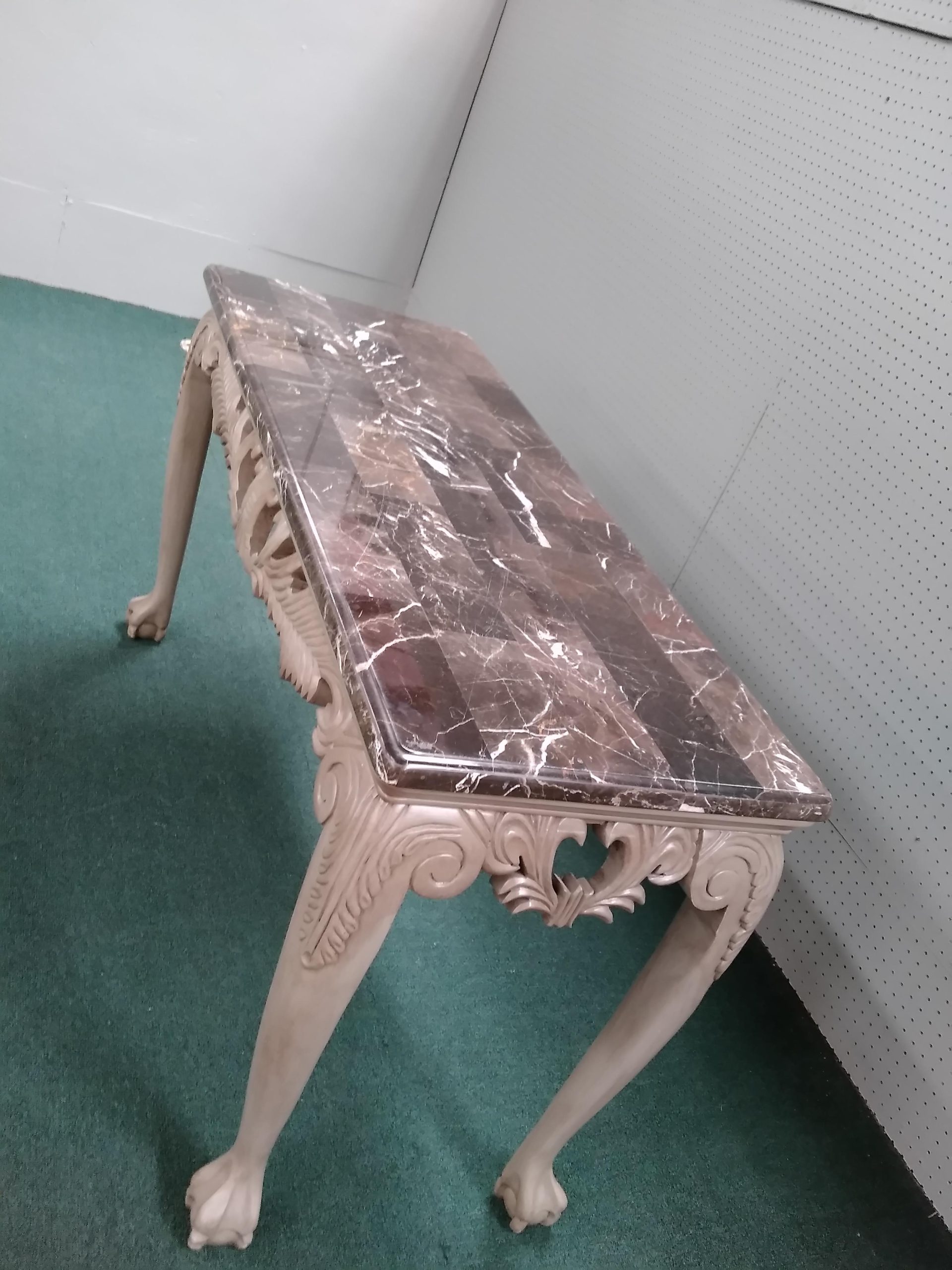 Features faux marble top, elegant carved frame work ending in ball and claw feet.