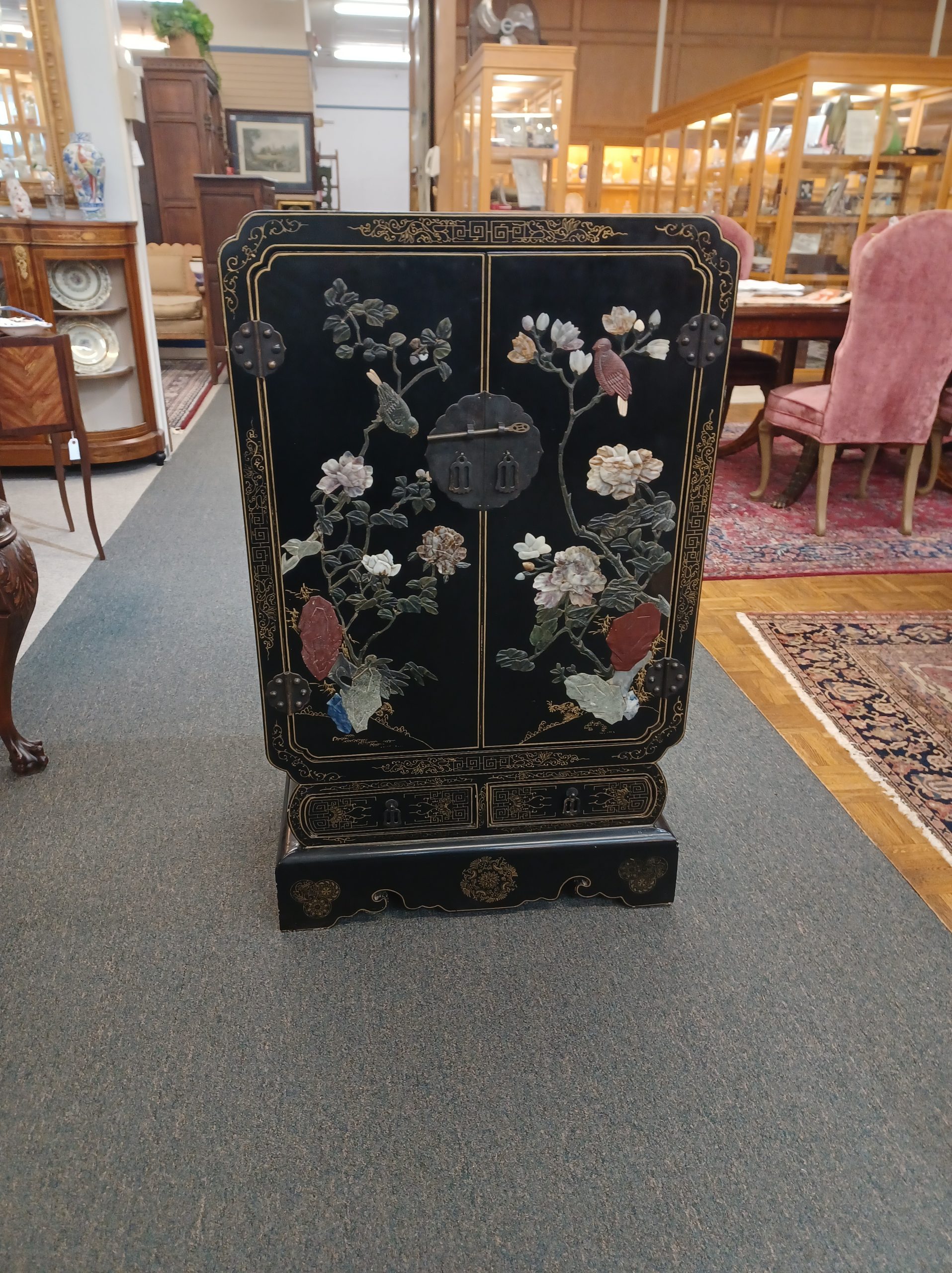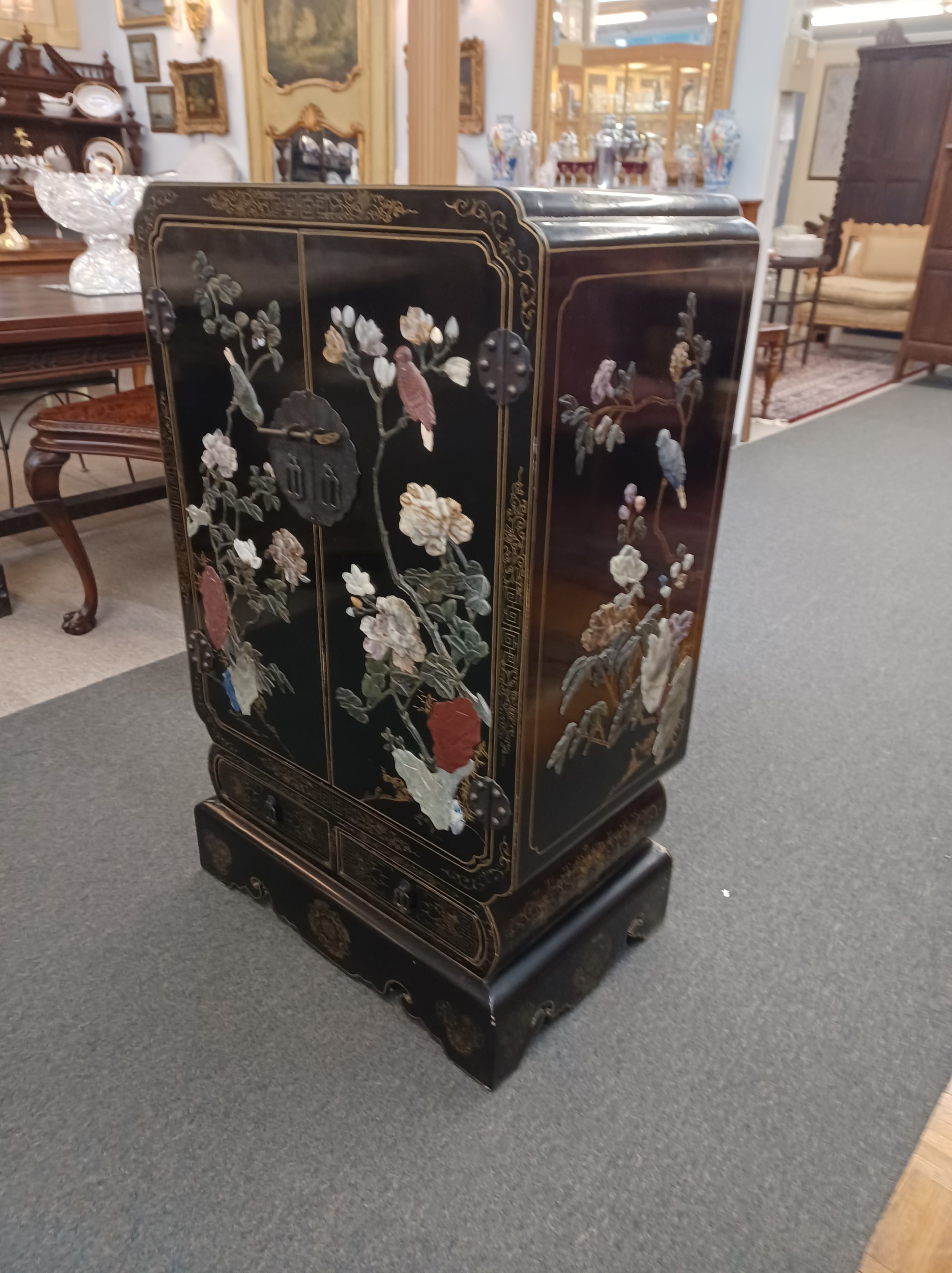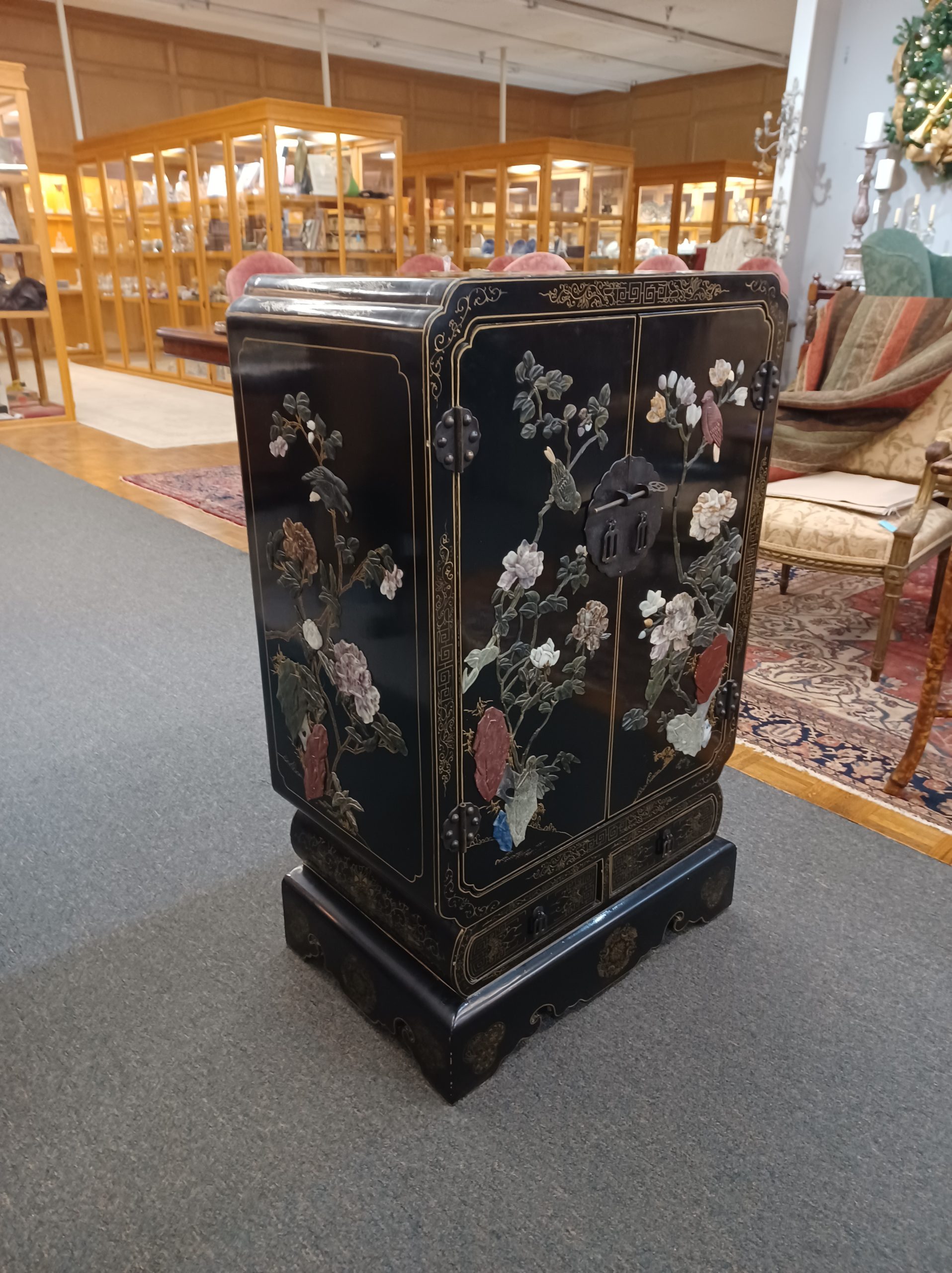 A stunning black lacquered chinoiserie cabinet with two doors and an interior shelf over two drawers, featuring relief birds on branches with carved hardstone flowers on all sides and gold accents on top and throughout the cabinet. The back is labeled “Jinlong Beijing Gold Inlaid Lacquer Furniture Factory- Made in the People’s Republic of China.”