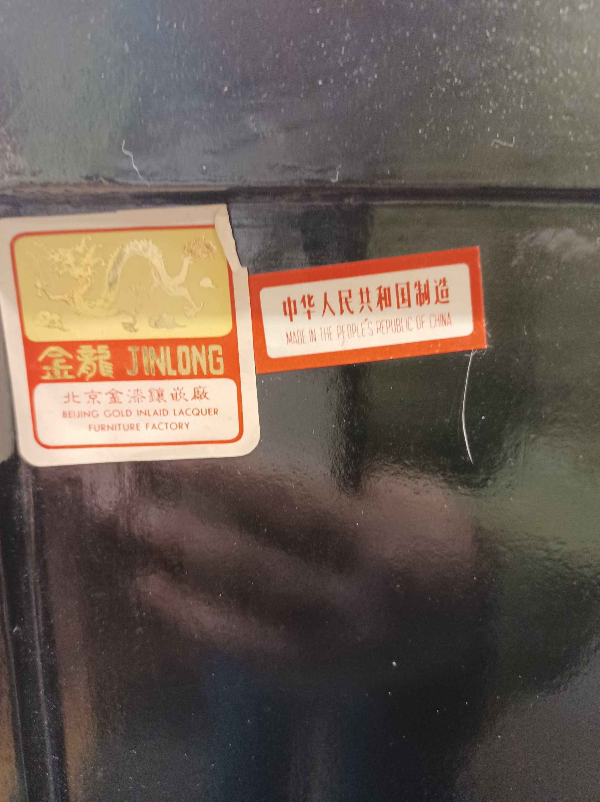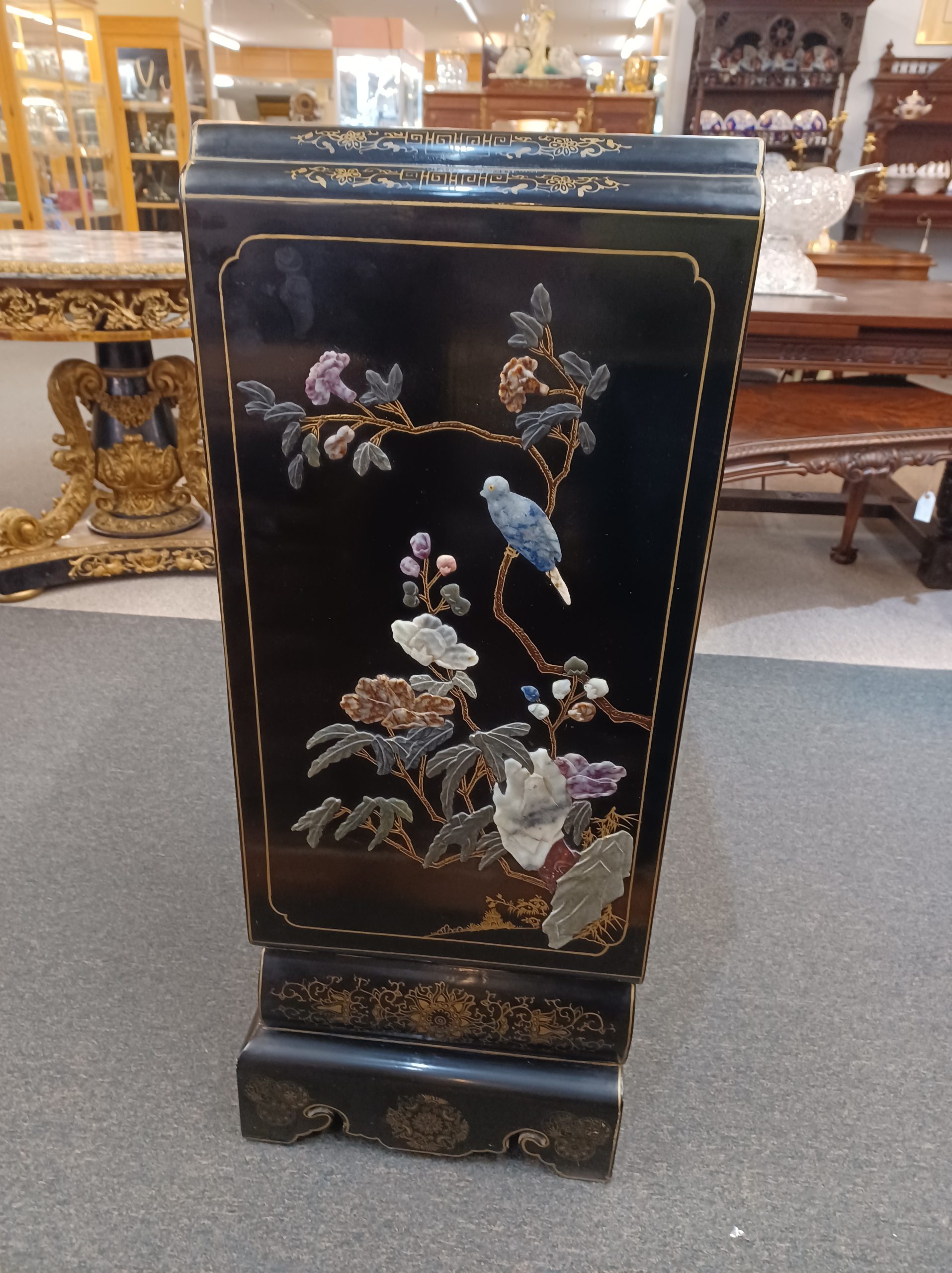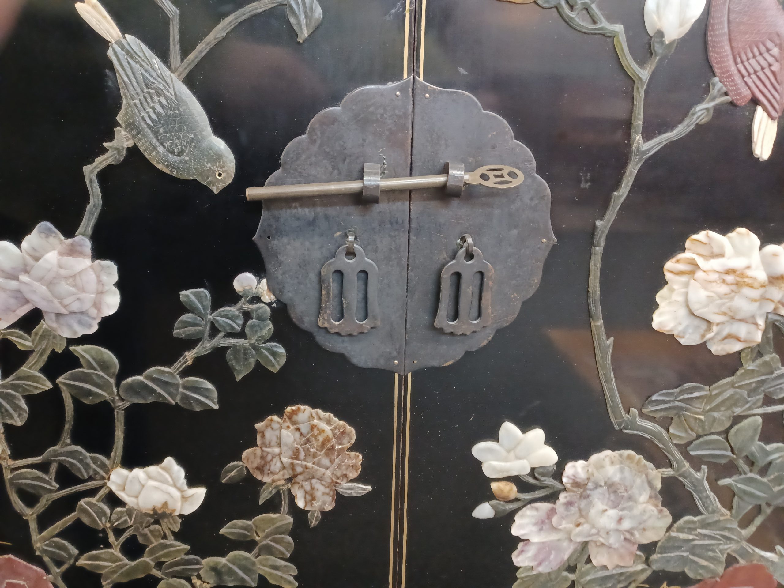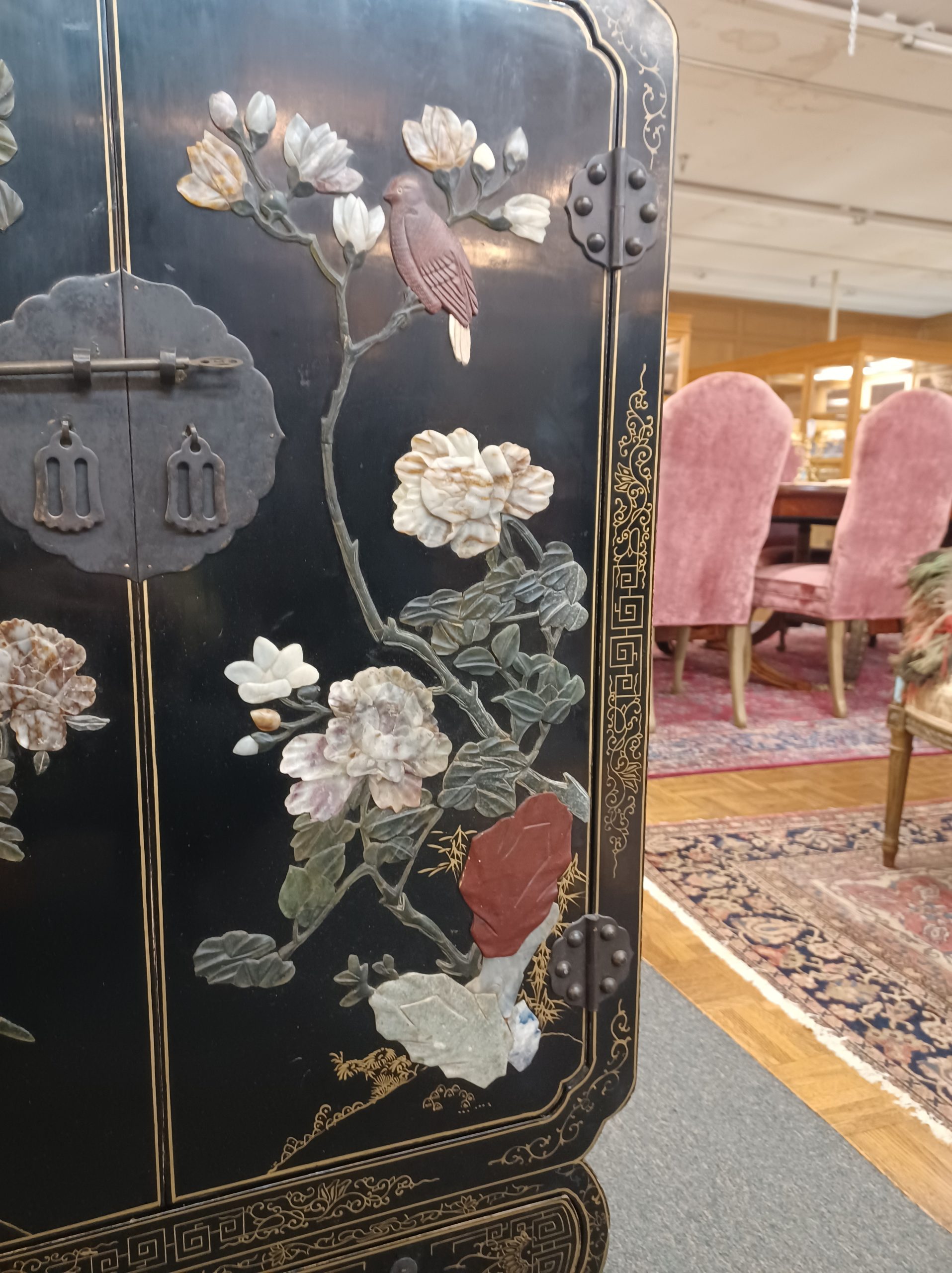 A stunning black lacquered chinoiserie cabinet with two doors and an interior shelf over two drawers, featuring relief birds on branches with carved hardstone flowers on all sides and gold accents on top and throughout the cabinet. The back is labeled “Jinlong Beijing Gold Inlaid Lacquer Furniture Factory- Made in the People’s Republic of China.”