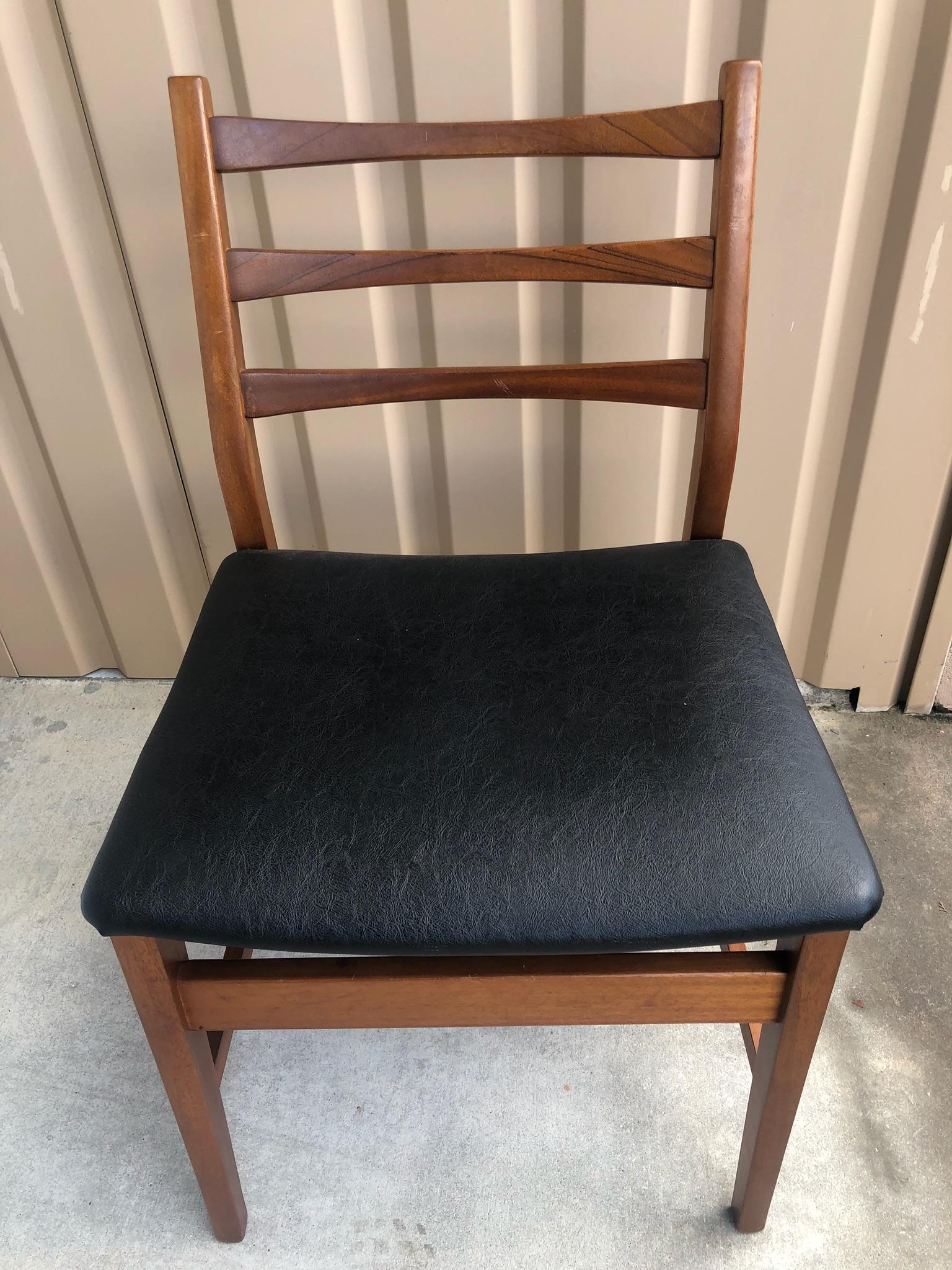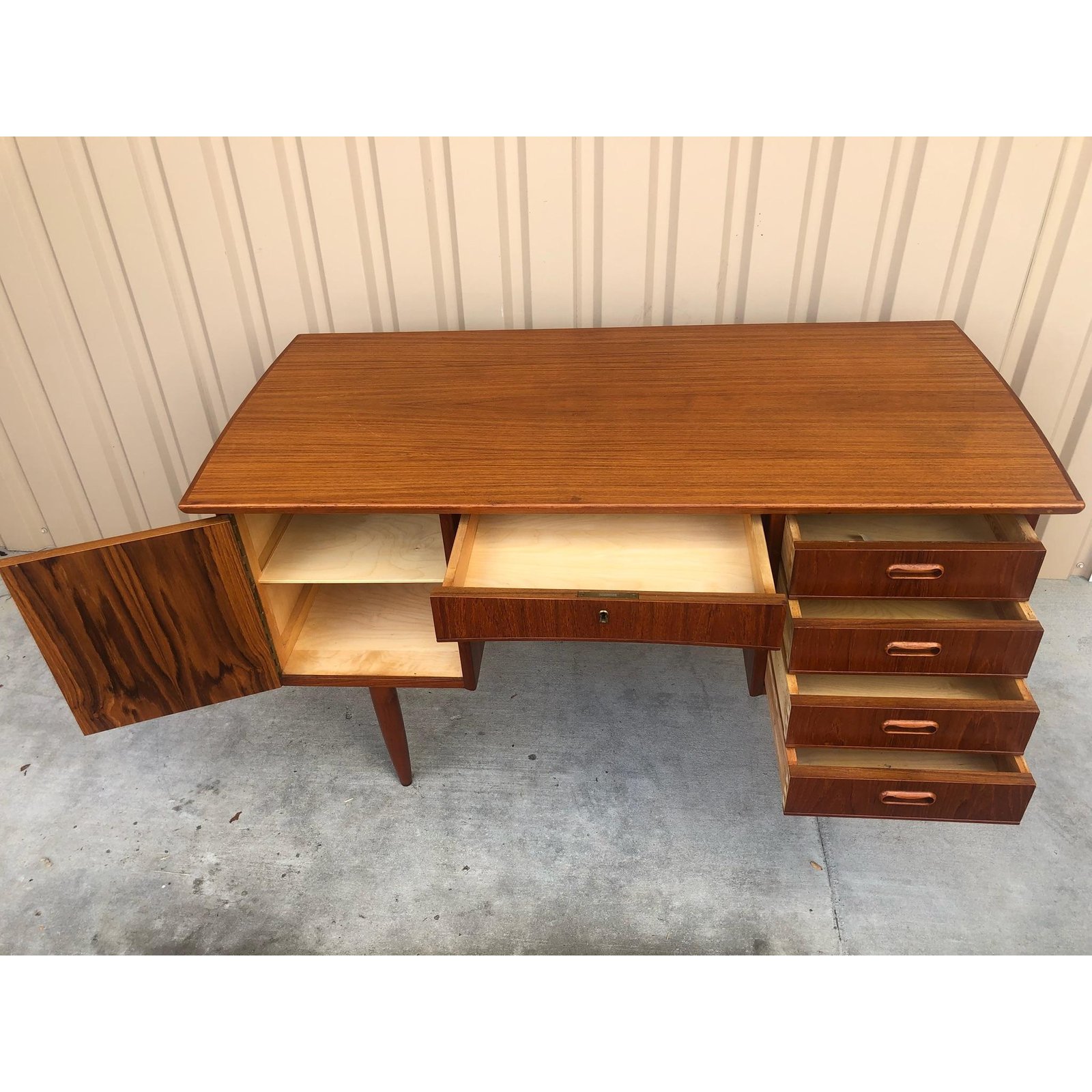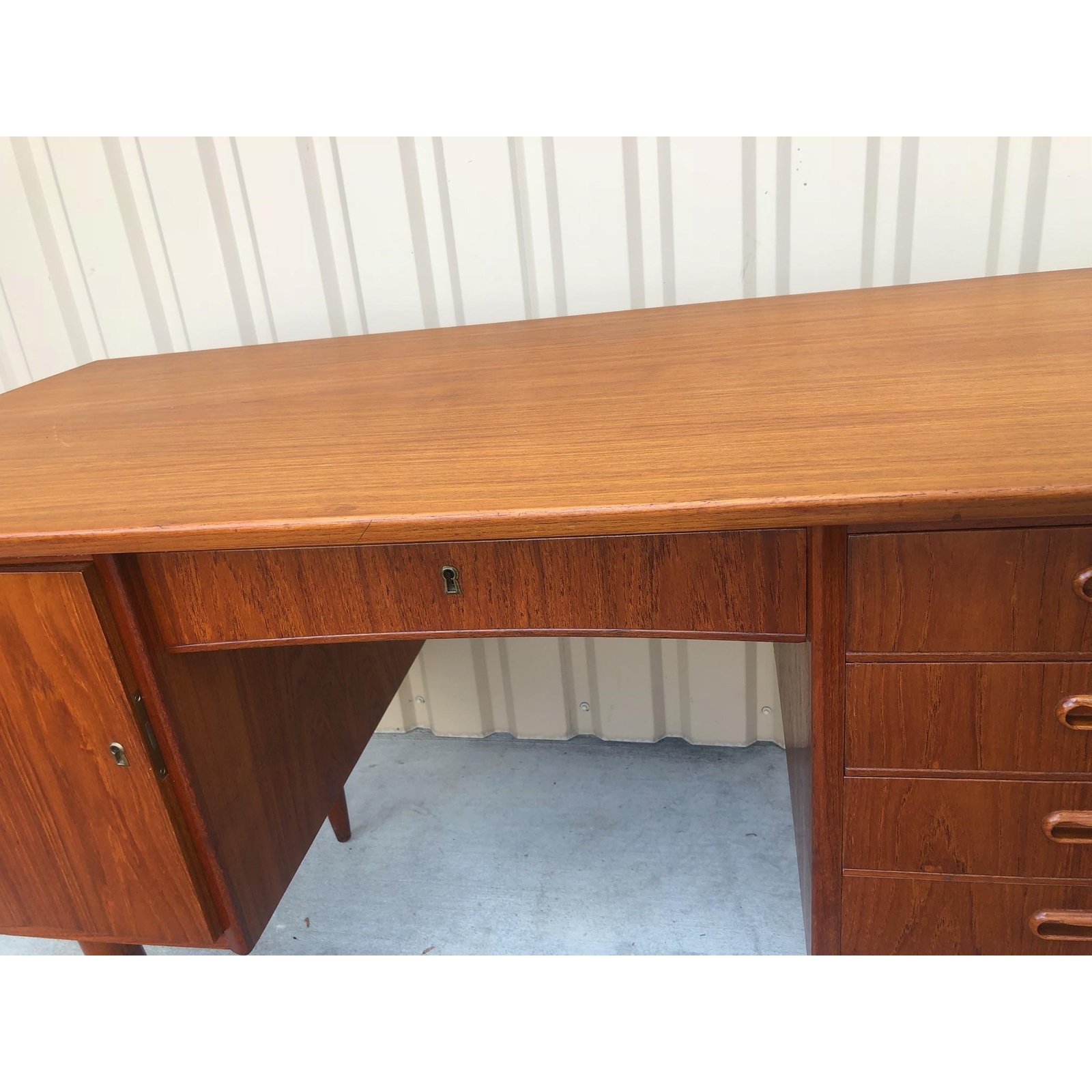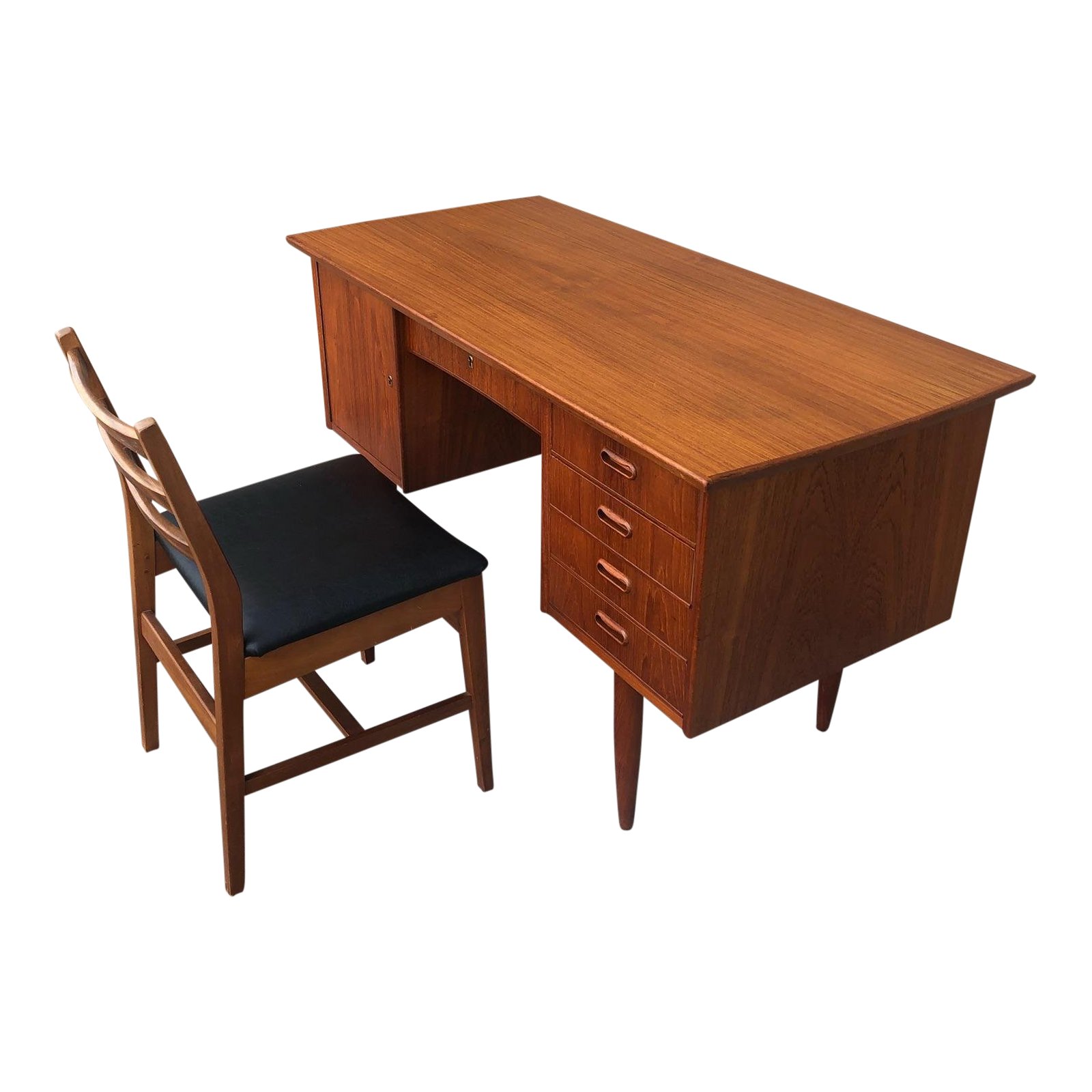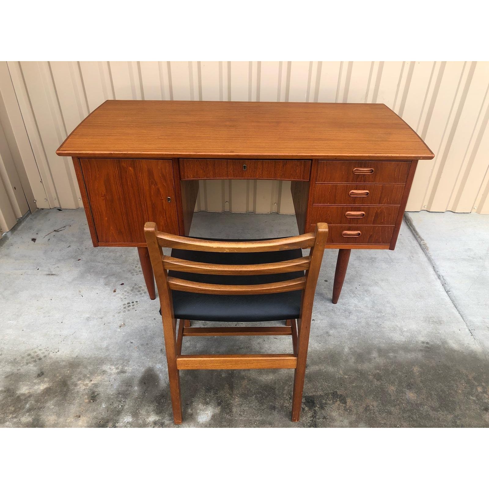 Danish modern teak desk with central drawer flanked by a door with an interior shelf and on the other side it has four drawers. It comes with a mid century chair with three horizontal slats, & upholstered seat.