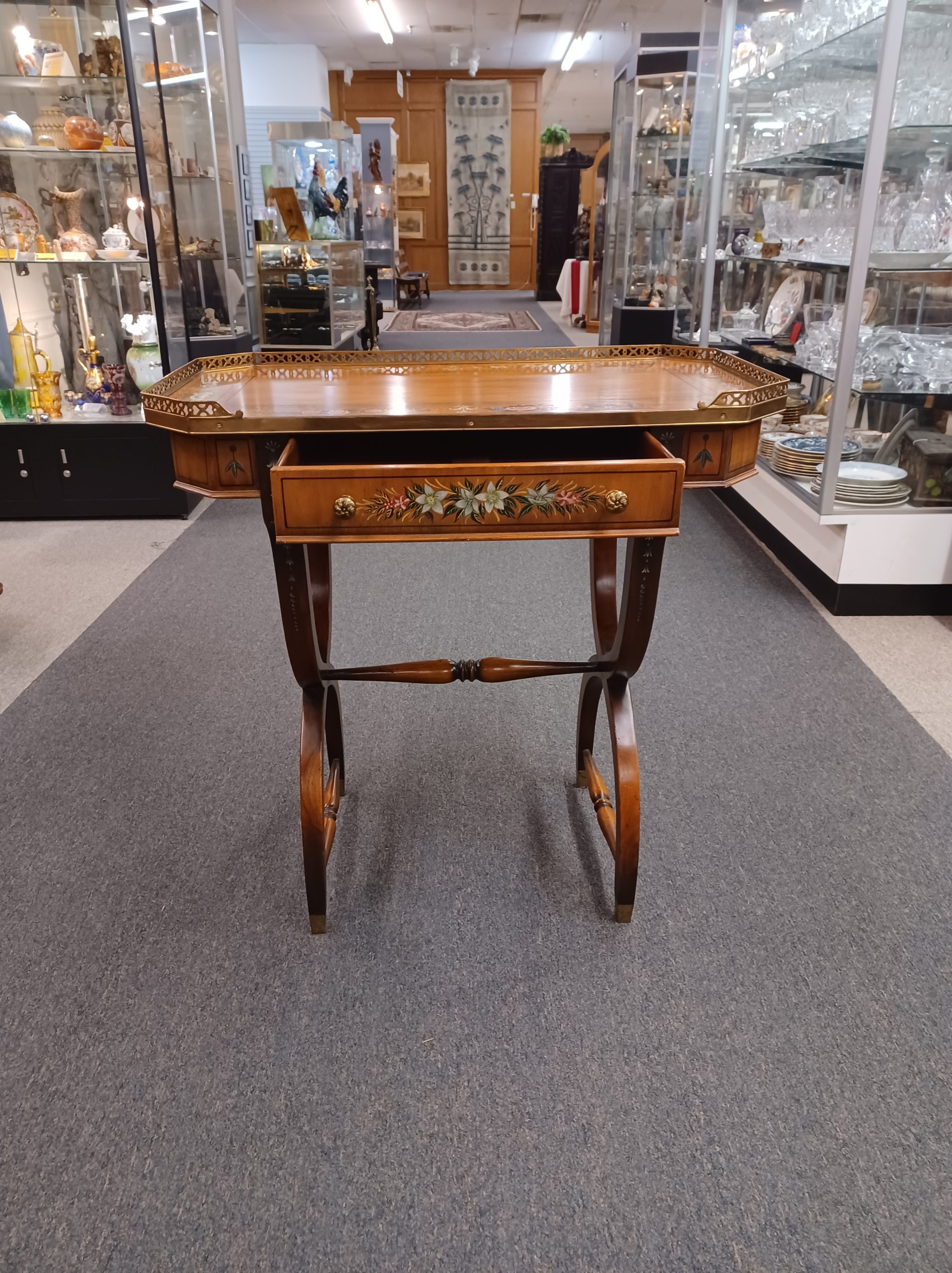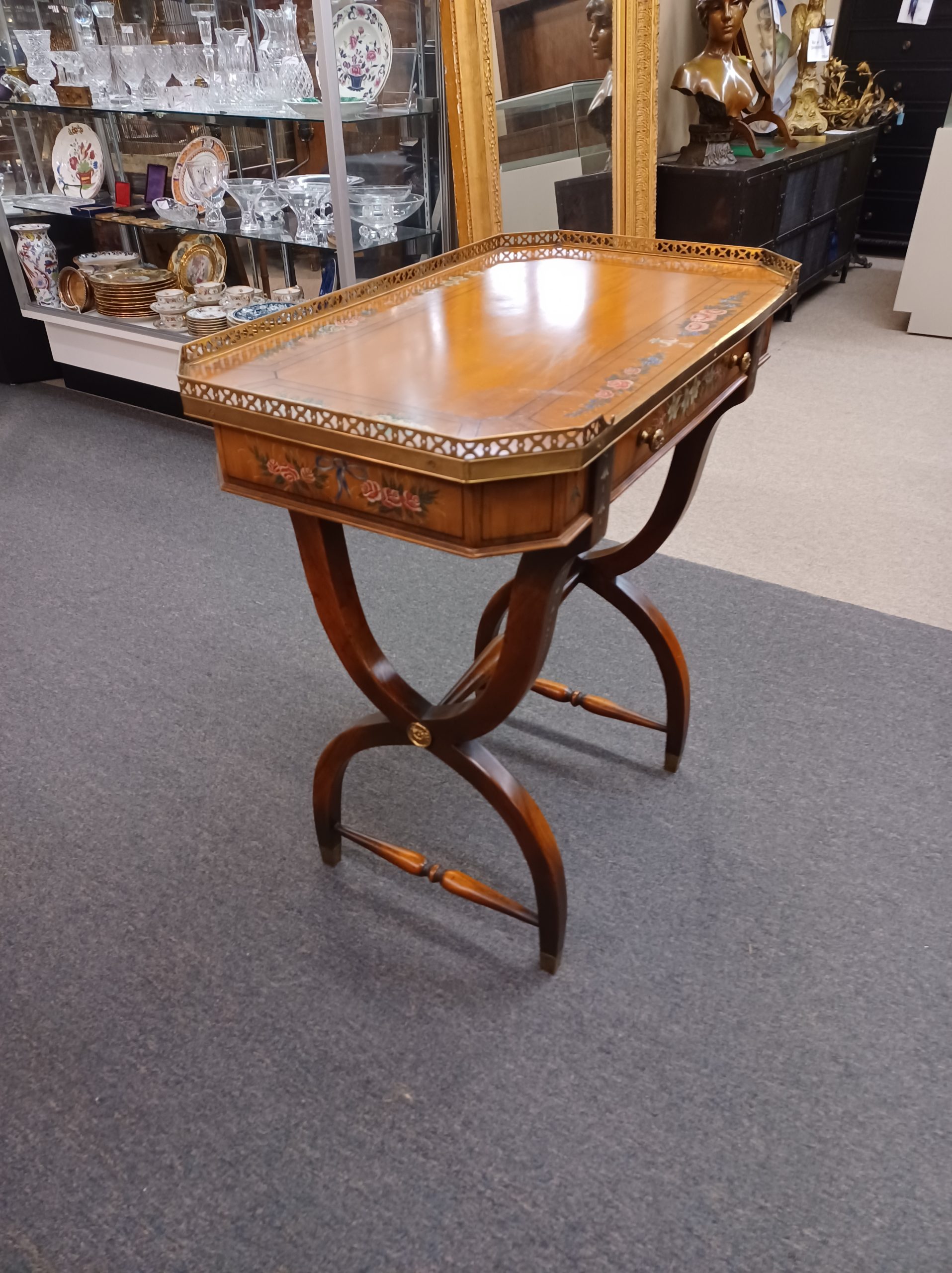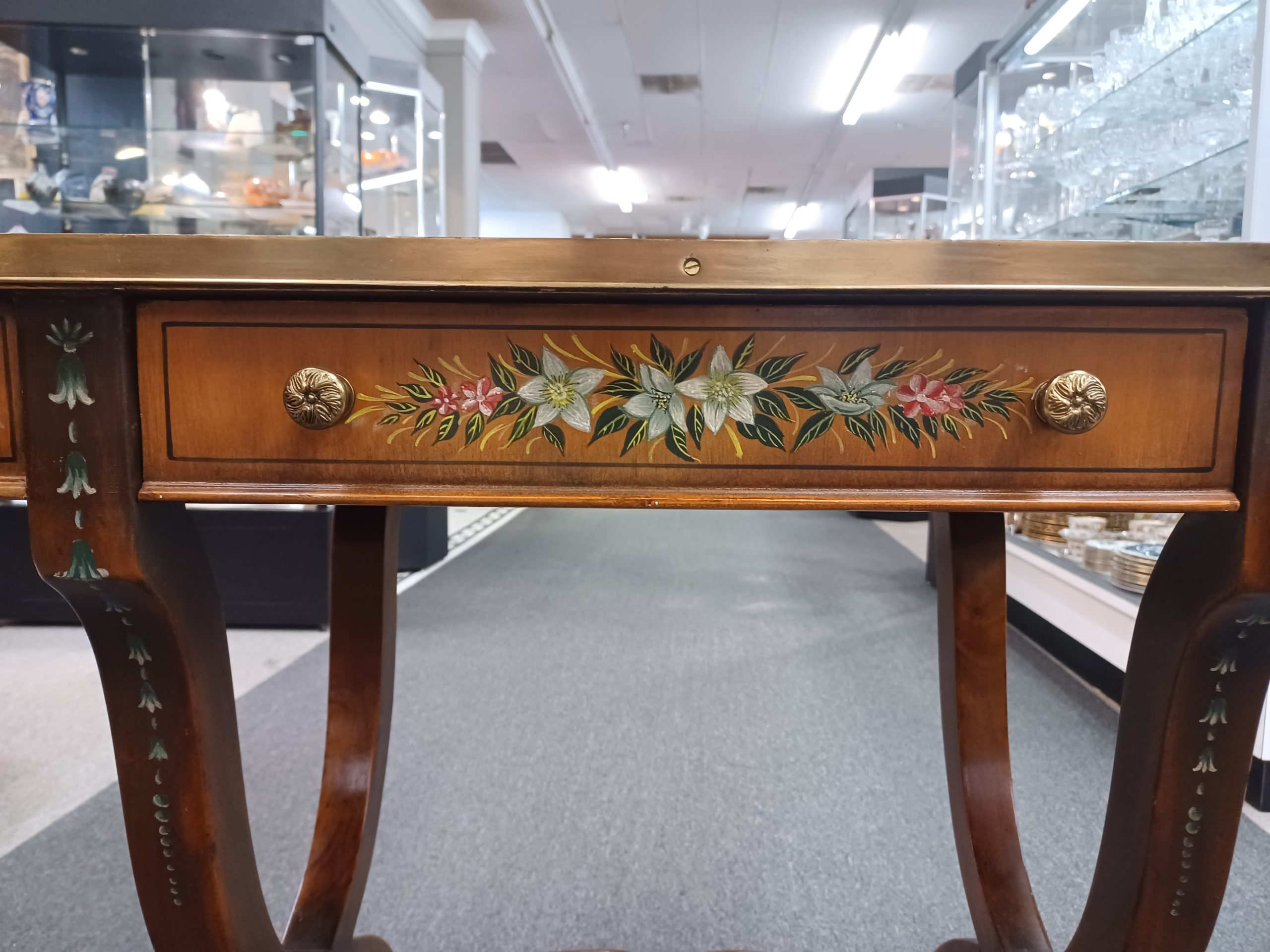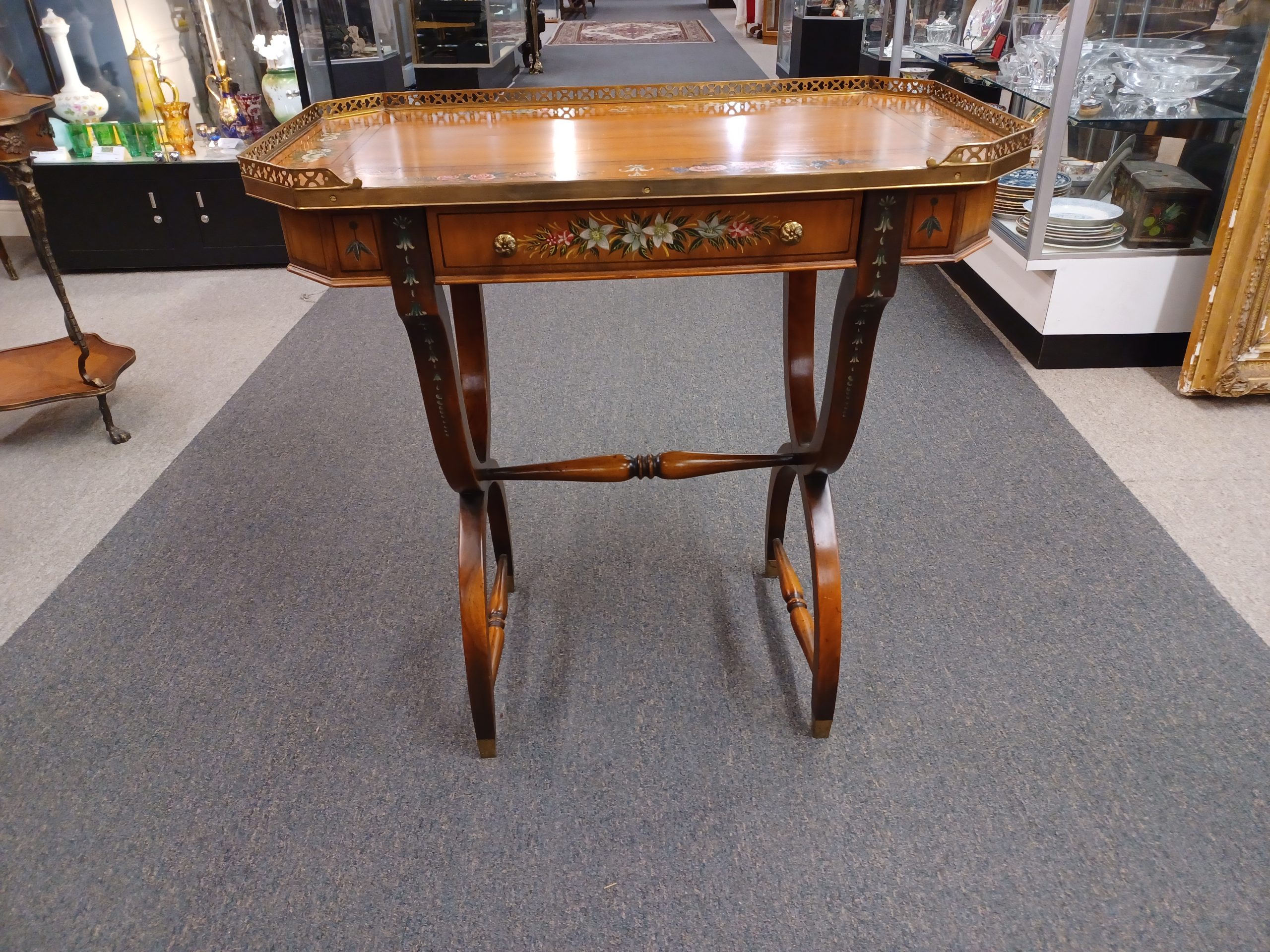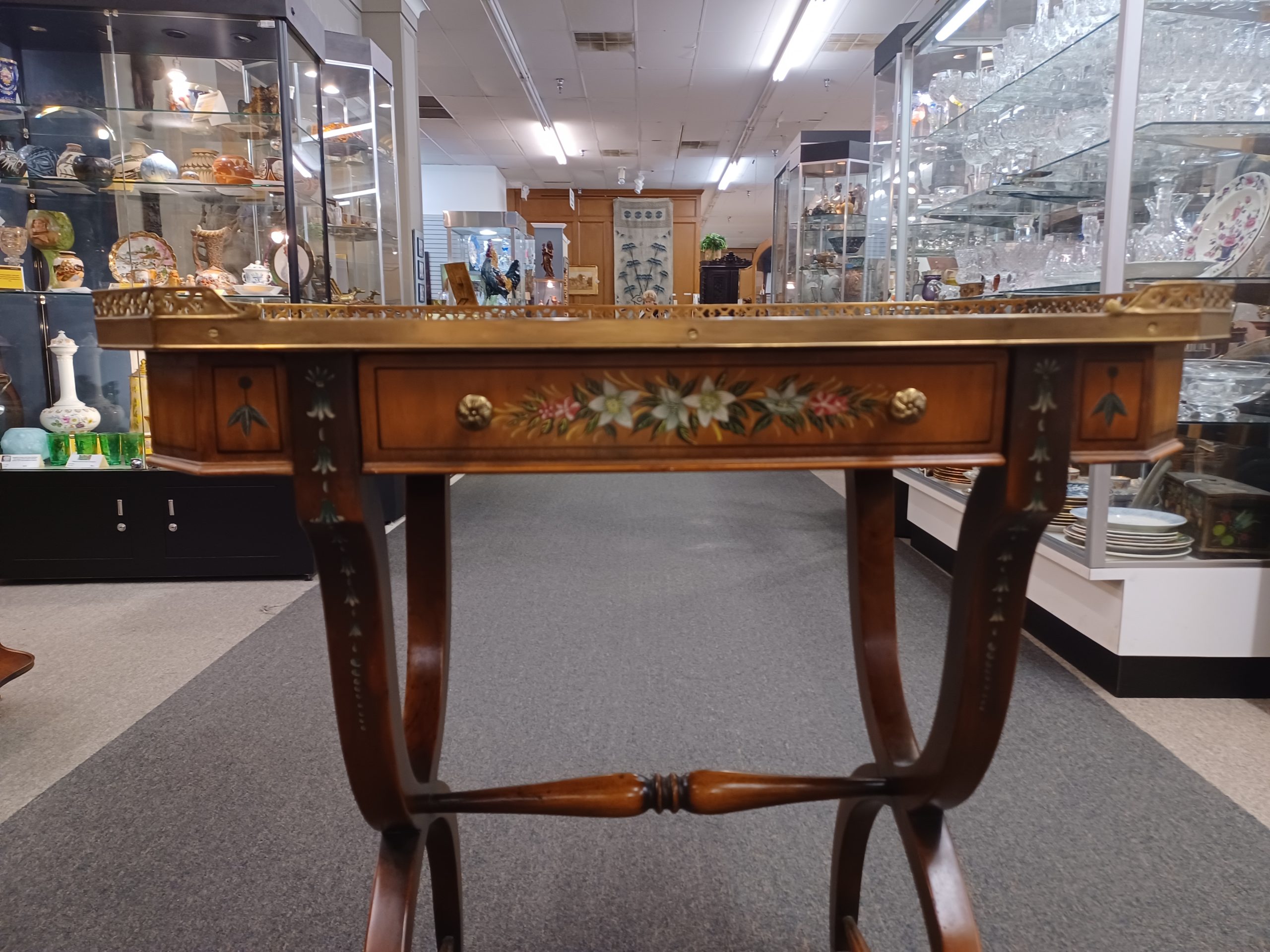 Vintage English Adams style petite writing desk with brass gallery, depicting an octagonal top with painted white and red flowers and green vines, single drawer with brass pulls, supported by a curved trestle base, ending in brass feet. From the late 20th century.