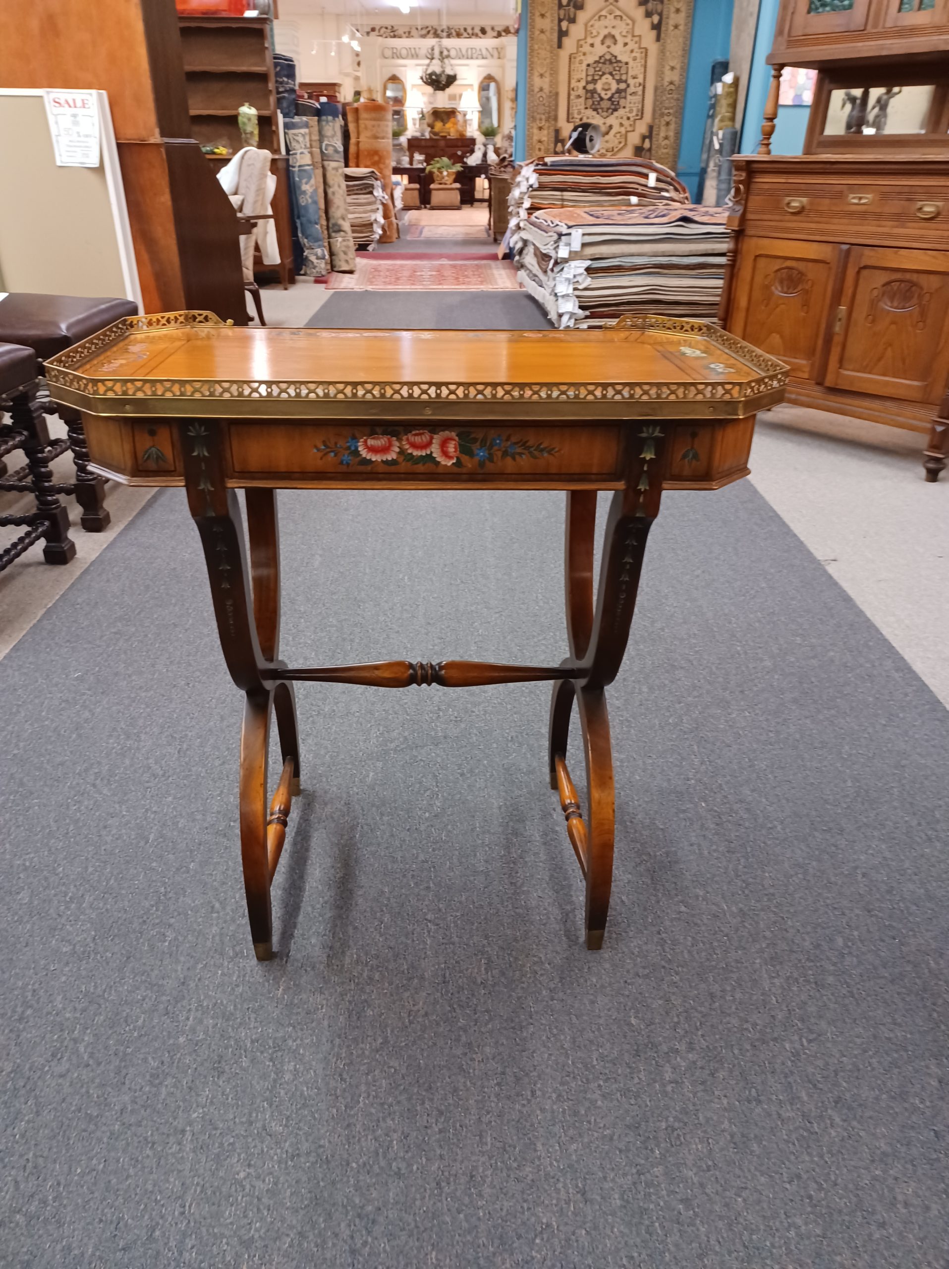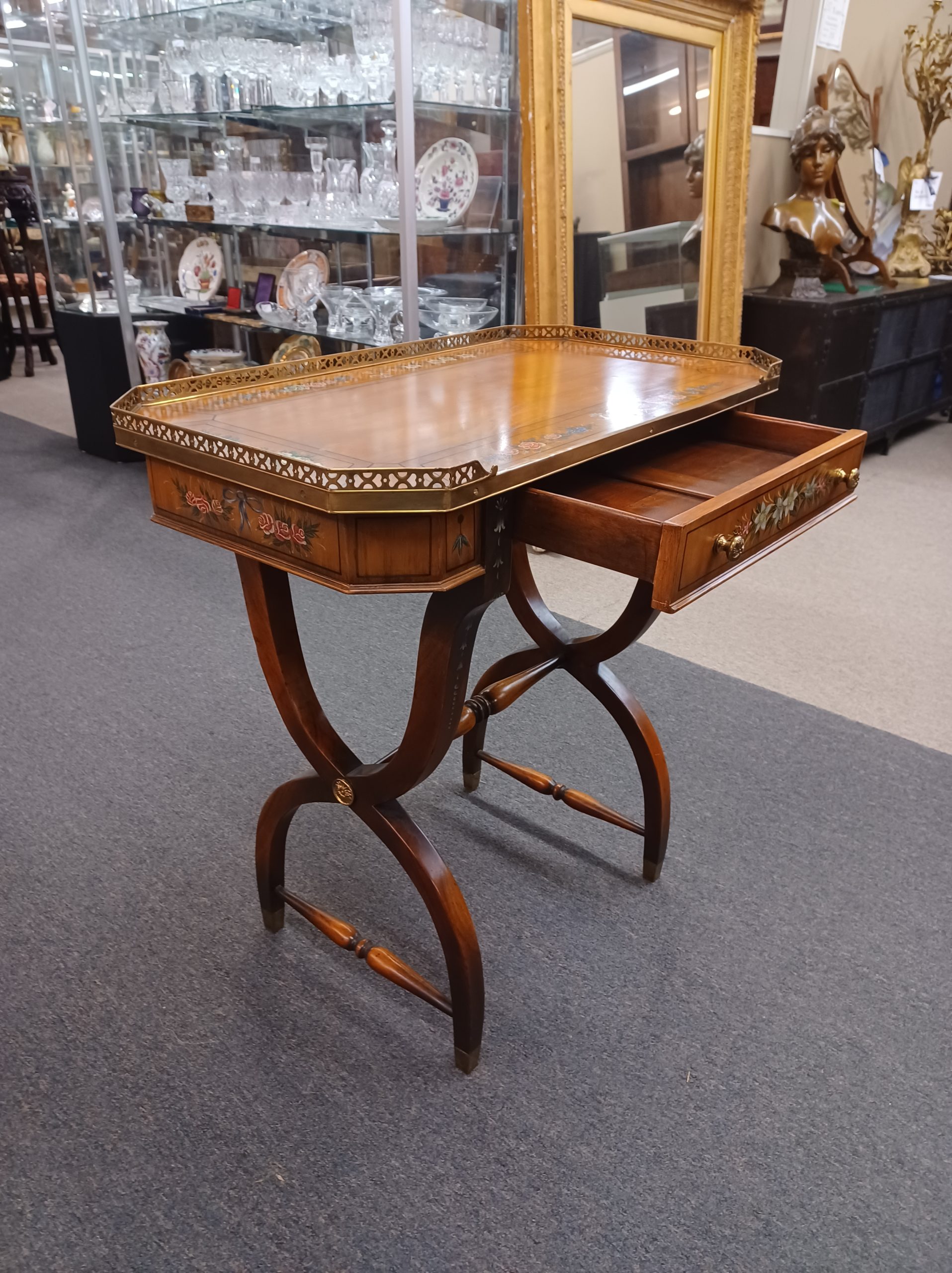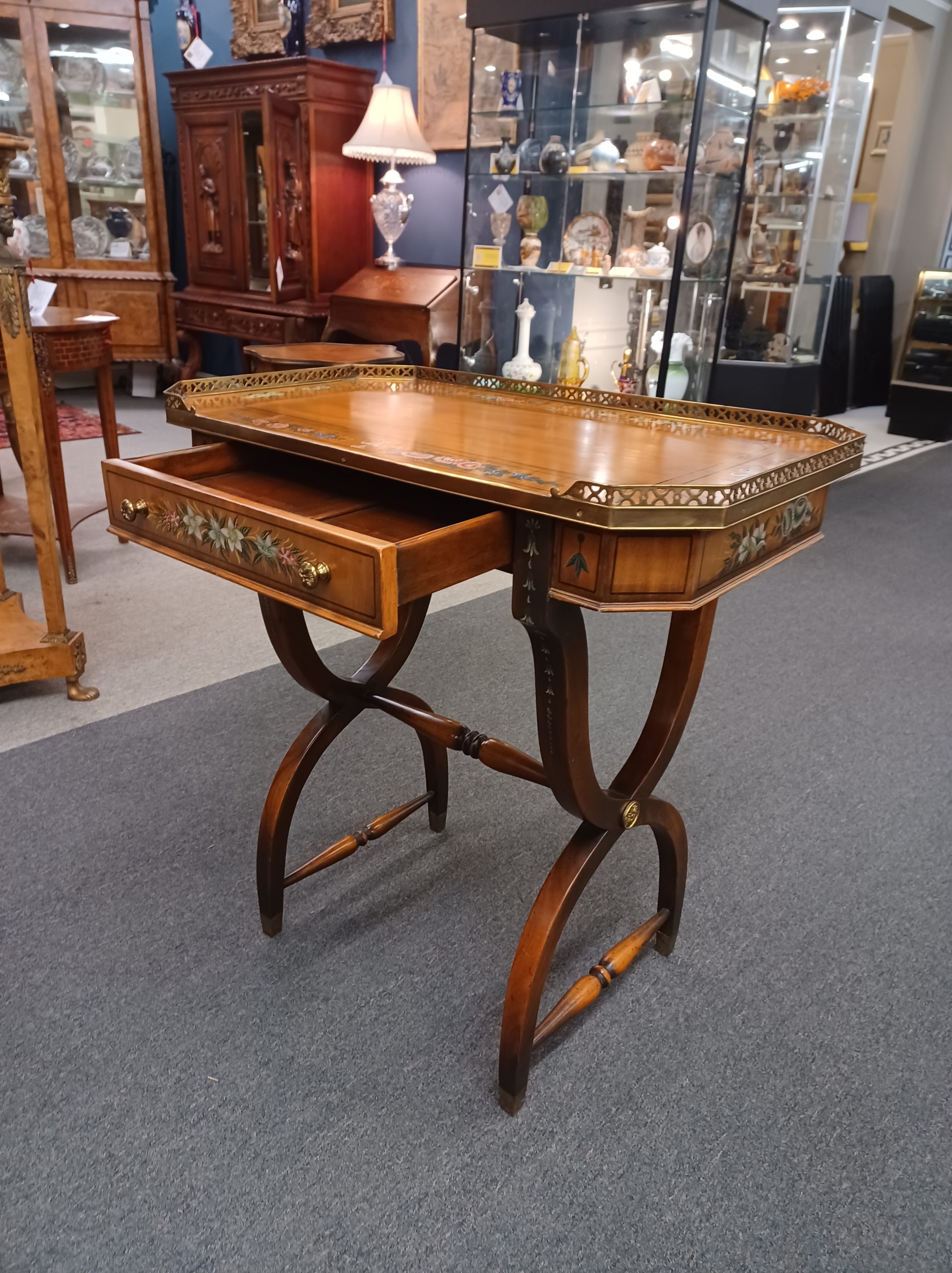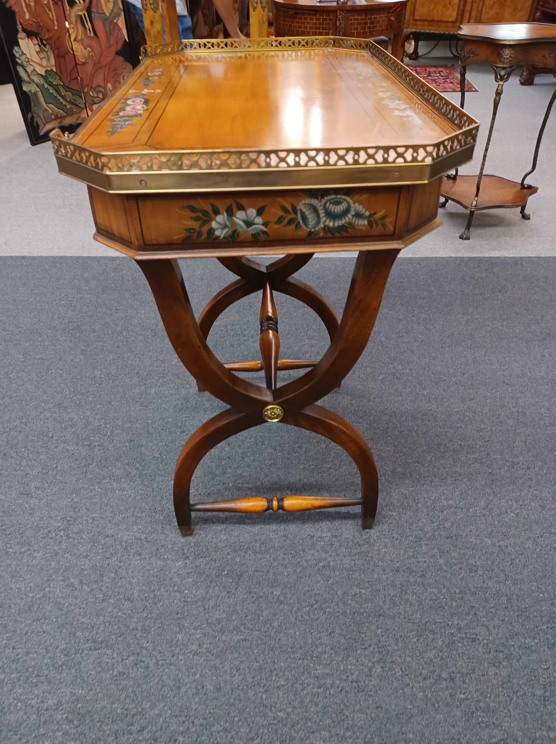 Vintage English Adams style petite writing desk with brass gallery, depicting an octagonal top with painted white and red flowers and green vines, single drawer with brass pulls, supported by a curved trestle base, ending in brass feet. From the late 20th century.