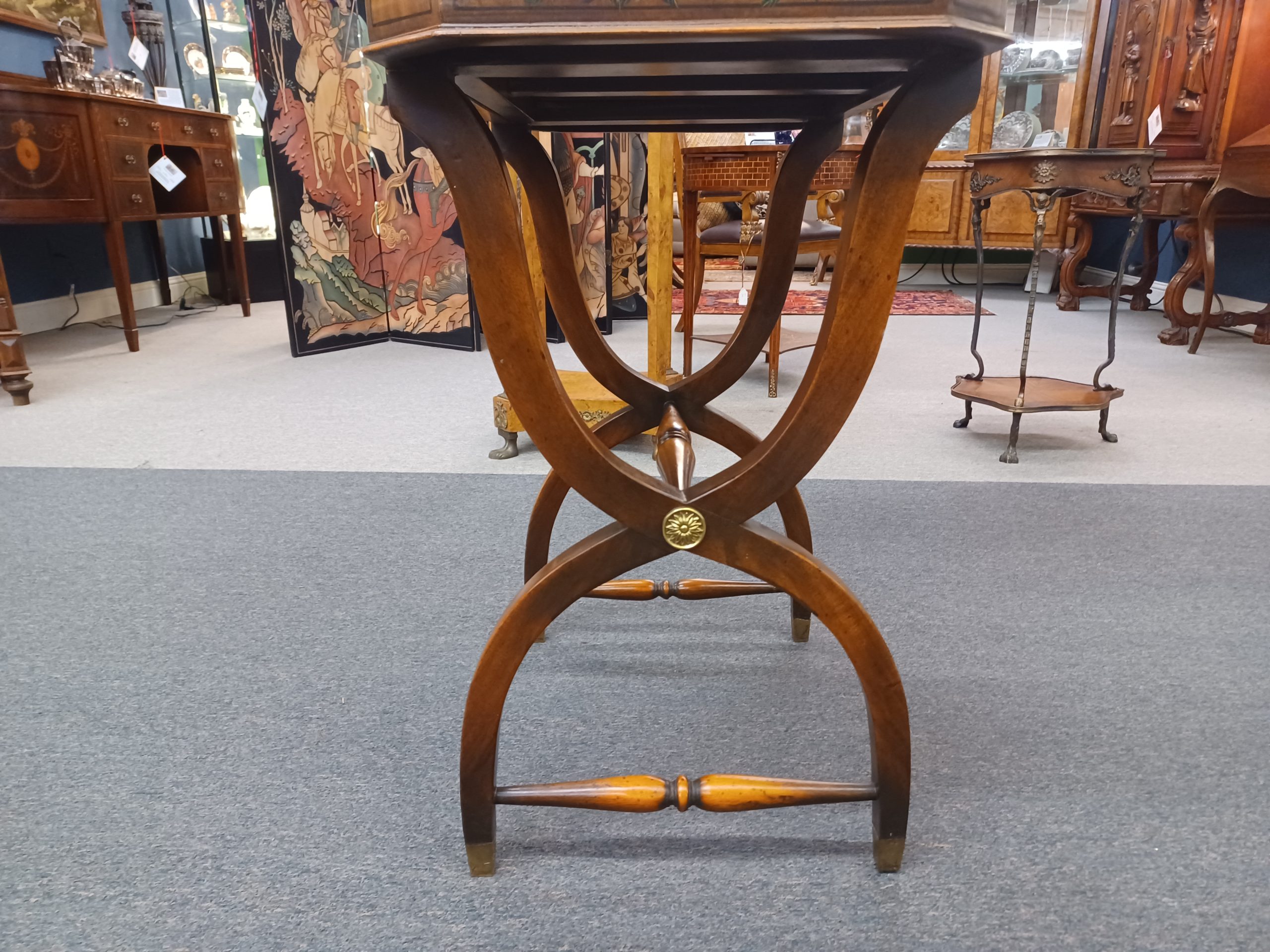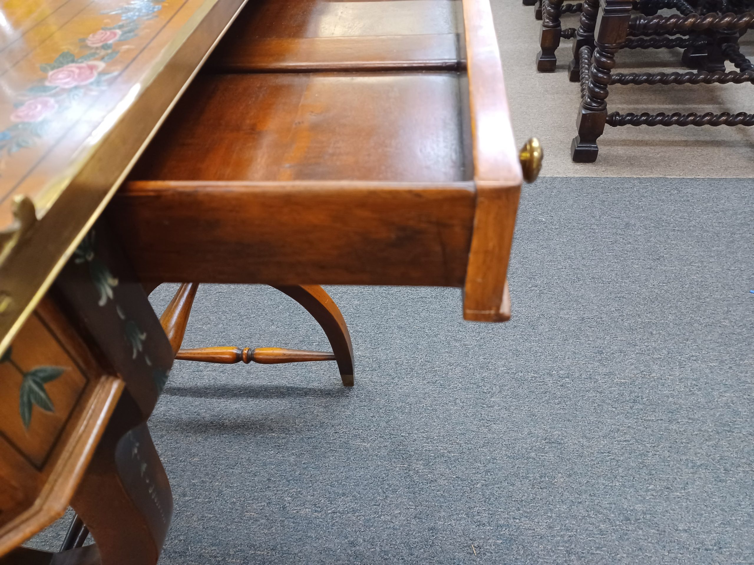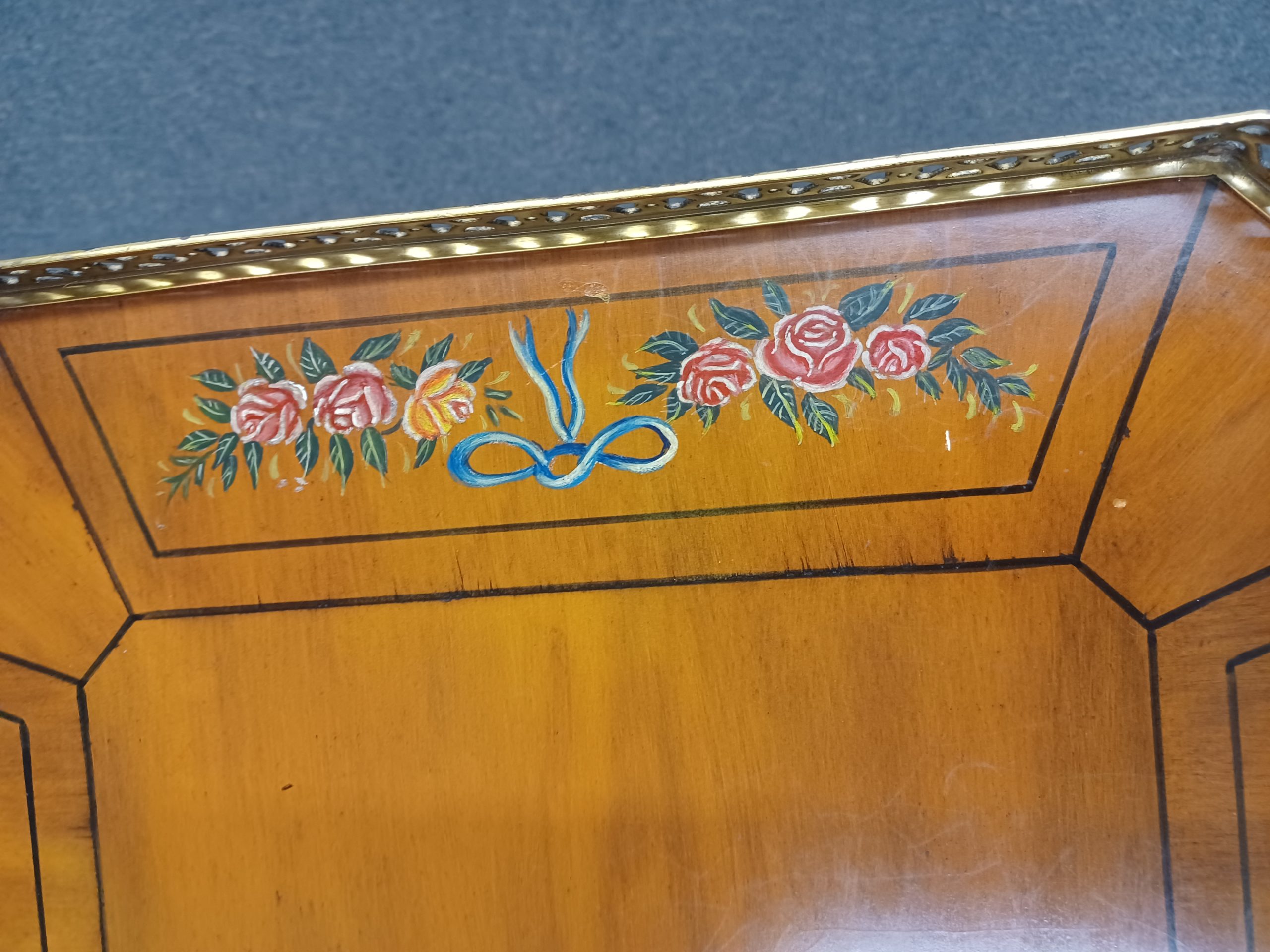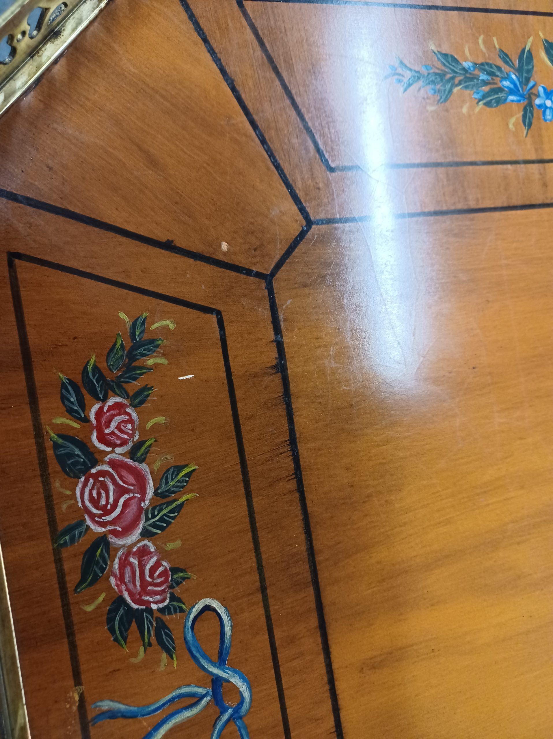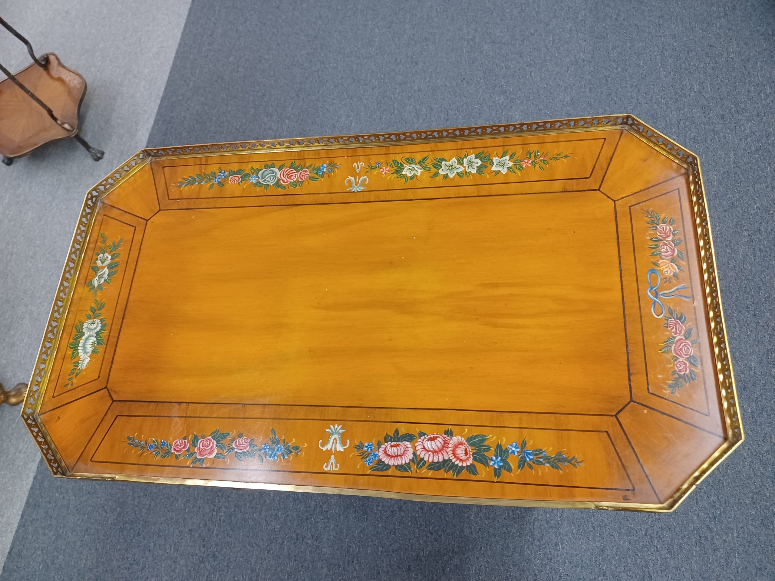 Vintage English Adams style petite writing desk with brass gallery, depicting an octagonal top with painted white and red flowers and green vines, single drawer with brass pulls, supported by a curved trestle base, ending in brass feet. From the late 20th century.
