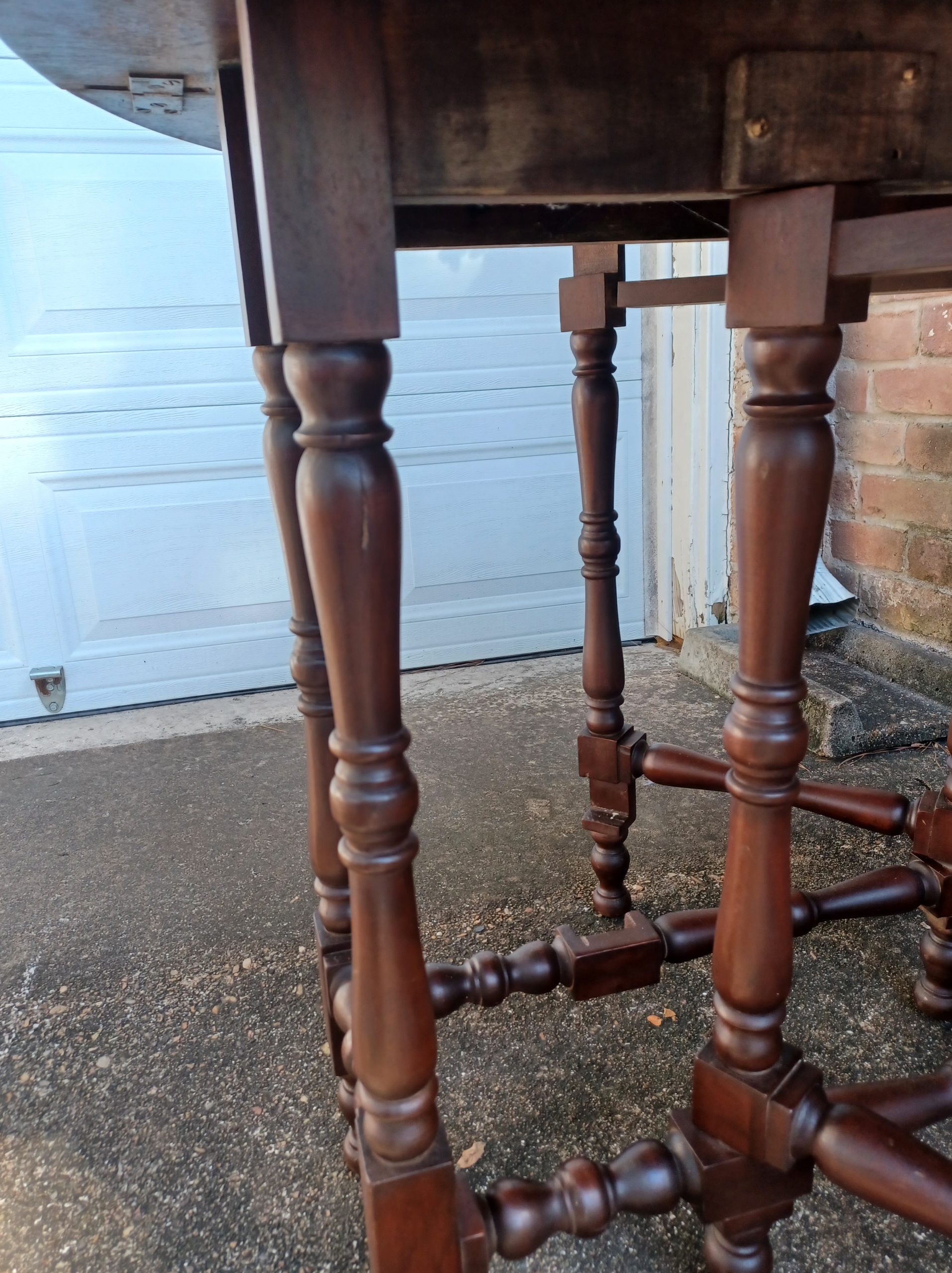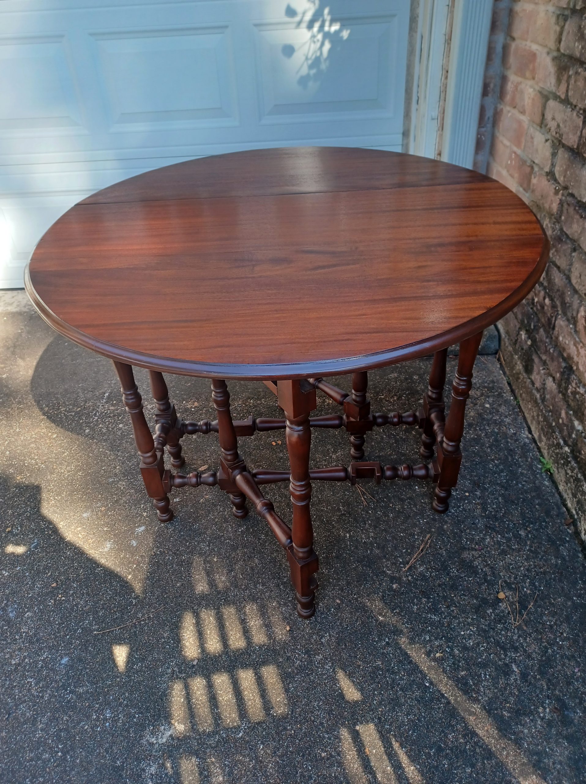 Antique English drop leaf/gate leg walnut table. Featuring a drop-down leaf on each side when open it has an oval top, and it’s supported by turned legs and stretchers. Circa early 20th century.