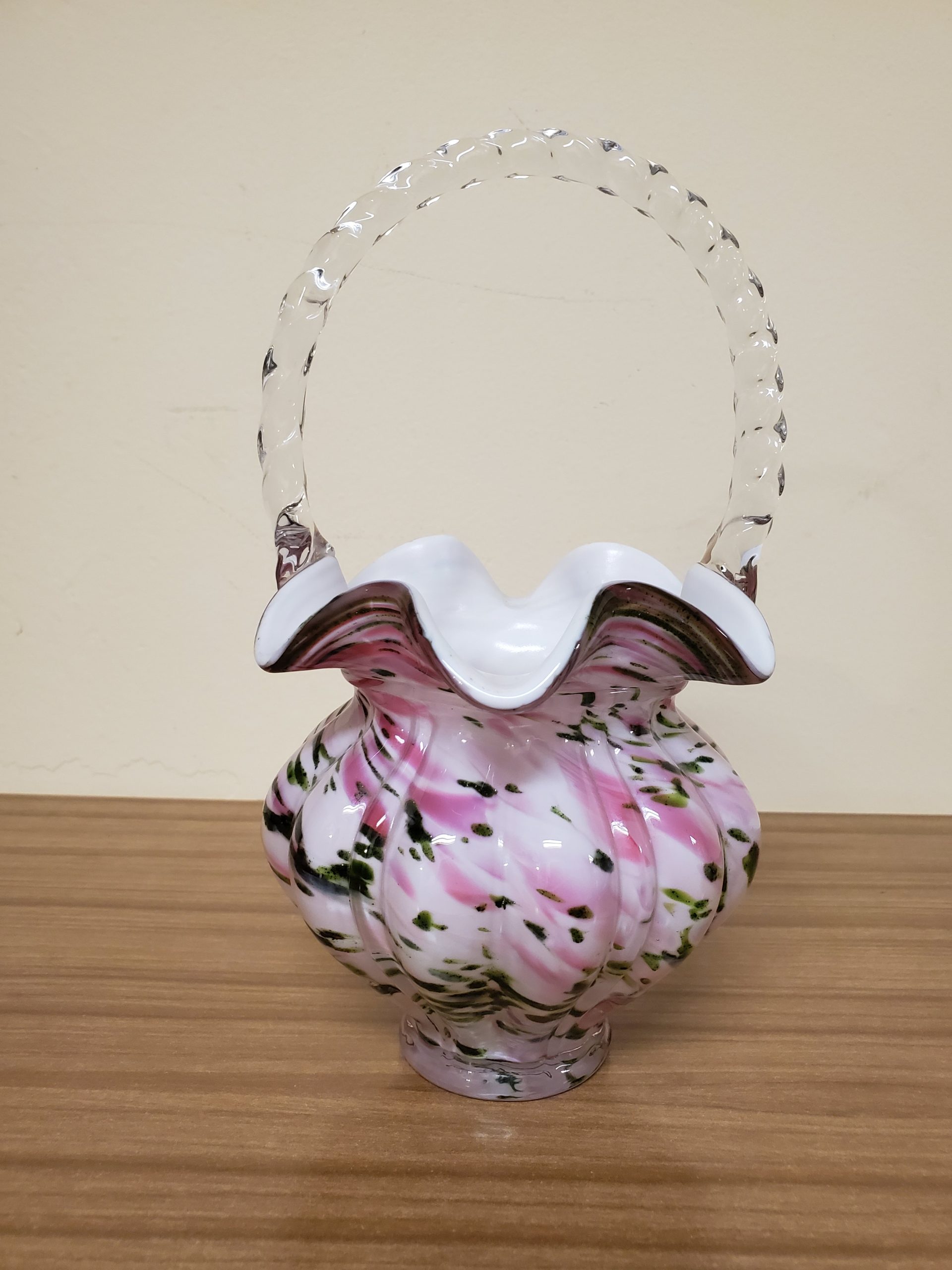 Vintage Fenton Limited Edition glass Vasa Murrhina Rose & Aventurine Green. This basket was made on the celebration of their 95th anniversary. Signed by Bill Fenton.