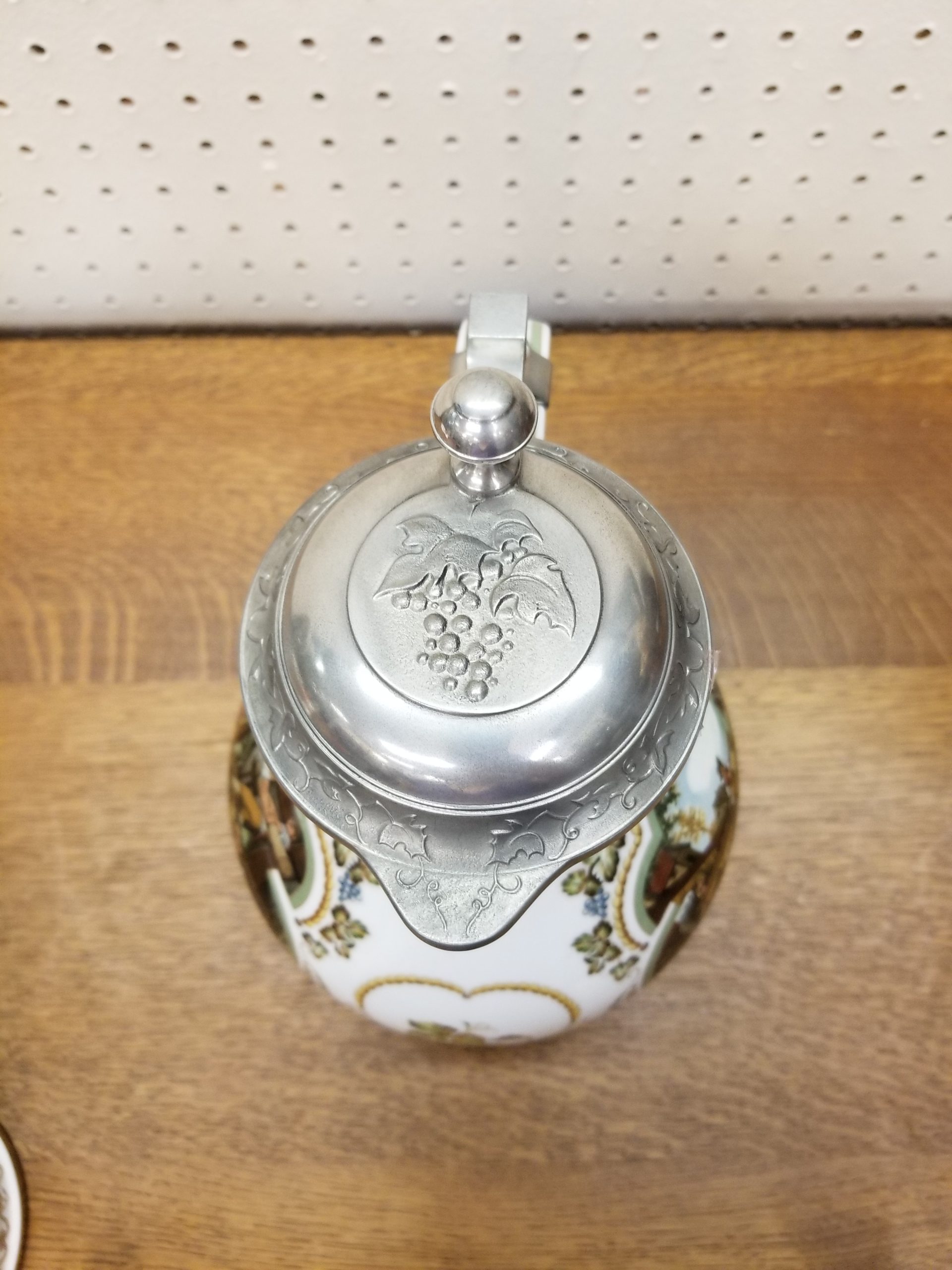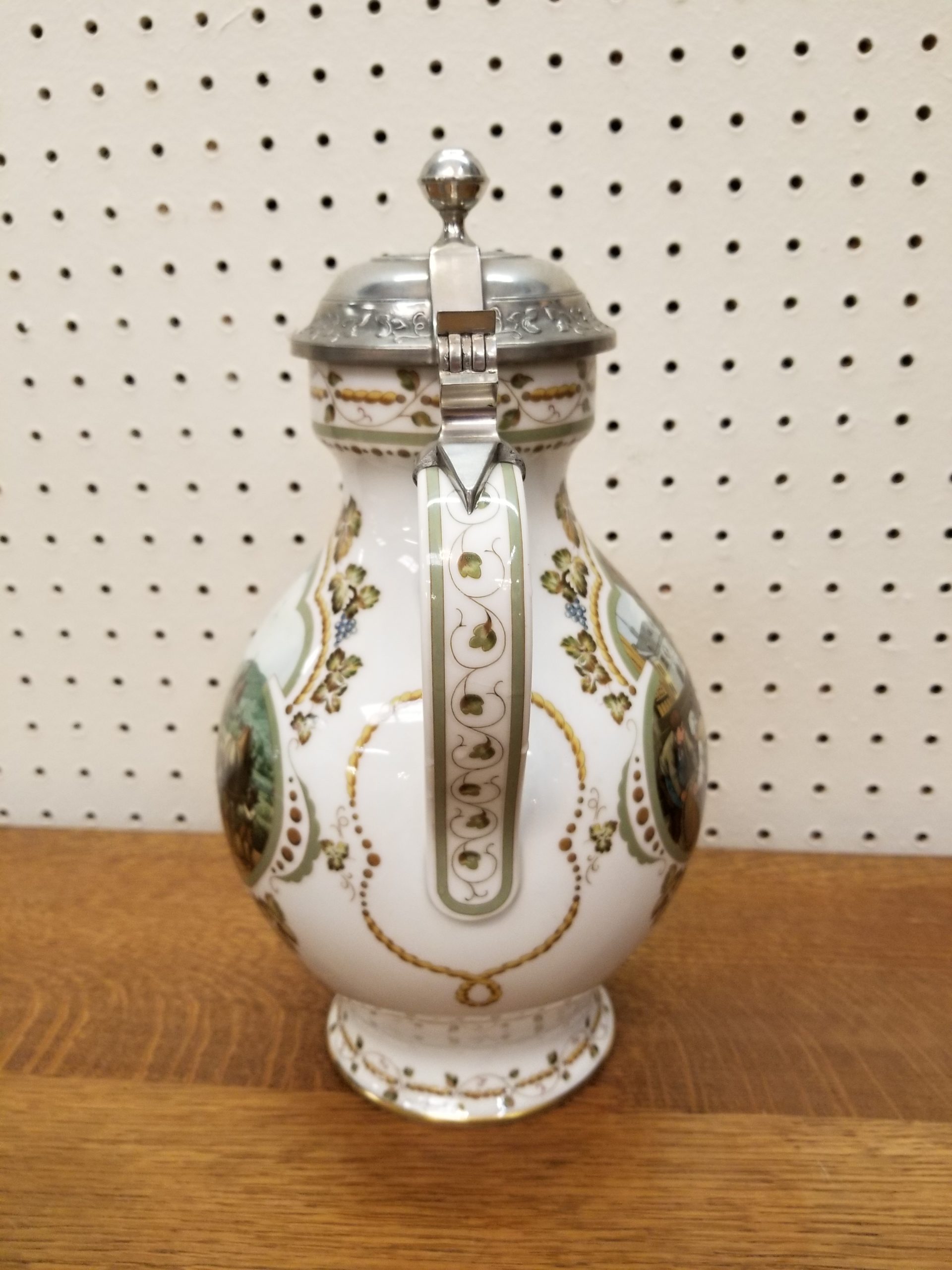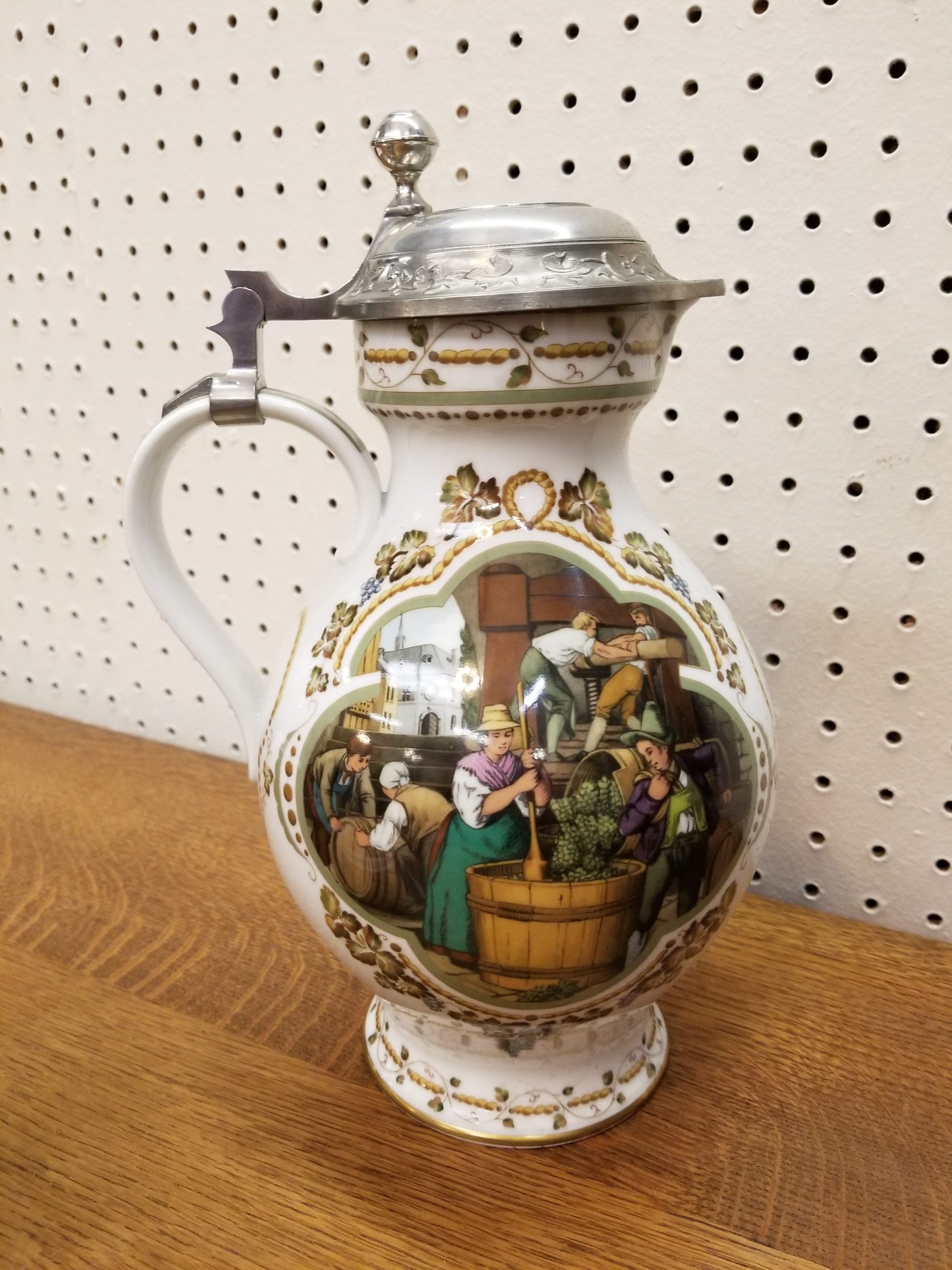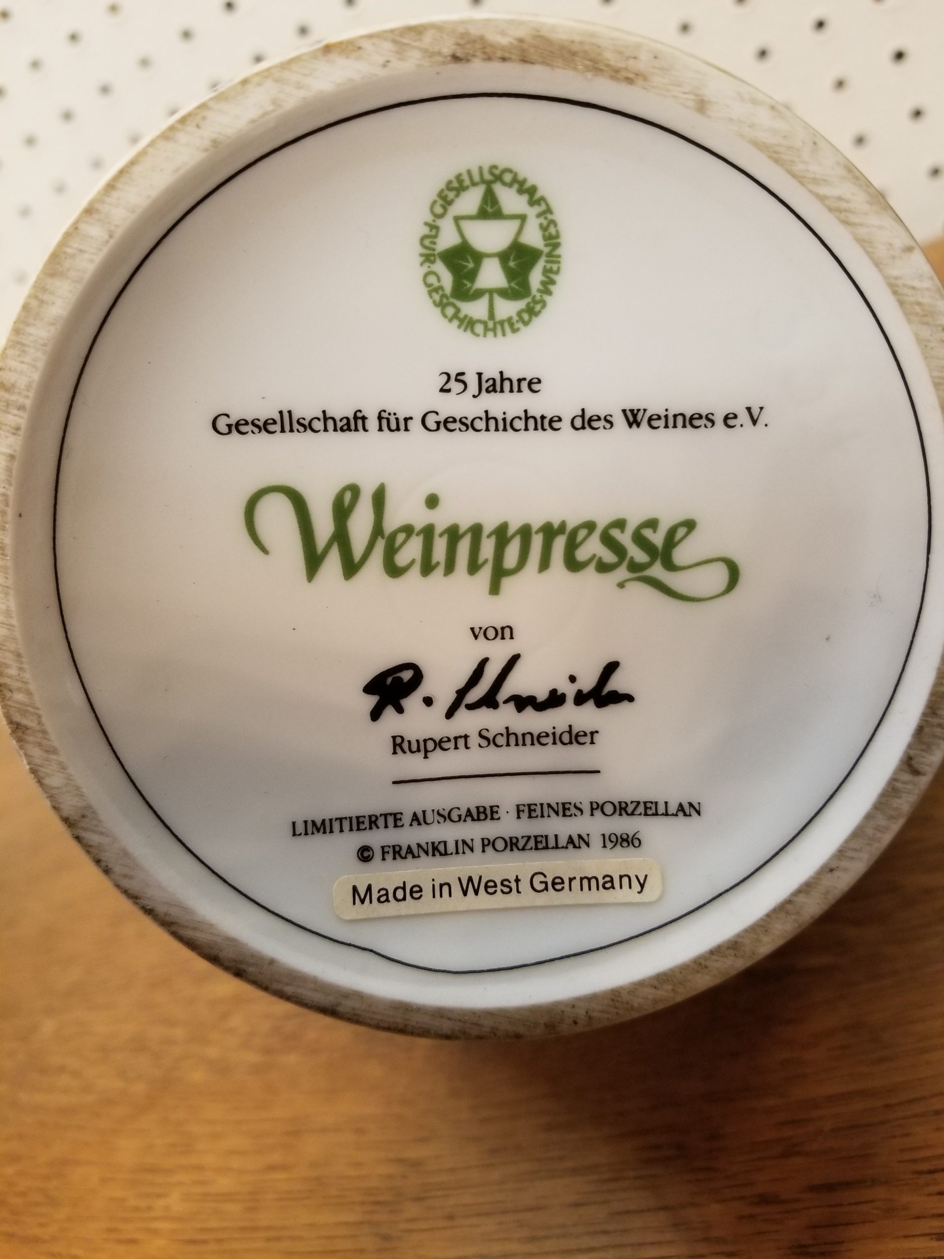 Franklin Porcelain “Weinpresse” wine jug designed by Rupert Schneider and made as a limited edition in 1986 to celebrate 25 years of the Society of the History of Wine. The back-stamp is in German.