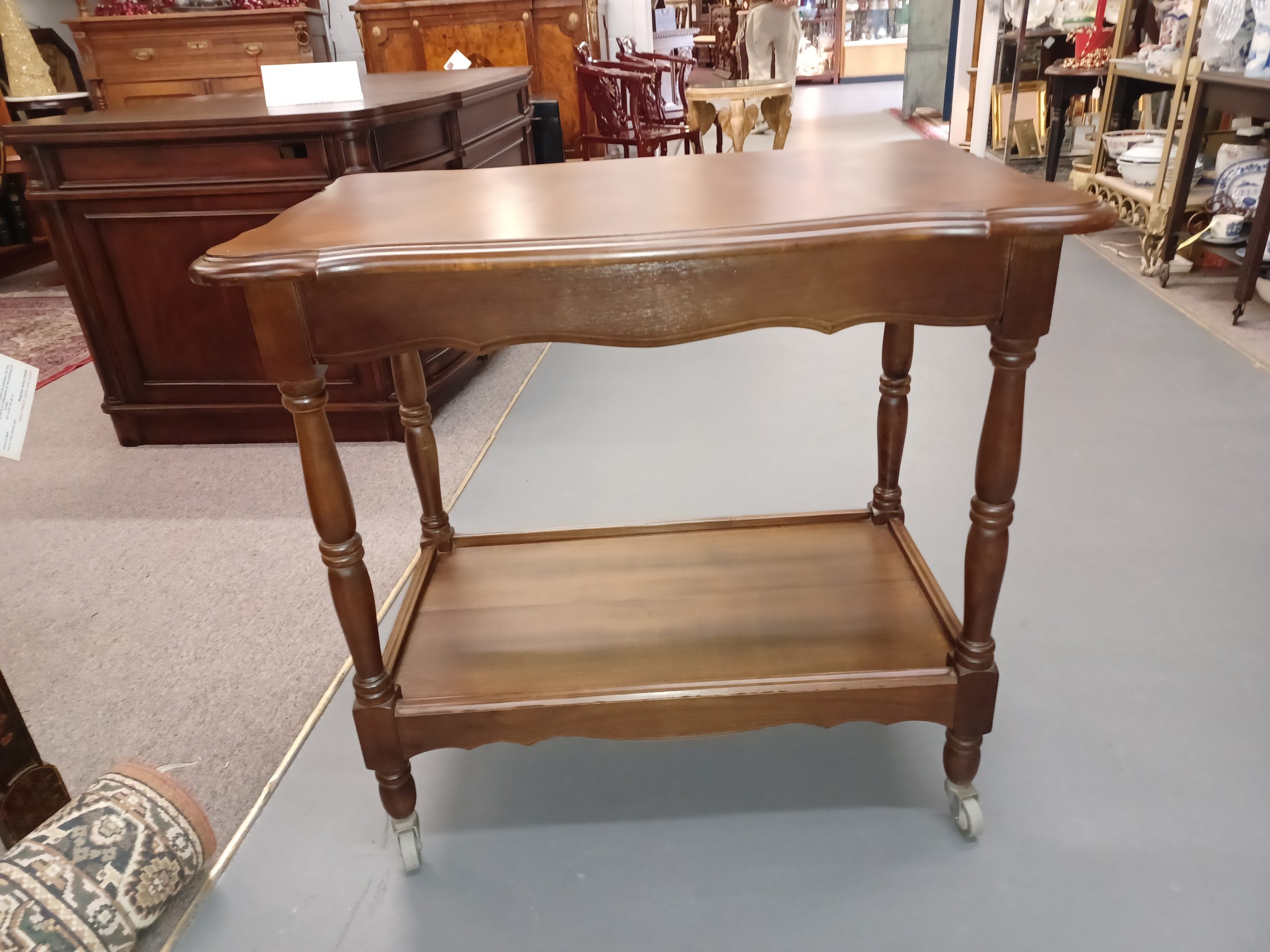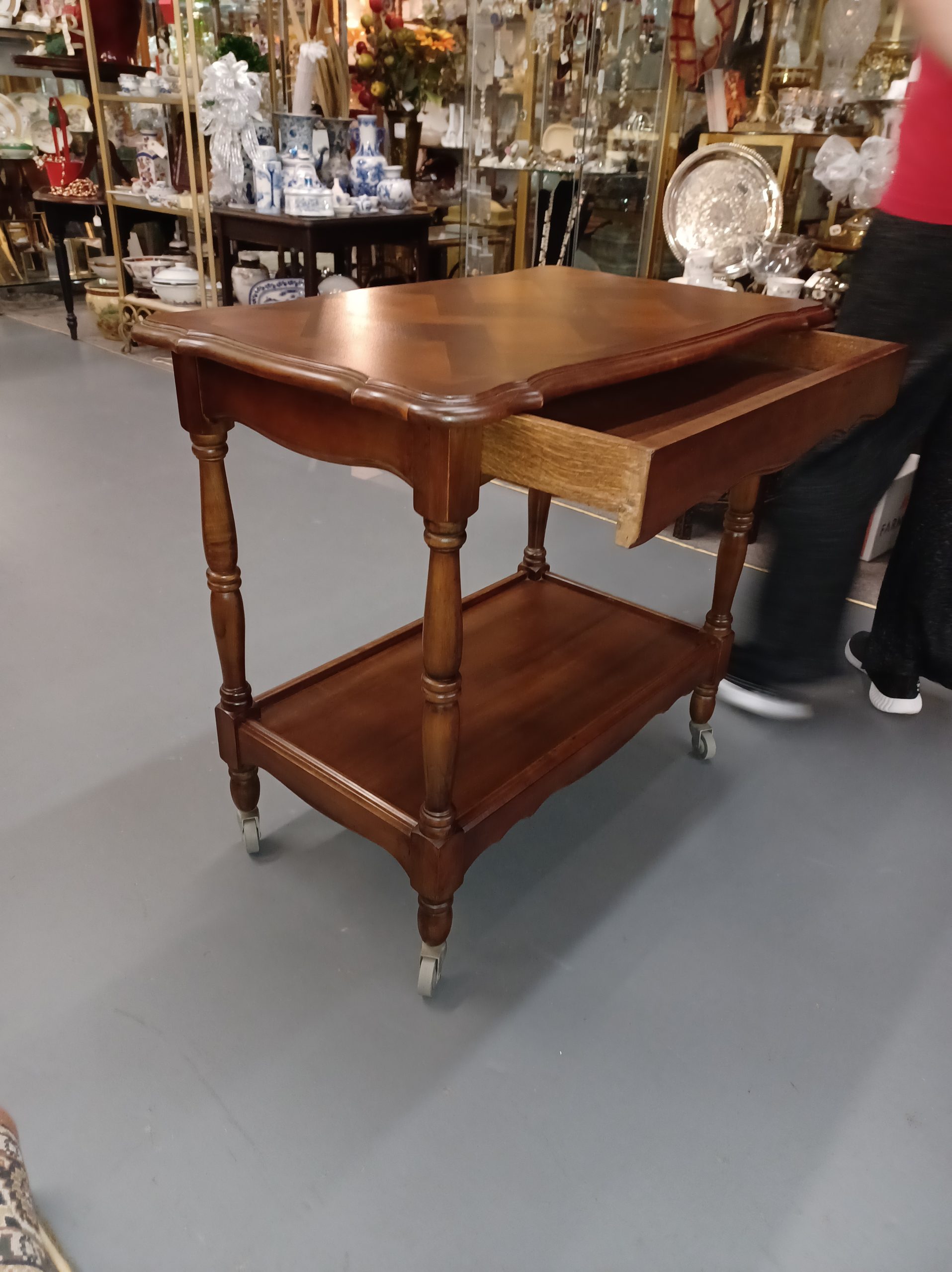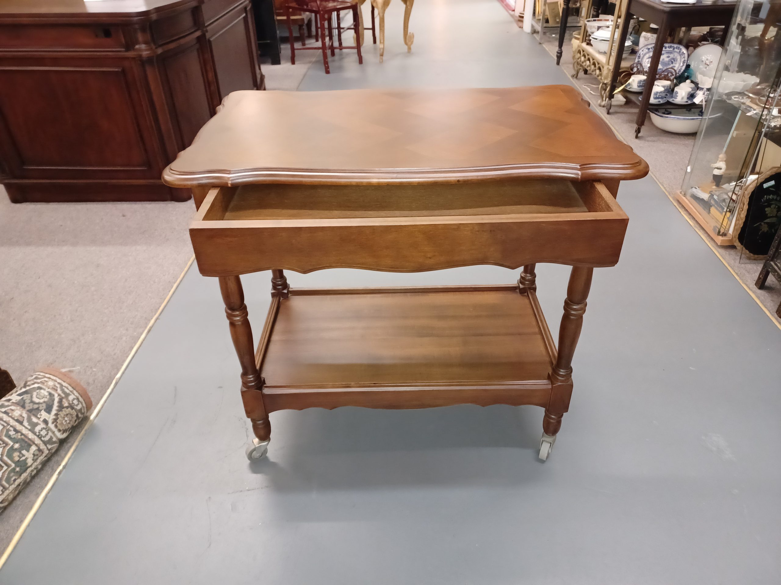 Vintage French cherry wood trolley or “dumbwaiter” serving cart having a dovetail drawer, and a bottom shelf, supported by rollers to move it easily.
