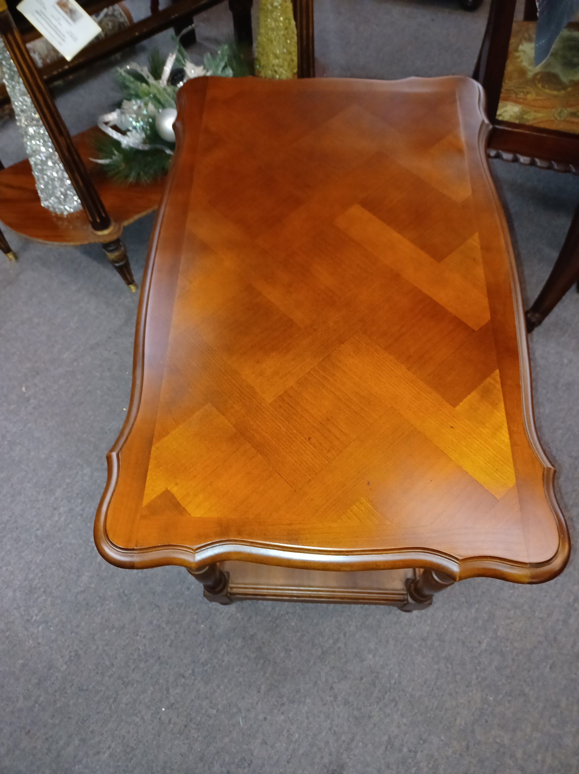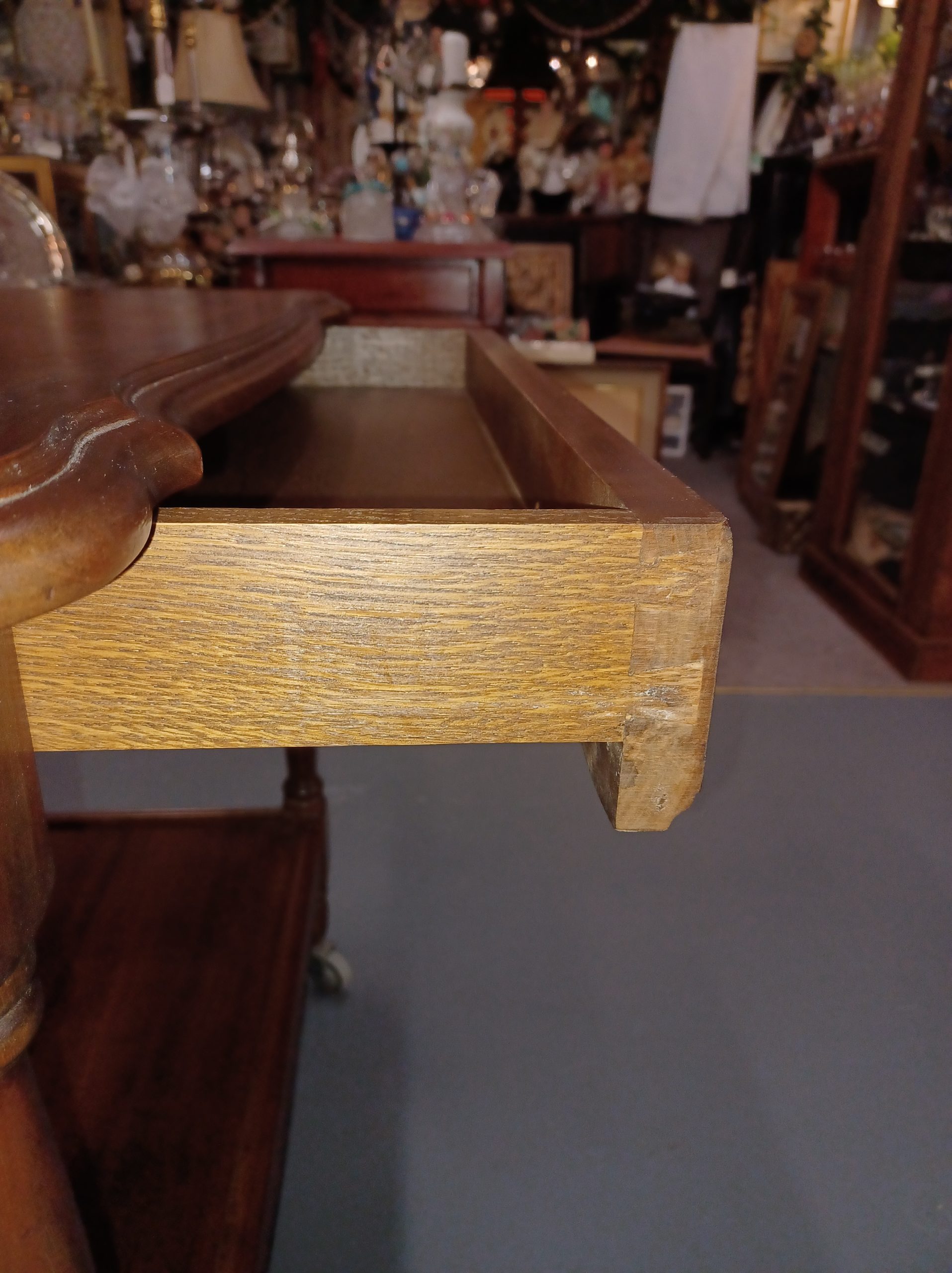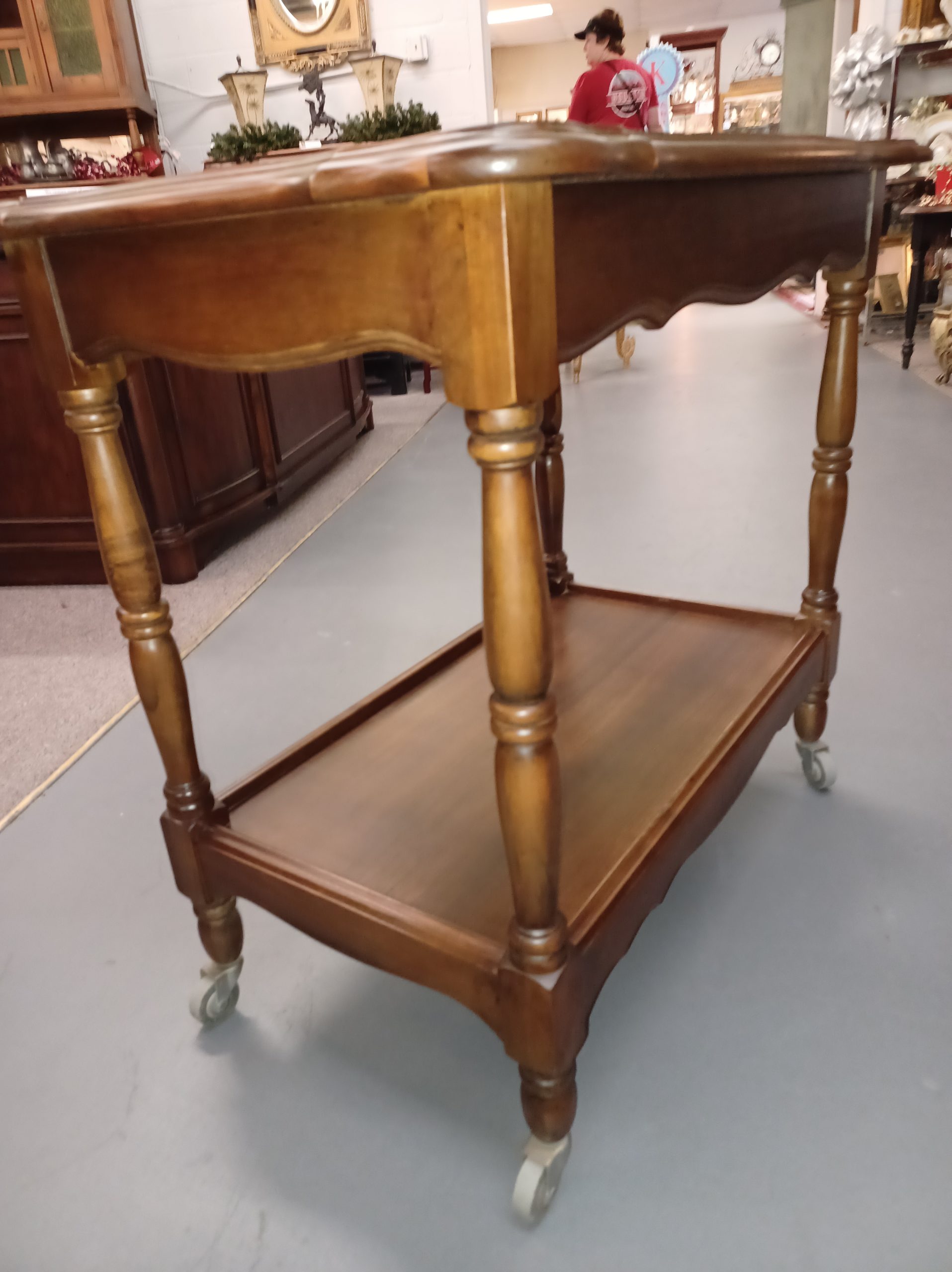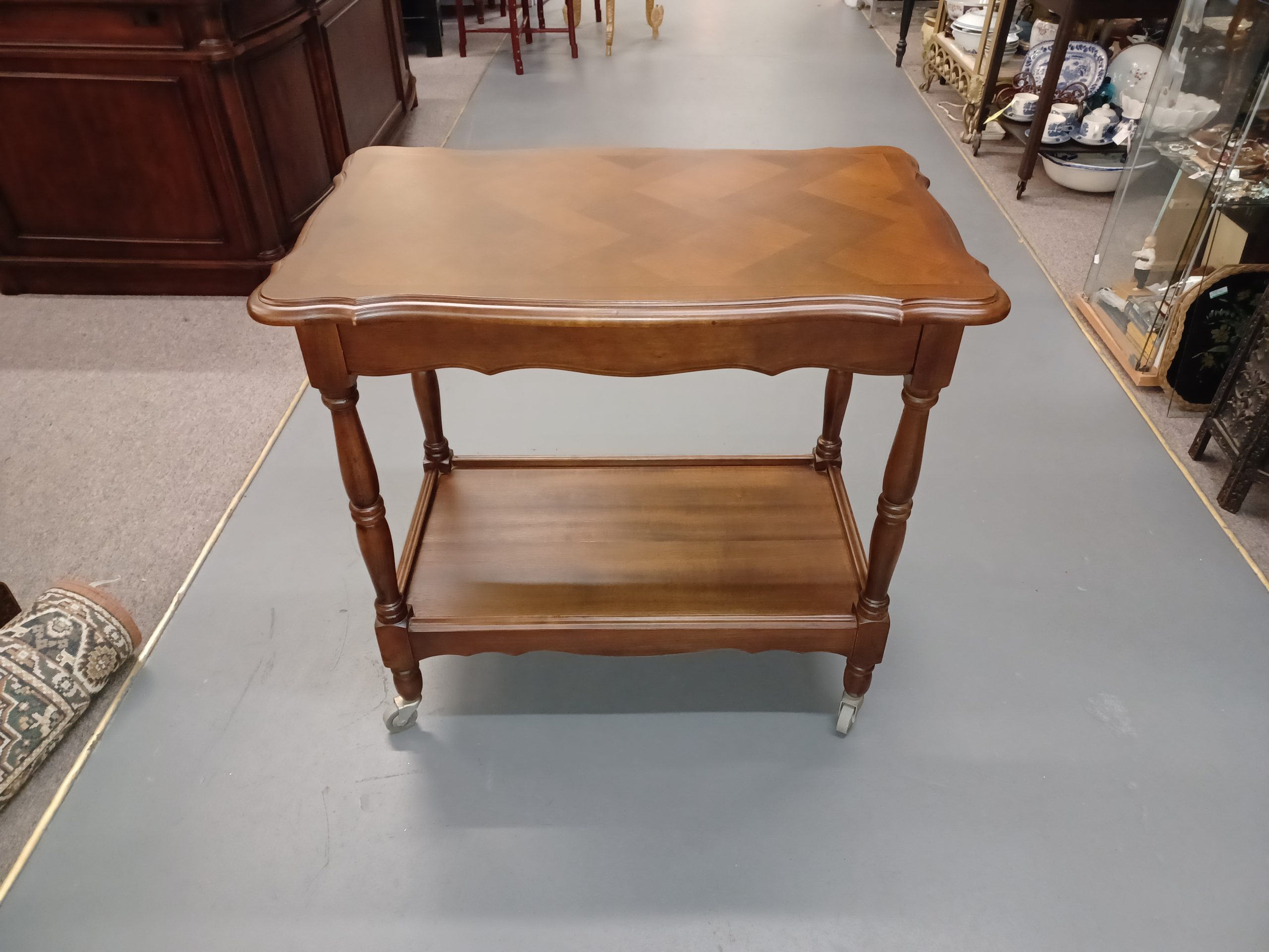 Vintage French cherry wood trolley or “dumbwaiter” serving cart having a dovetail drawer, and a bottom shelf, supported by rollers to move it easily.