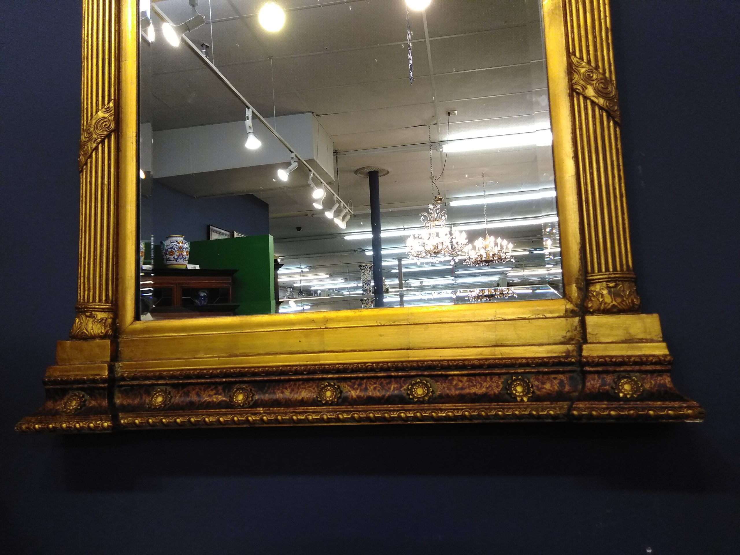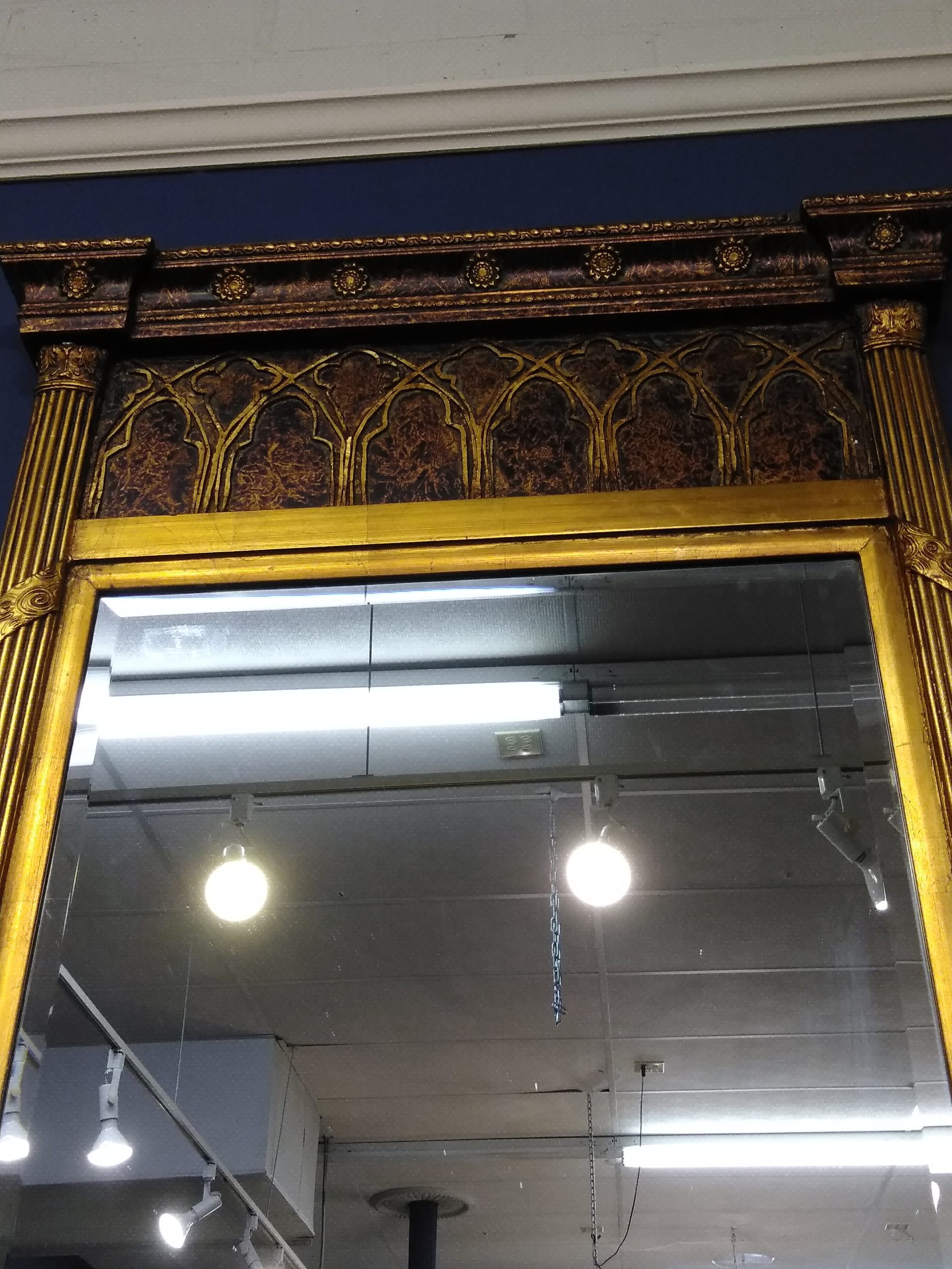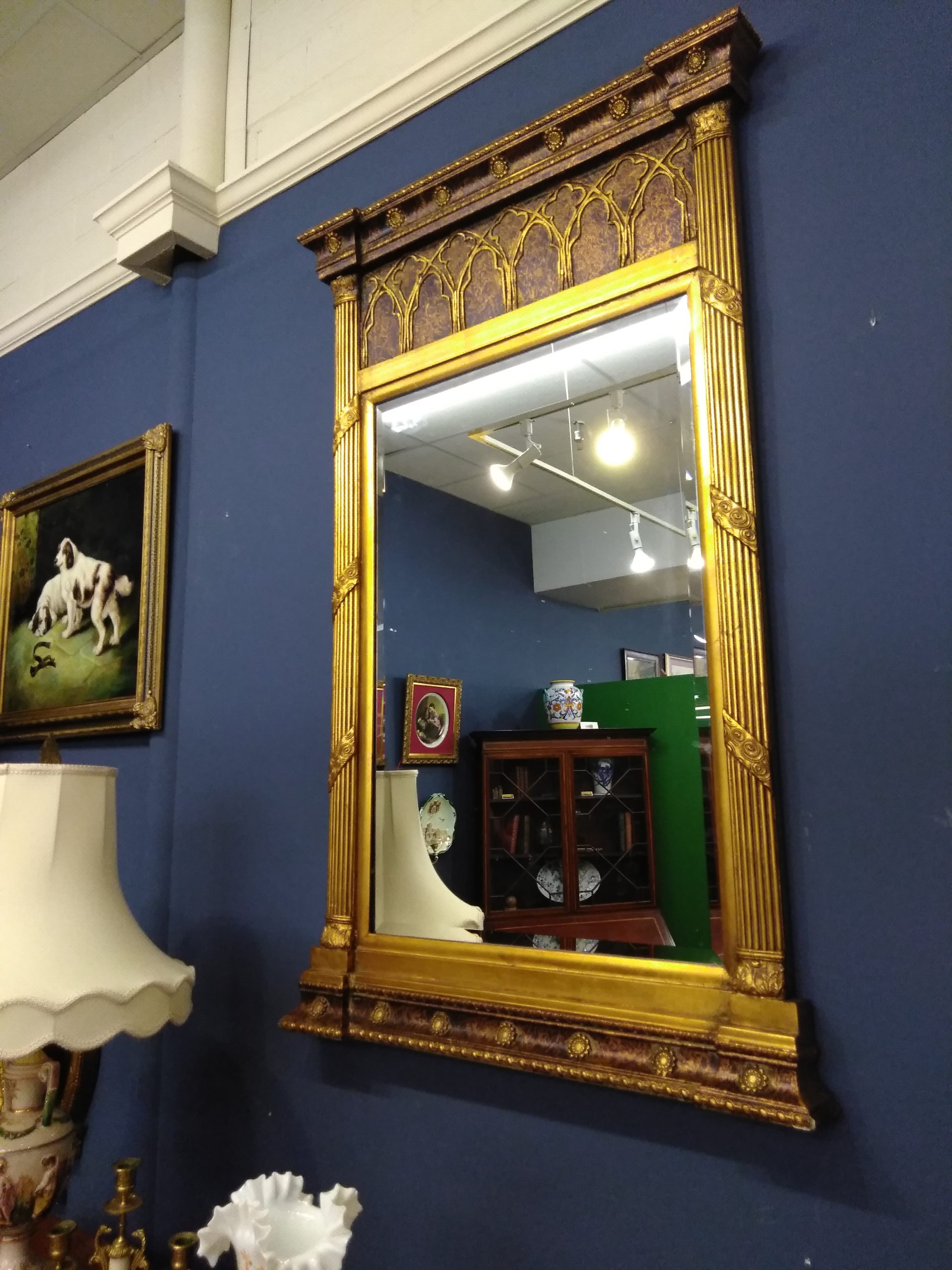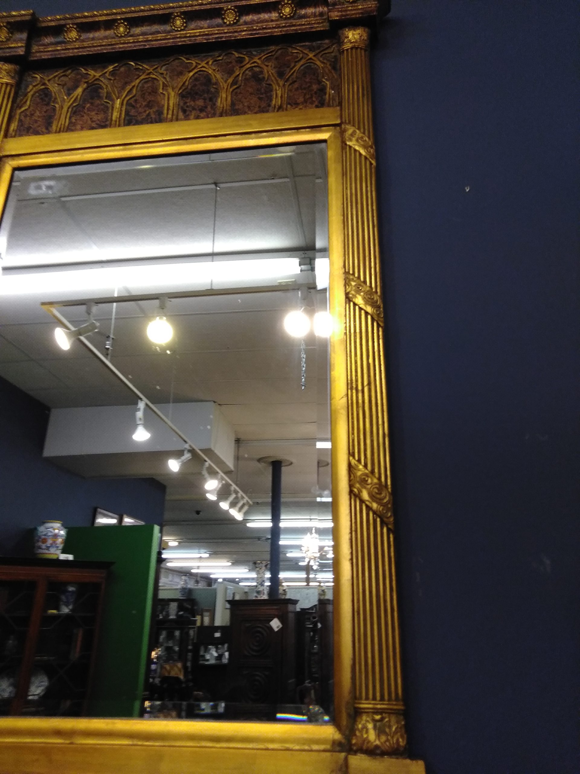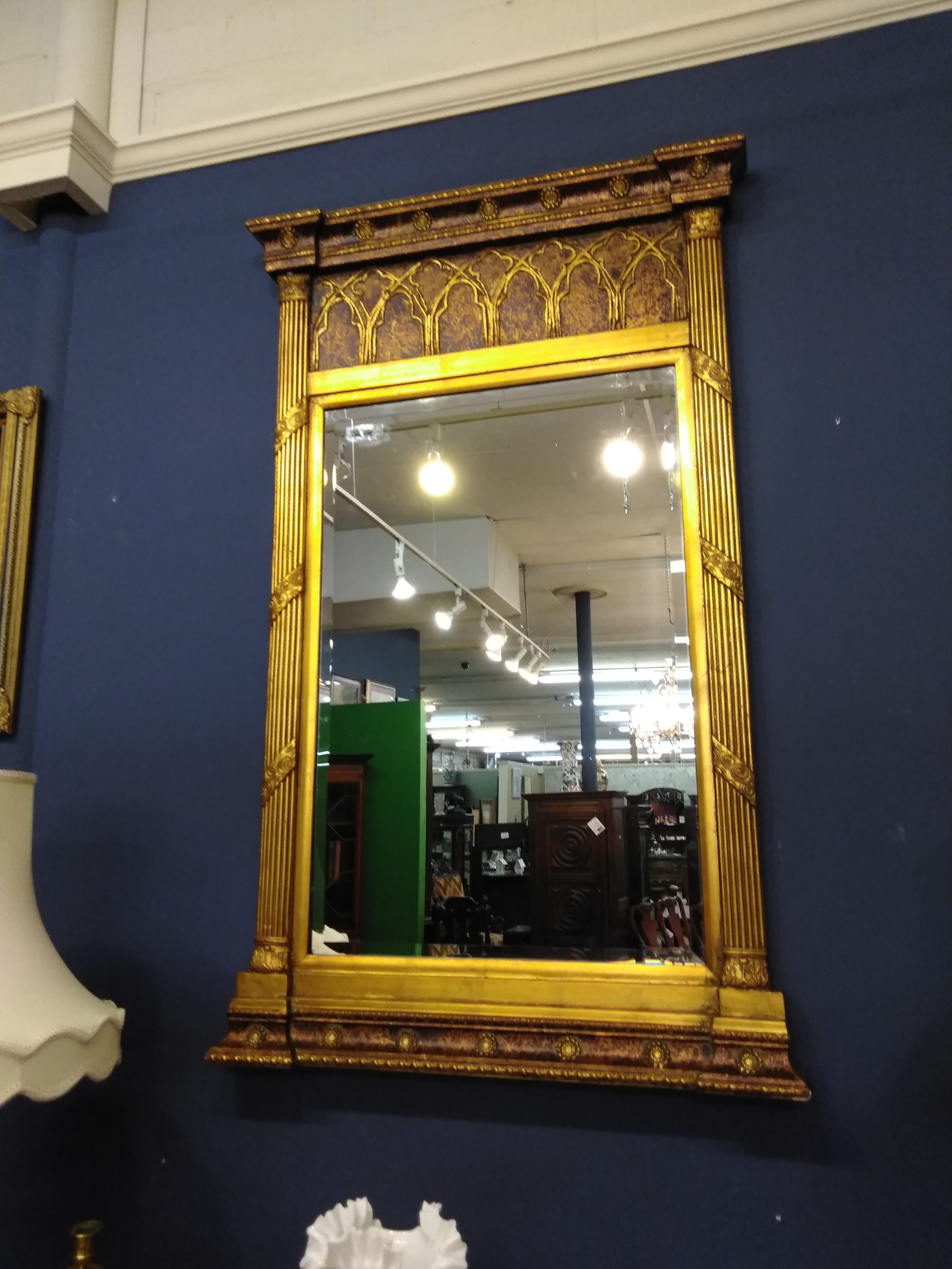 Large elegant gilded French Empire beveled mirror with unusual gothic inserts.