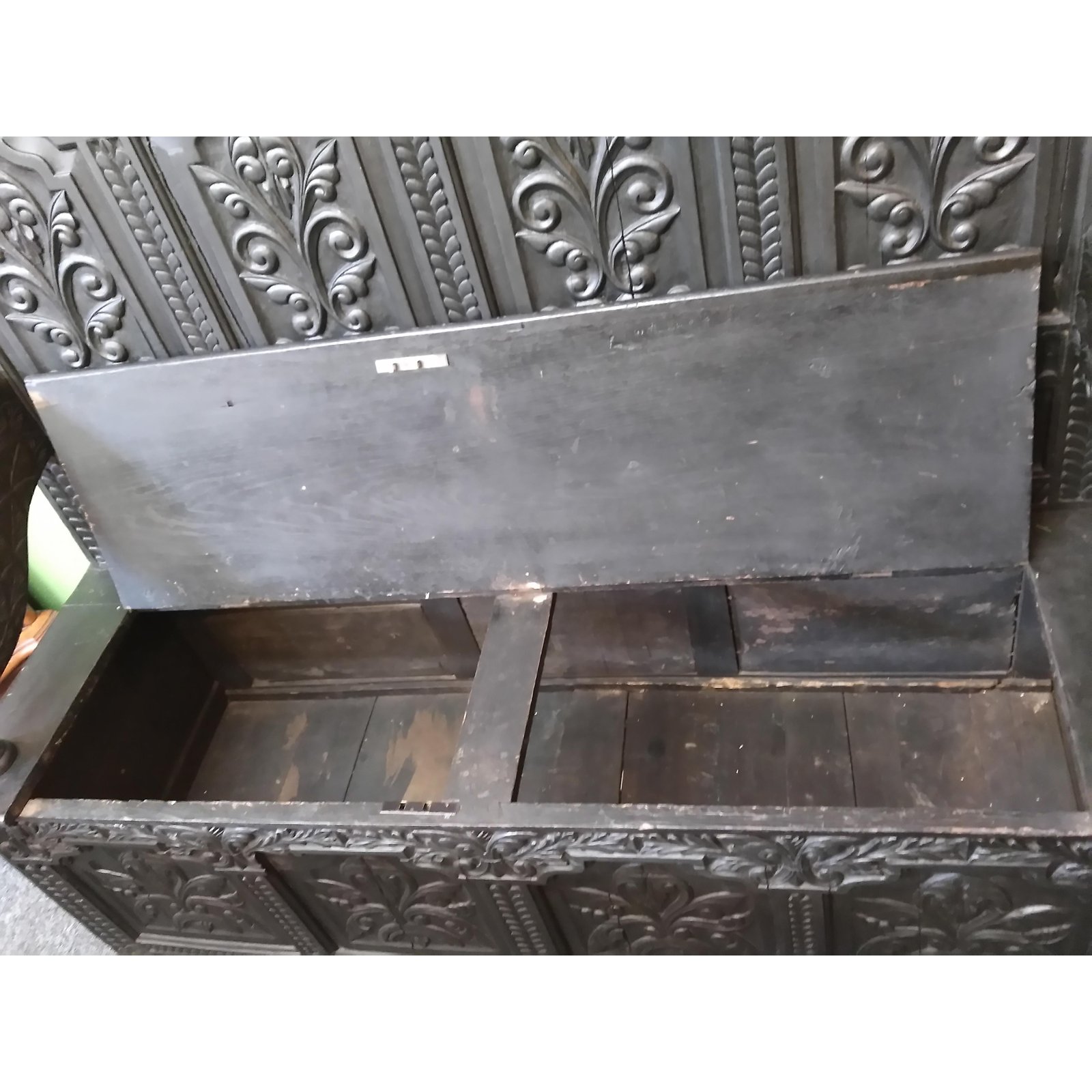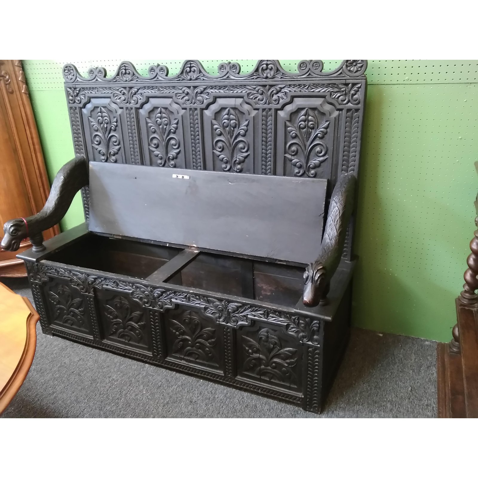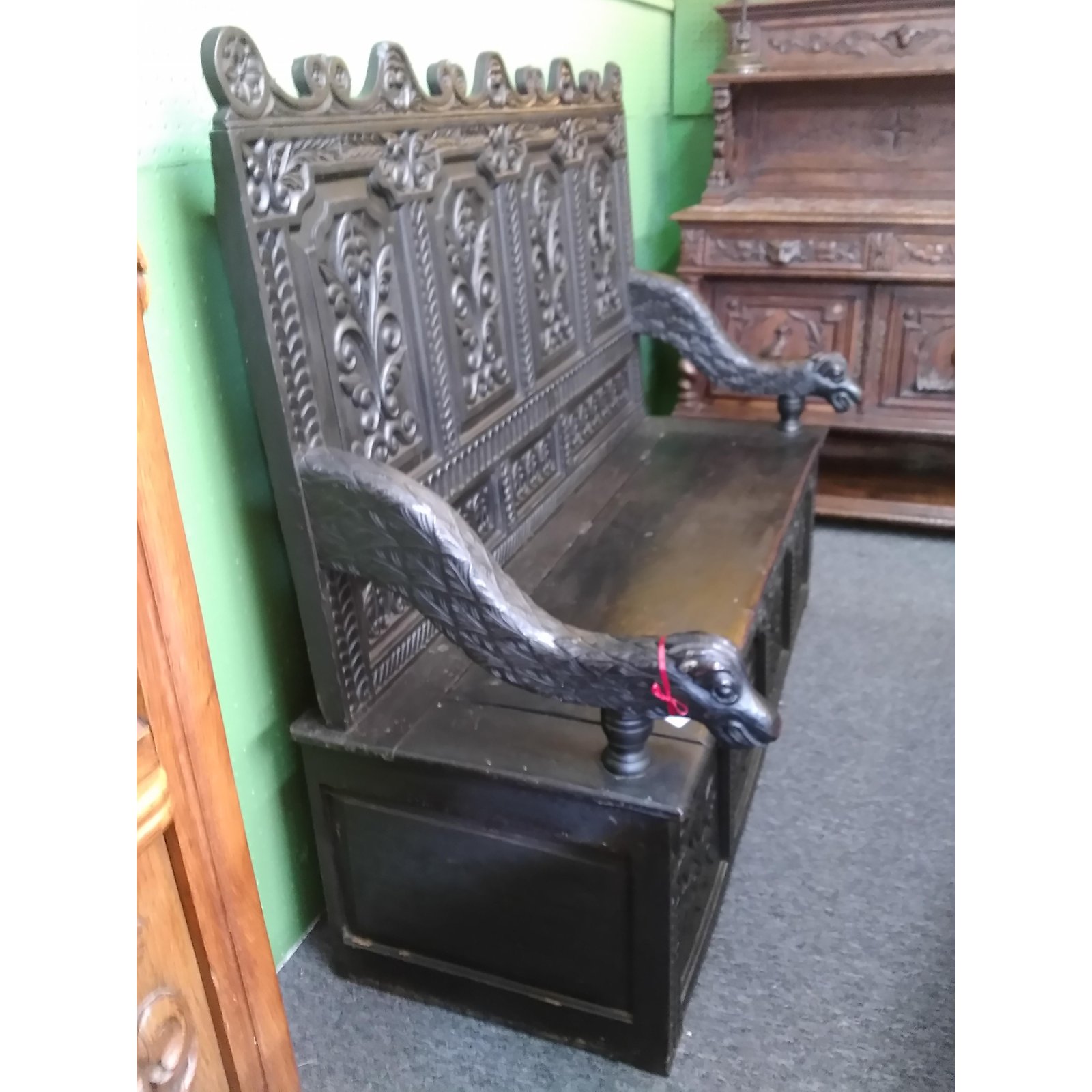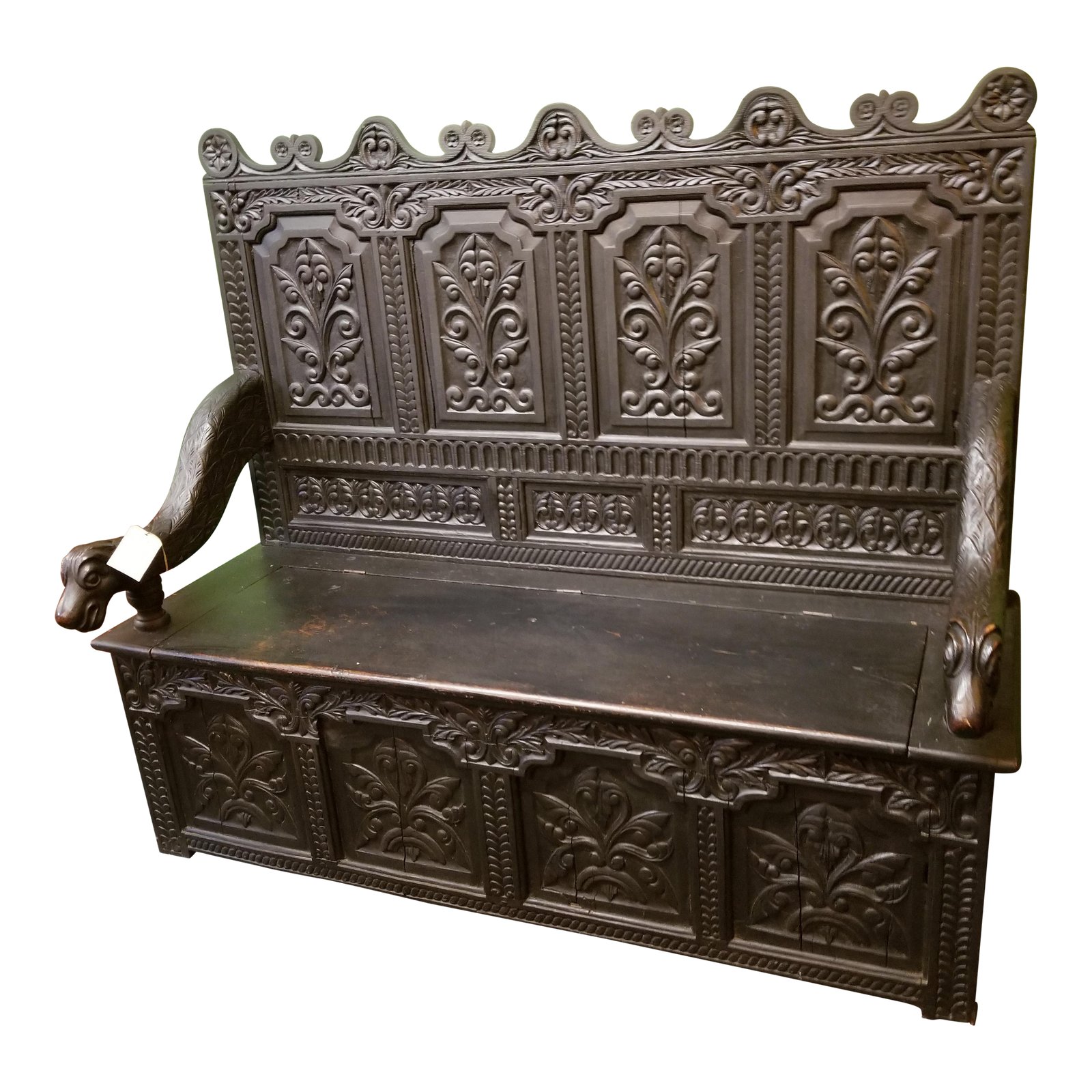 This lovely antique bench has wonderful carvings recessed crest designs and floral symbols on high-back down swept arms ending in carved dragon heads, lots of carving on settee which opens to reveal storage. This settee cane to us from France.