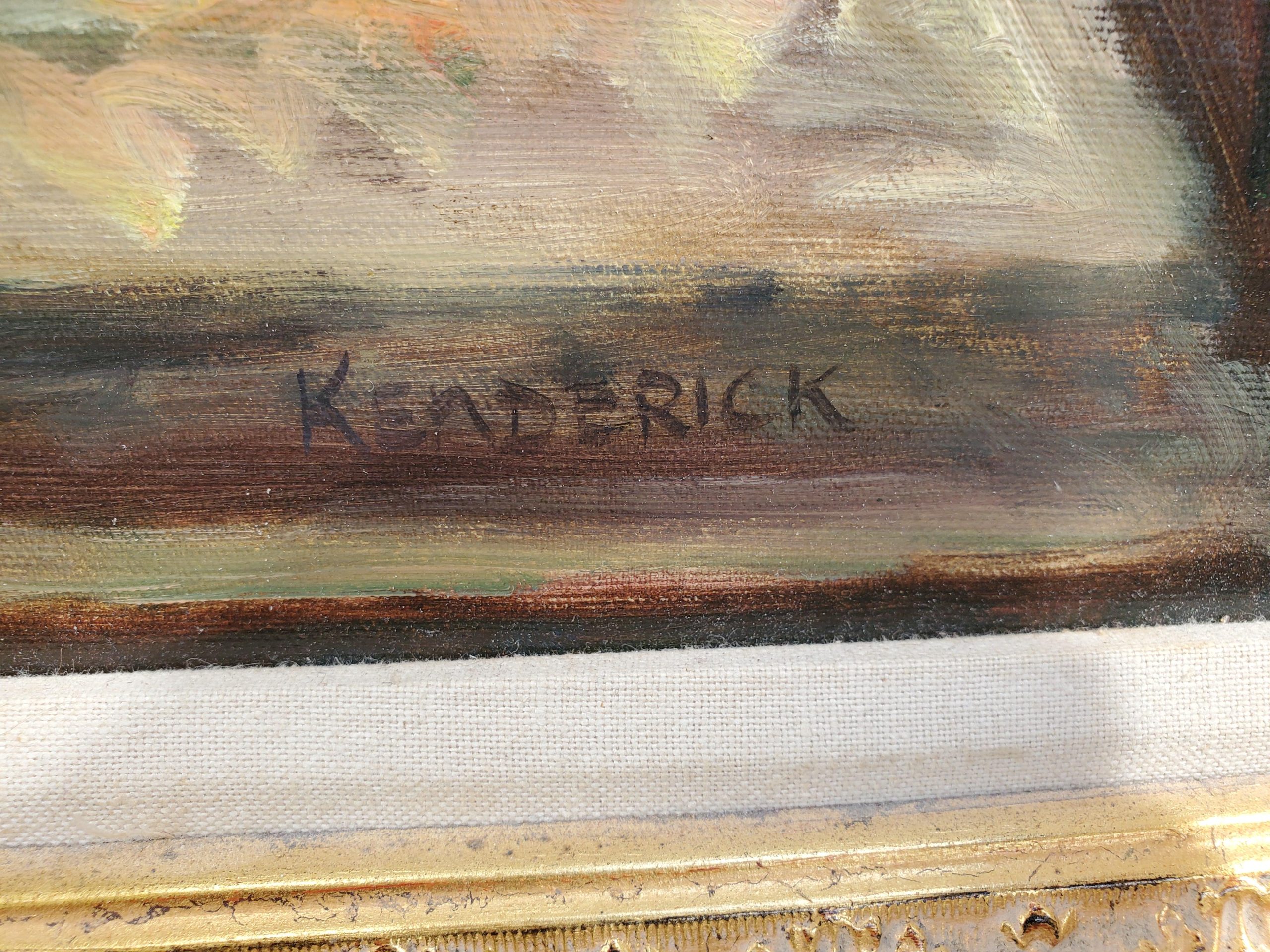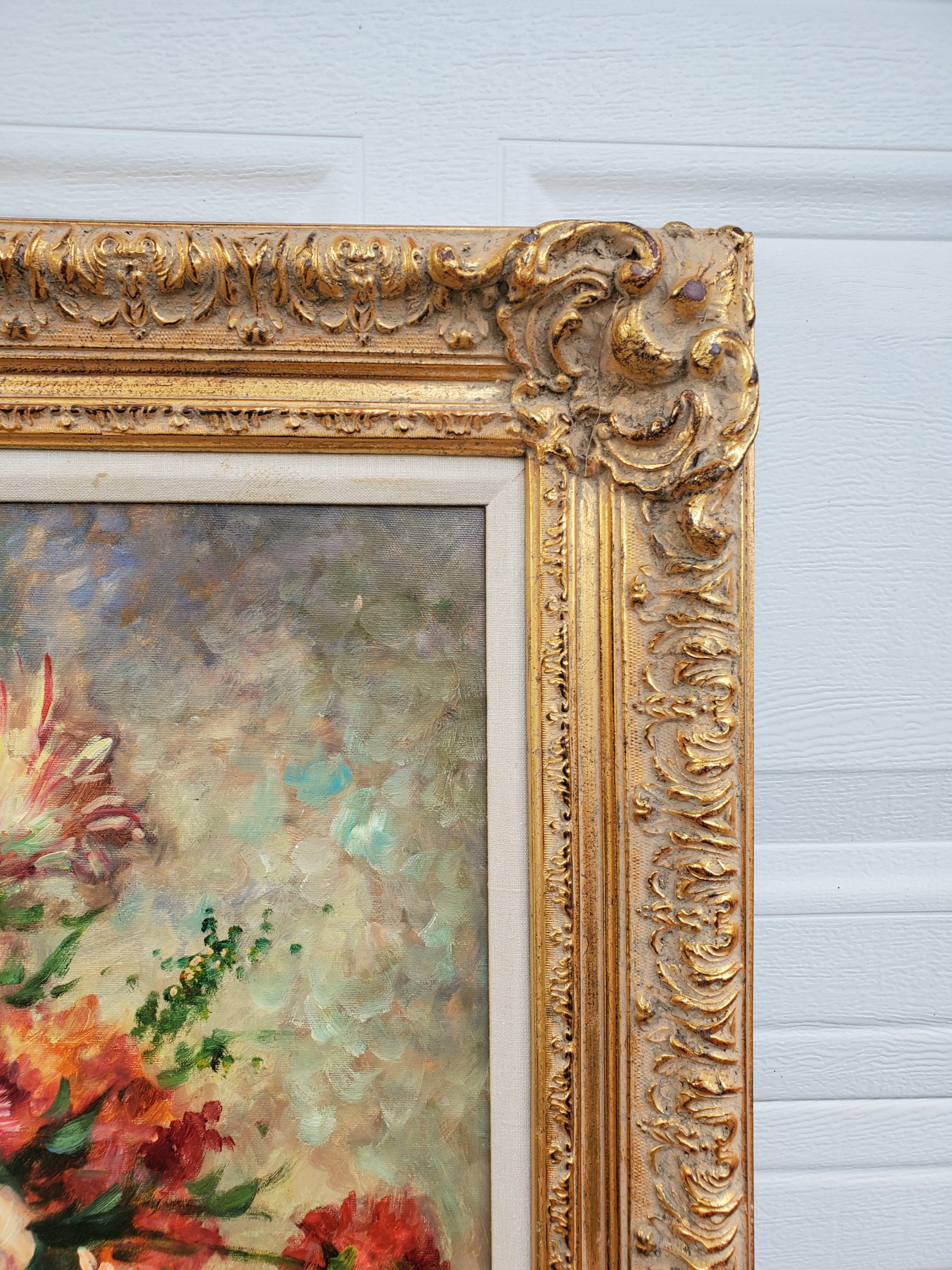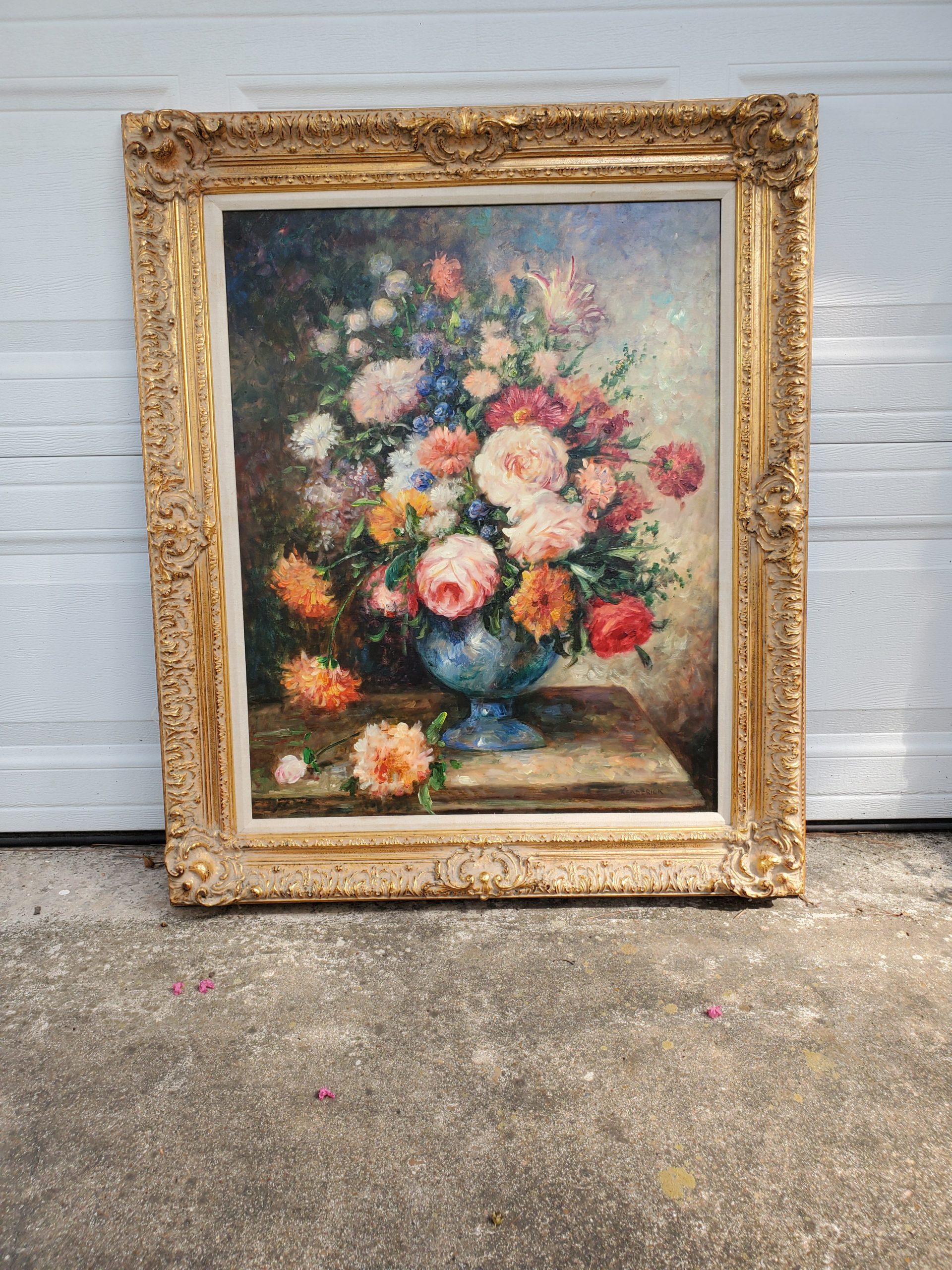Beautiful oil on canvas still life painting, features a colorful bouquet of flowers in an ornate gilt frame. Signed on the lower right by artist Kenderick.
