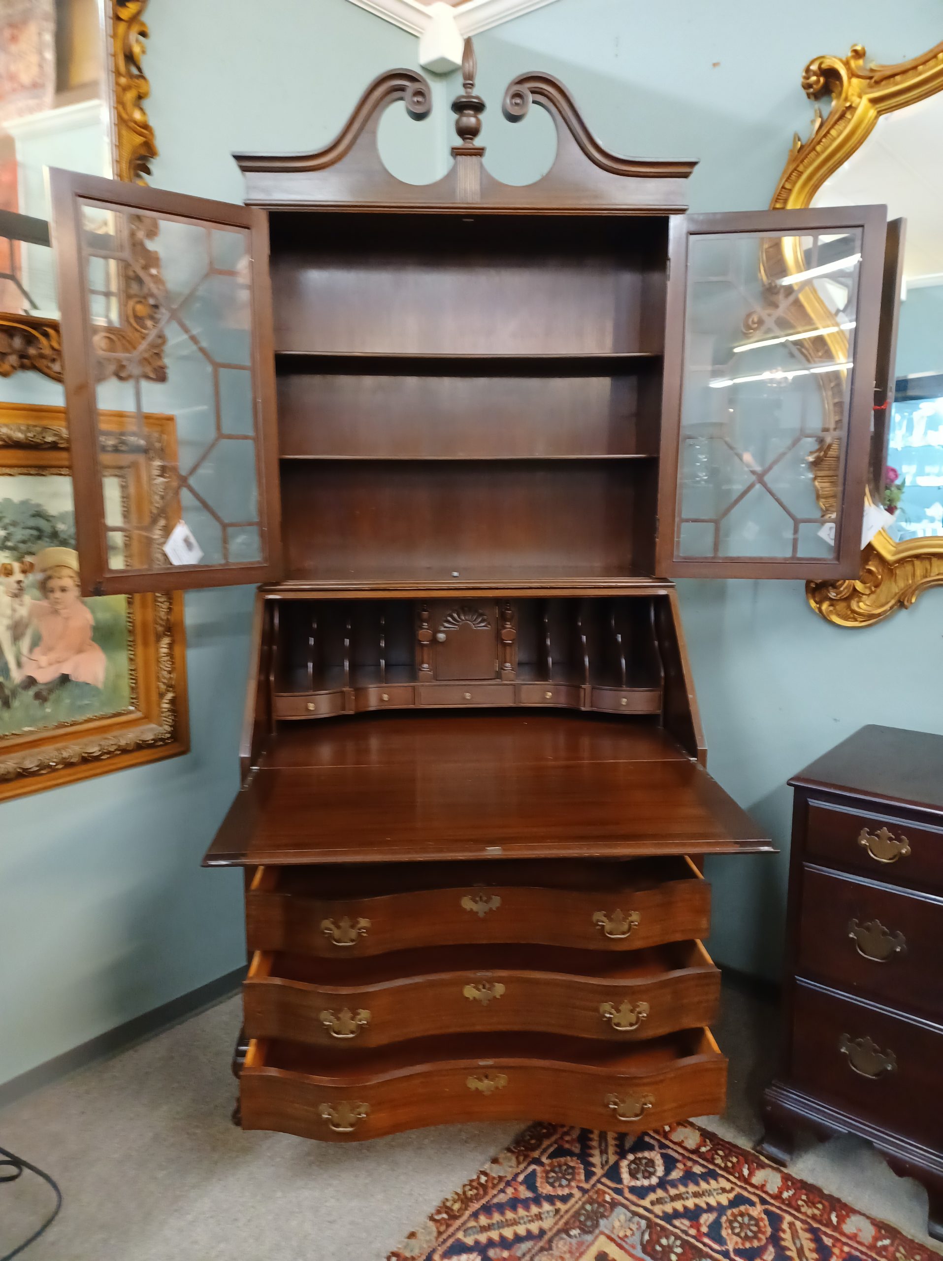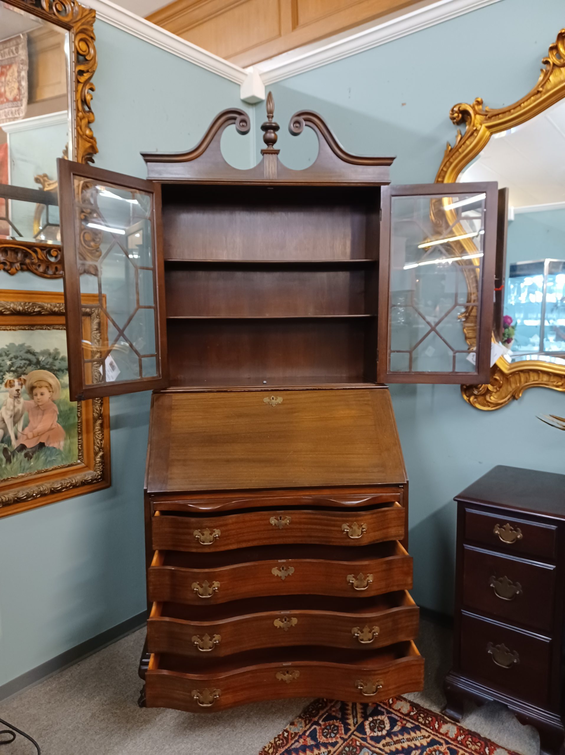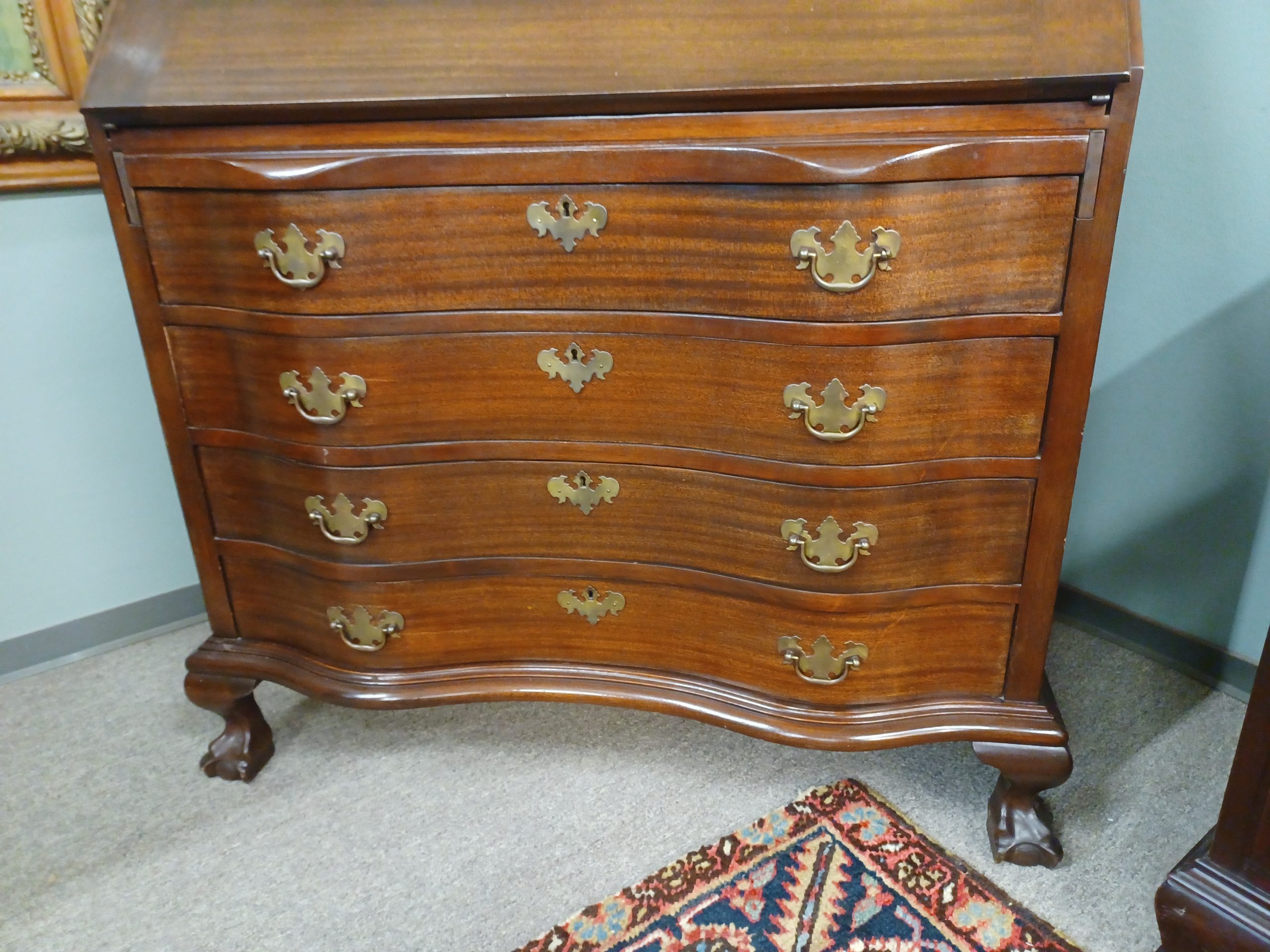 Antique mahogany secretary desk by Maddox Tables of Jamestown NY. Featuring two glass doors with fretwork and two interior shelves, drop down opens to reveal five drawers, eight cubbies, a small door with a secret compartment on each side, under four dovetail serpentine drawers with brass handles, ending in ball and claw feet, from the early 20th century.