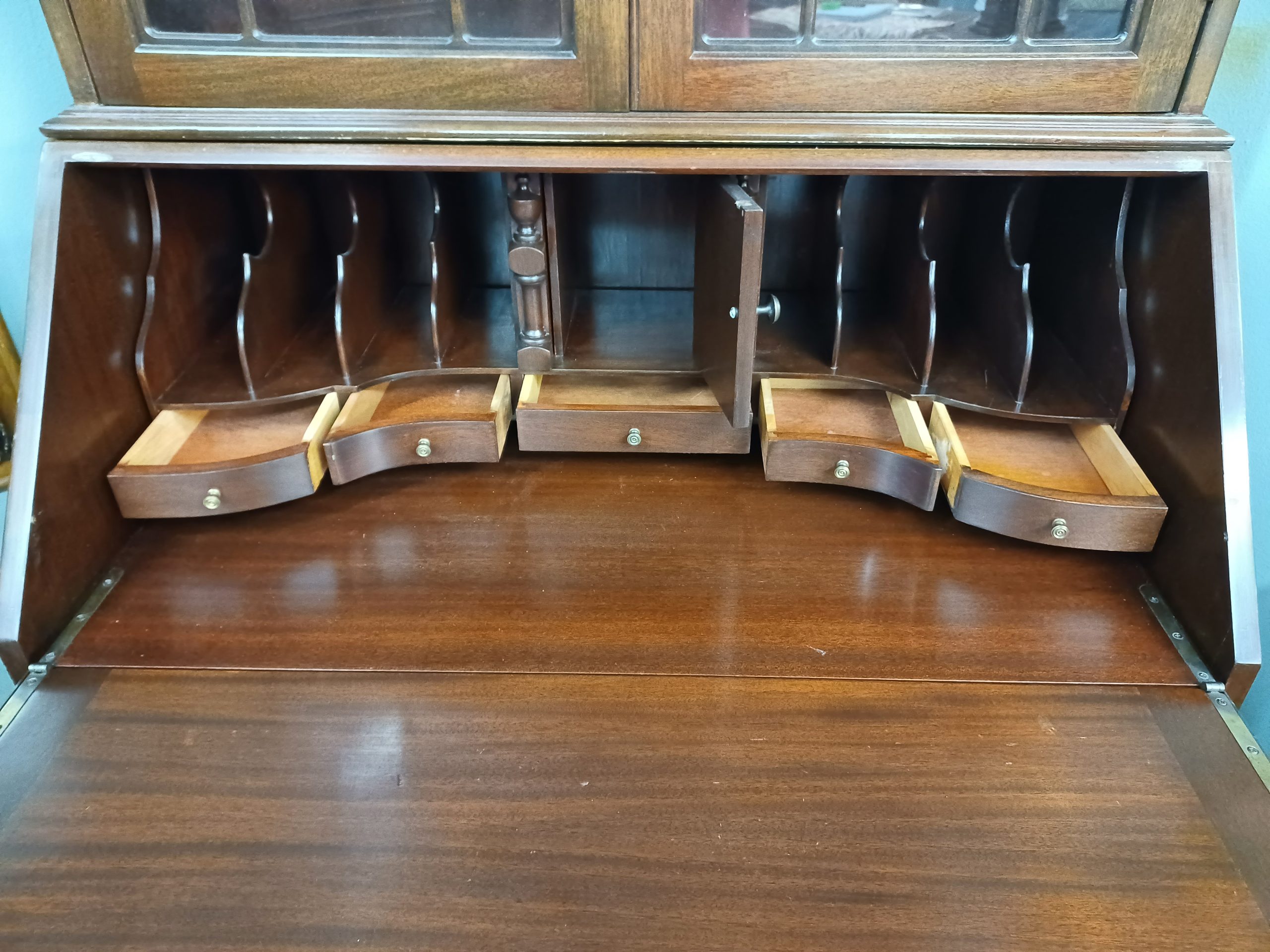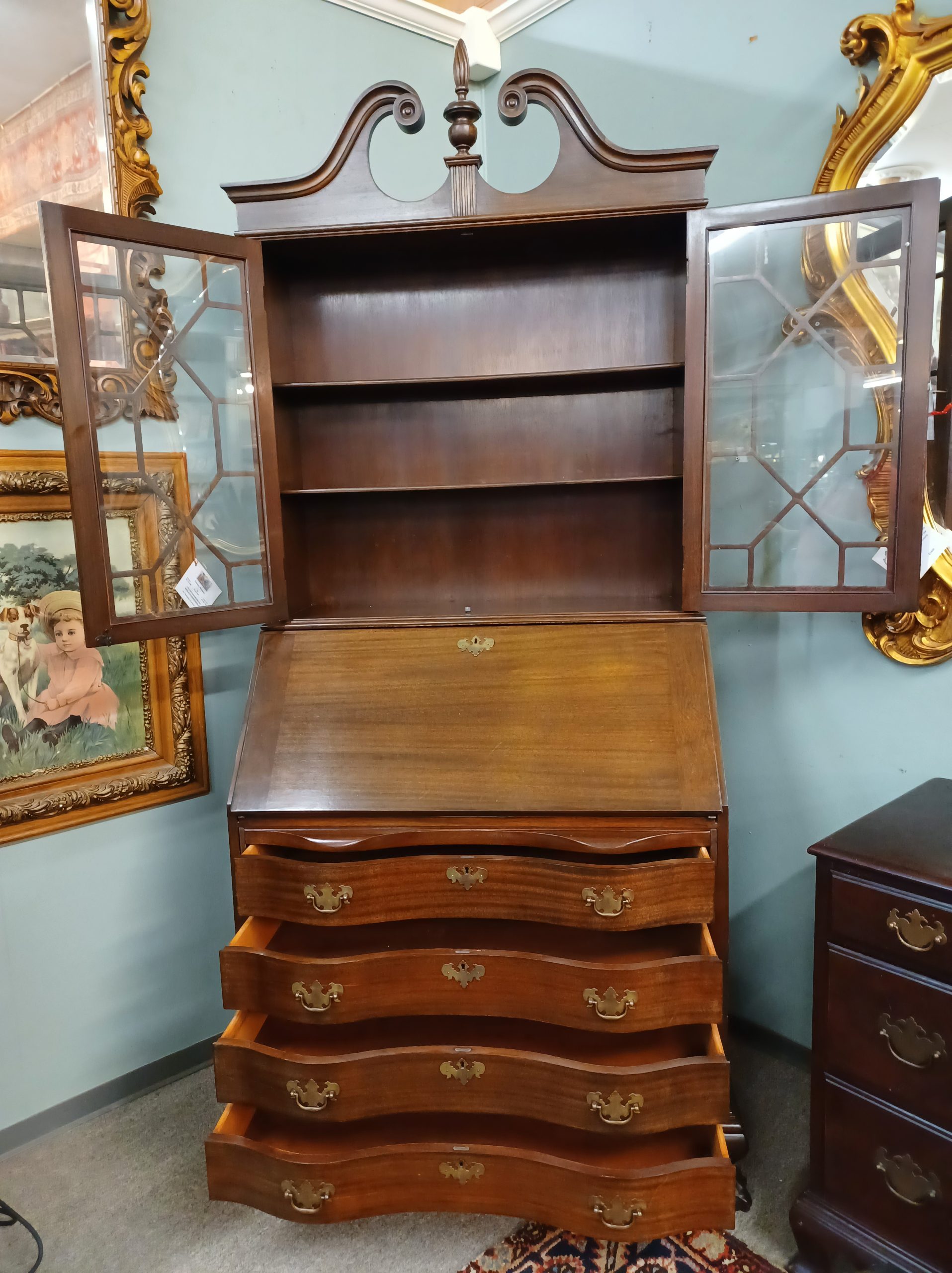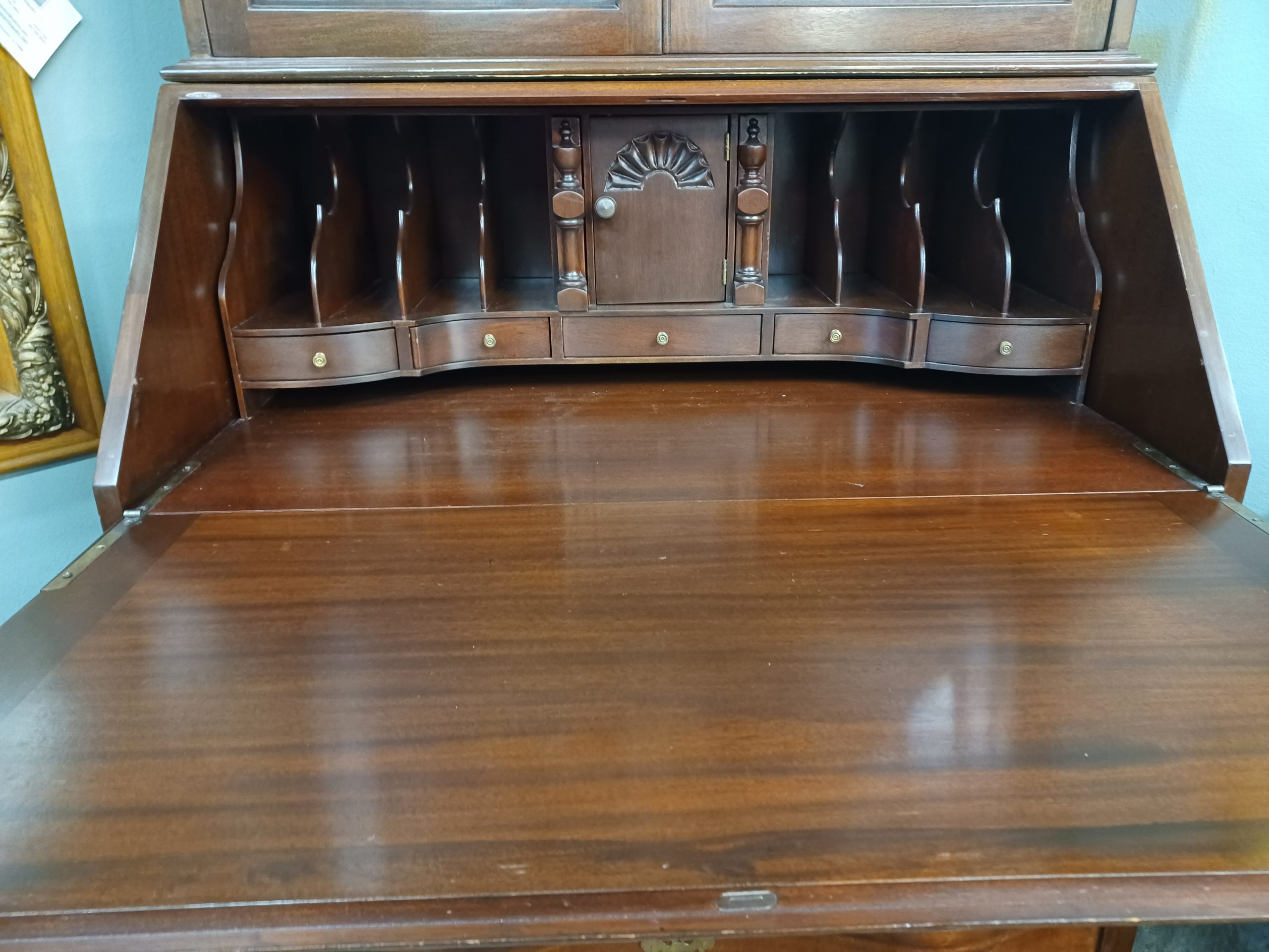 Antique mahogany secretary desk by Maddox Tables of Jamestown NY. Featuring two glass doors with fretwork and two interior shelves, drop down opens to reveal five drawers, eight cubbies, a small door with a secret compartment on each side, under four dovetail serpentine drawers with brass handles, ending in ball and claw feet, from the early 20th century.