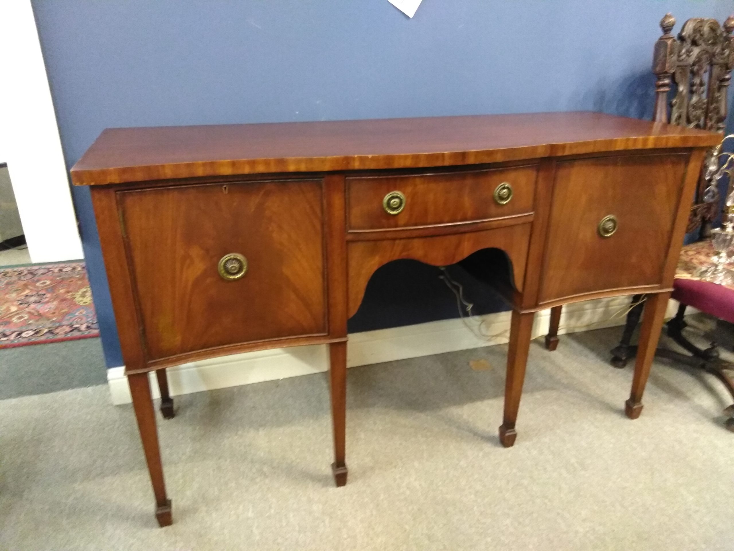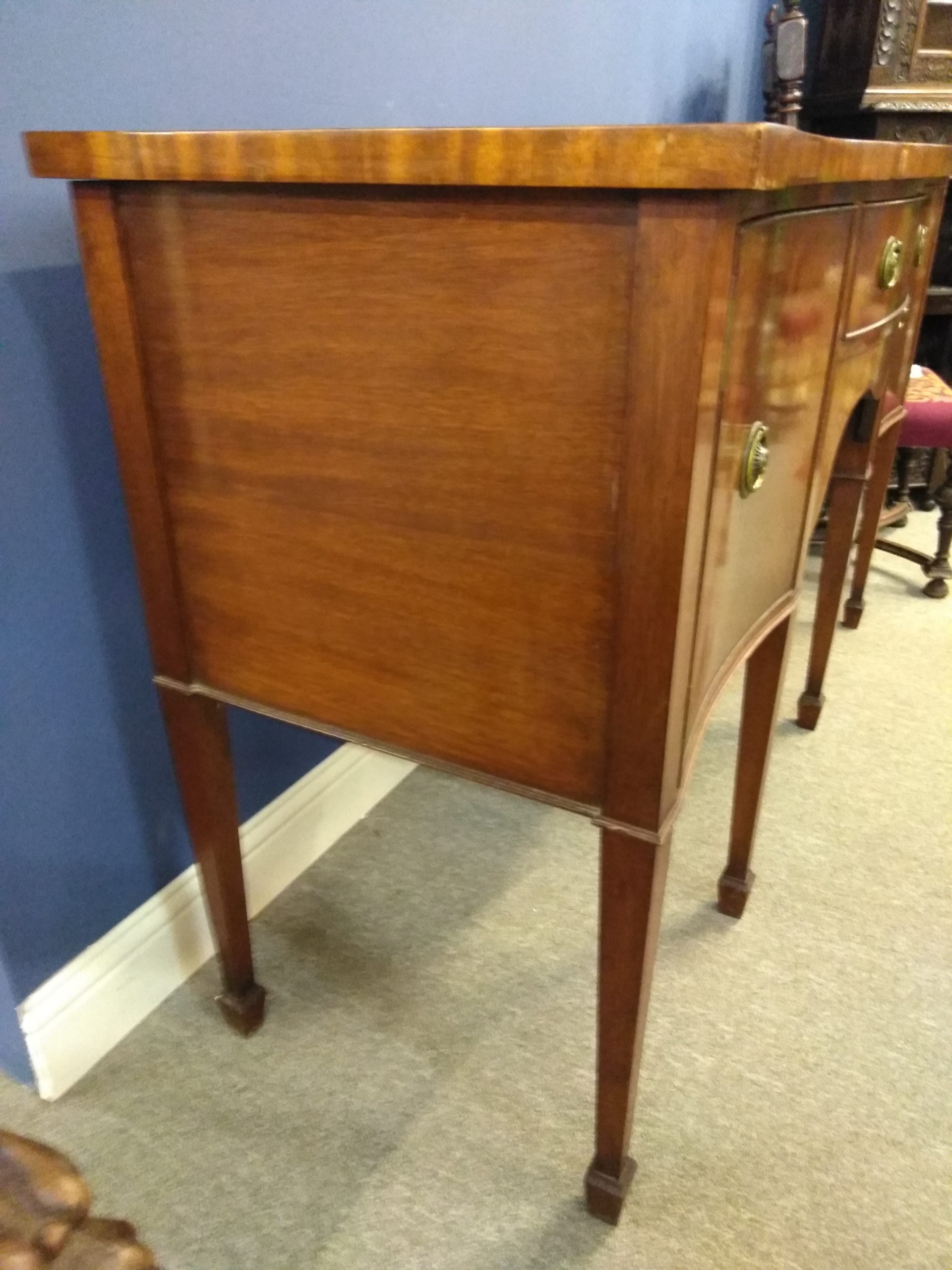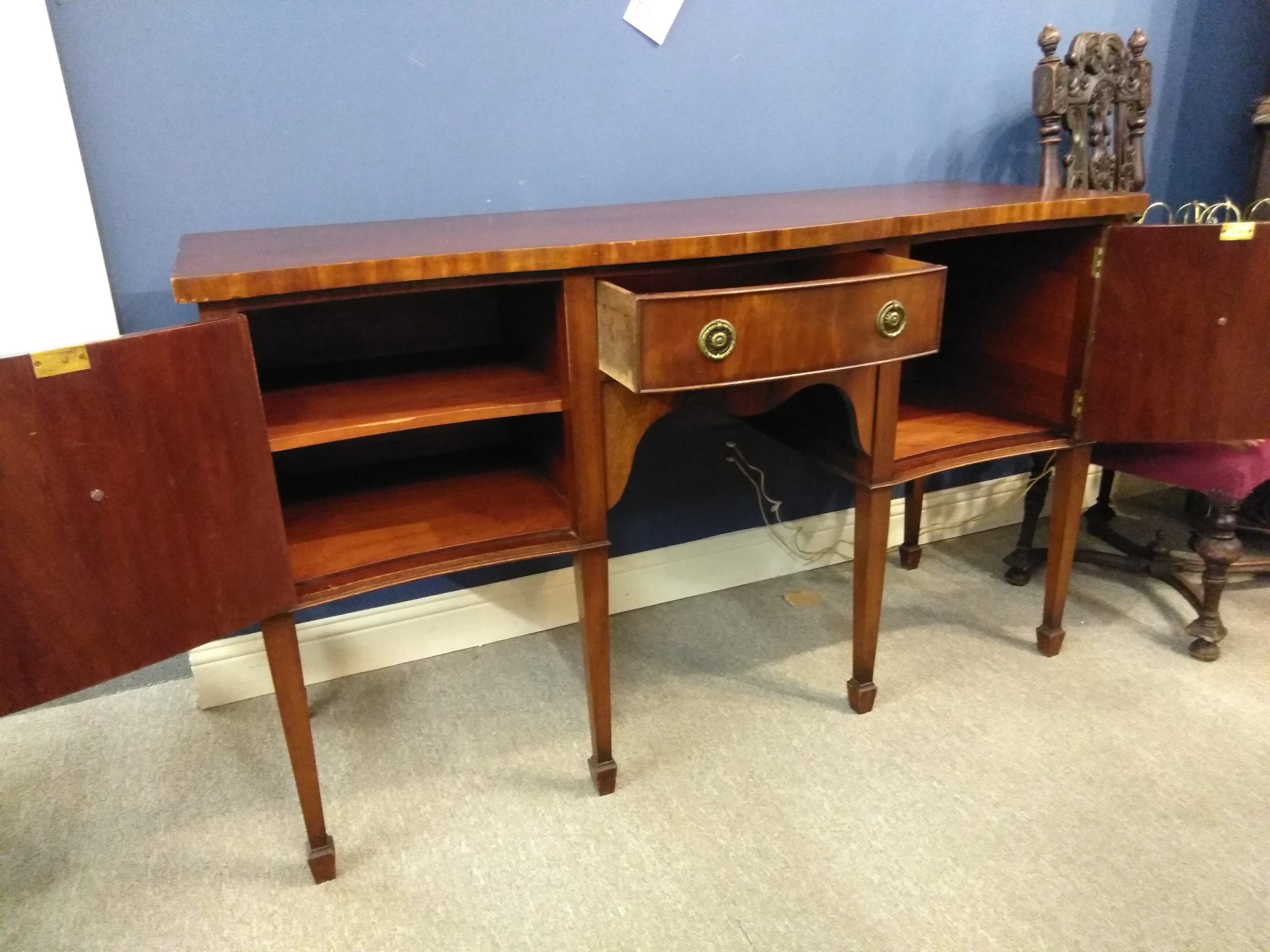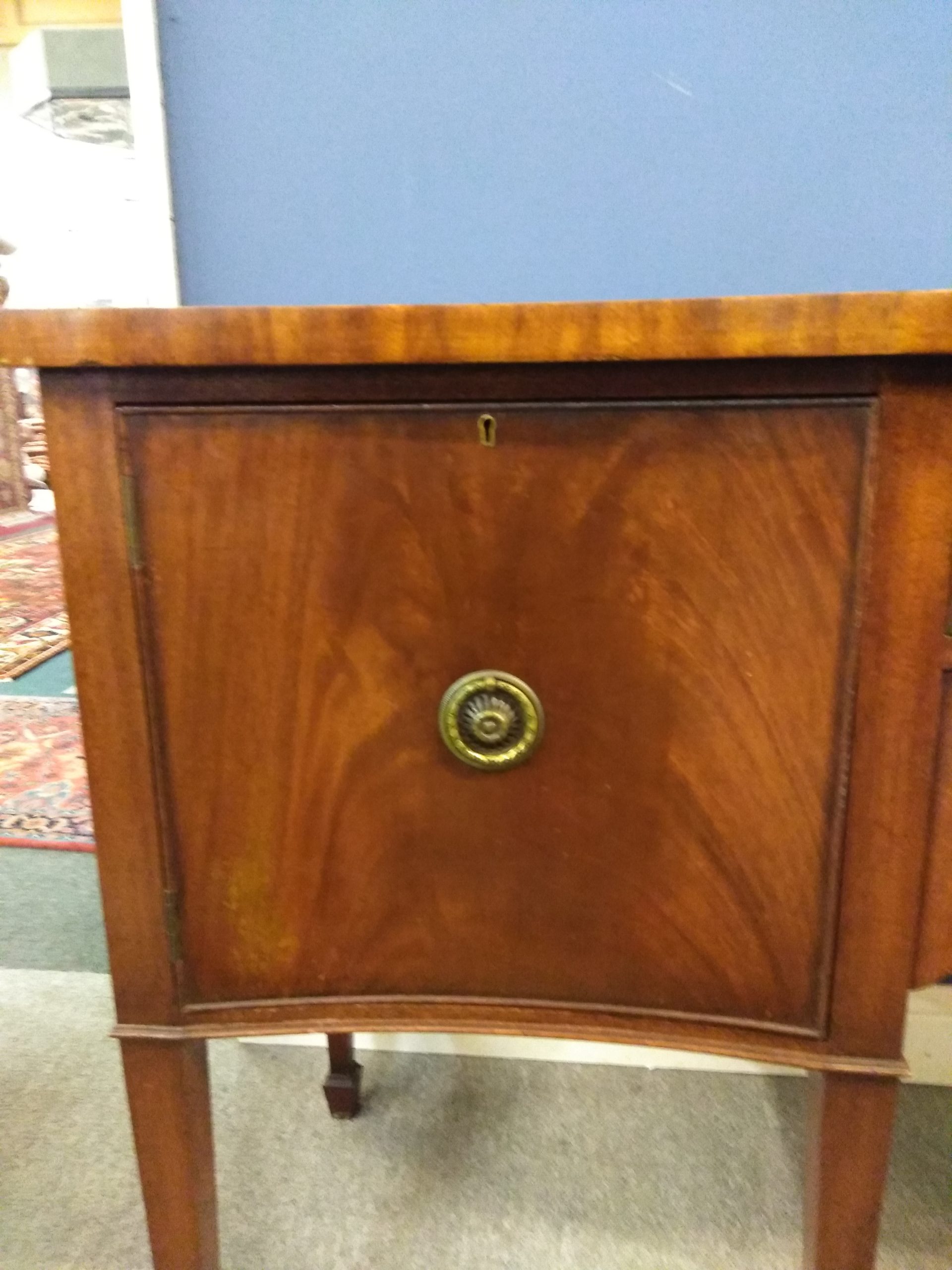 Mahogany George the III sideboard with a central drawer flanked by large concave doors on each side, ending on long tapered legs.