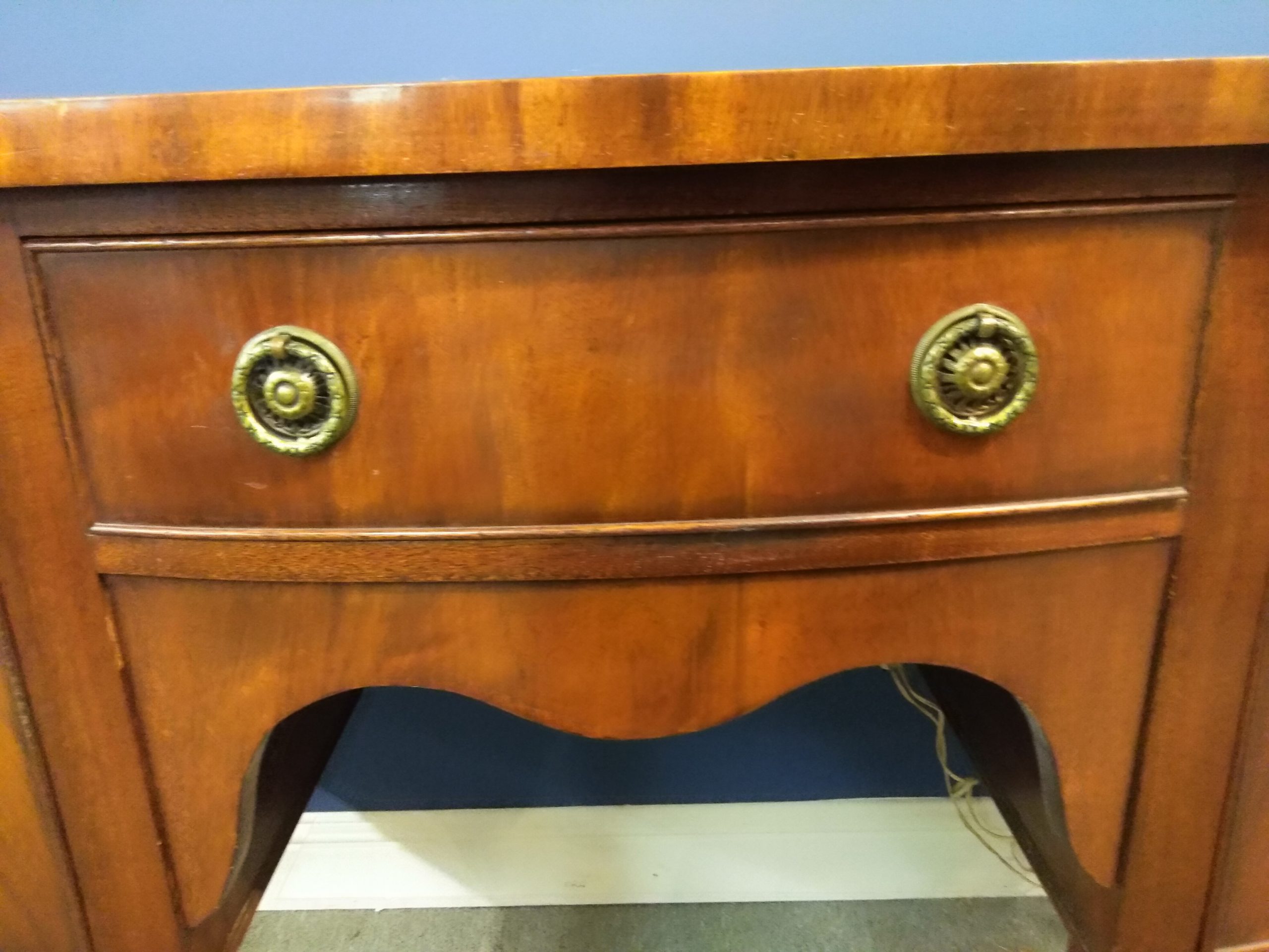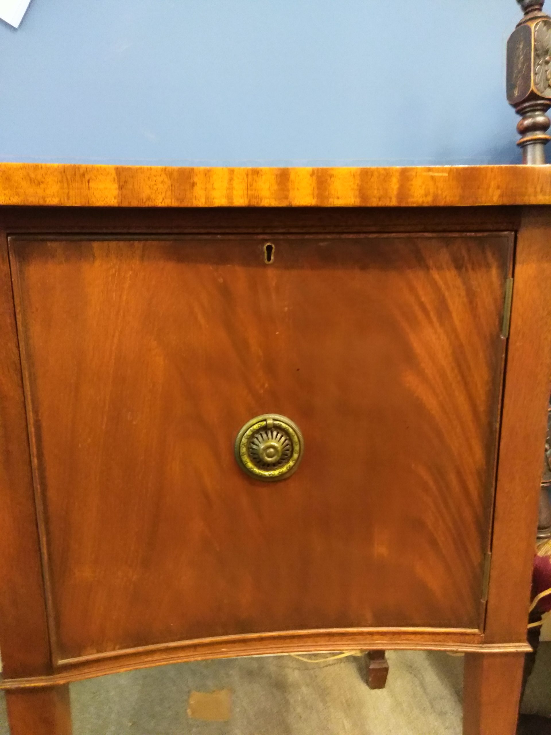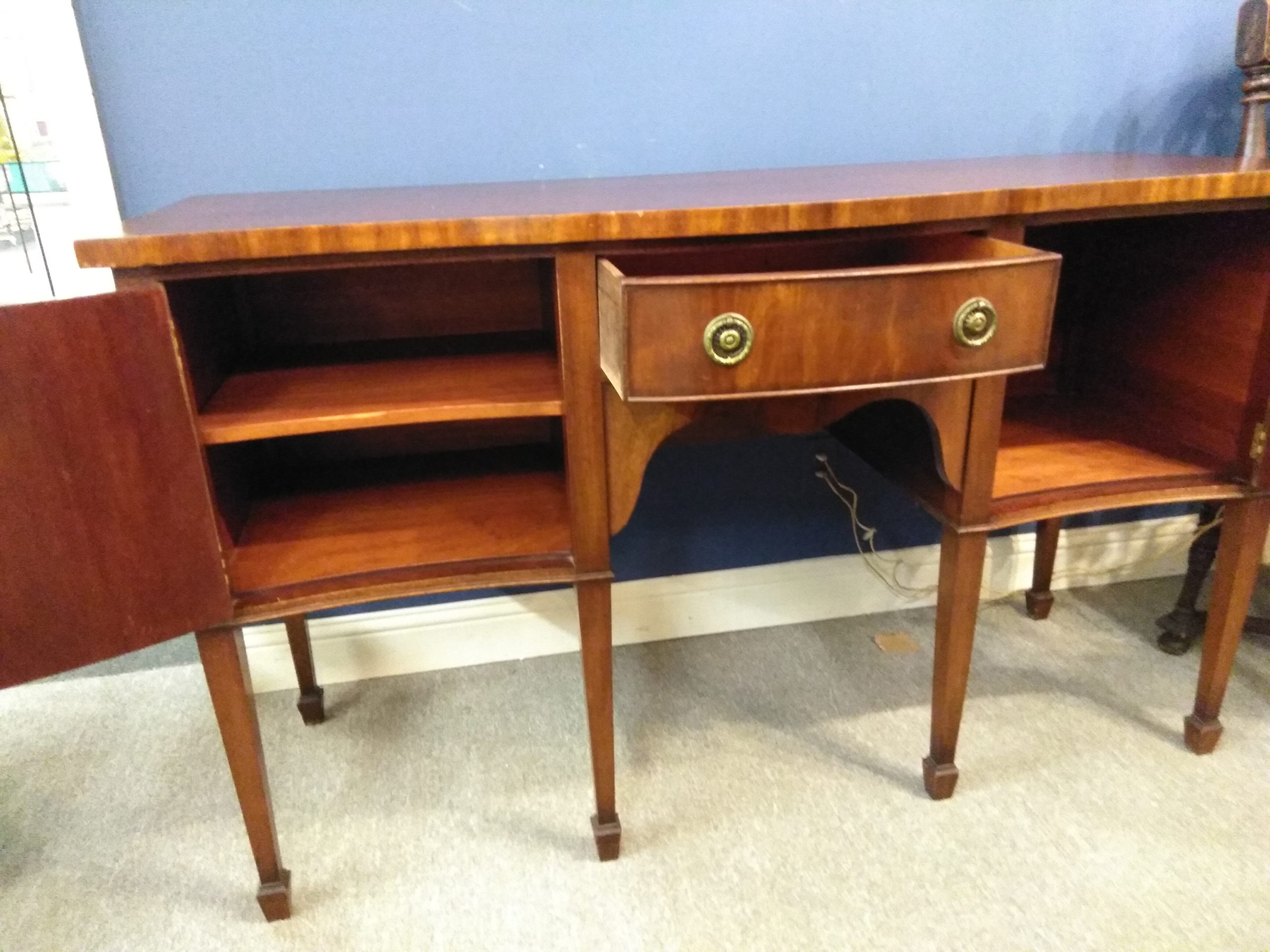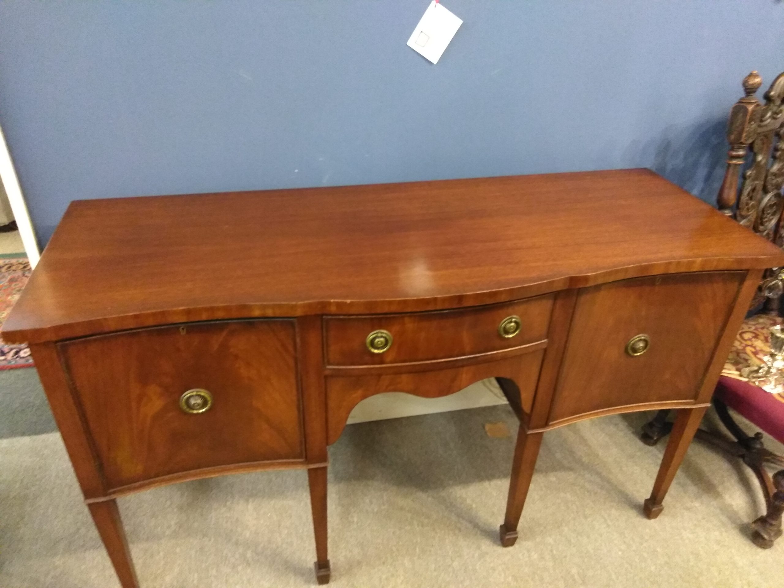 Mahogany George the III sideboard with a central drawer flanked by large concave doors on each side, ending on long tapered legs.
