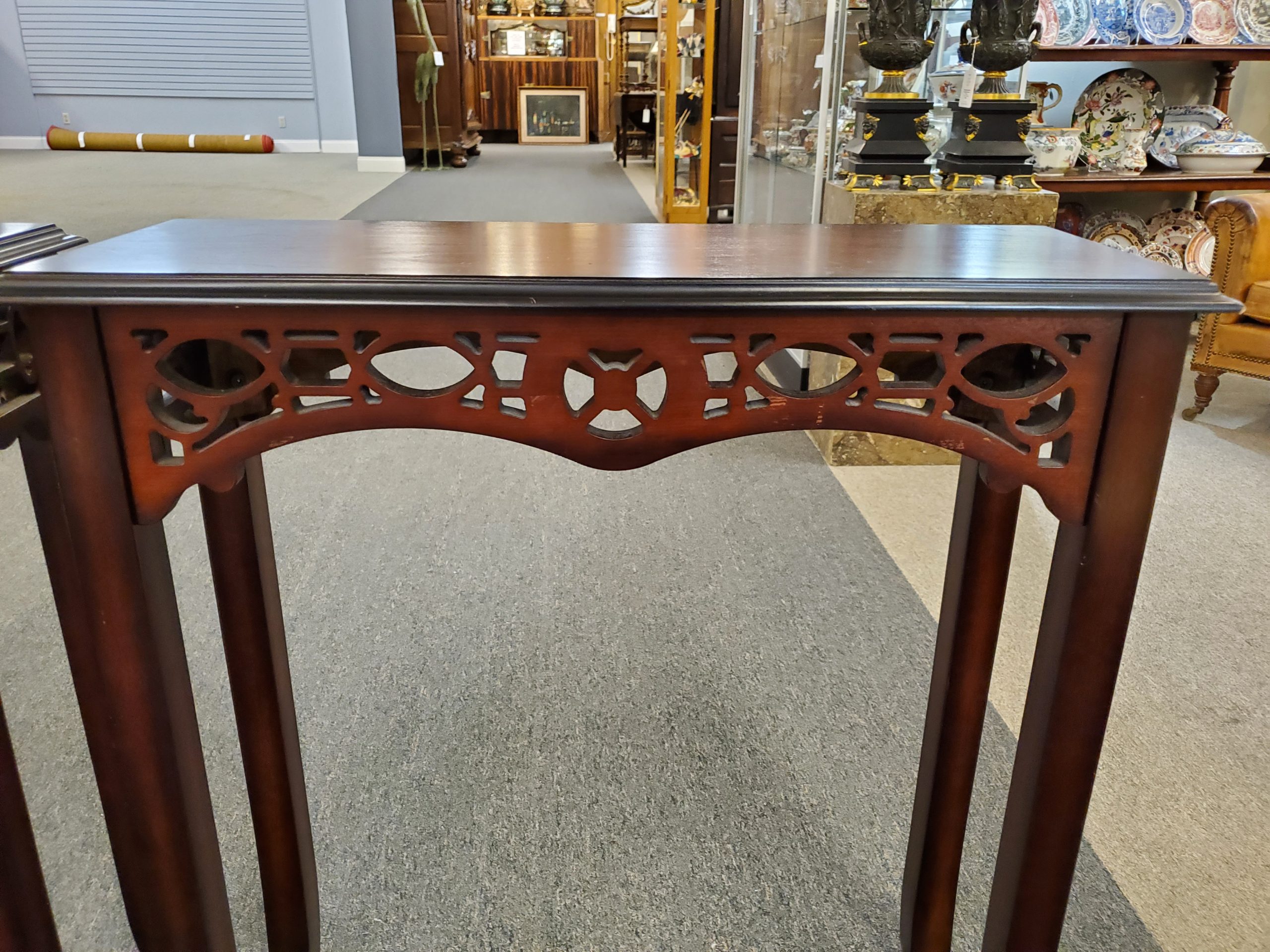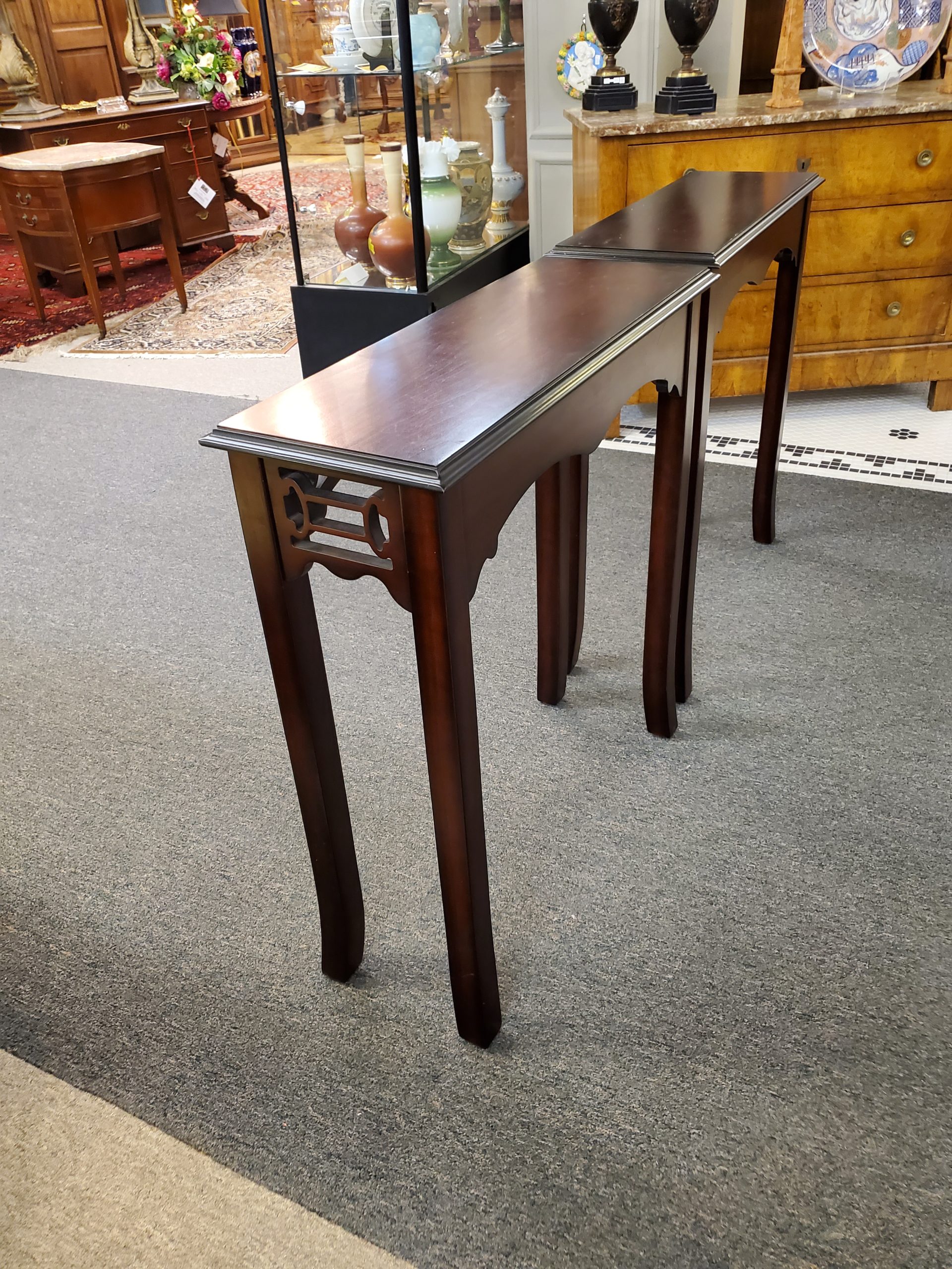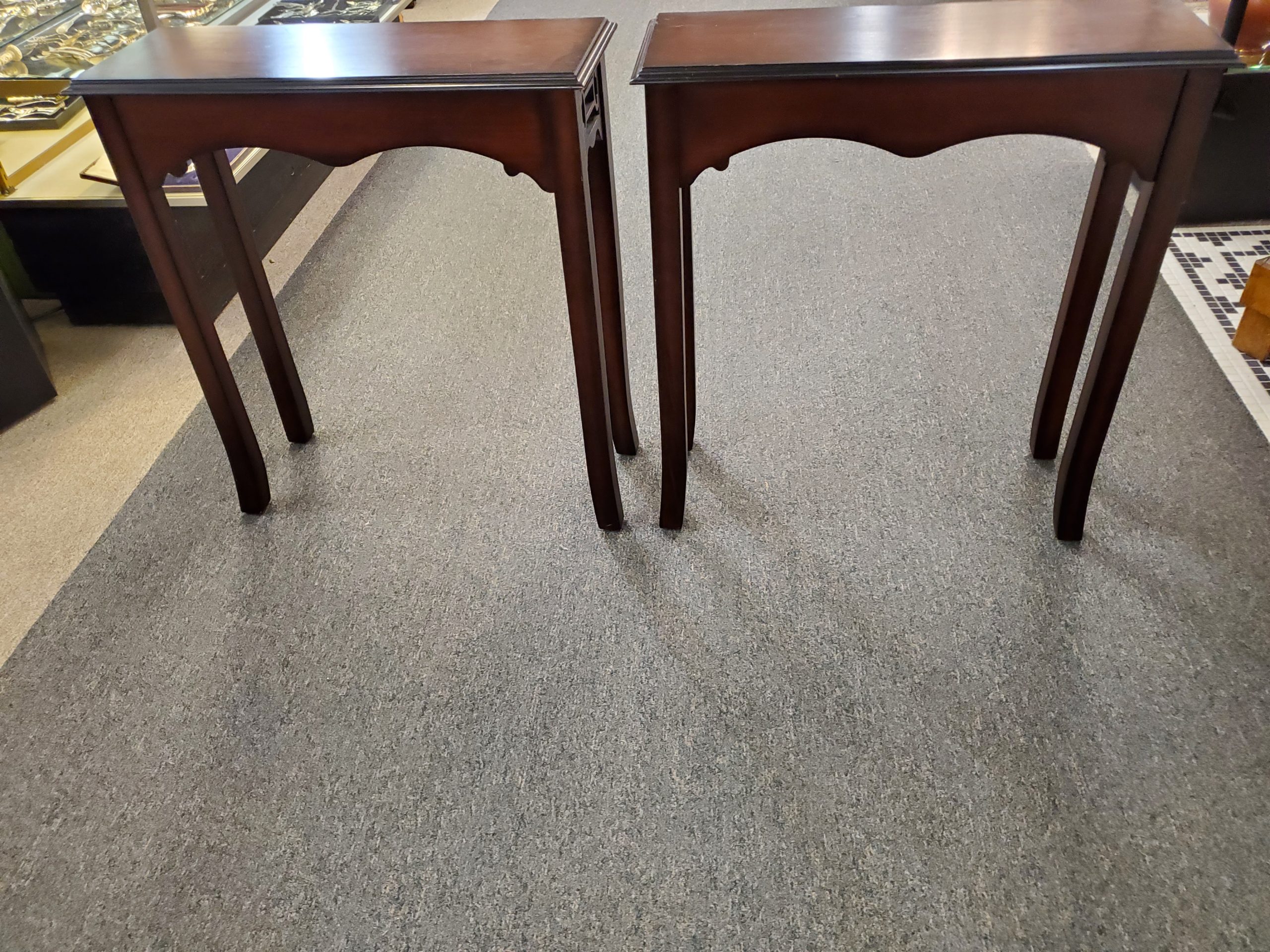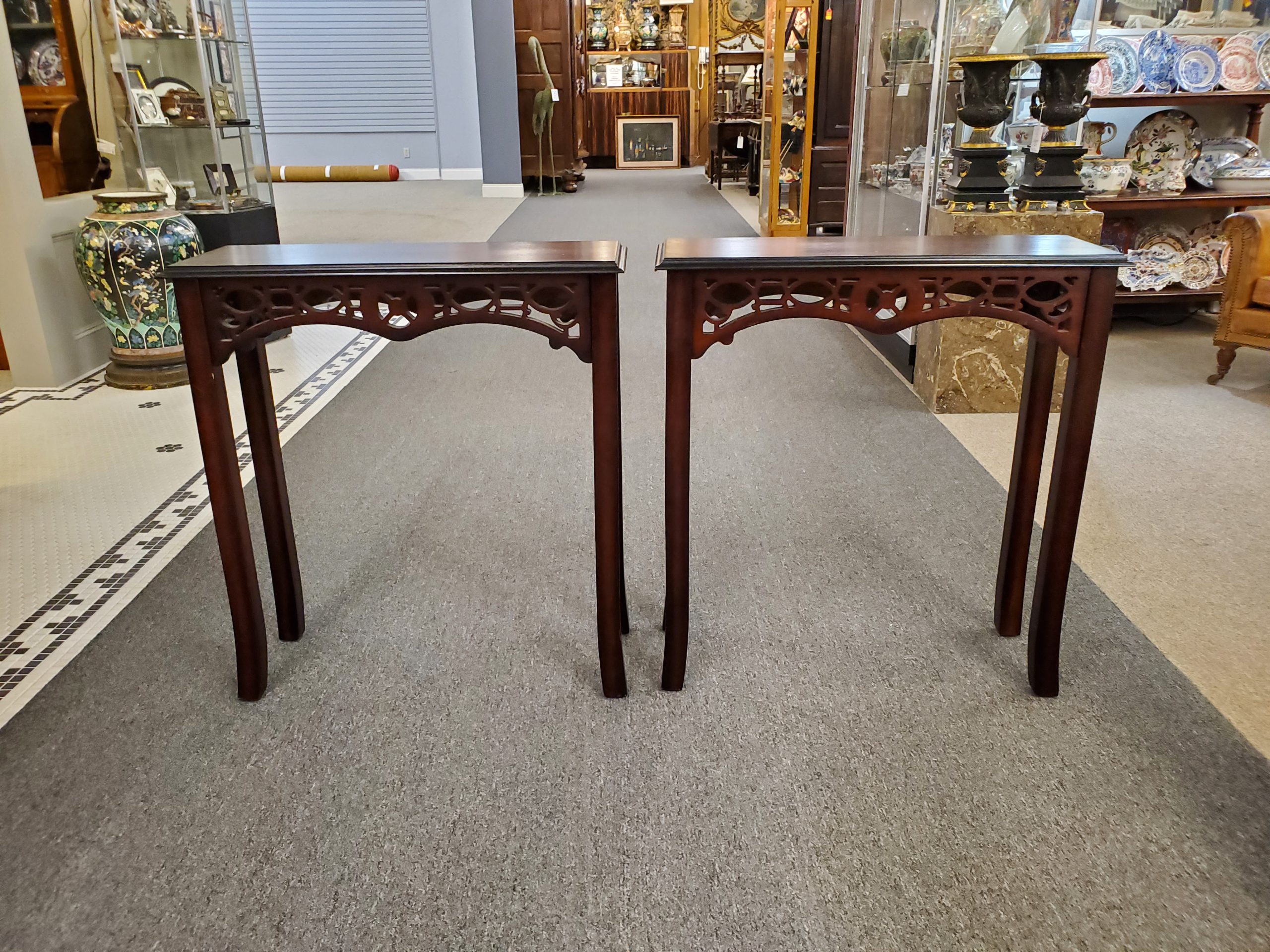 Beautiful pair of two mahogany side tables with pierced fronts and sides from the Bombay Company.