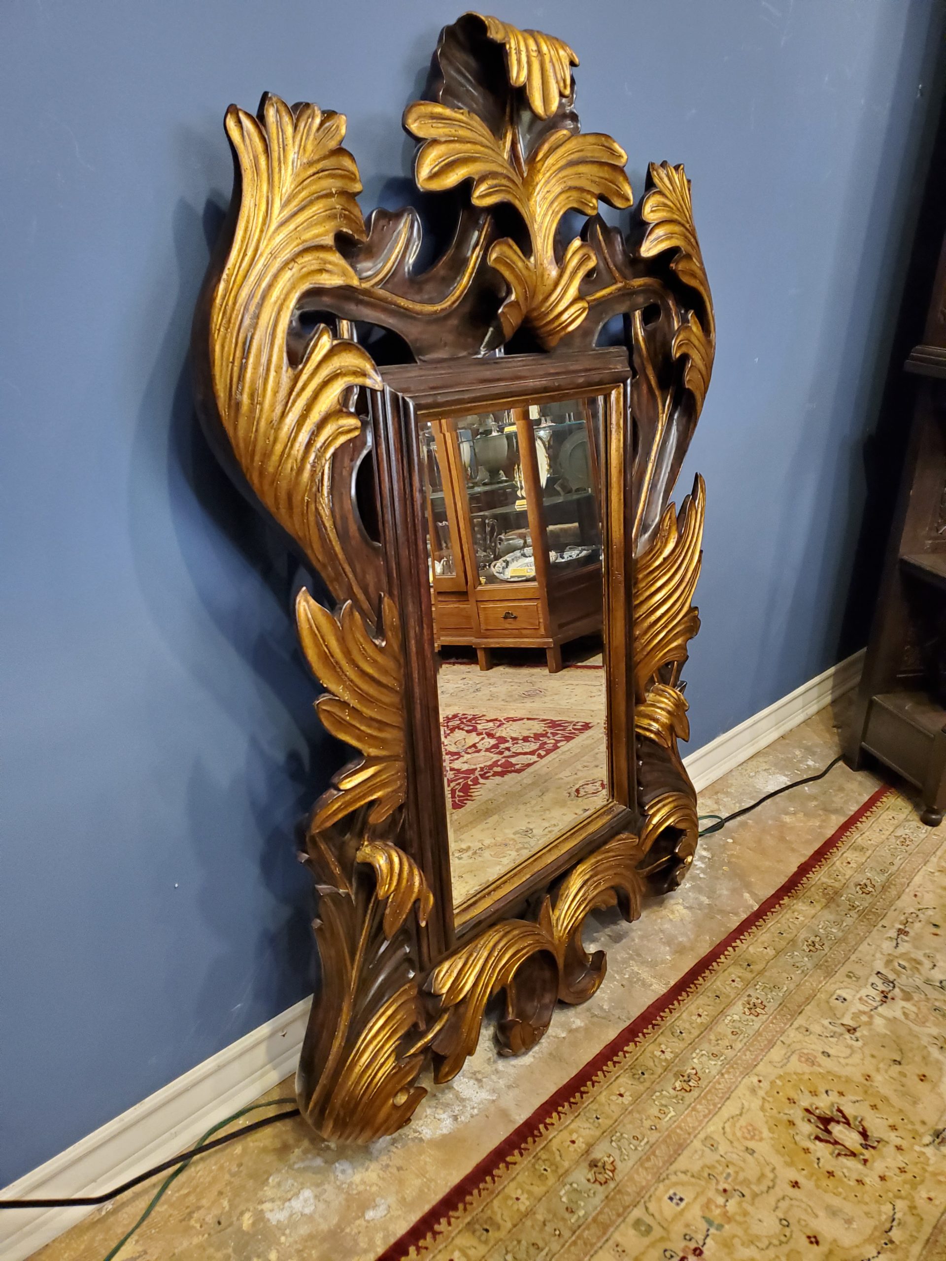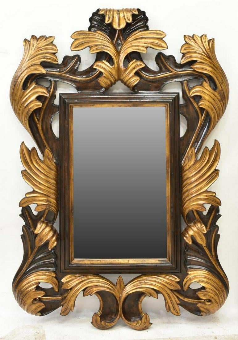 Late 20th century, in a dark Havana finish, with parcel gilt accents, the frame modeled as scrolling foliates, centering a beveled mirror plate.