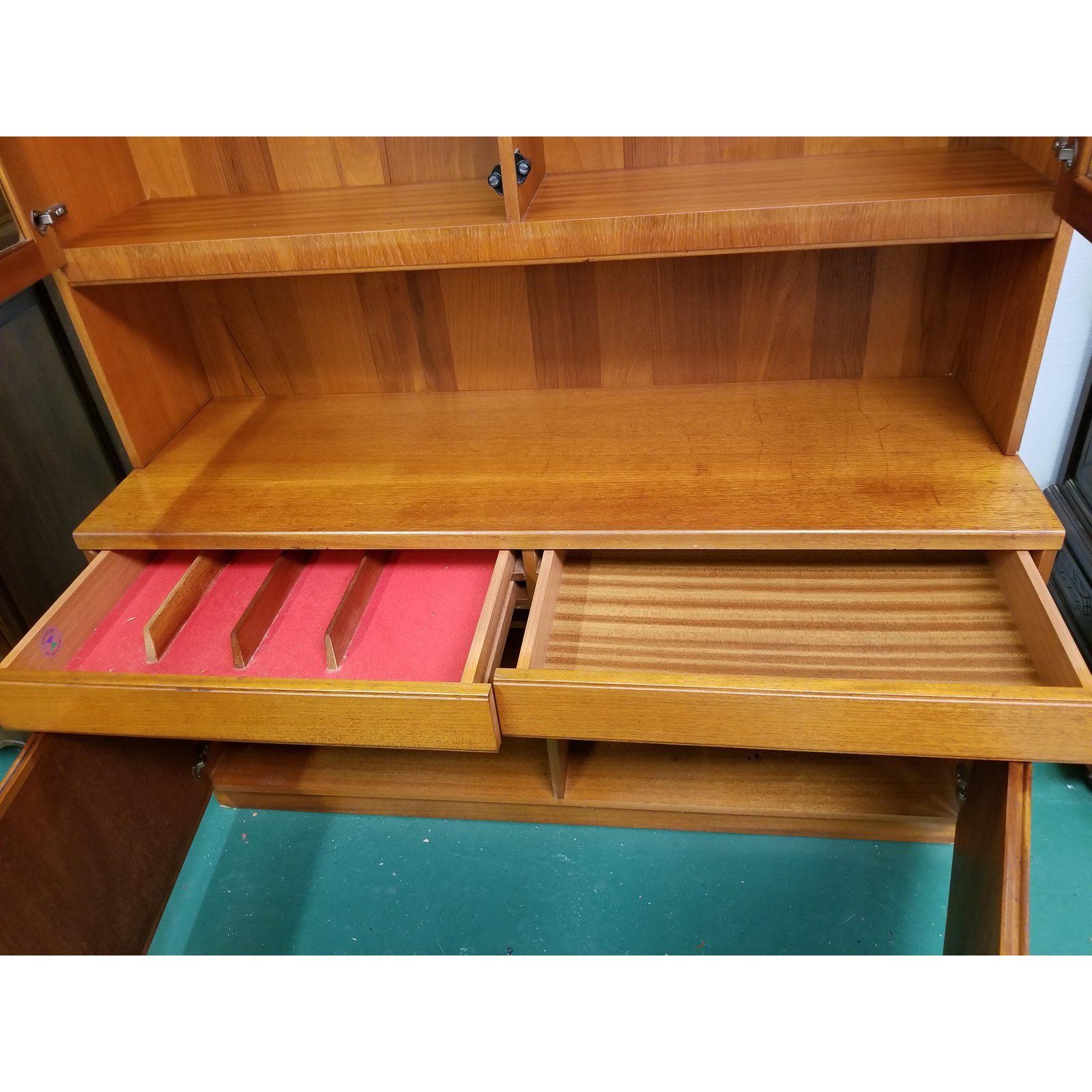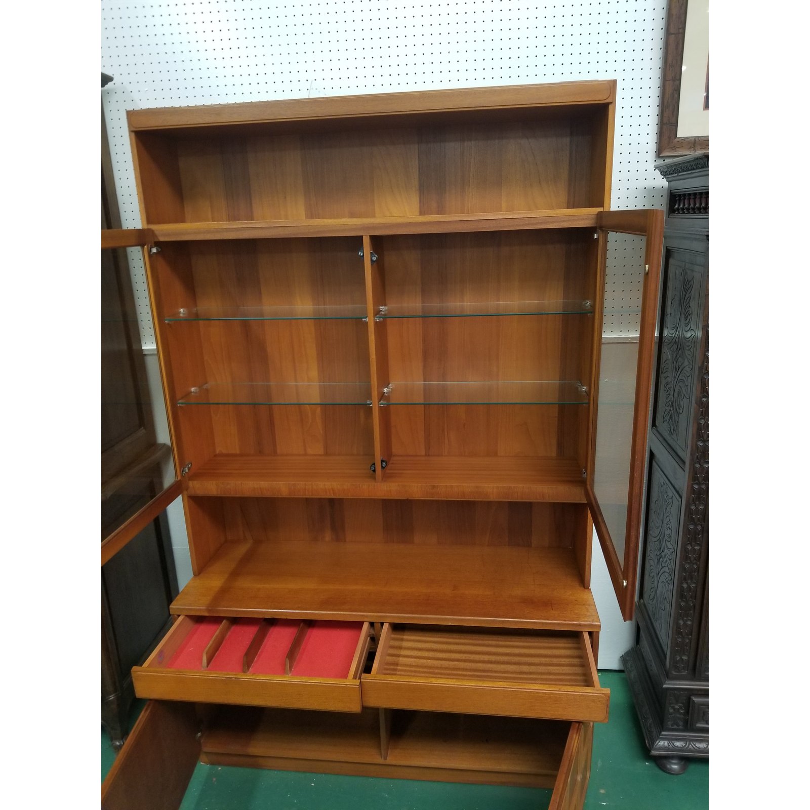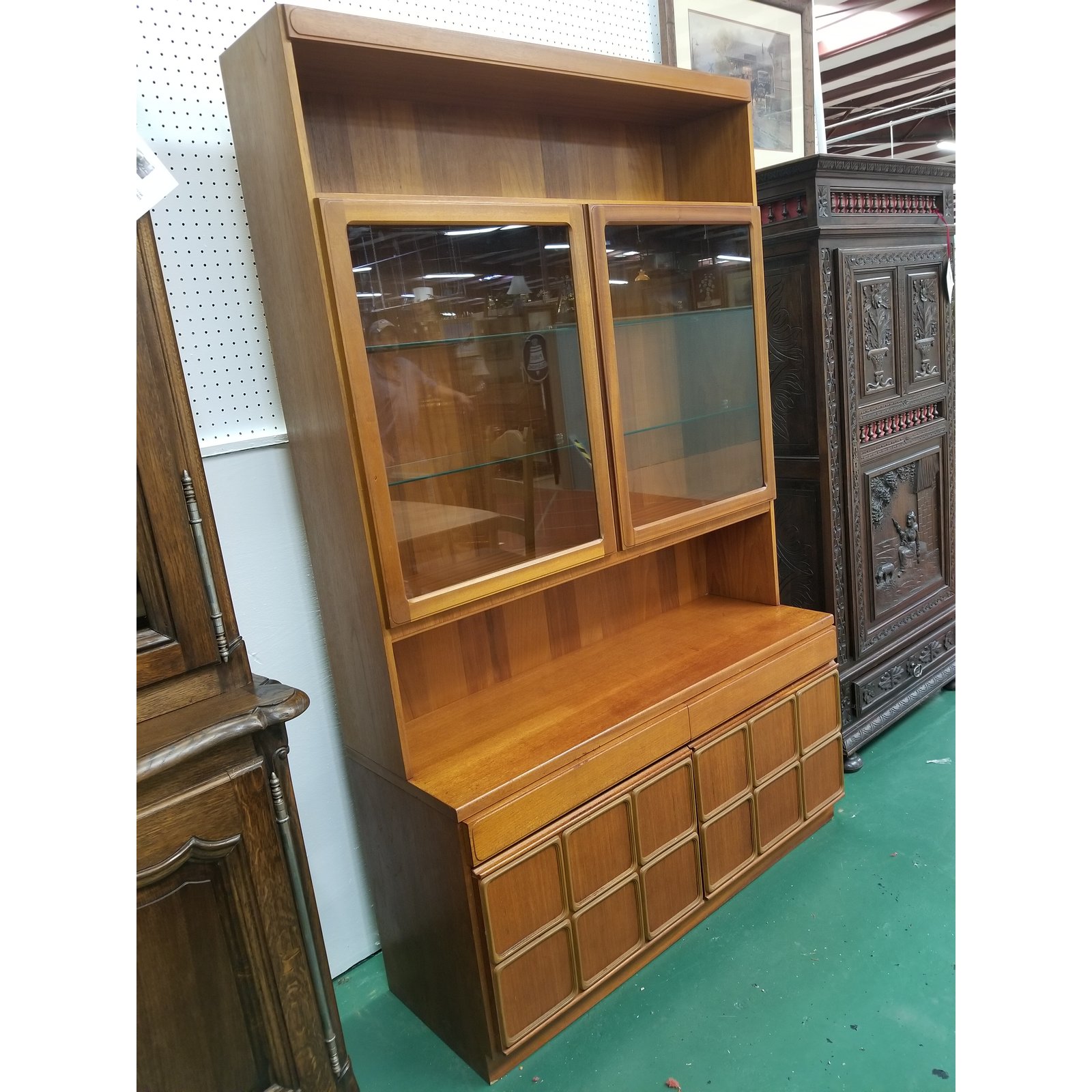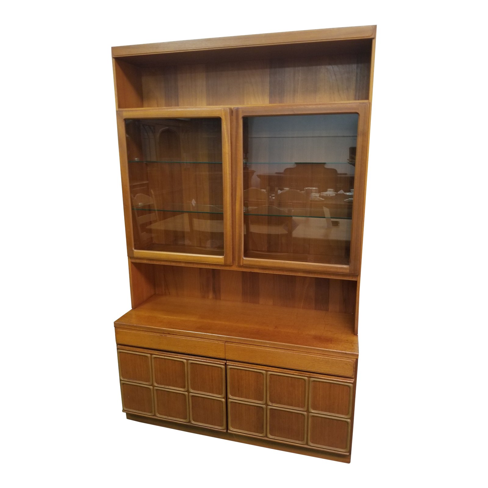 Mid century modern china cabinet by McIntosh Furniture. This cabinet comes it two pieces and it features a top shelf over two glass door that open up to reveal four glass shelves inside, the bottom sideboard with two drawers over two doors with two shelves inside. Made in Scotland.