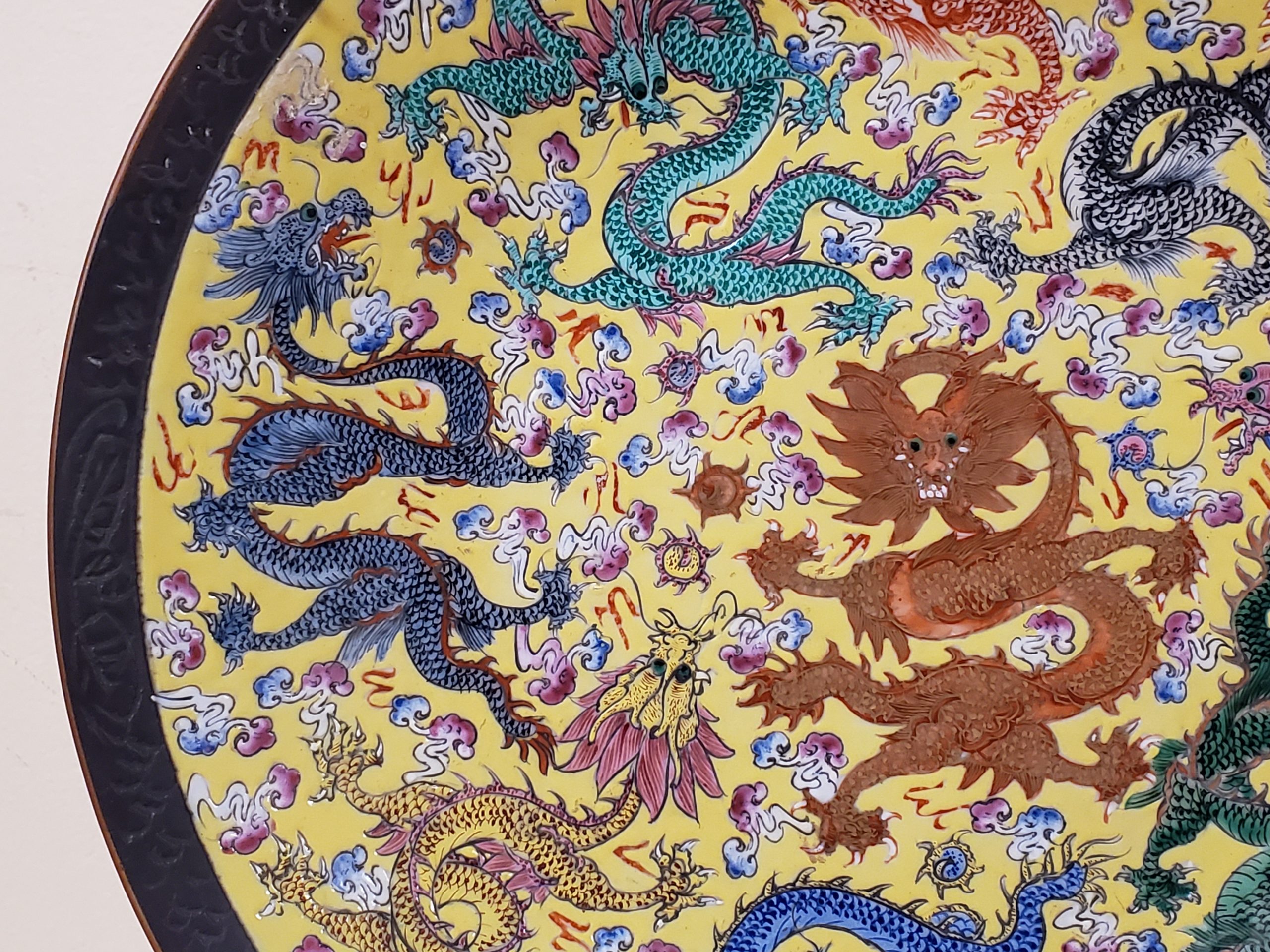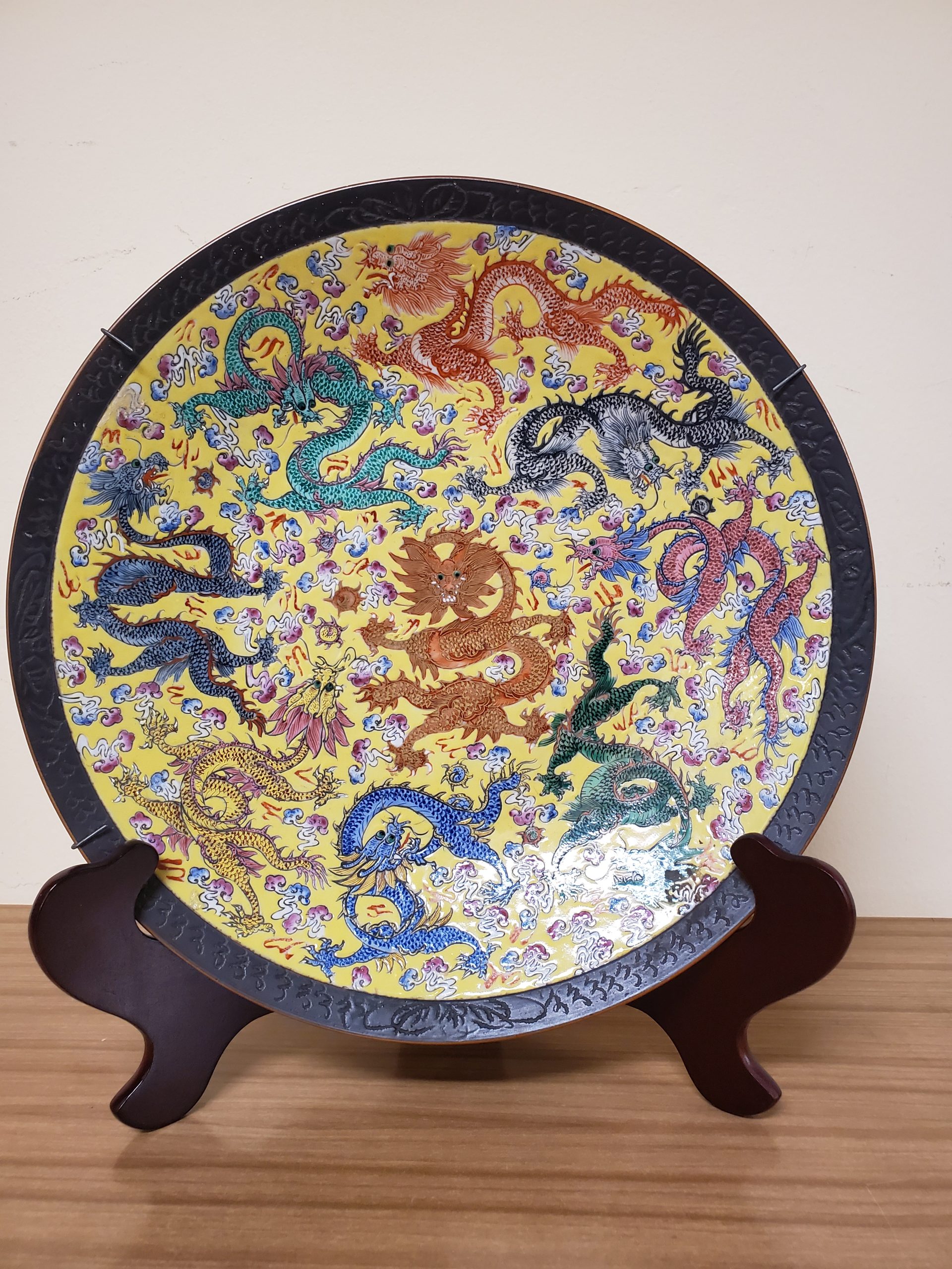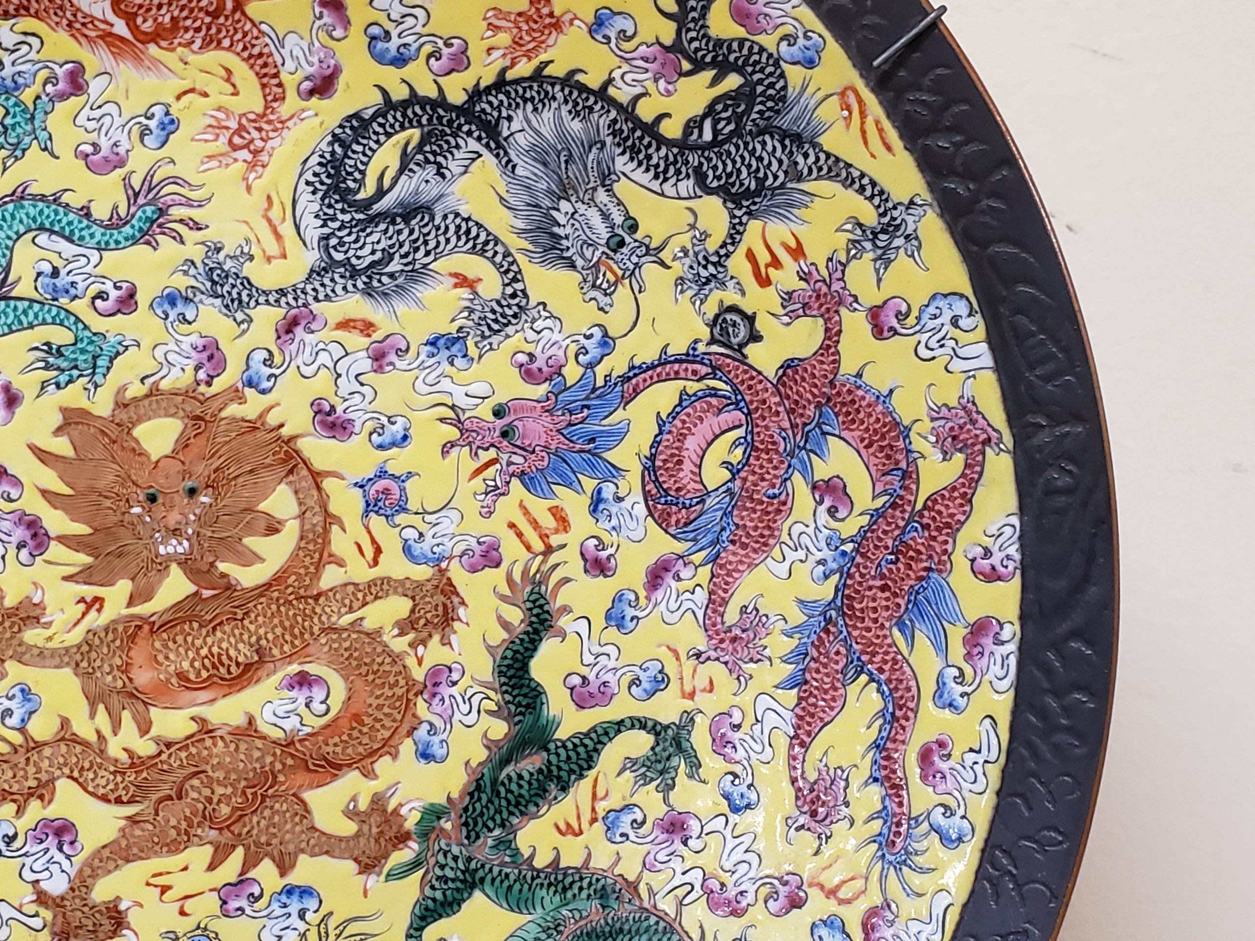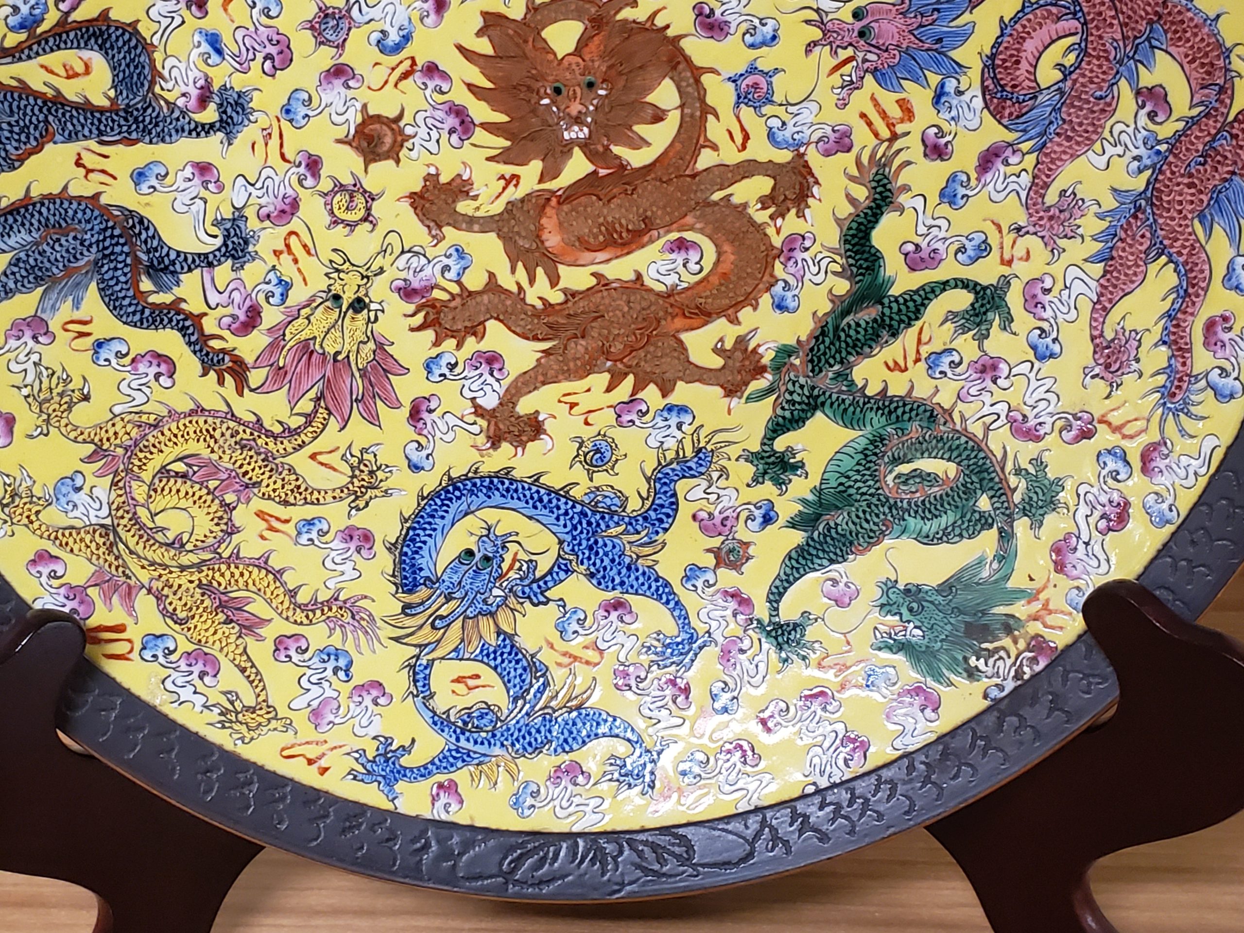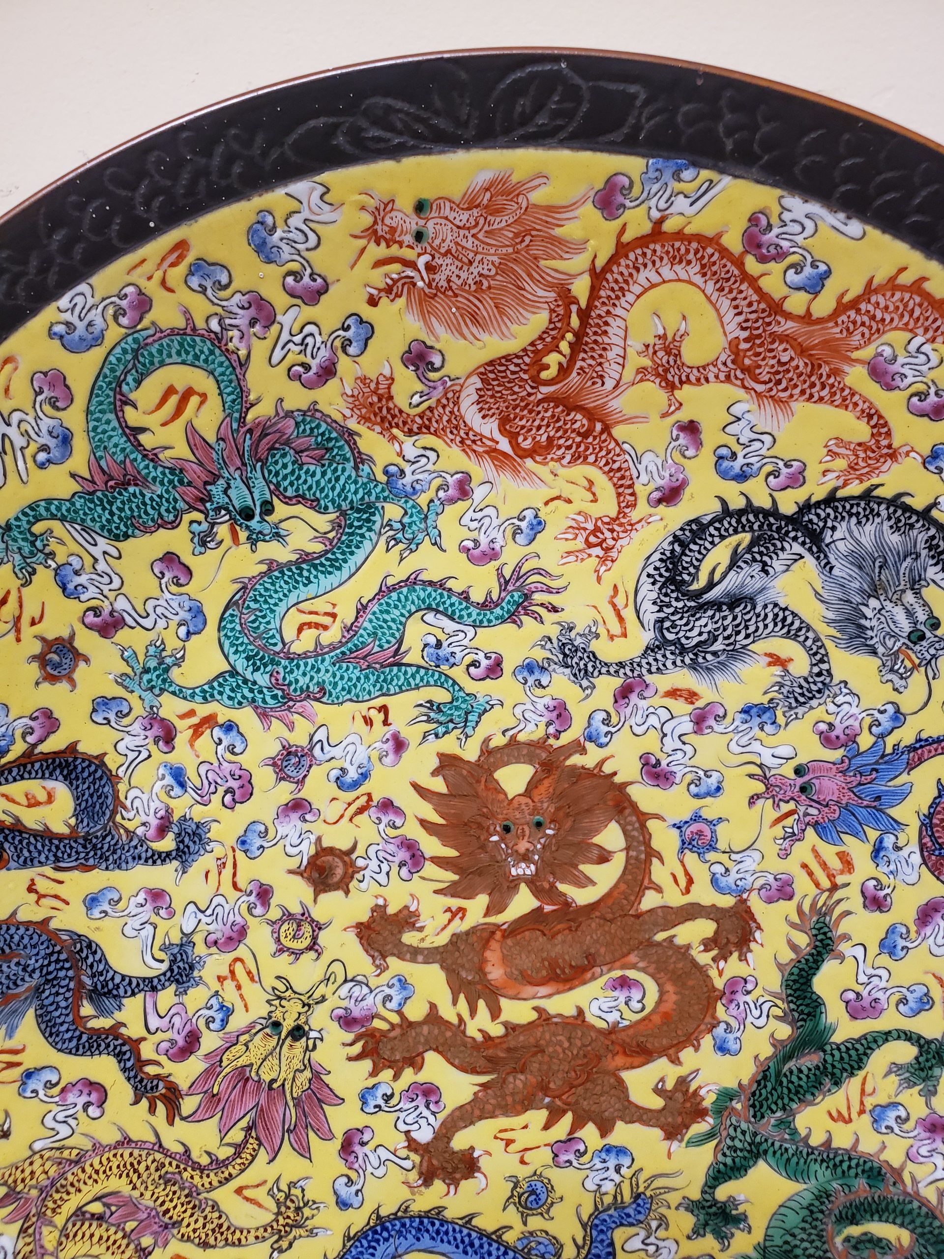 Rare Chinese porcelain charger featuring five claw dragon in central medallion and nine writhing dragons. Brown mark on bottom.