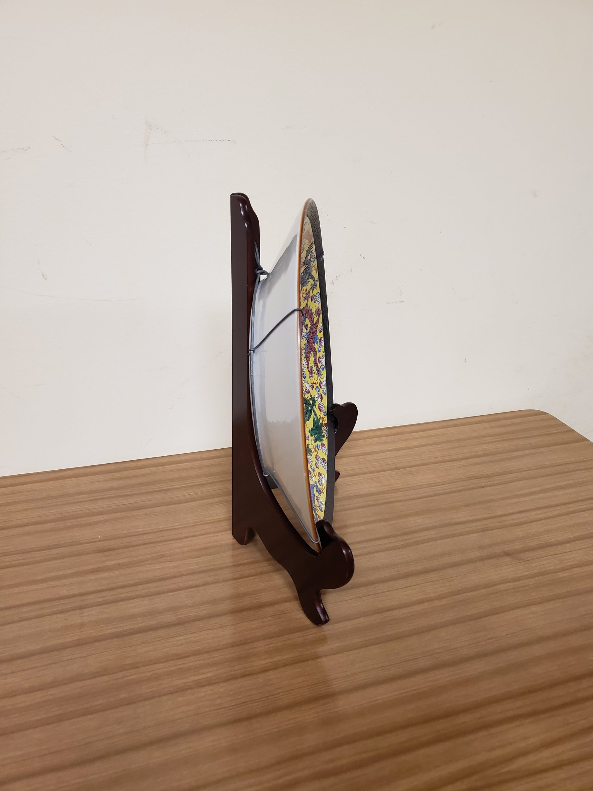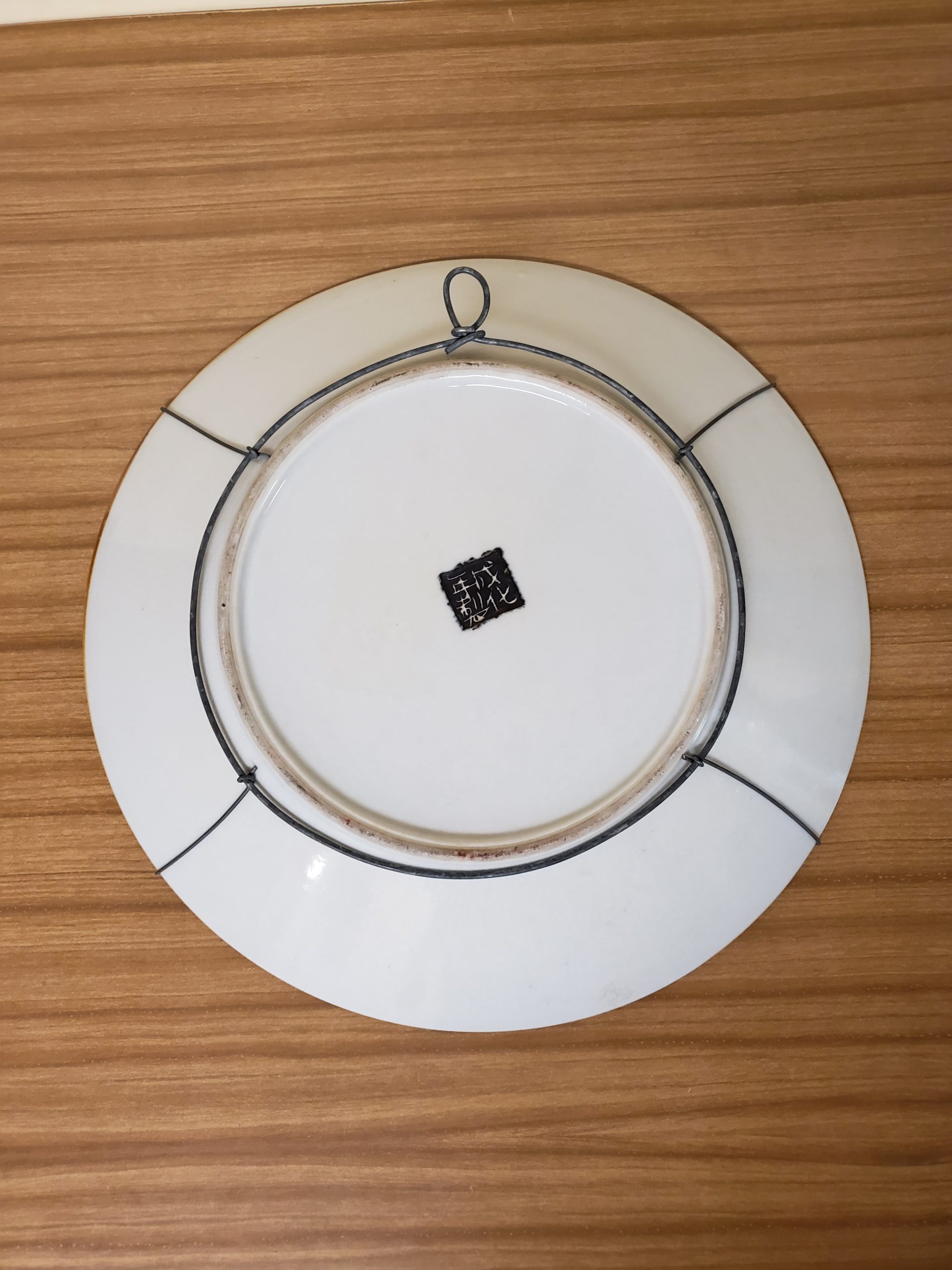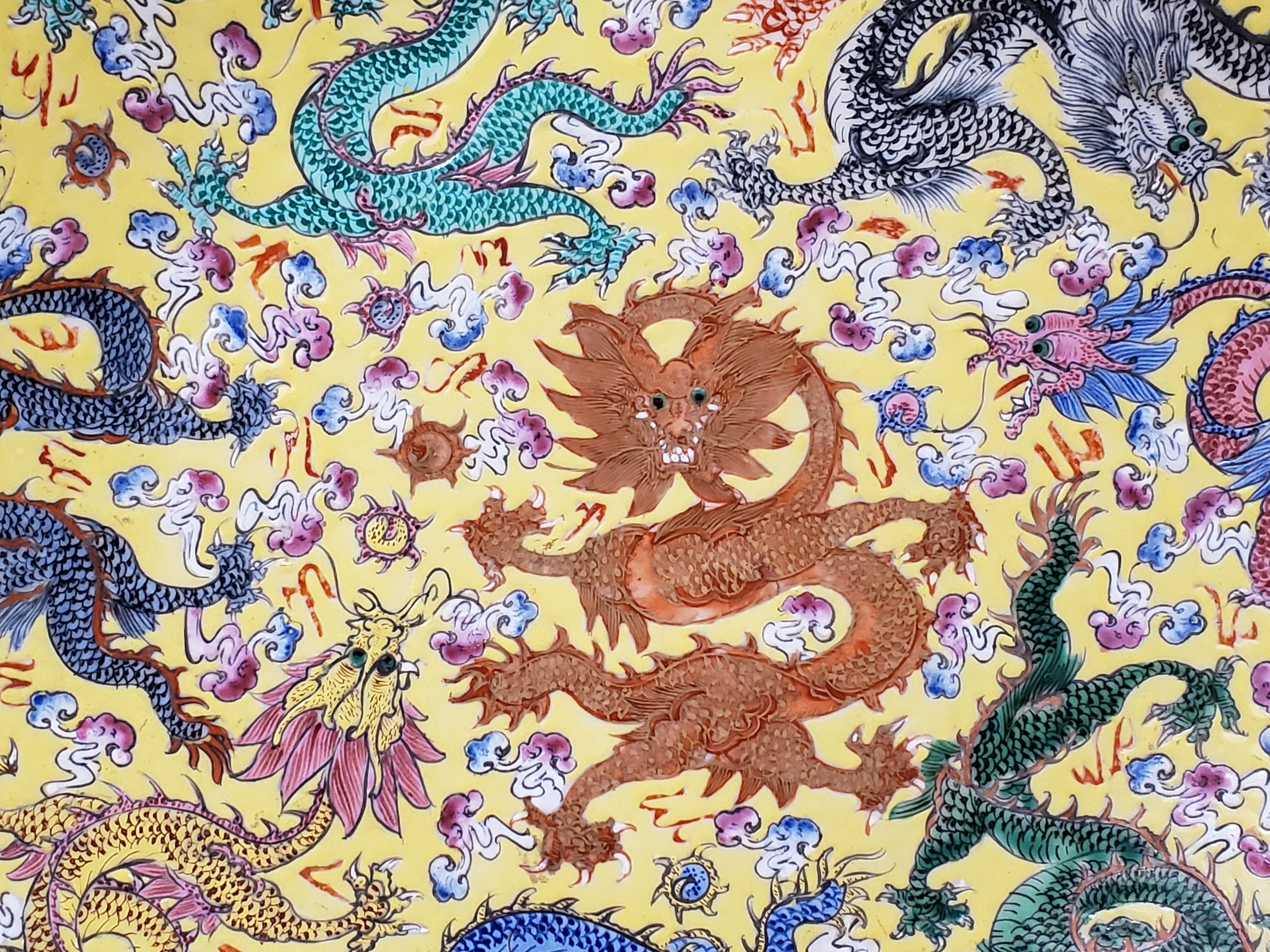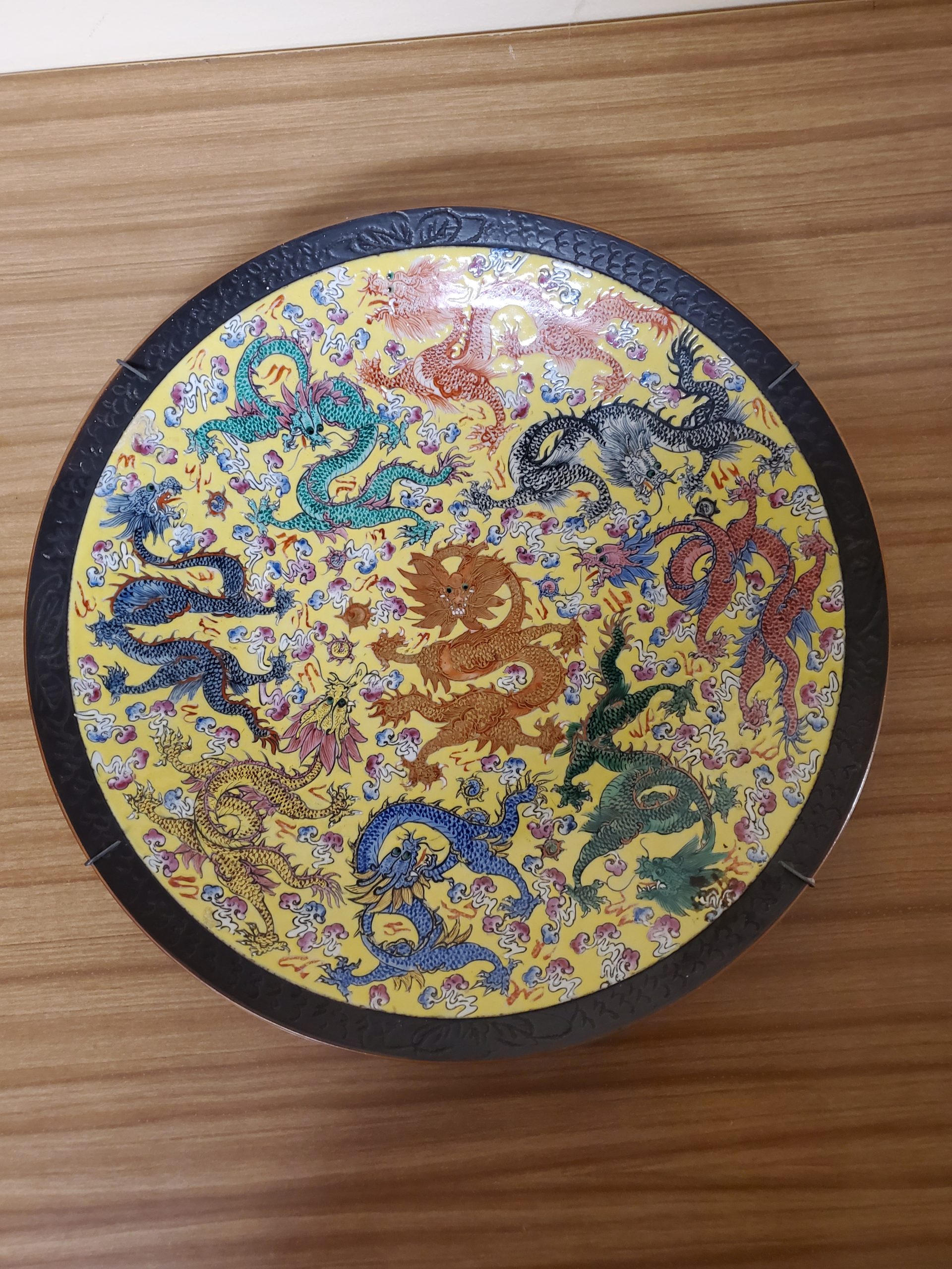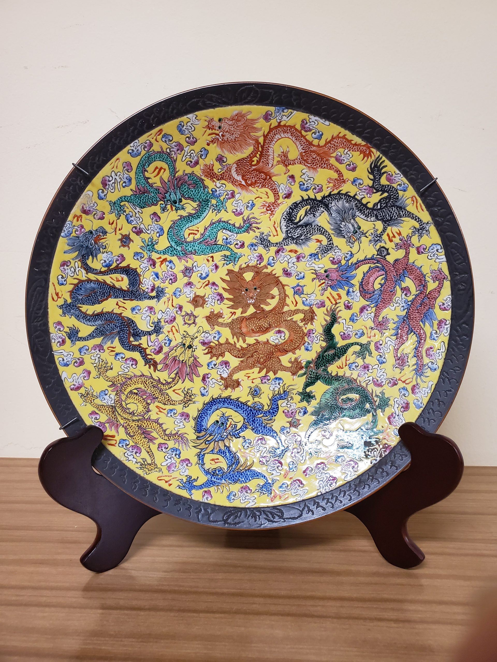 Rare Chinese porcelain charger featuring five claw dragon in central medallion and nine writhing dragons. Brown mark on bottom.