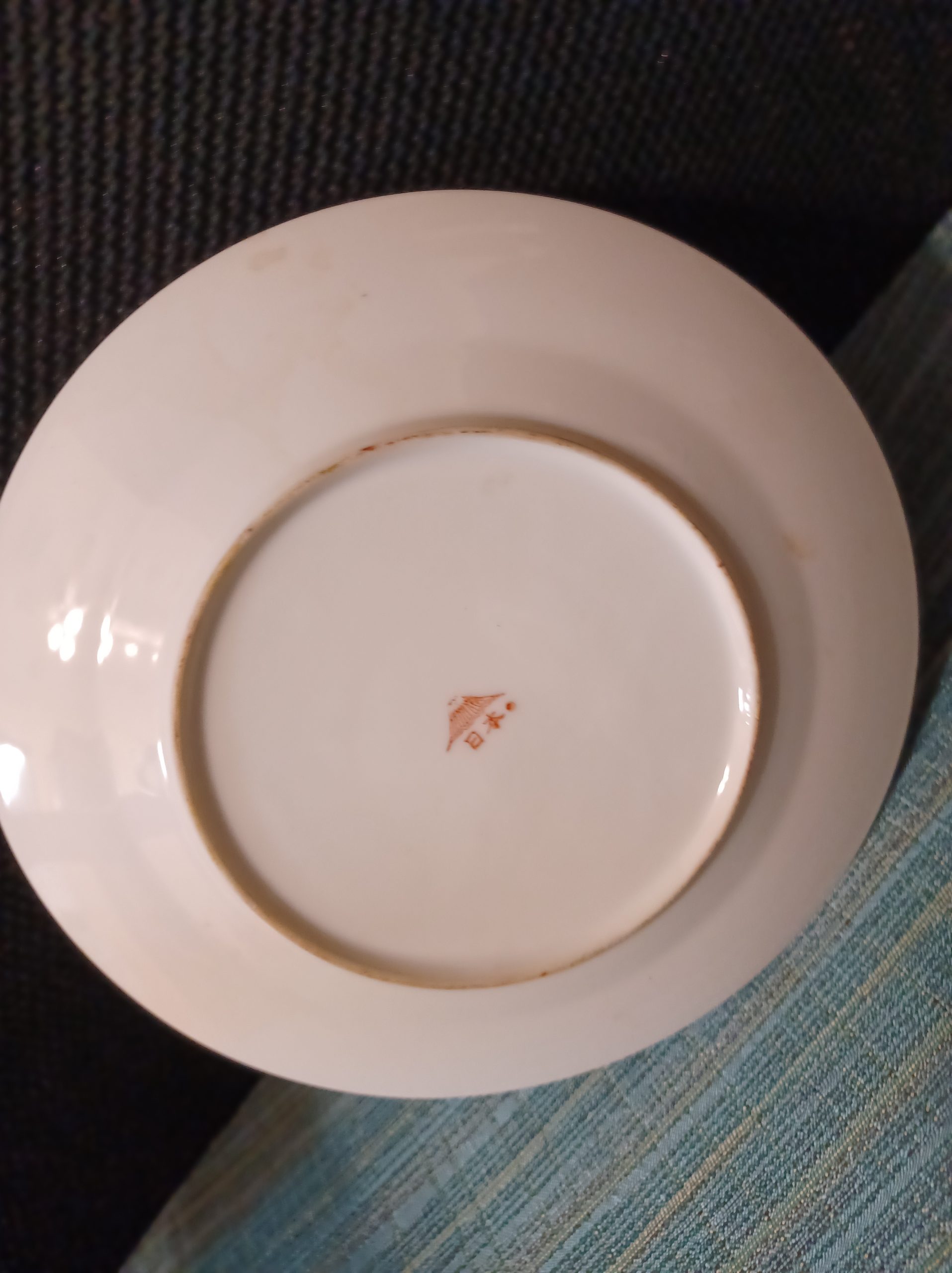 Vintage Japanese moriage Satsuma plate depicting a Goddess surrounded by four immortals. The plate is decorated in colors of red, orange, blue, and brown with gold accents.