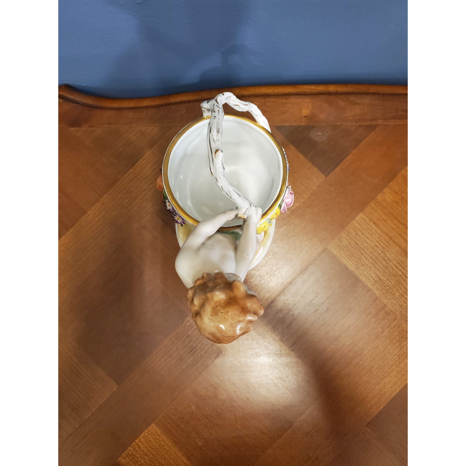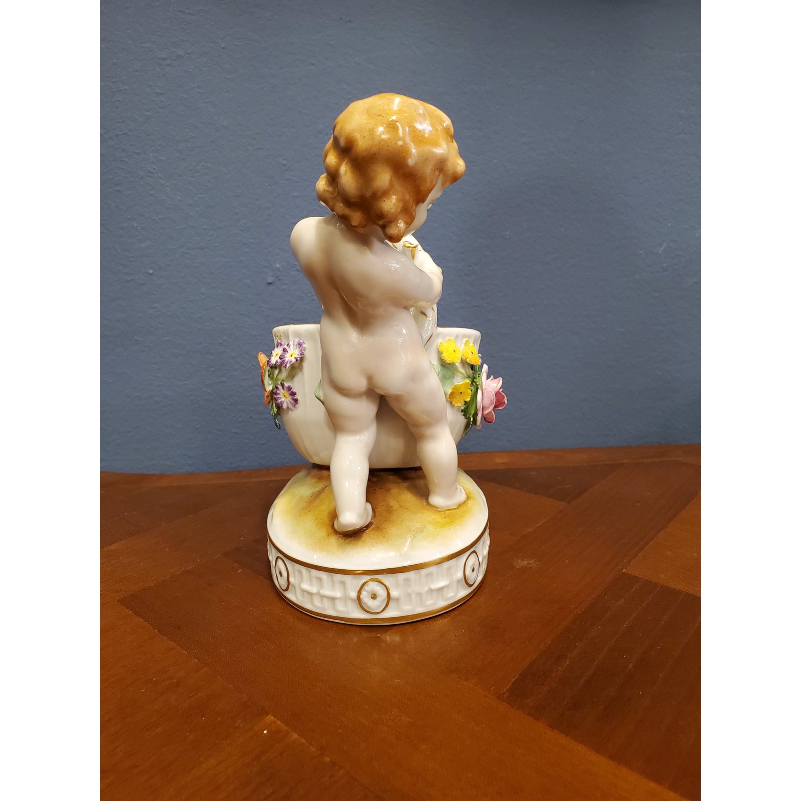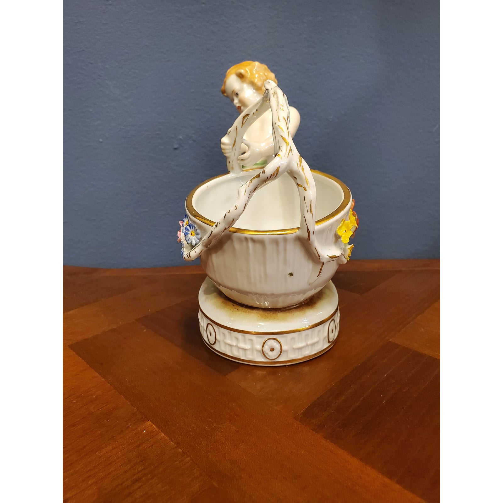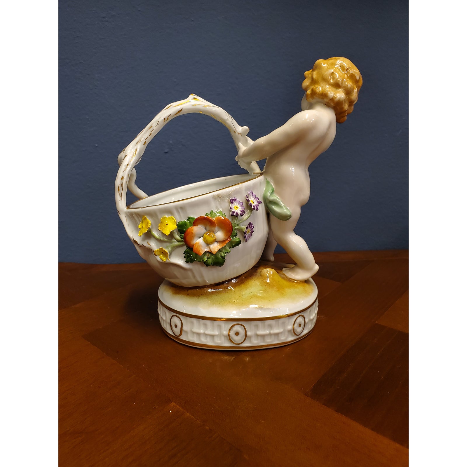 Schierholz floral encrusted porcelain condiments serving dish, modeled as a sparsely attired putto struggling to drag a large basket with twig handles, raised on an oval stylized groundwork base with continuous buckles and floral disc shallow relief sides, verso partially effaced underglaze green Schierholz shield above “Hand Painted,” and a black ink rubber stamped circular “Made in Germany,”.