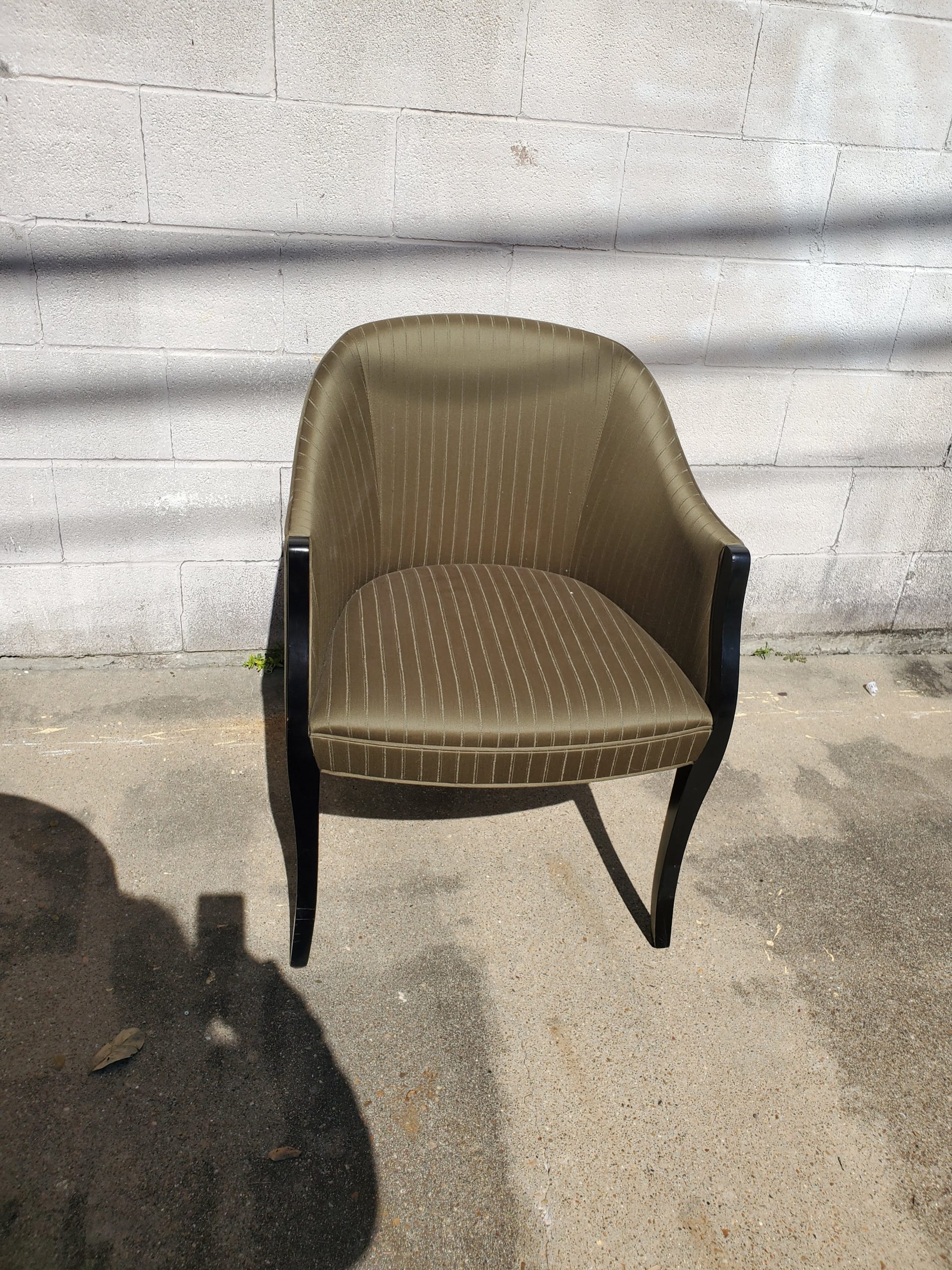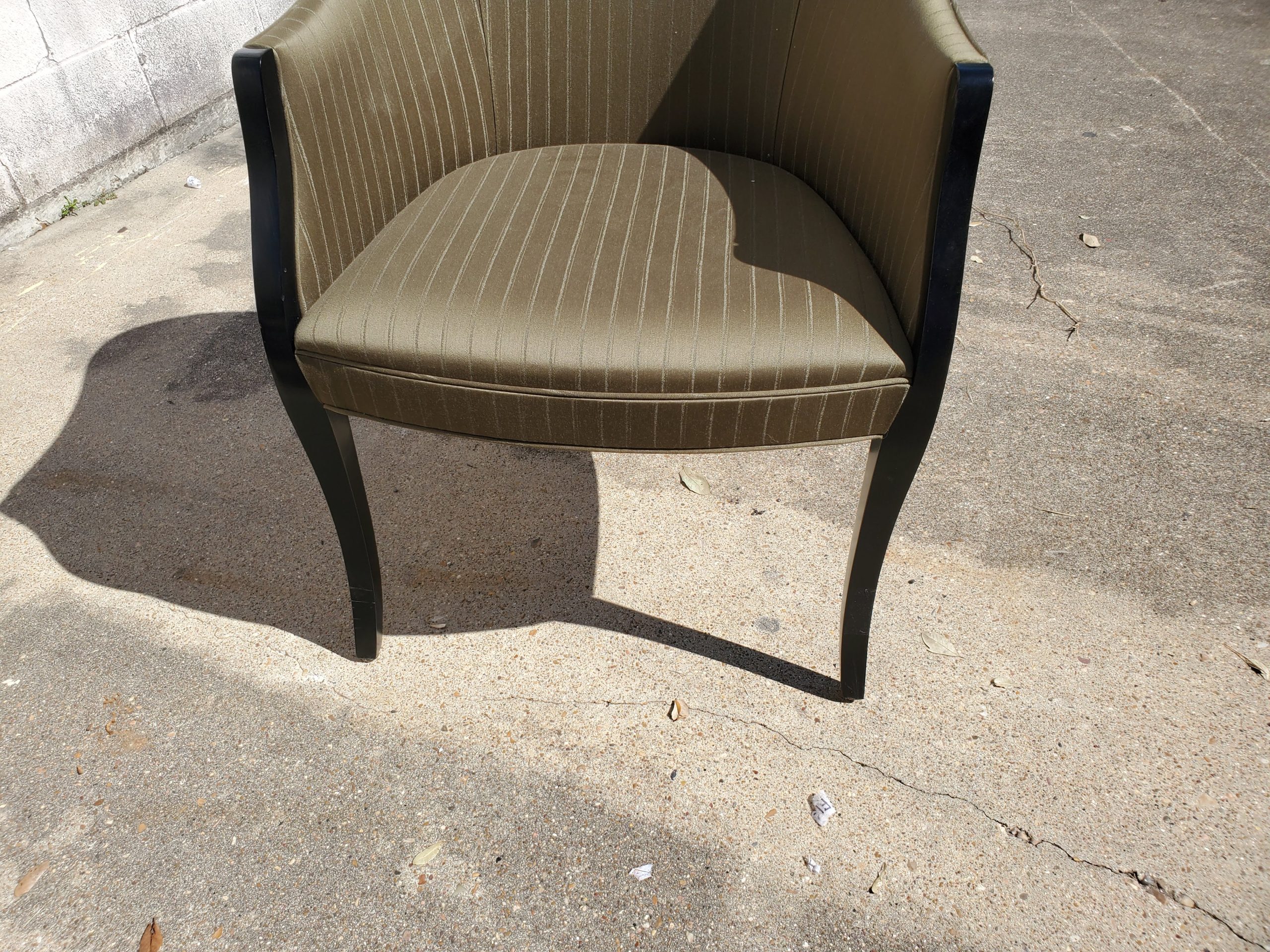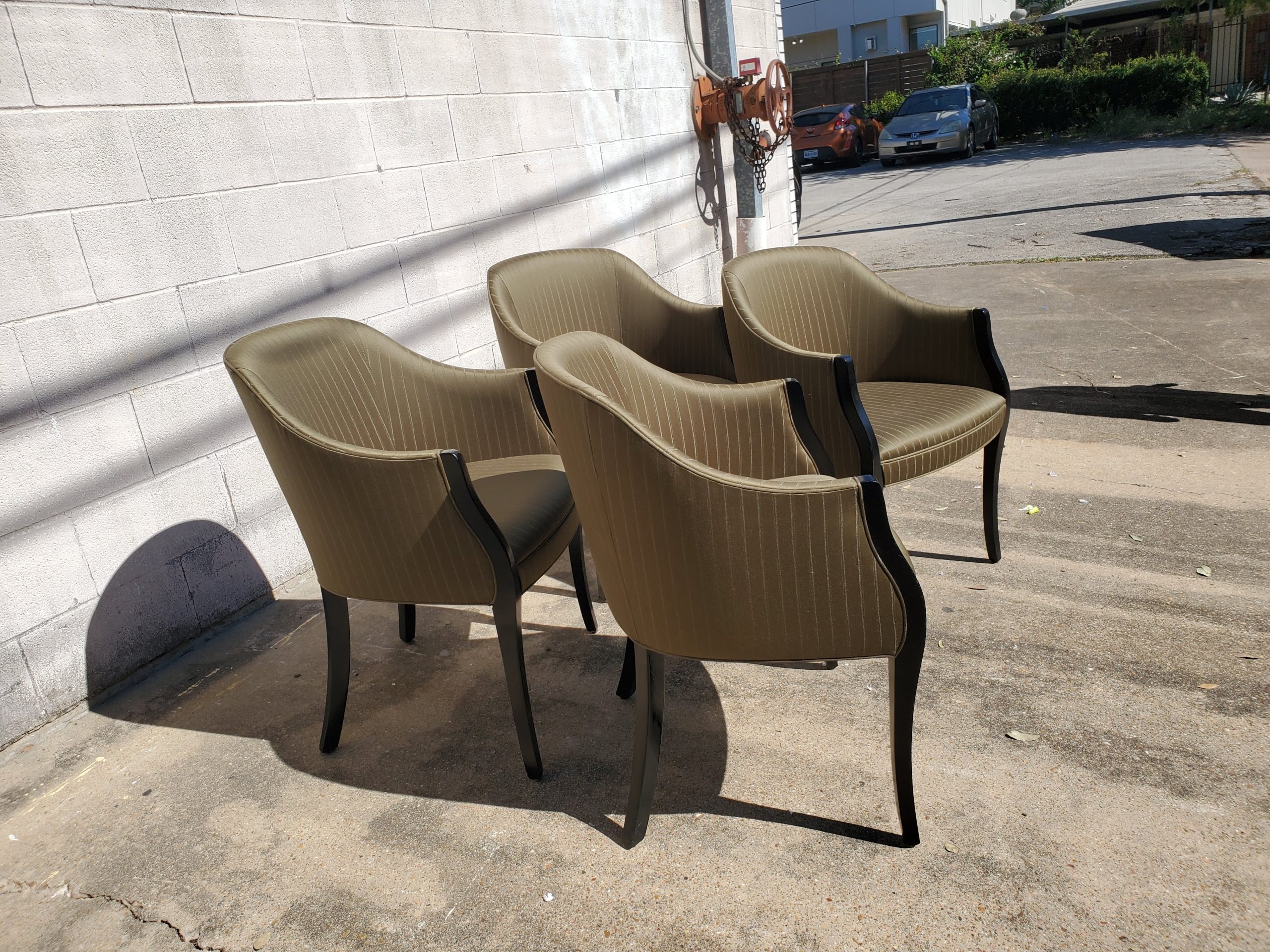 Set of four Geiger French style chairs consisting of green stripes upholstery and black frame on chairs. They’re unmarked.