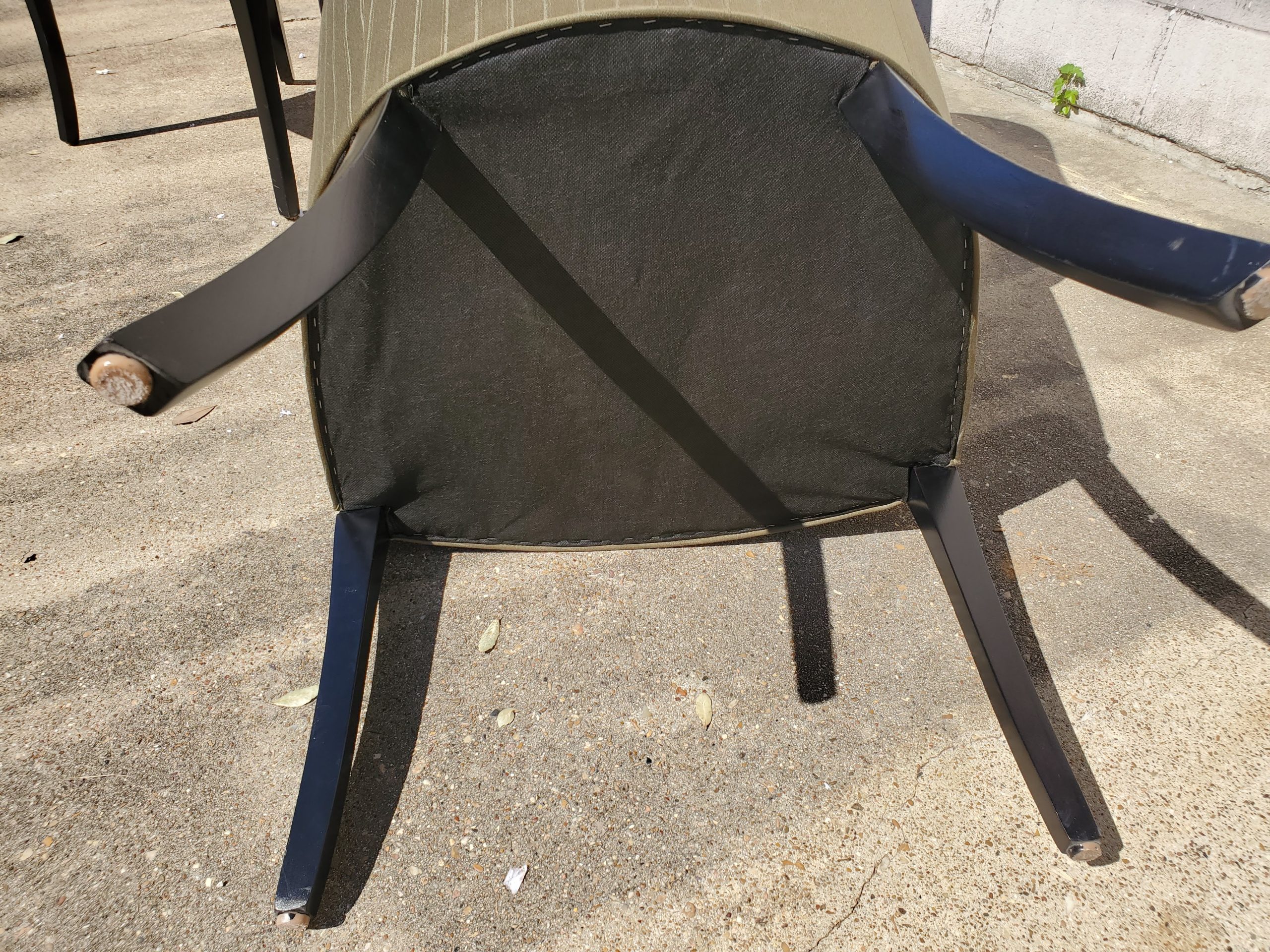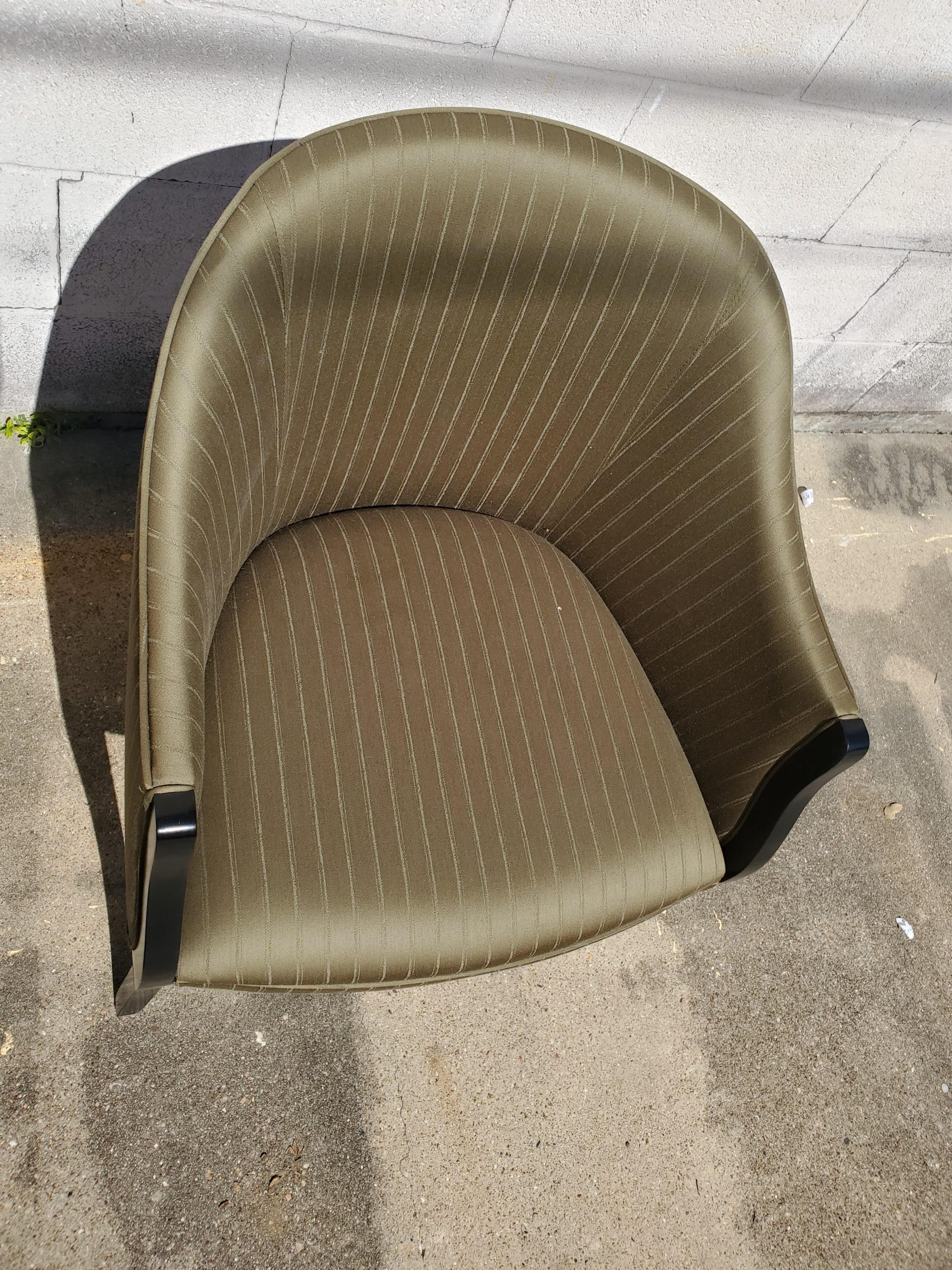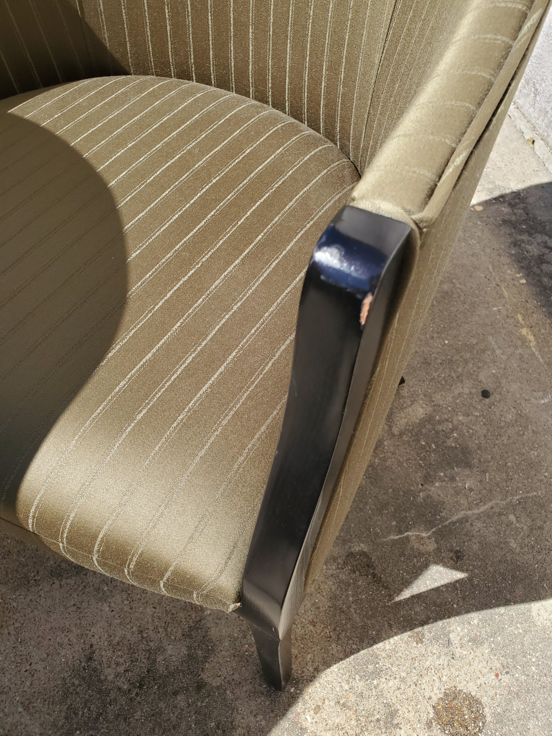 Set of four Geiger French style chairs consisting of green stripes upholstery and black frame on chairs. They’re unmarked.