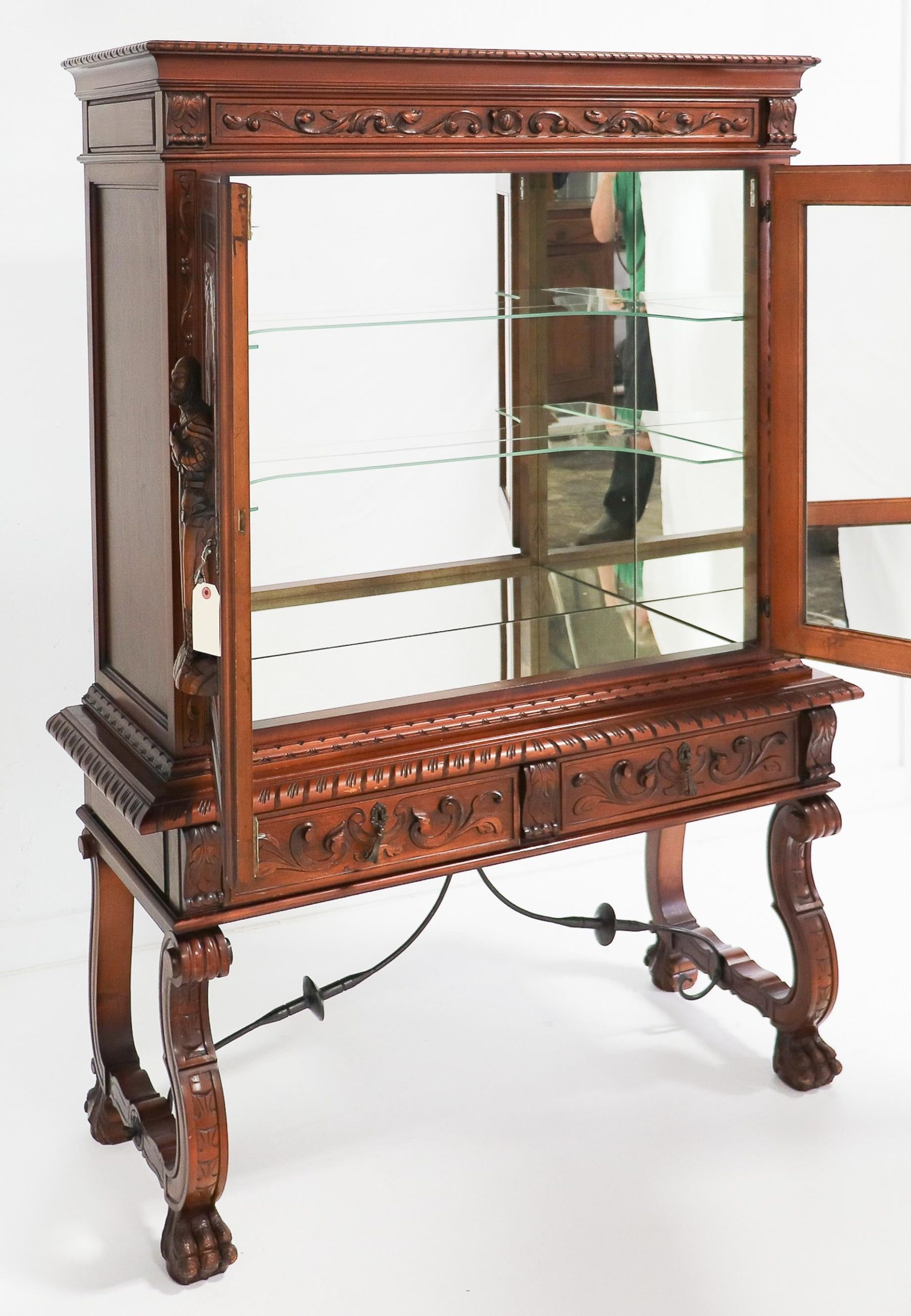 Beautiful mahogany Spanish Renaissance style bar cabinet. It consists of two carved doors detailing three dimensional sculptures of a knight with his sword and a priest. Inside you can see a mirrored back, sides, bottom, doors, and two glass shelves. The cabinet is adorned by carvings on top and on the two dovetail drawers, wrought iron stretcher, and deeply sculpted lion paw feet, from the second half of the 20th century.
