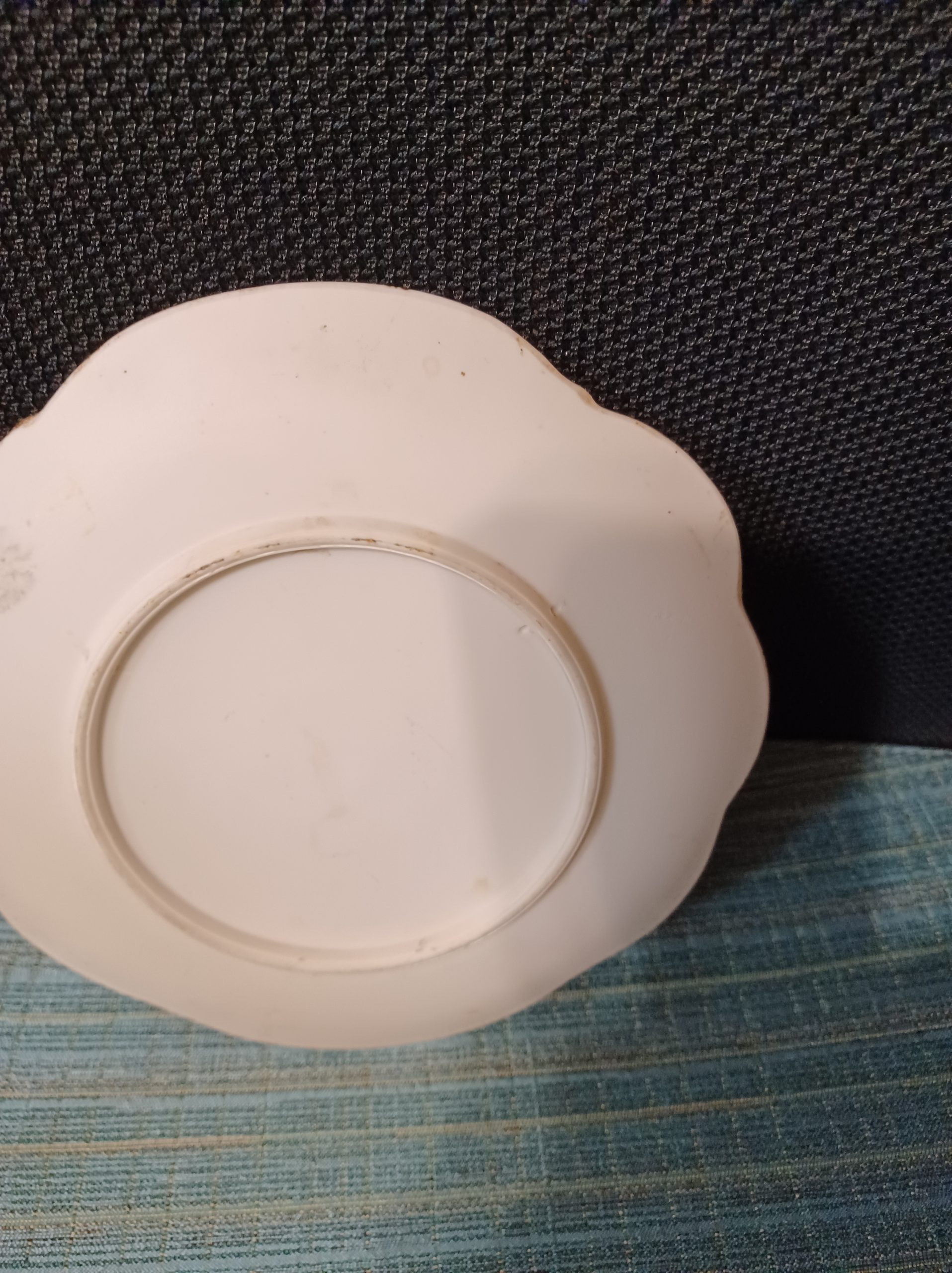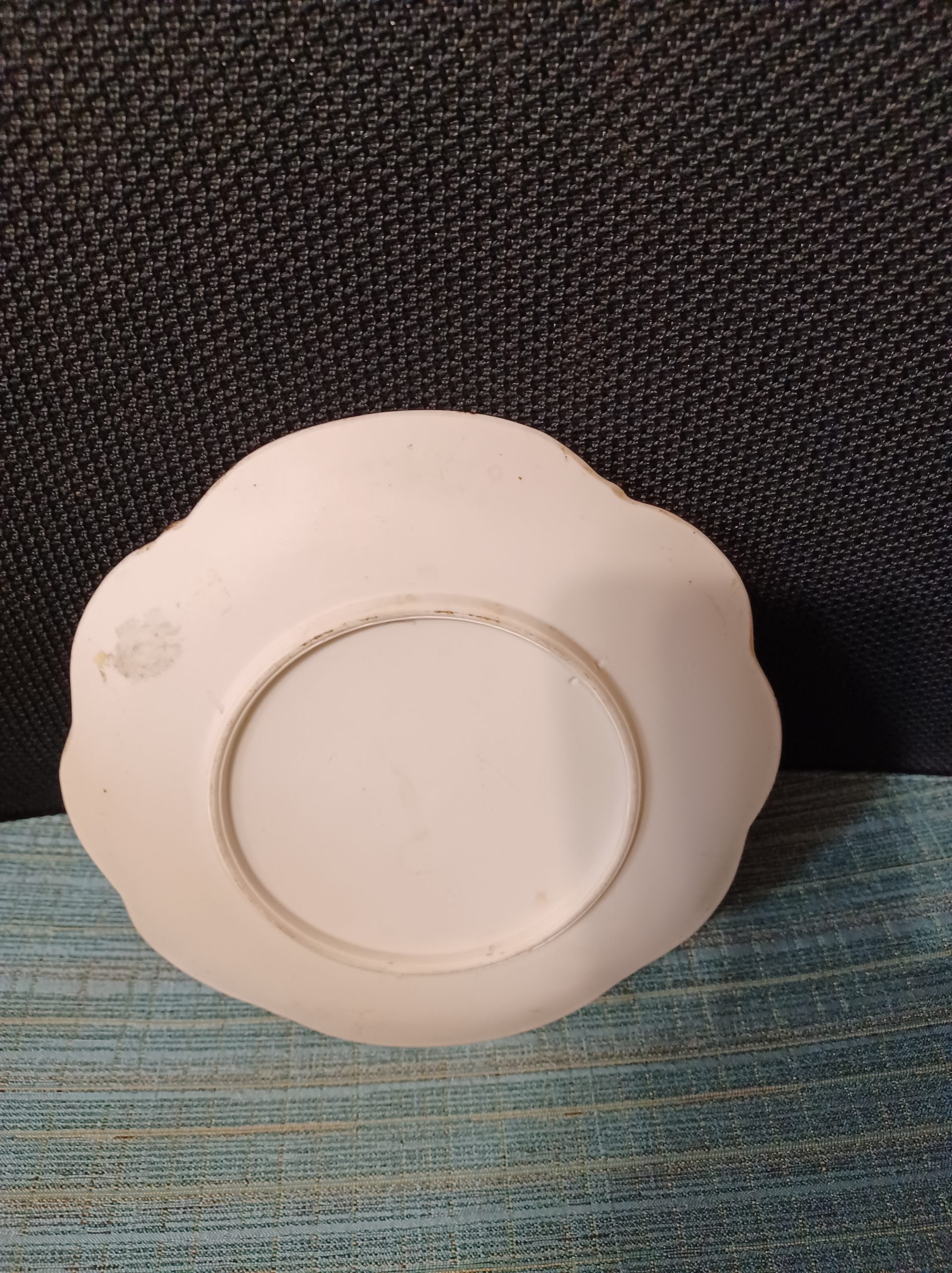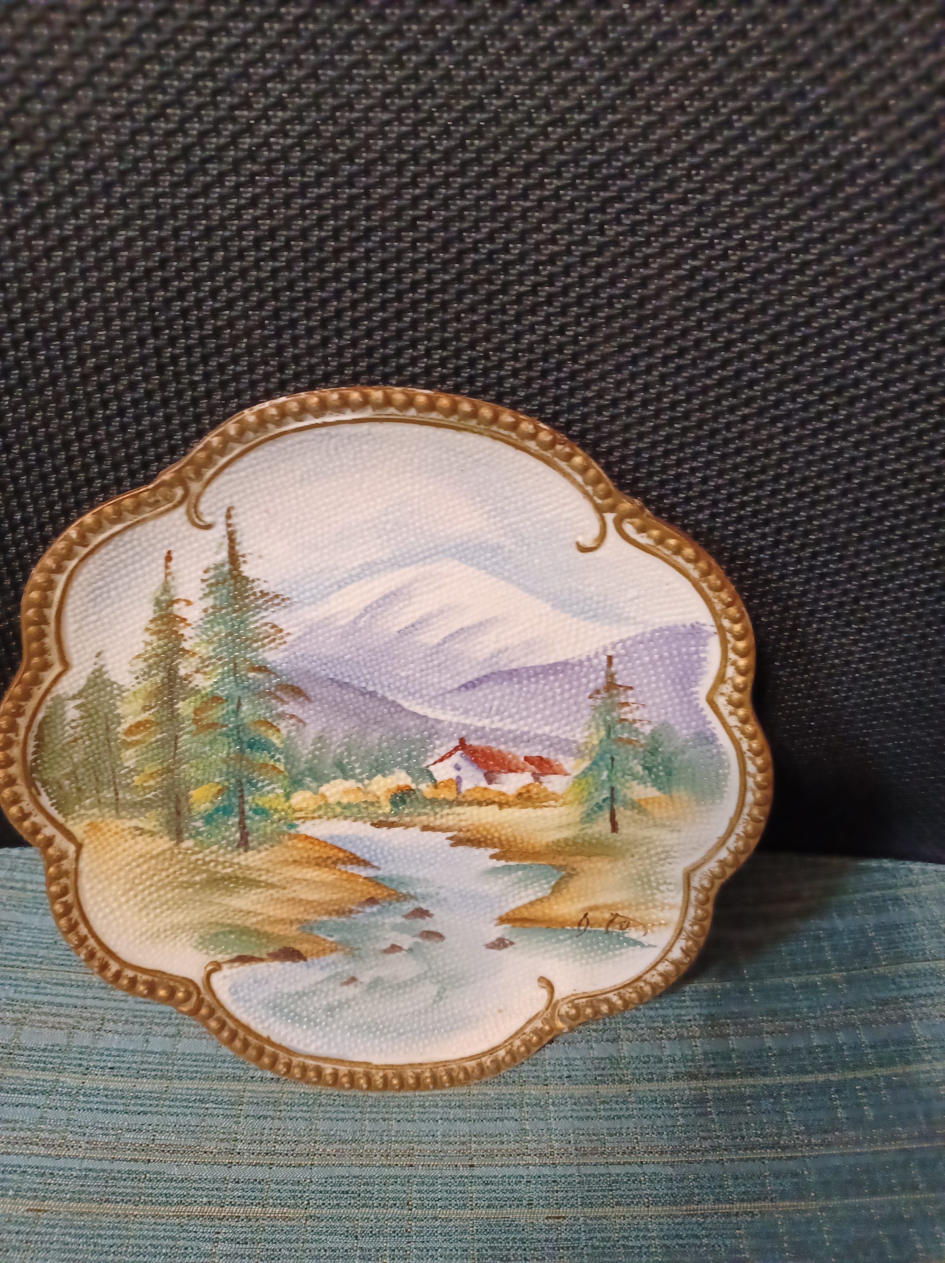 Vintage hand painted decorative plate by UCAGCo ceramics Japan. Featuring a country scene with a stream and a charming cottage surrounded by trees, and mountains in the background. Having scalloped edges, beaded gilt rim detailing. Signed on the bottom right. Circa mid-20th century.