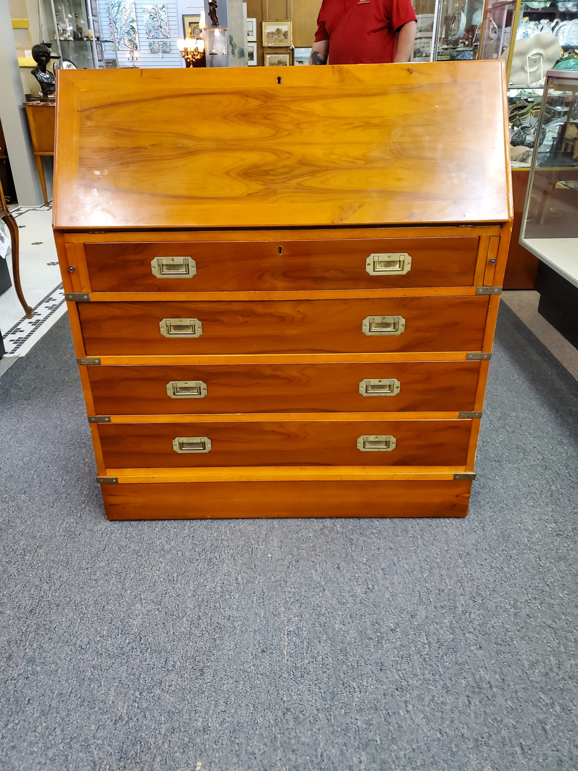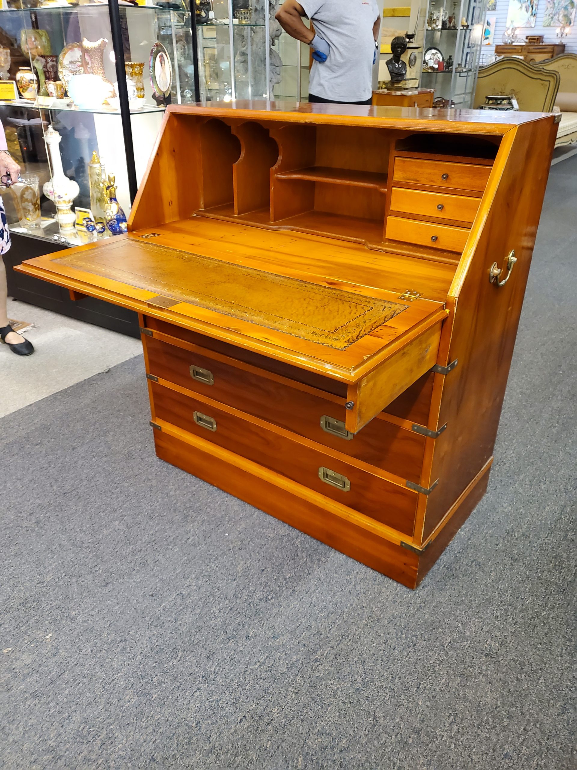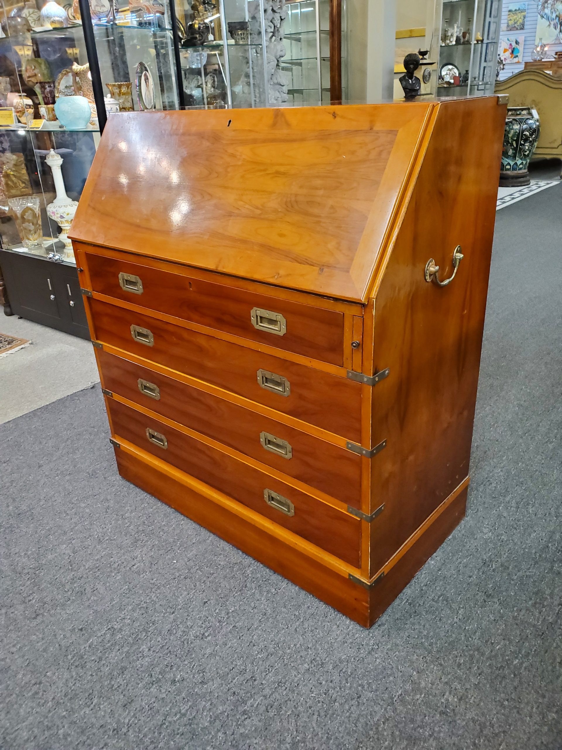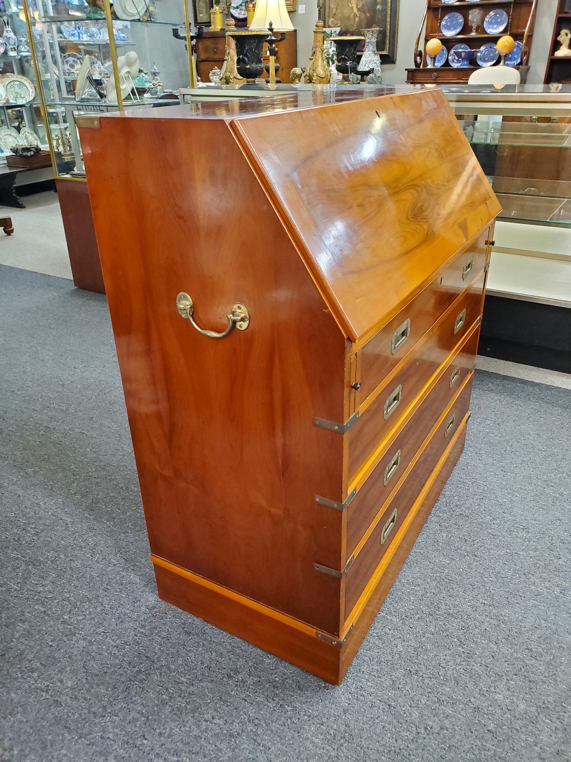 Vintage campaign chest, with four dovetail drawers, drop down has a leather insert and three small drawers and cubbies for storage, having brass hardware, from the 20th century.