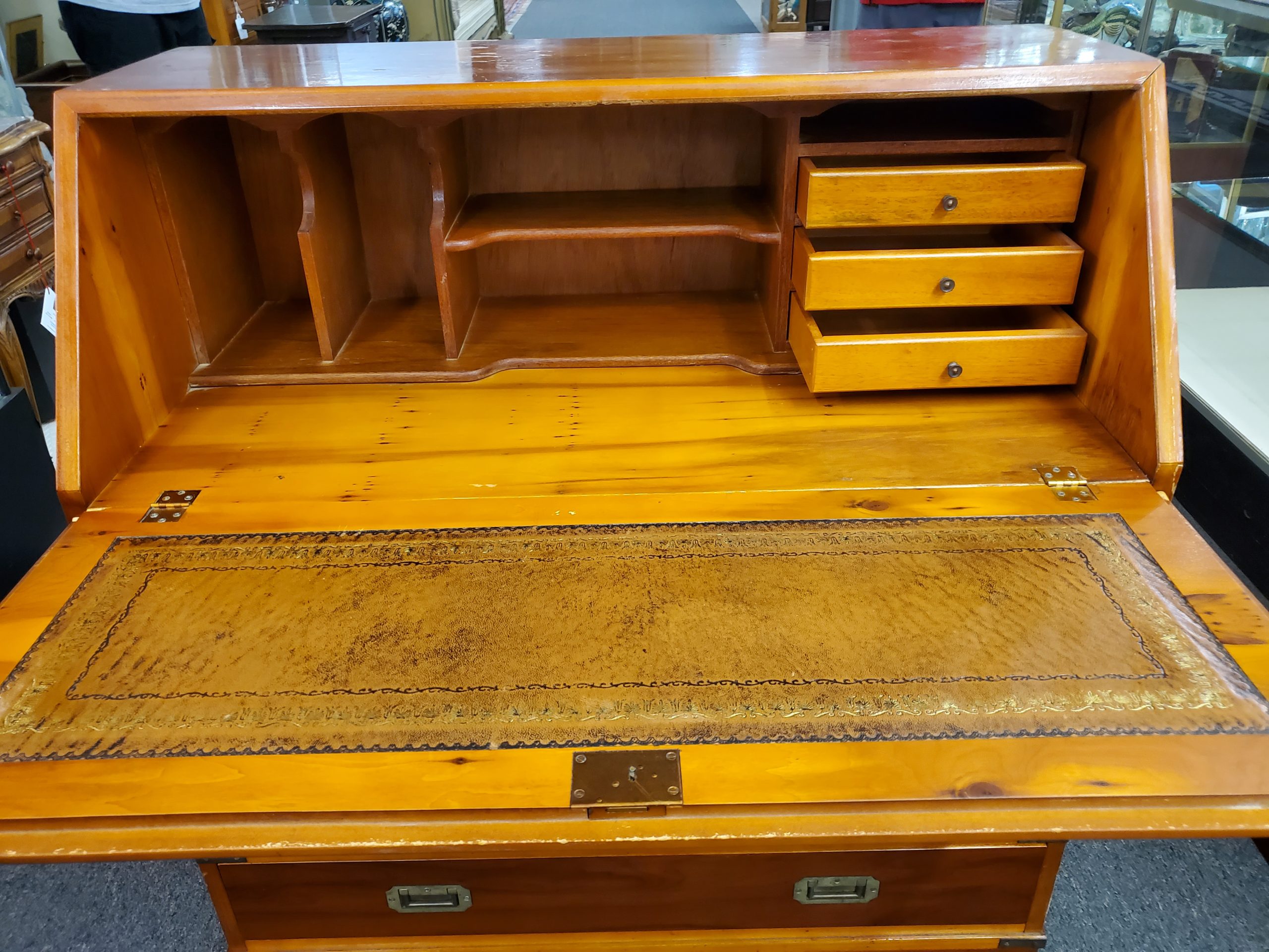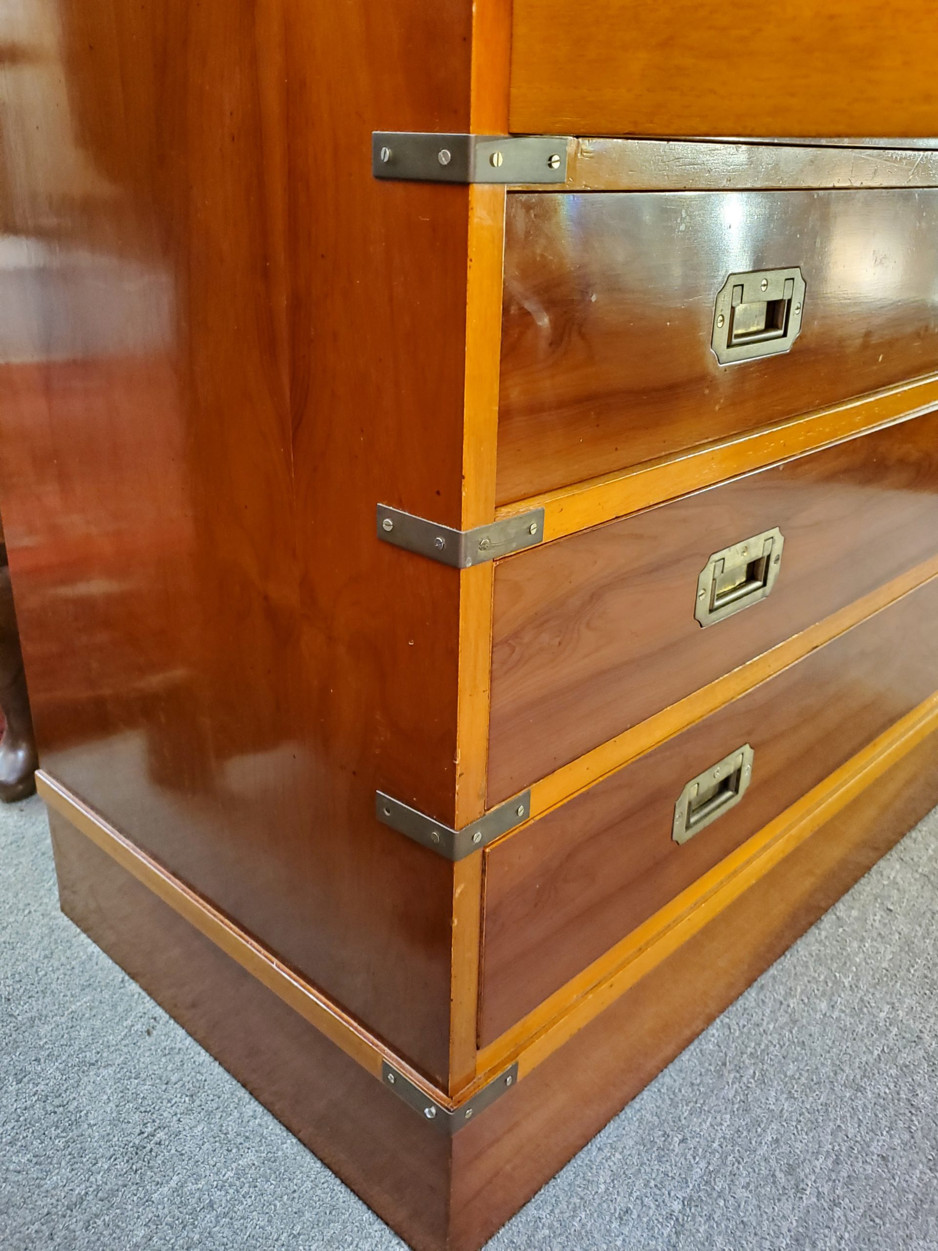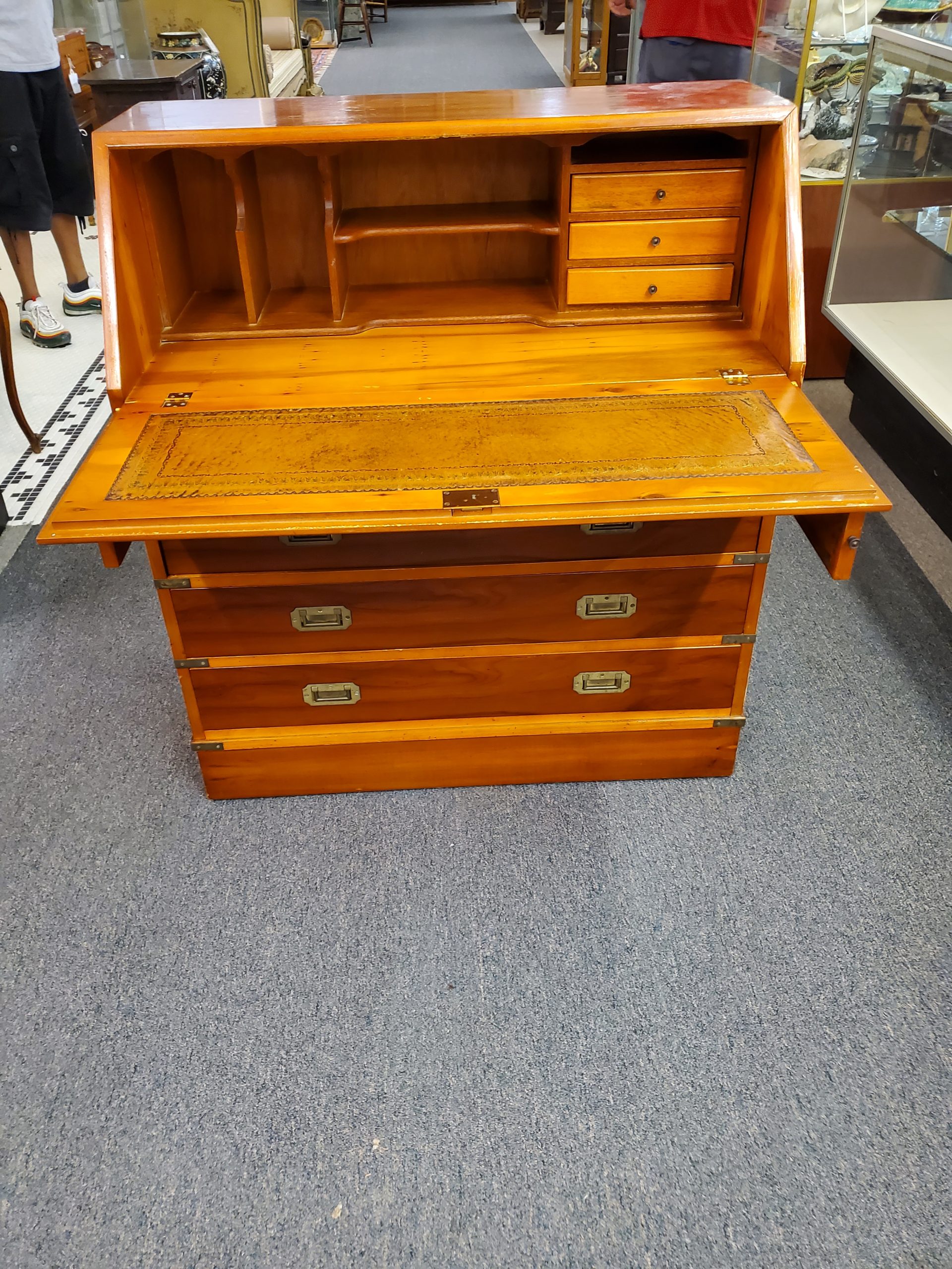 Vintage campaign chest, with four dovetail drawers, drop down has a leather insert and three small drawers and cubbies for storage, having brass hardware, from the 20th century.