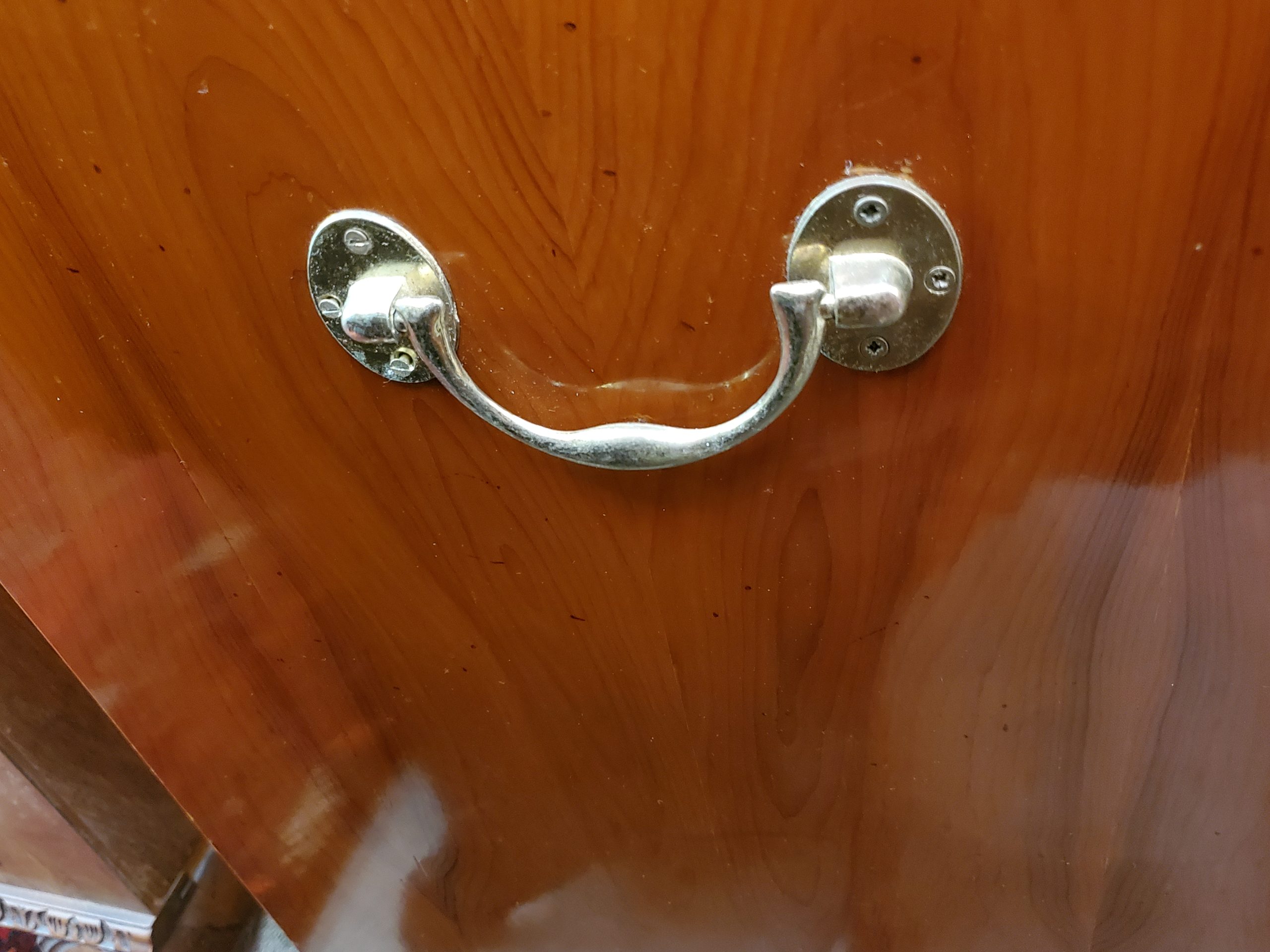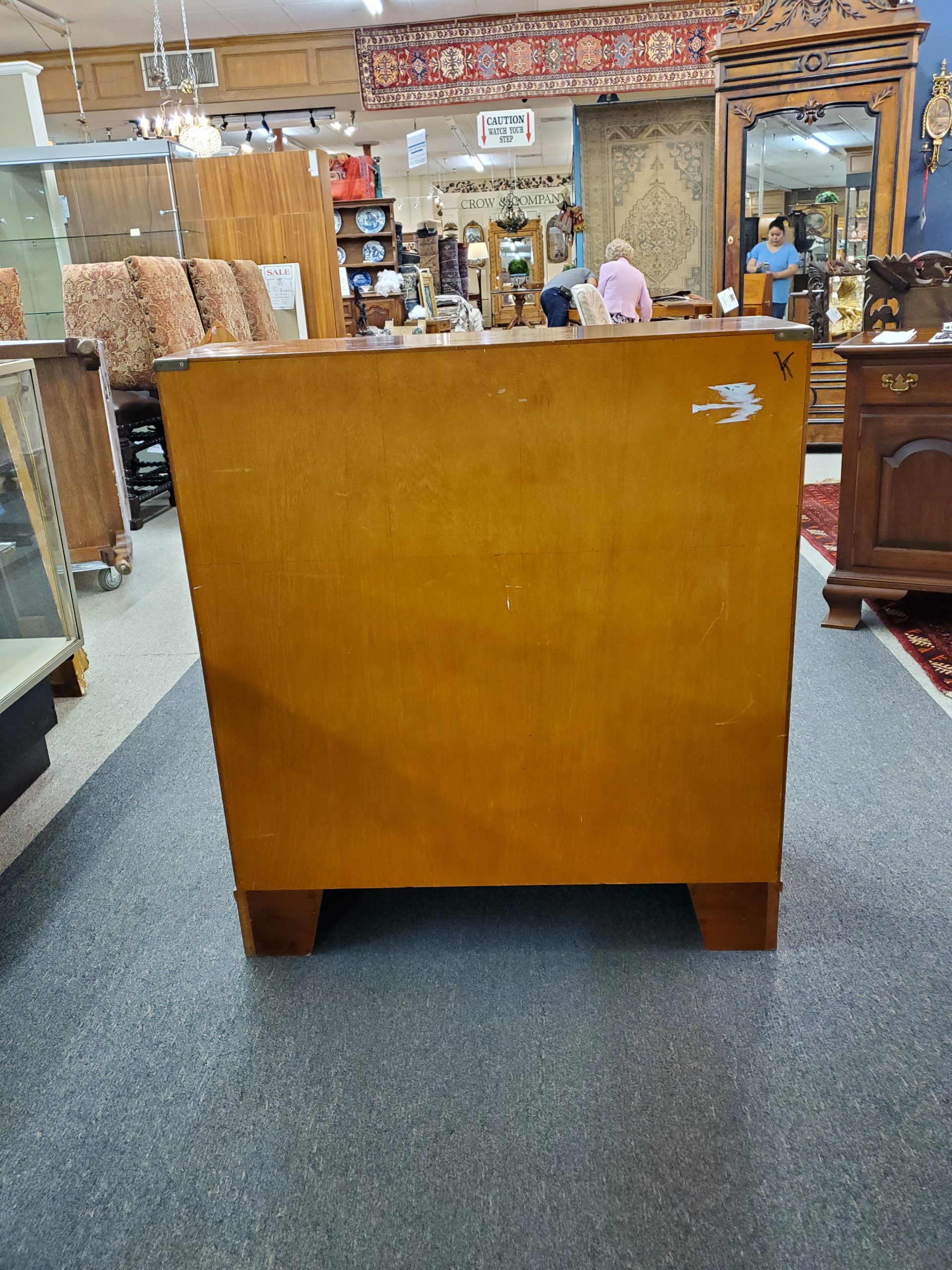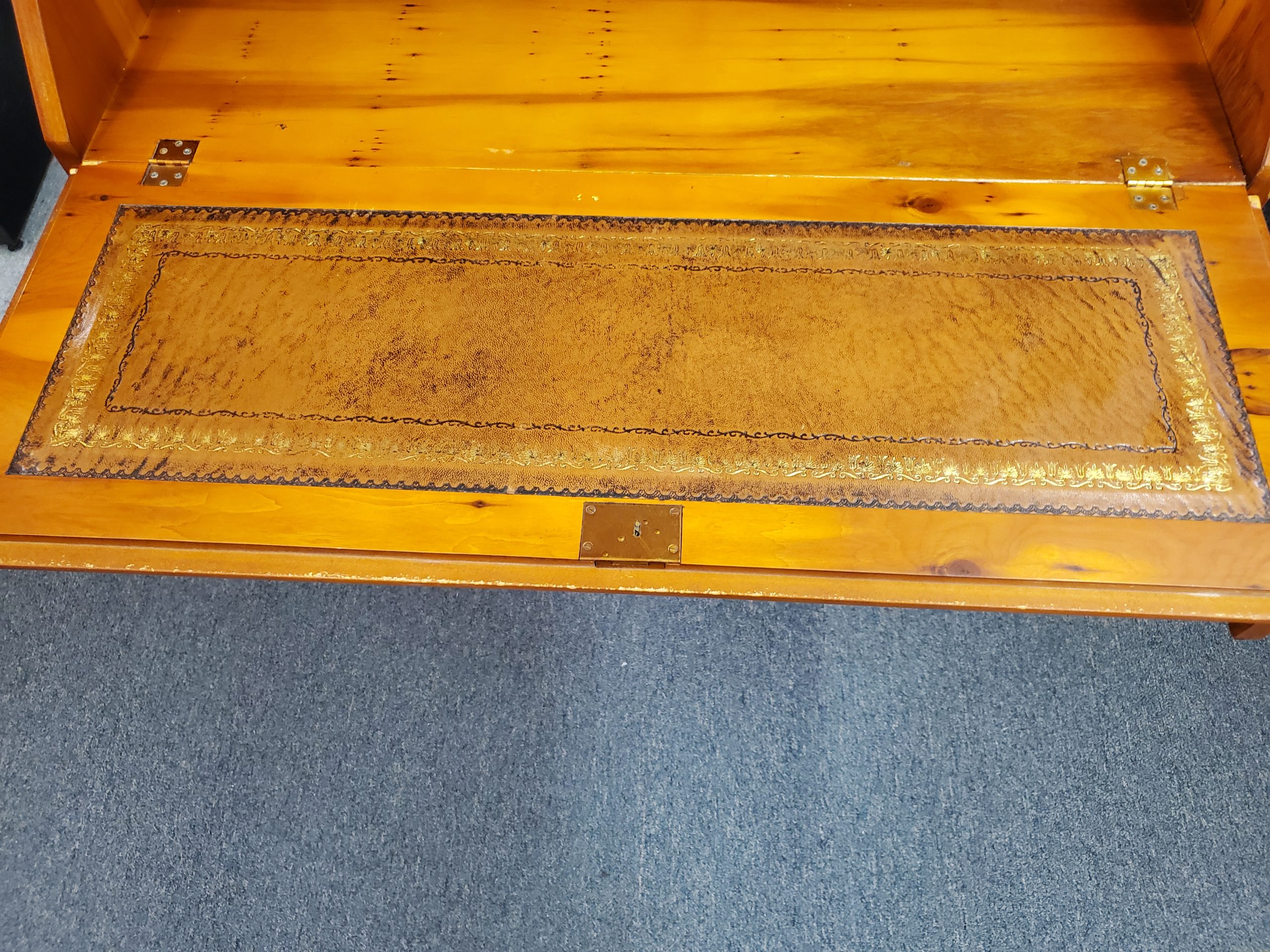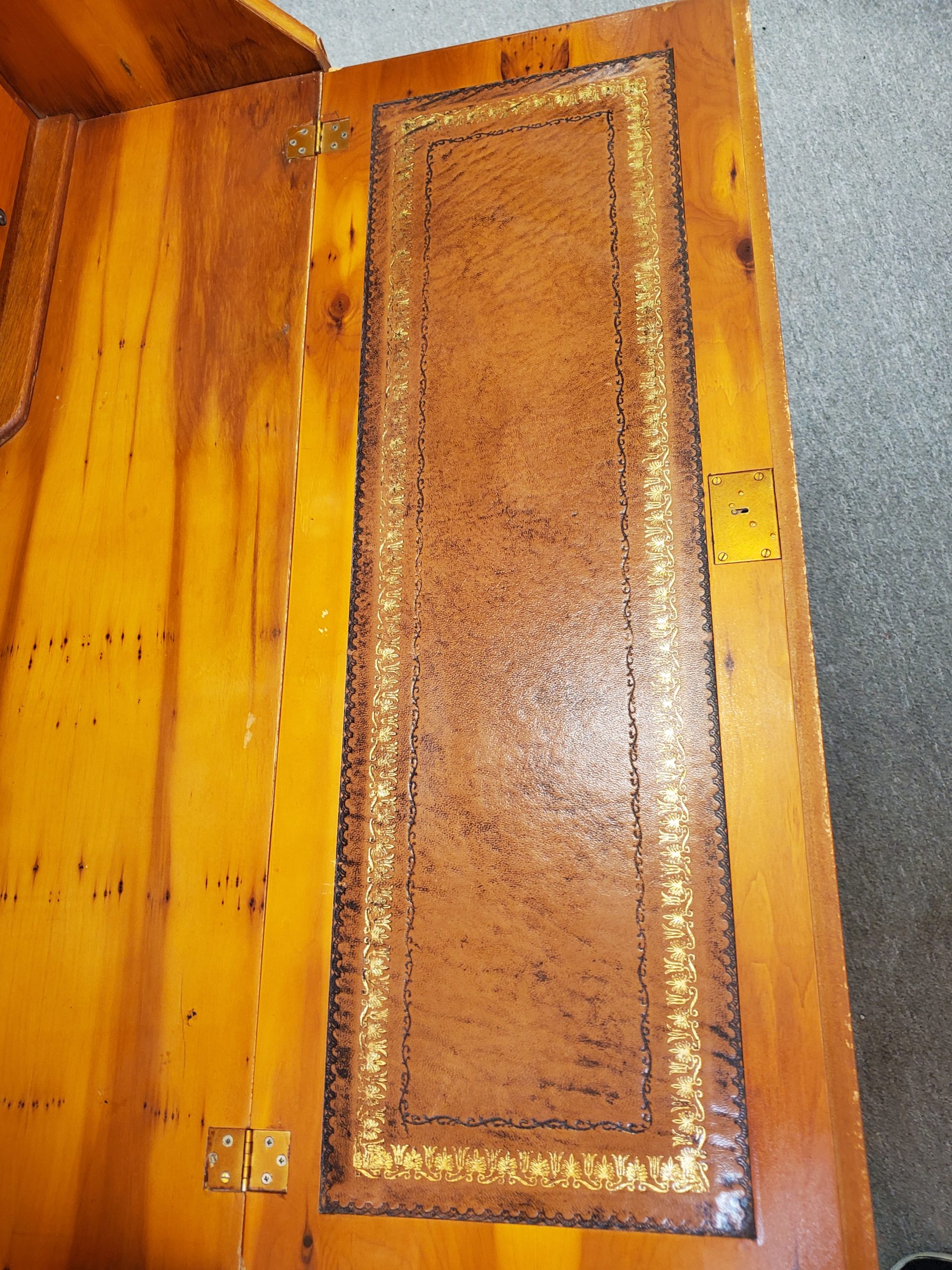 Vintage campaign chest, with four dovetail drawers, drop down has a leather insert and three small drawers and cubbies for storage, having brass hardware, from the 20th century.
