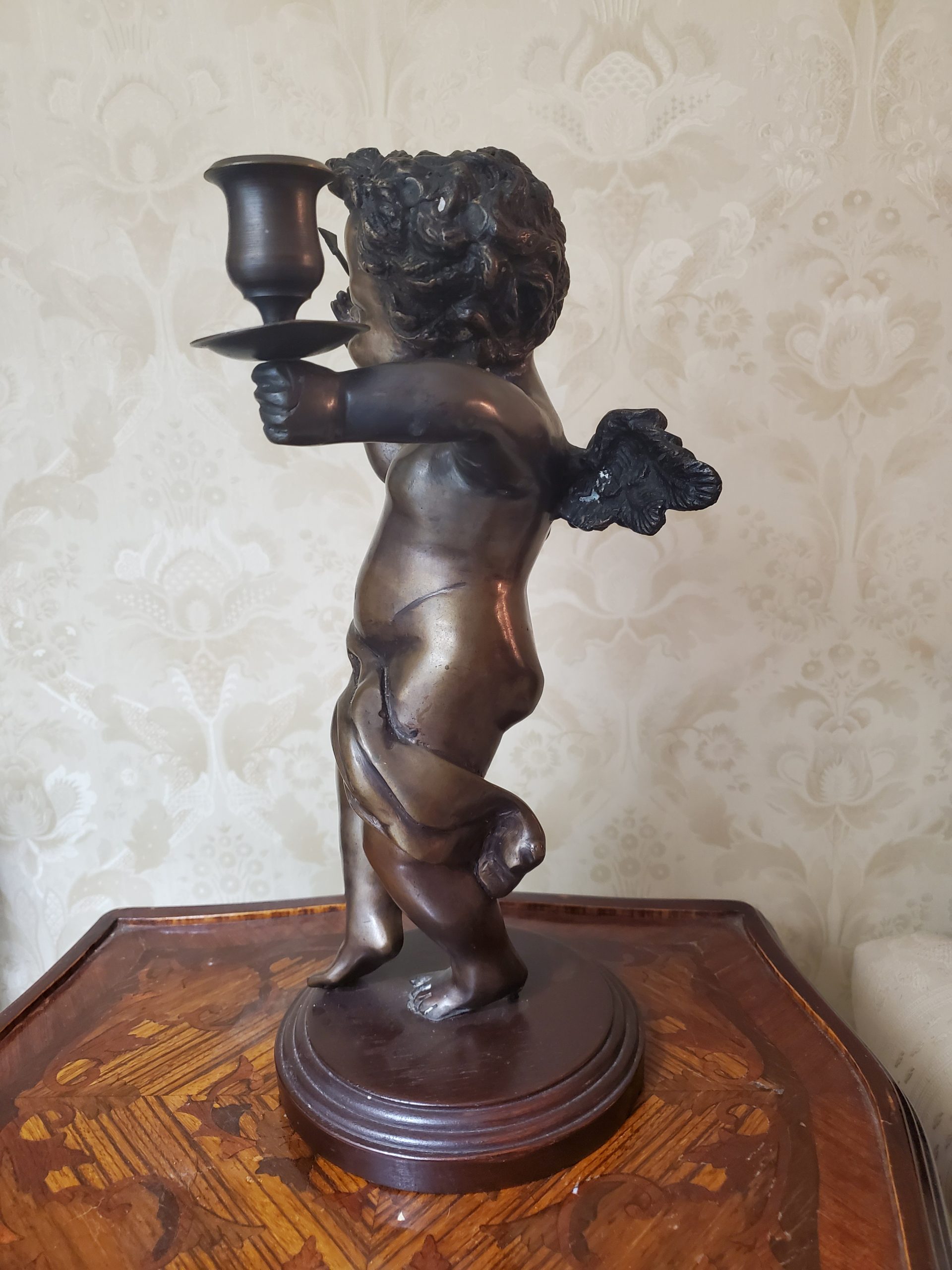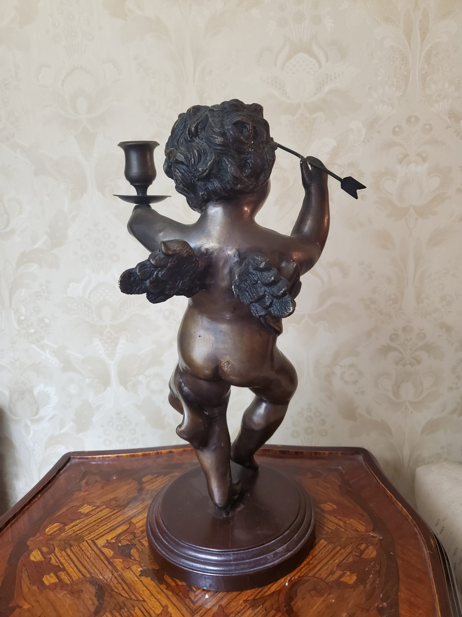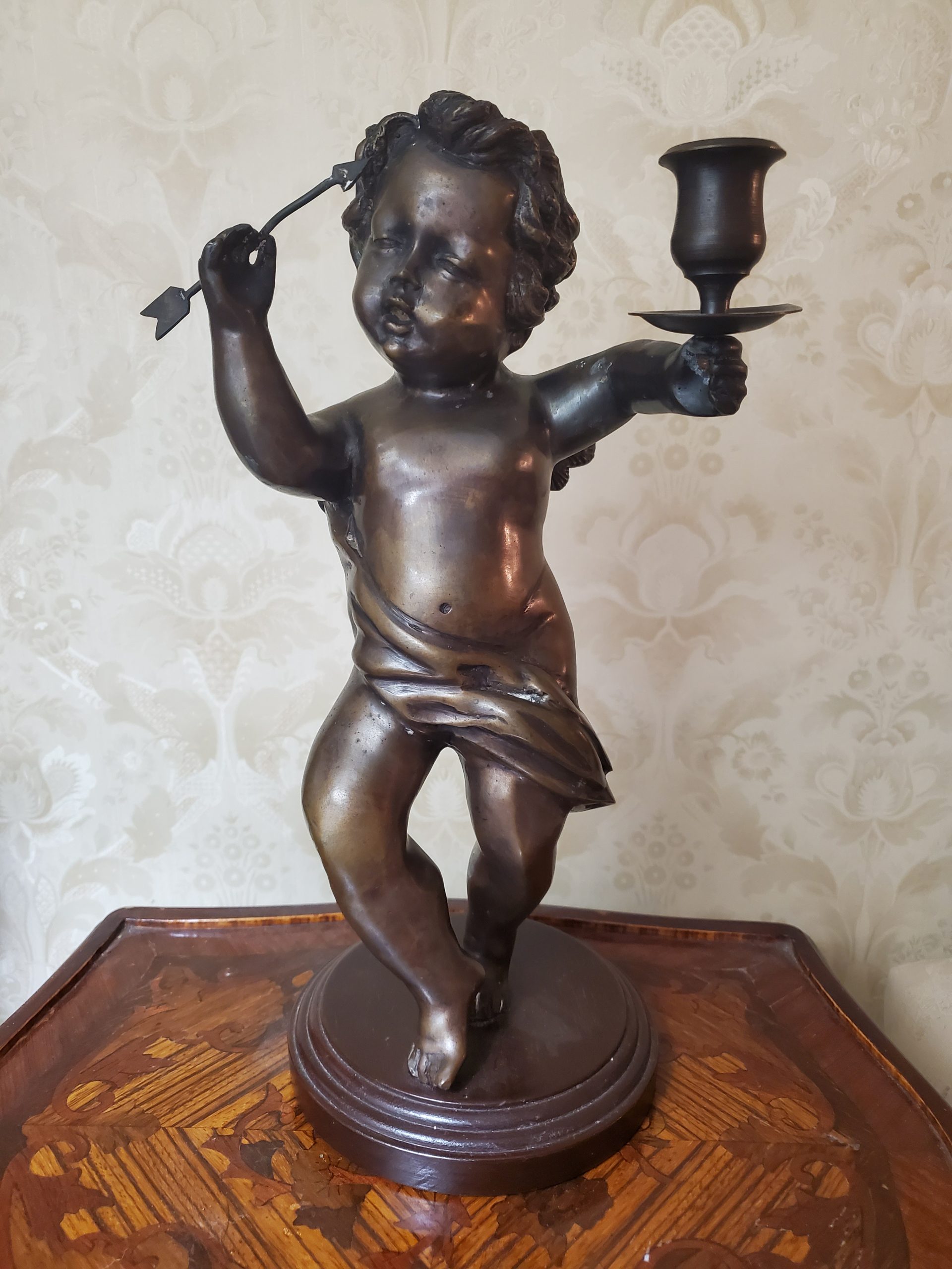A patinated bronze spelter sculpture of cupid with candle cup, modern holding an arrow in one hand and one candle cup in the other, he dances jovially with wings spread and a drape of cloth flows across his torso and hips, in contraposto, on a stepped circular wooden base.