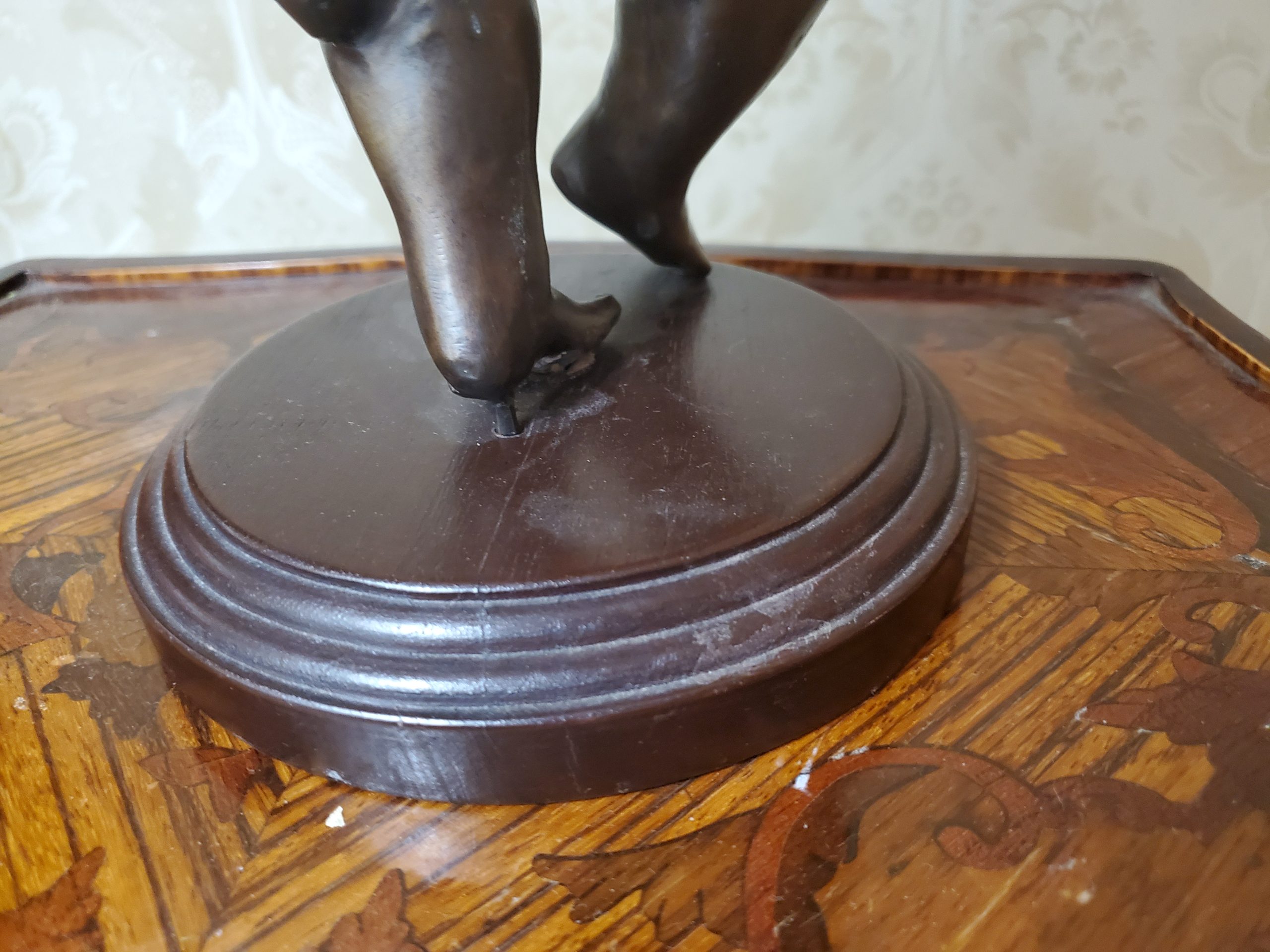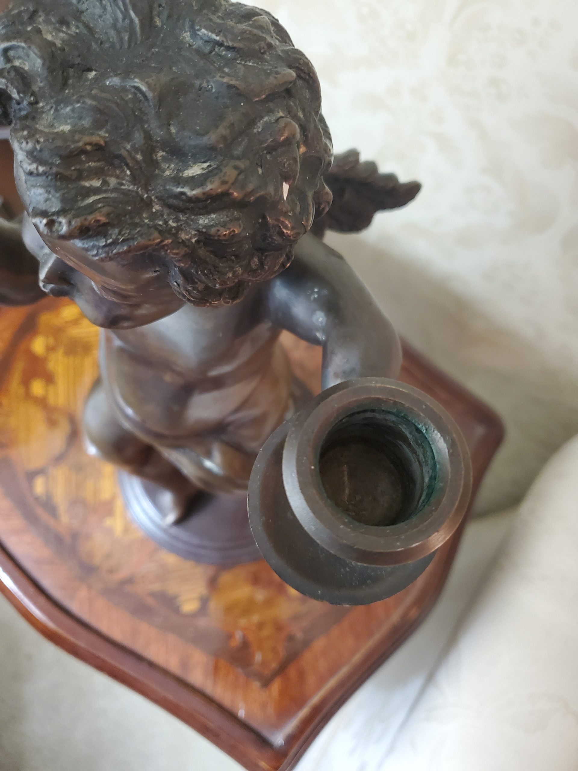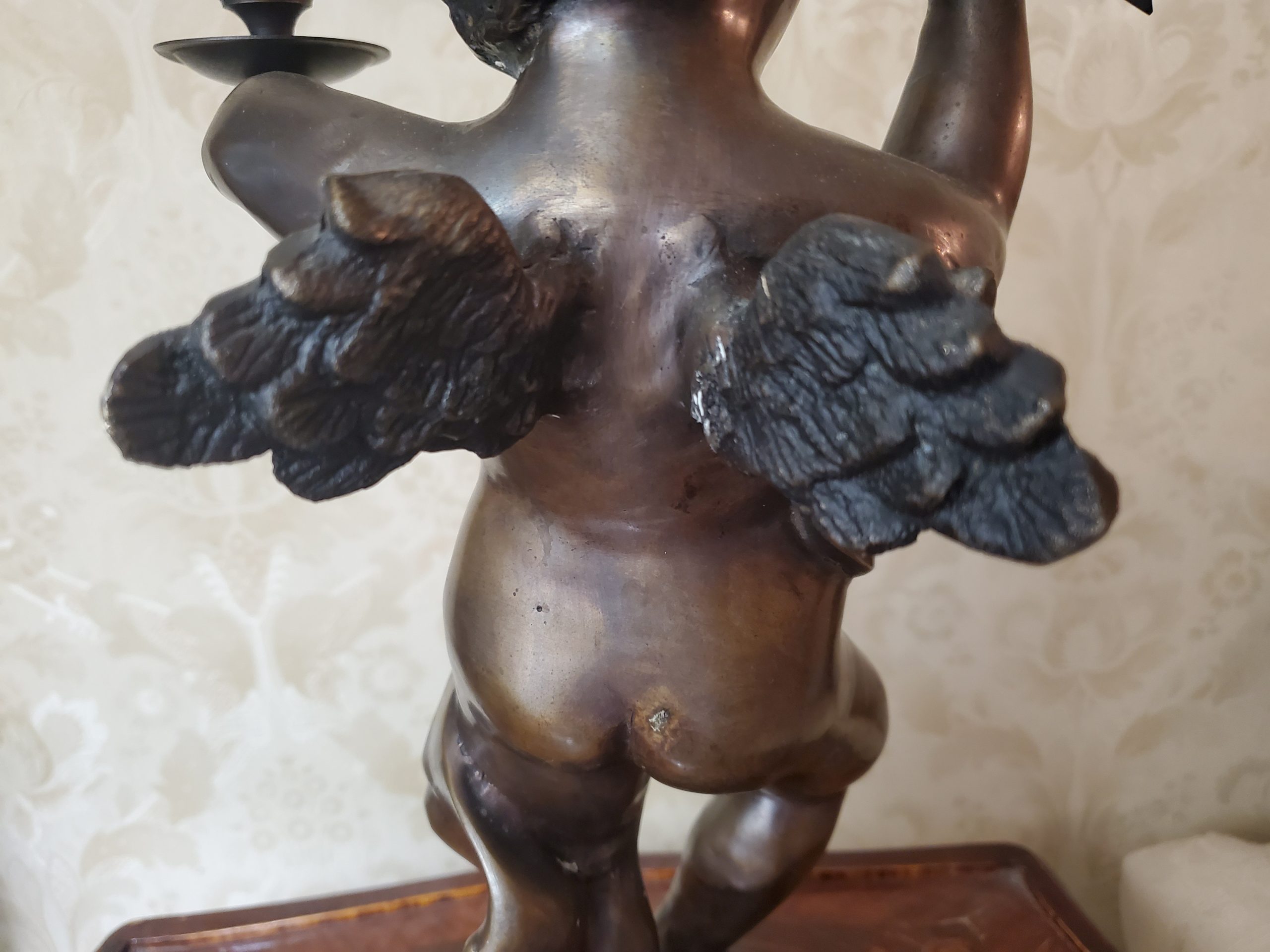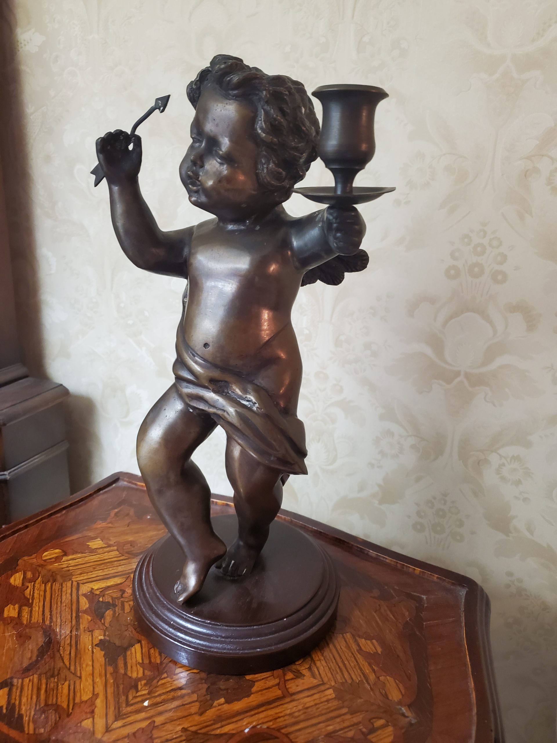 A patinated bronze spelter sculpture of cupid with candle cup, modern holding an arrow in one hand and one candle cup in the other, he dances jovially with wings spread and a drape of cloth flows across his torso and hips, in contraposto, on a stepped circular wooden base.