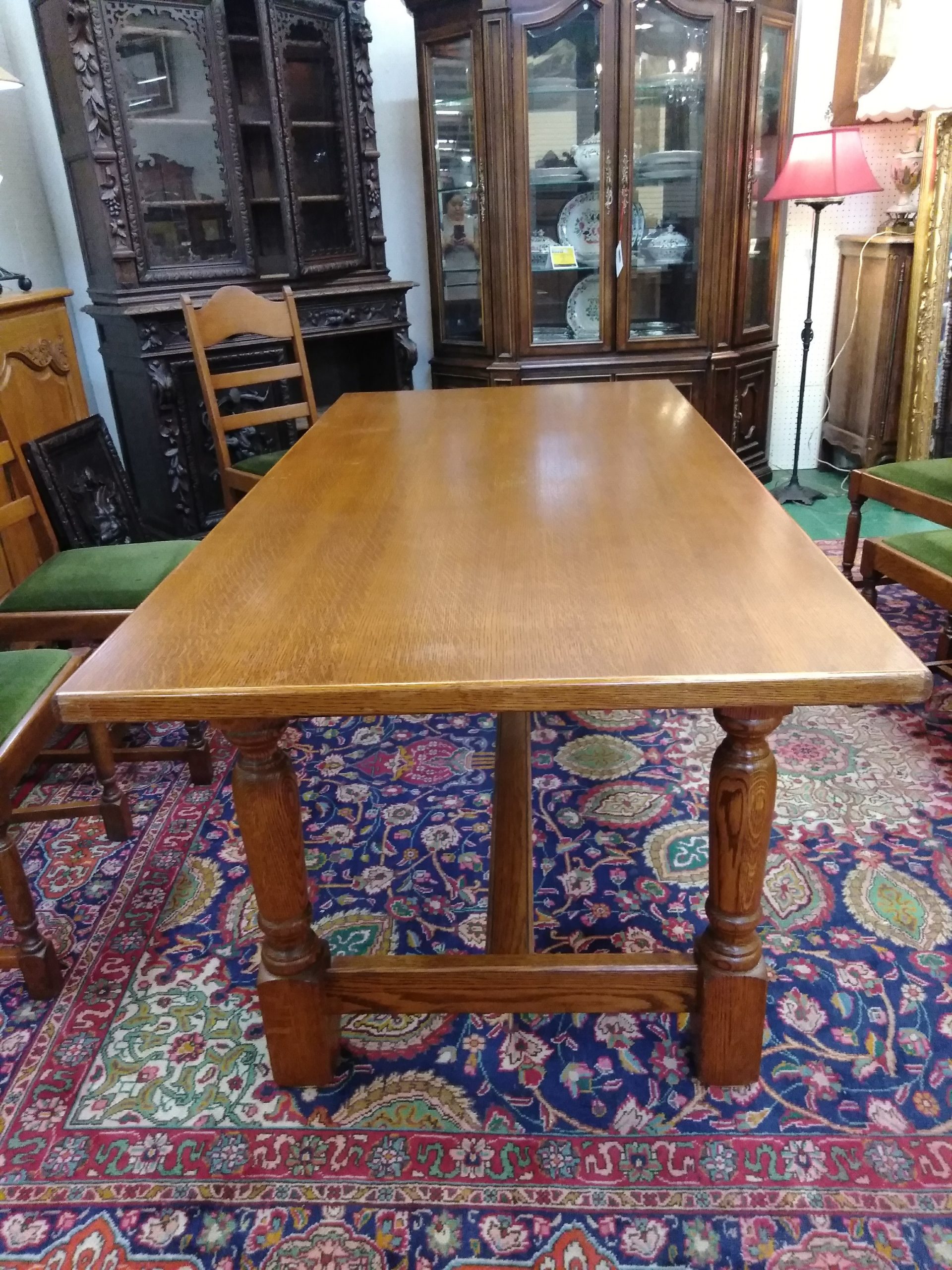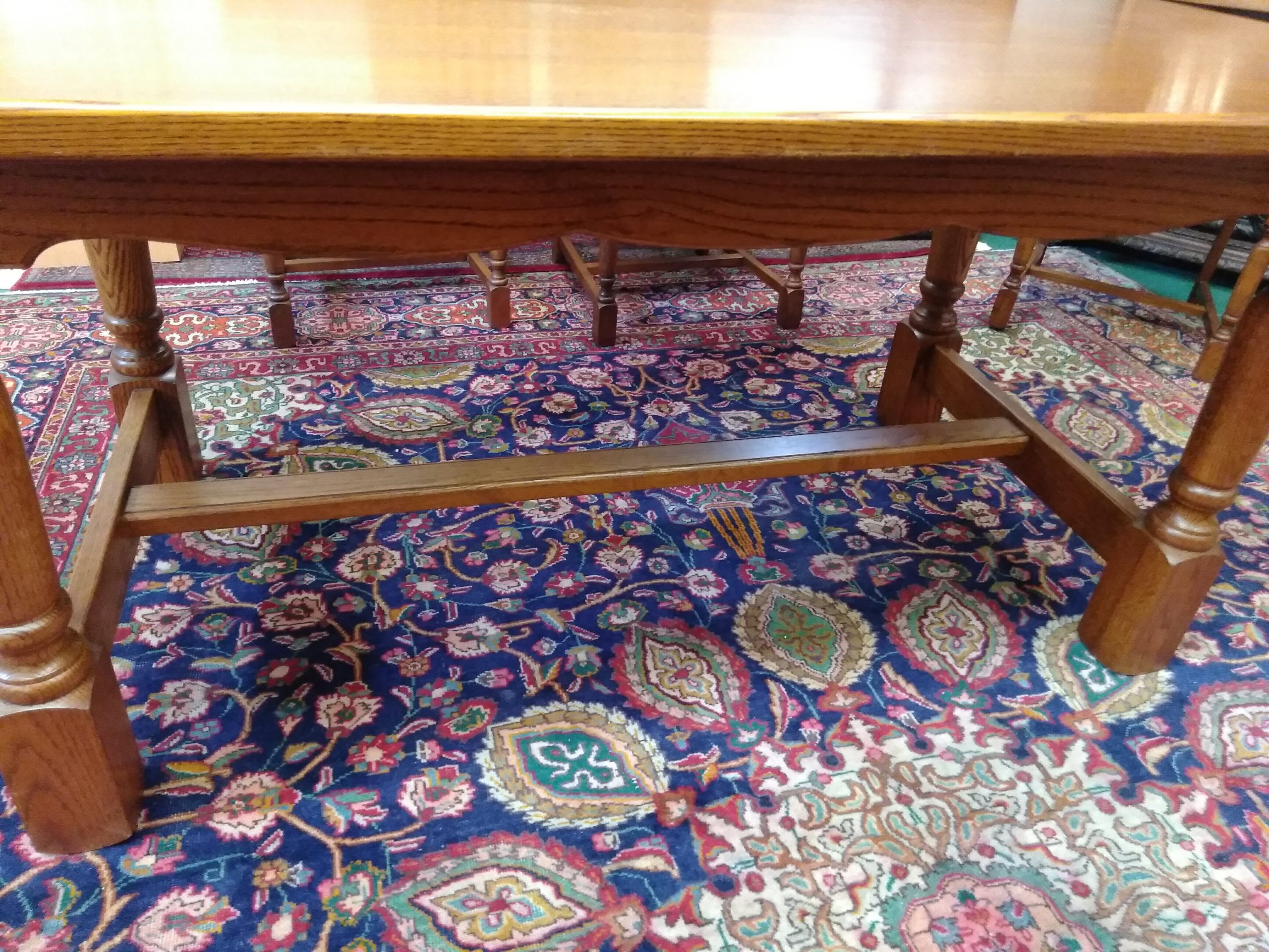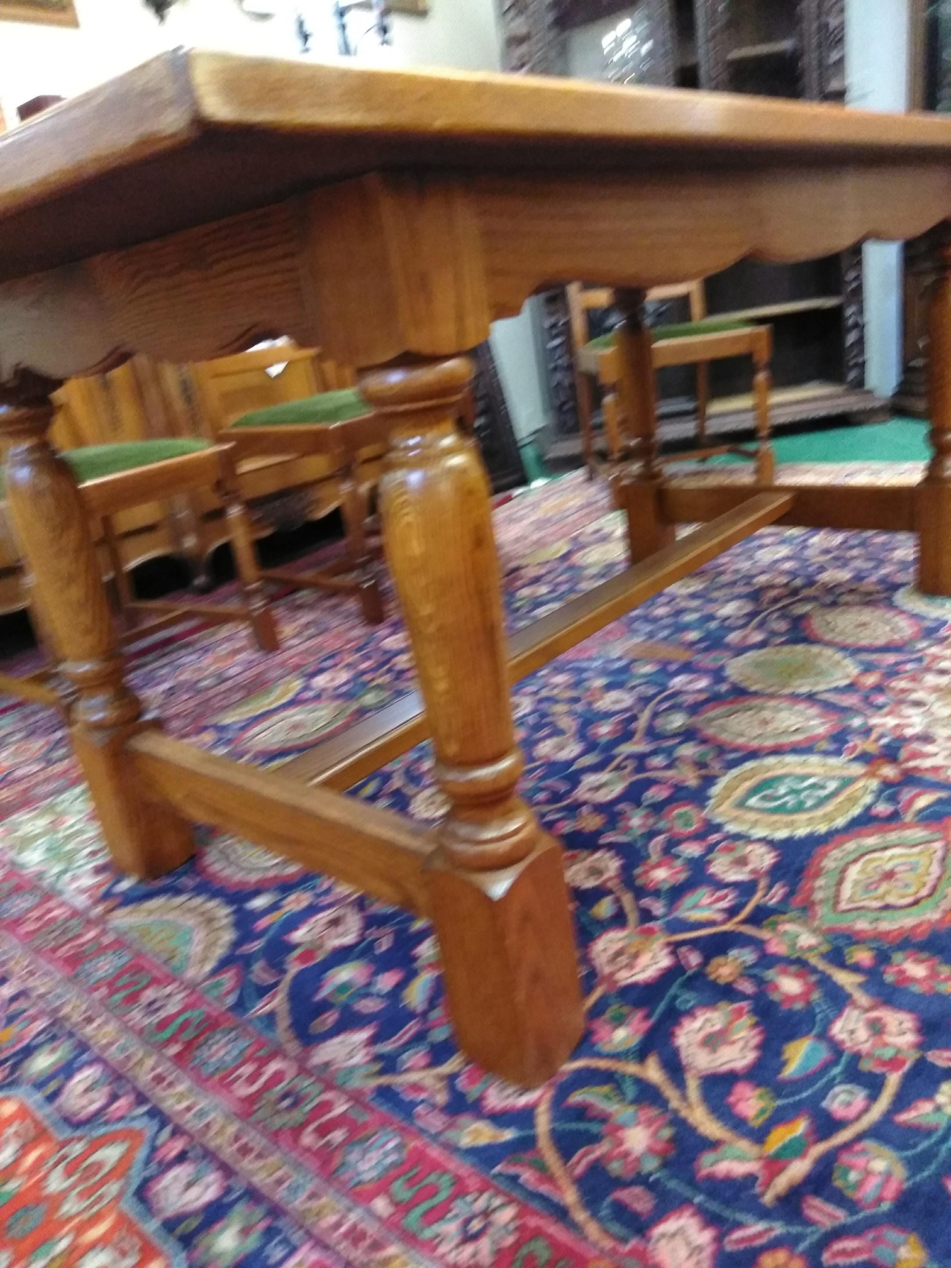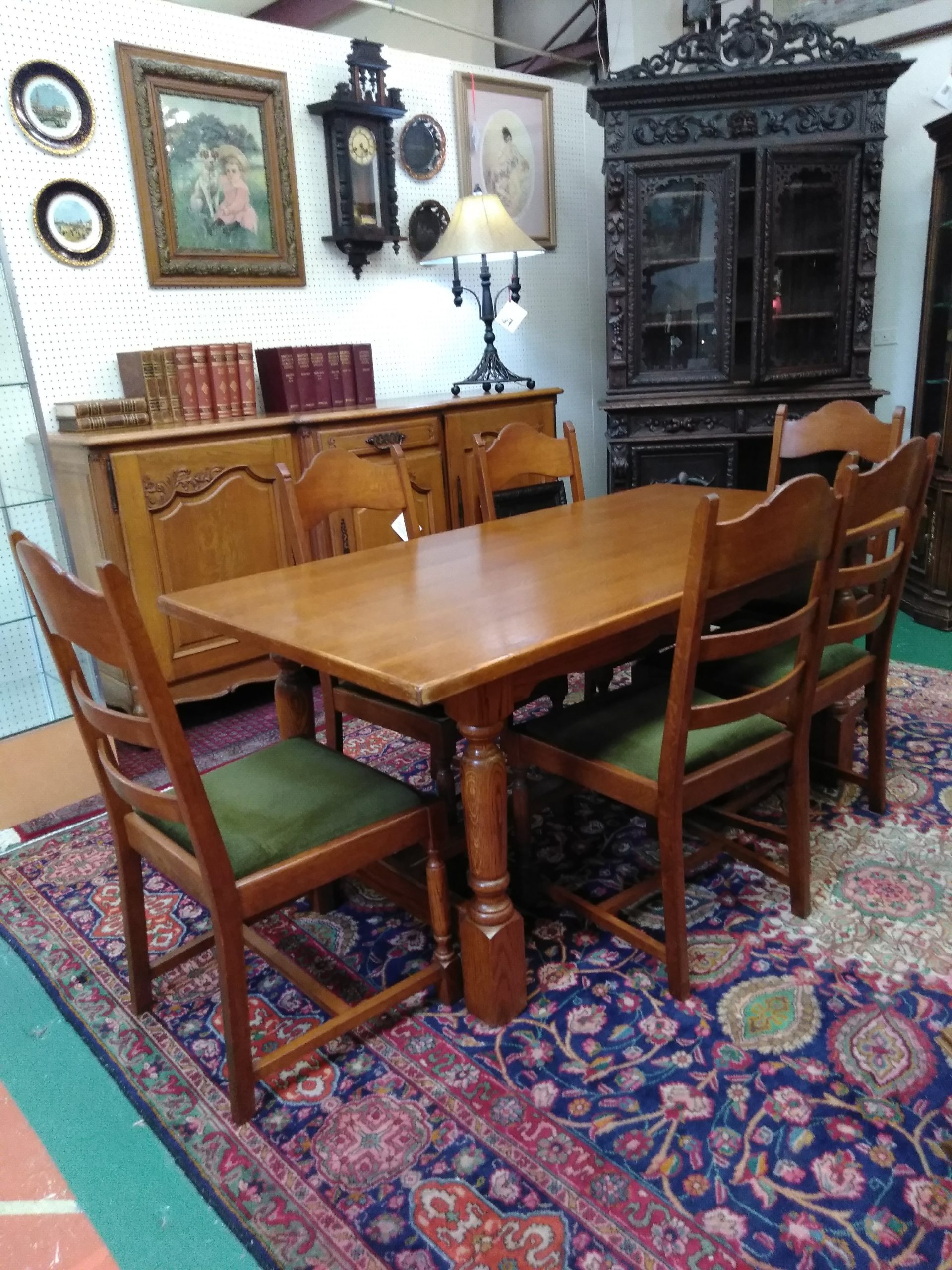 Vintage oak French farm table with trestle base and curved apron, including six matching oak chairs with vertical slats, green cushions, and H-stretcher.