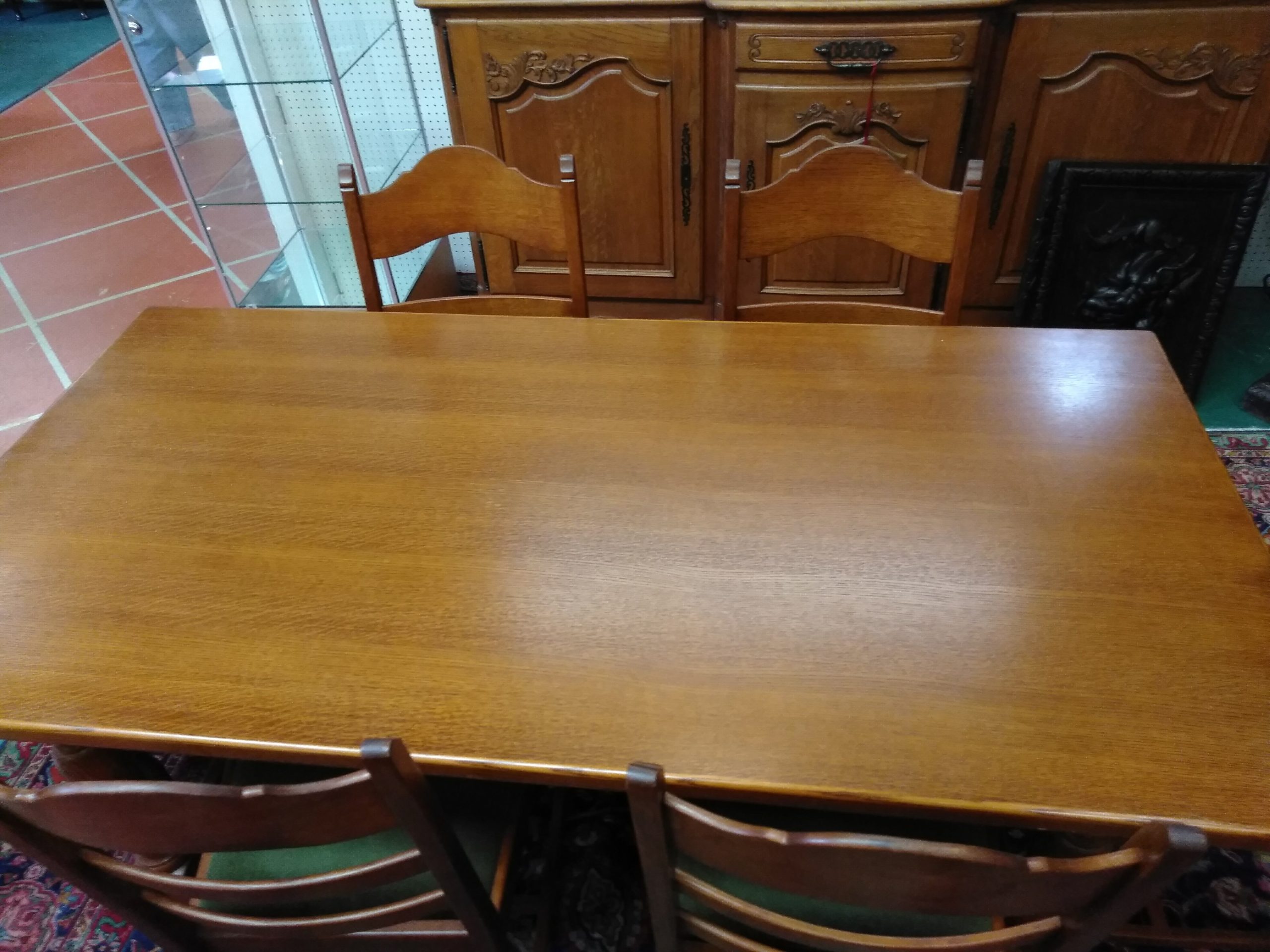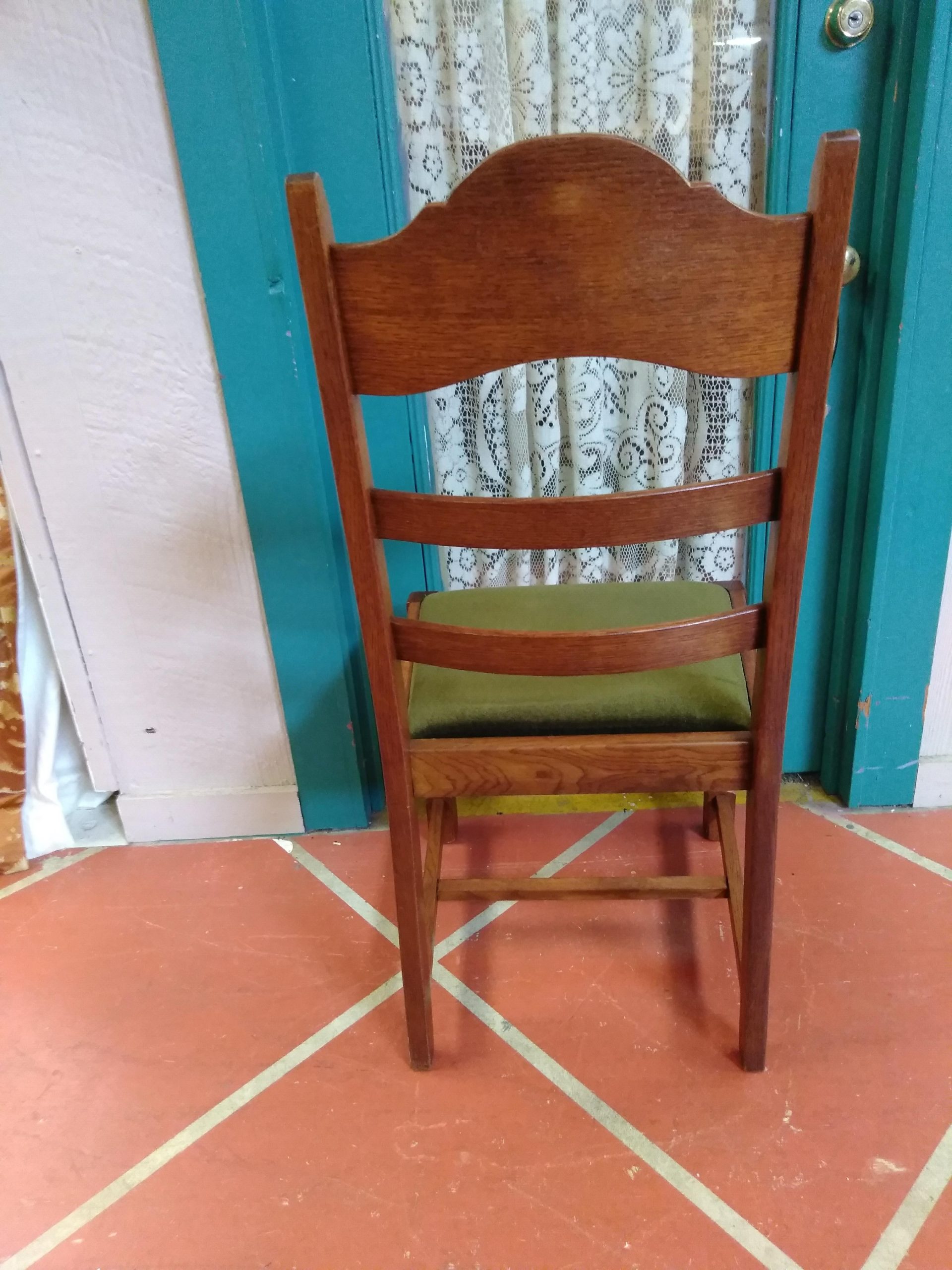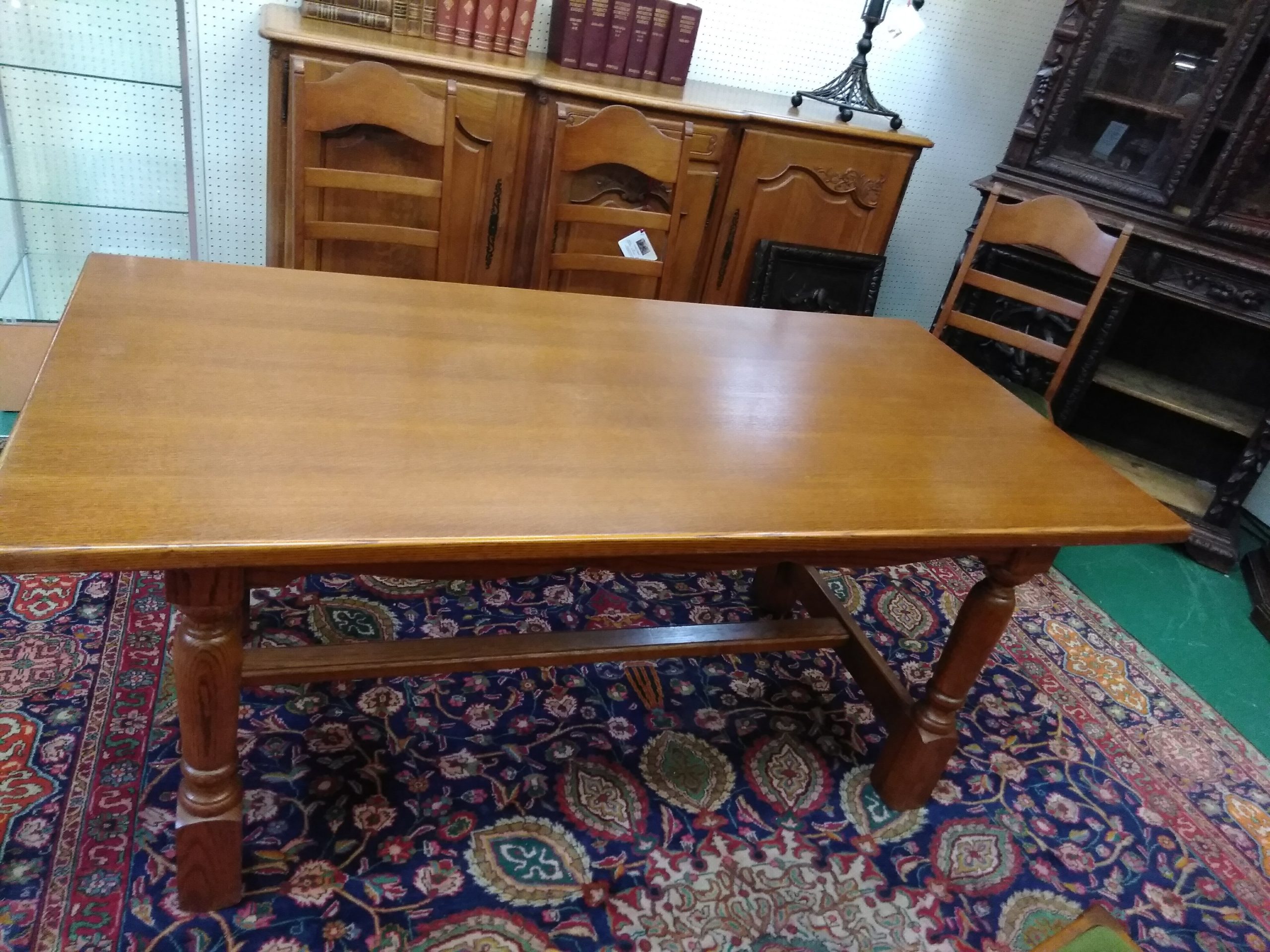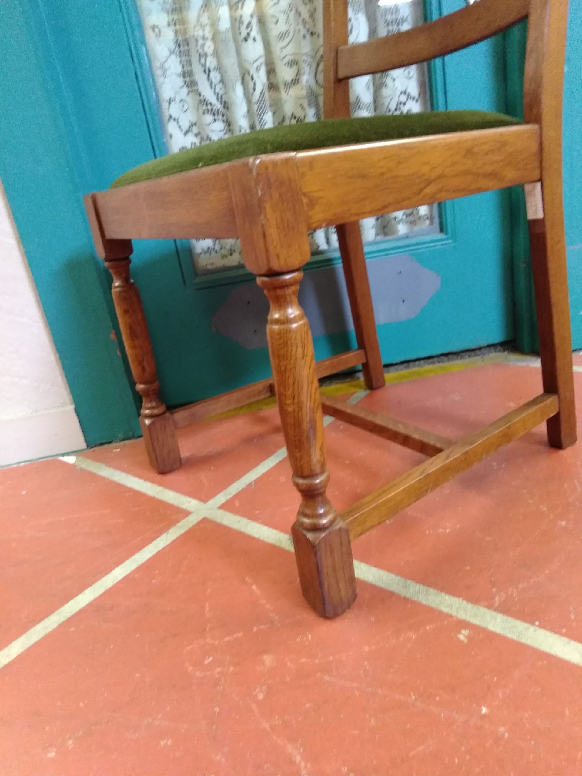 Vintage oak French farm table with trestle base and curved apron, including six matching oak chairs with vertical slats, green cushions, and H-stretcher.