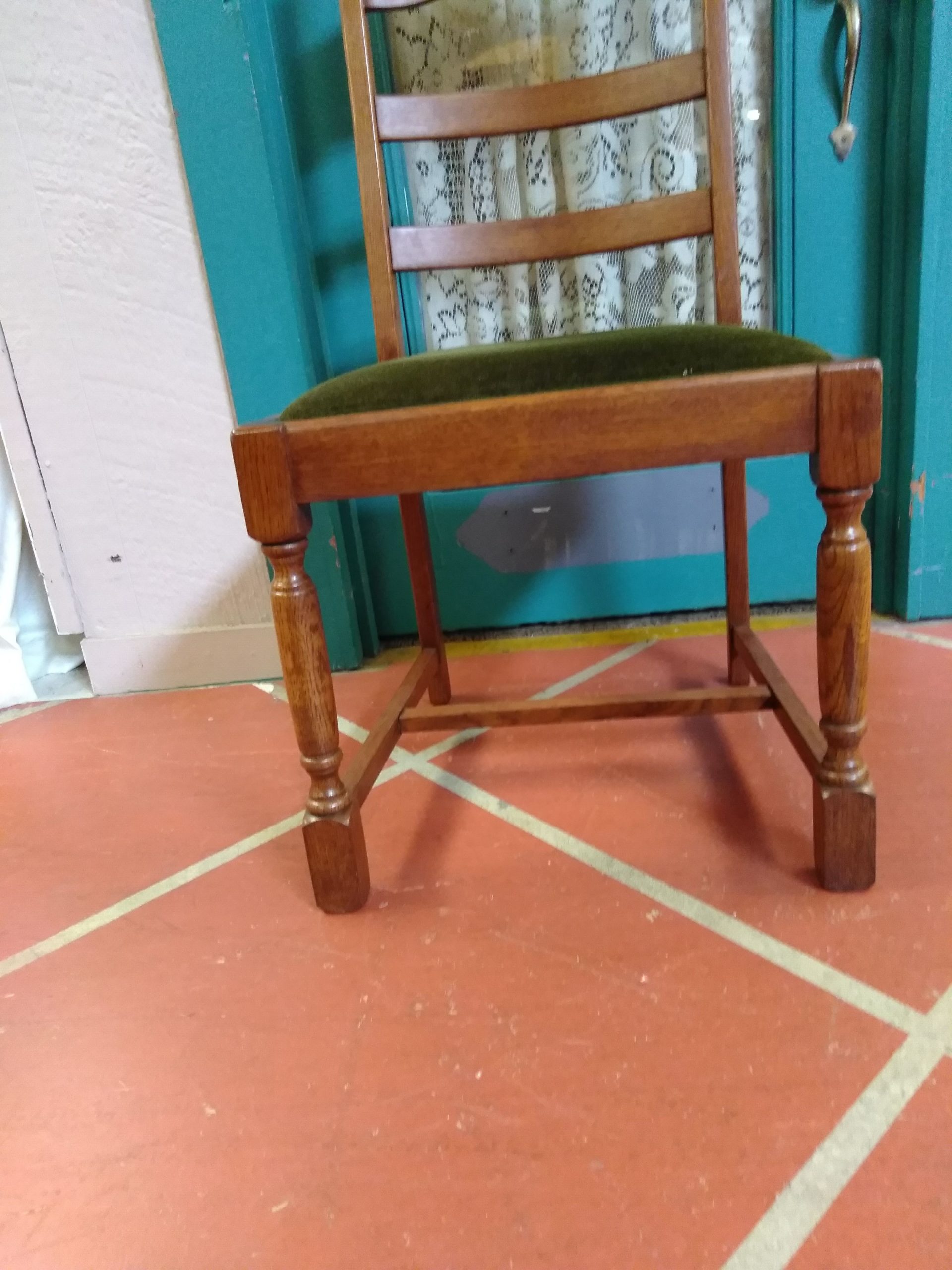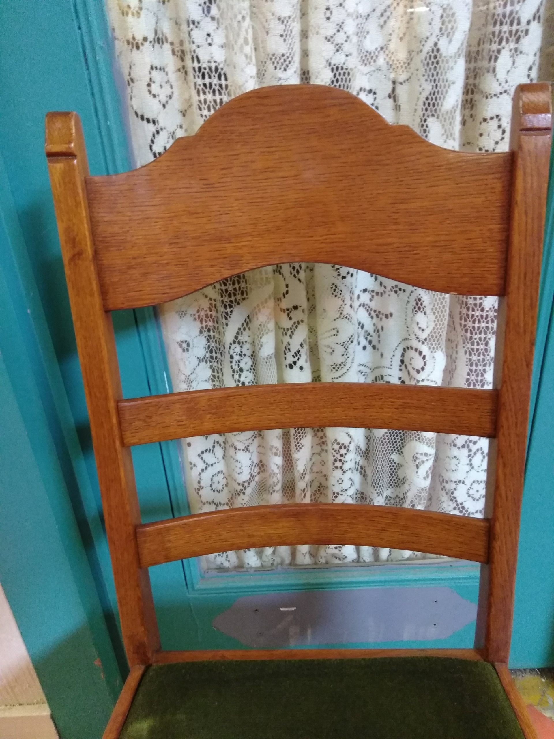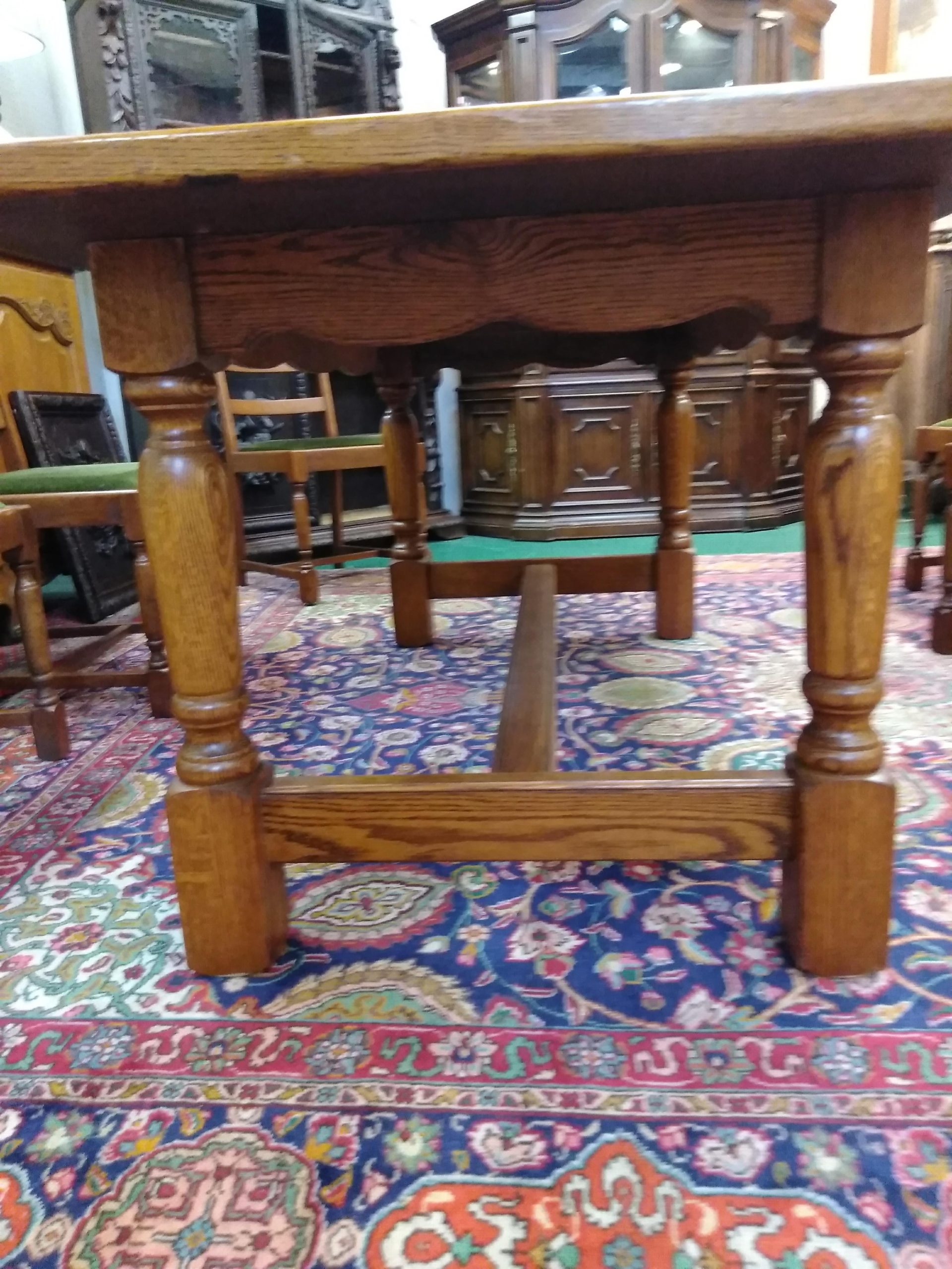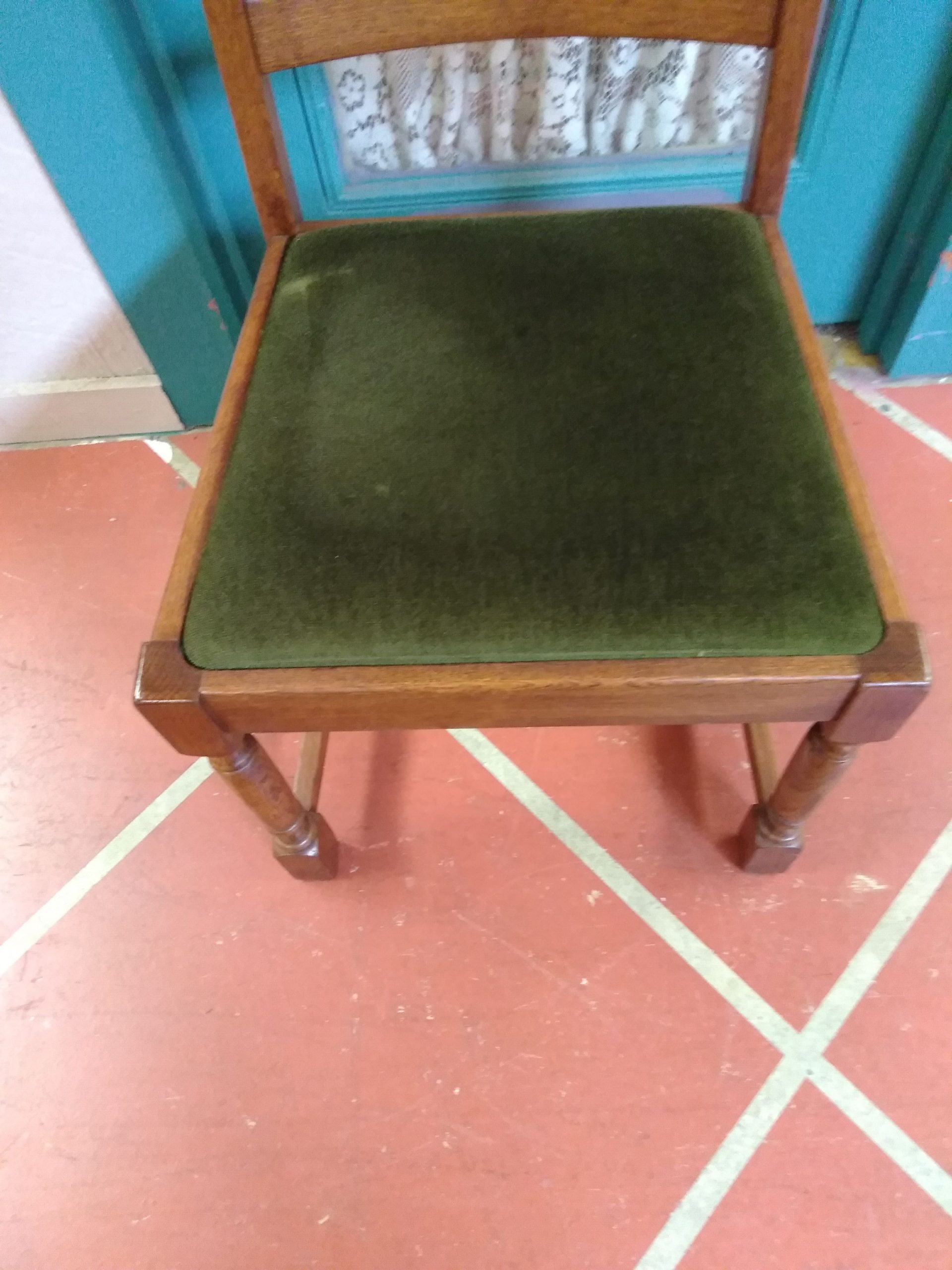Vintage oak French farm table with trestle base and curved apron, including six matching oak chairs with vertical slats, green cushions, and H-stretcher.
