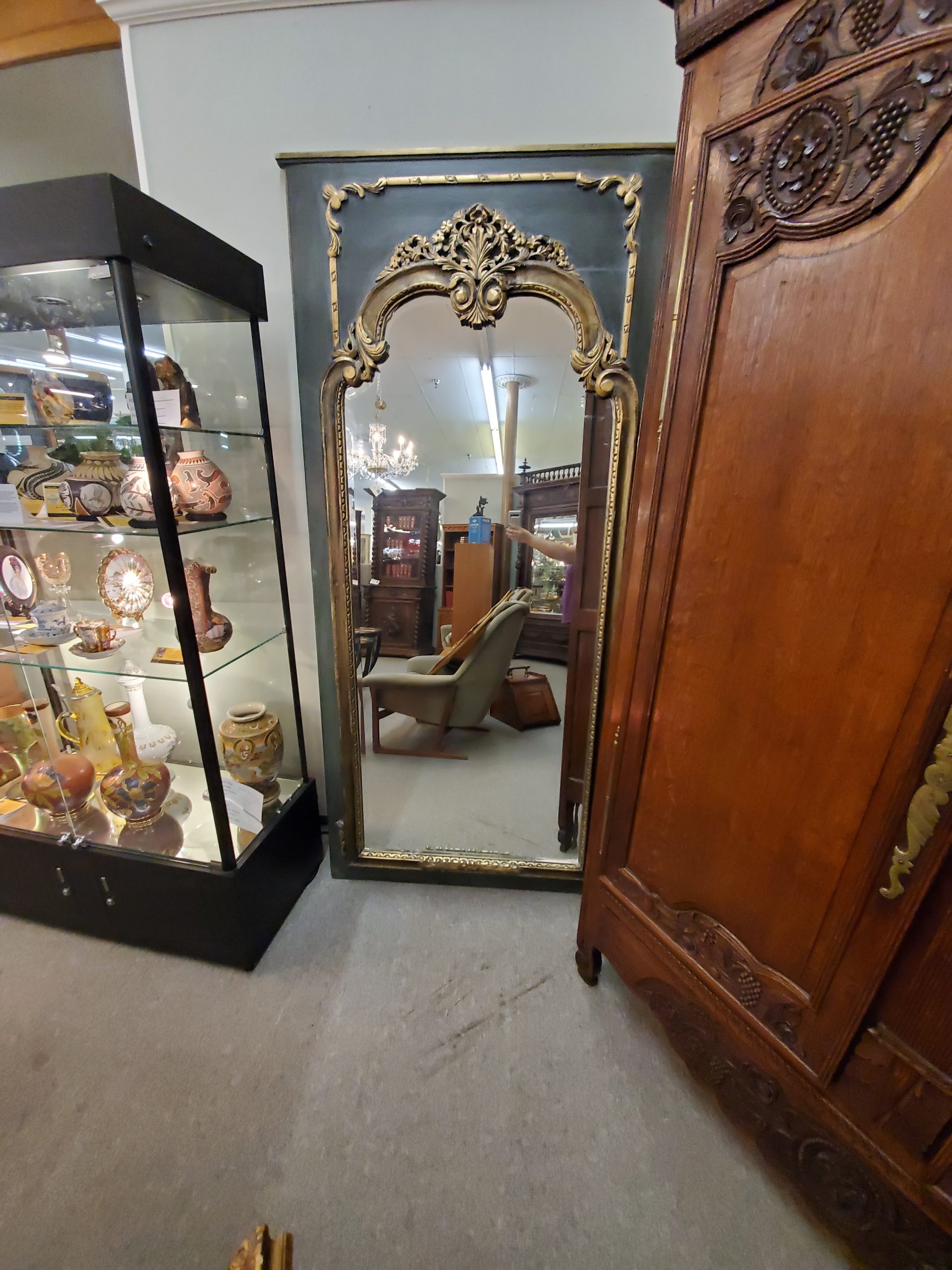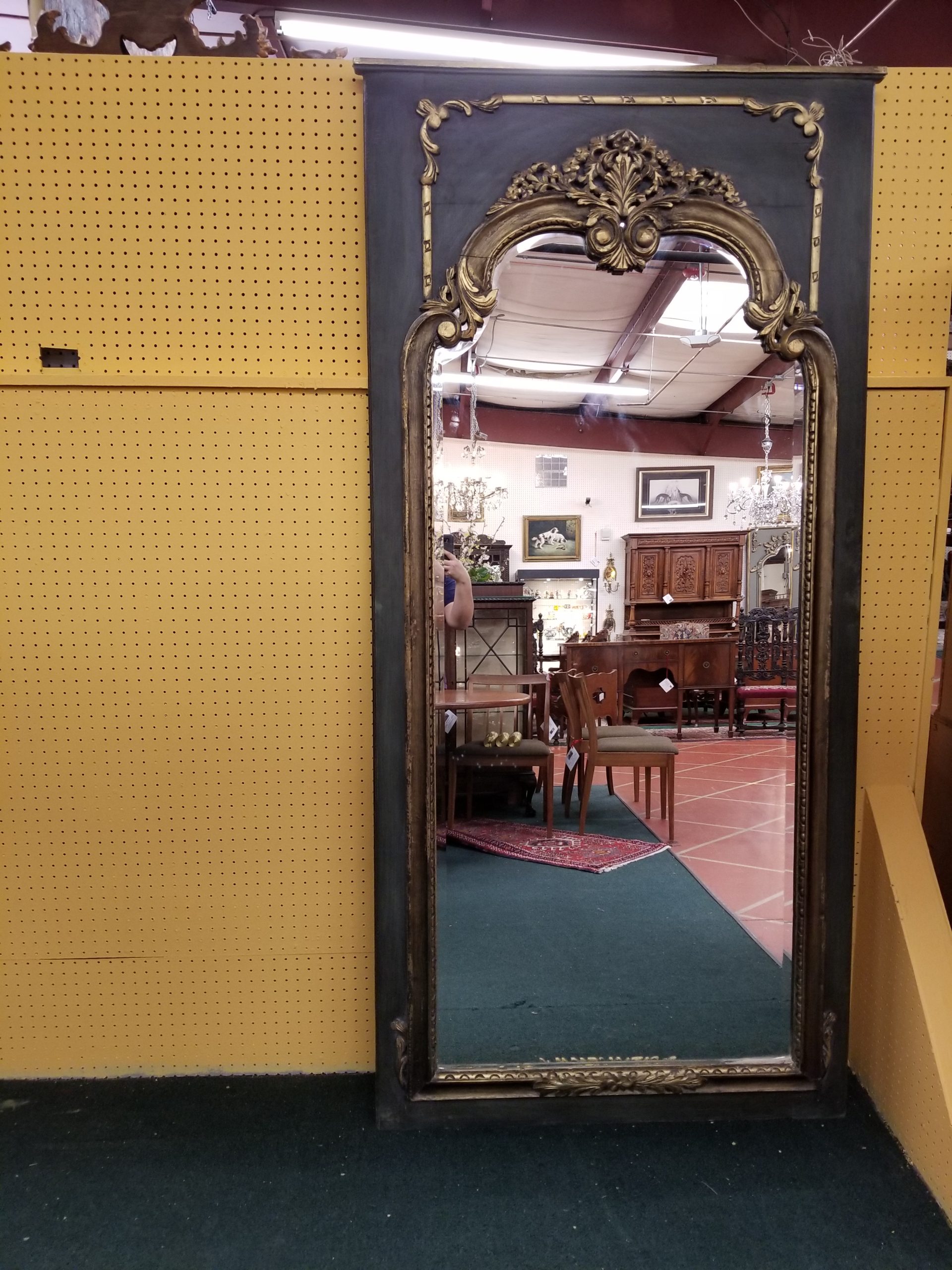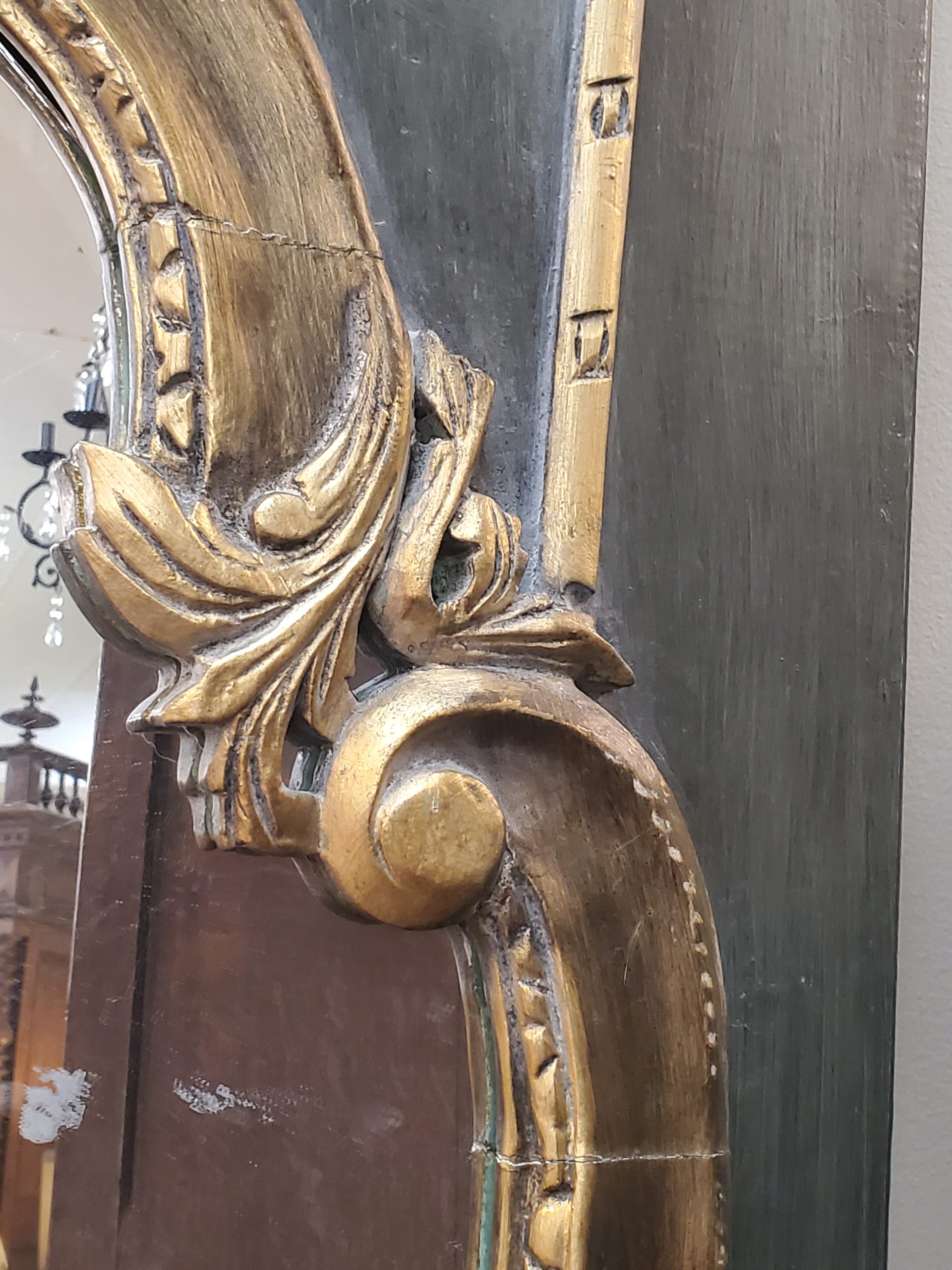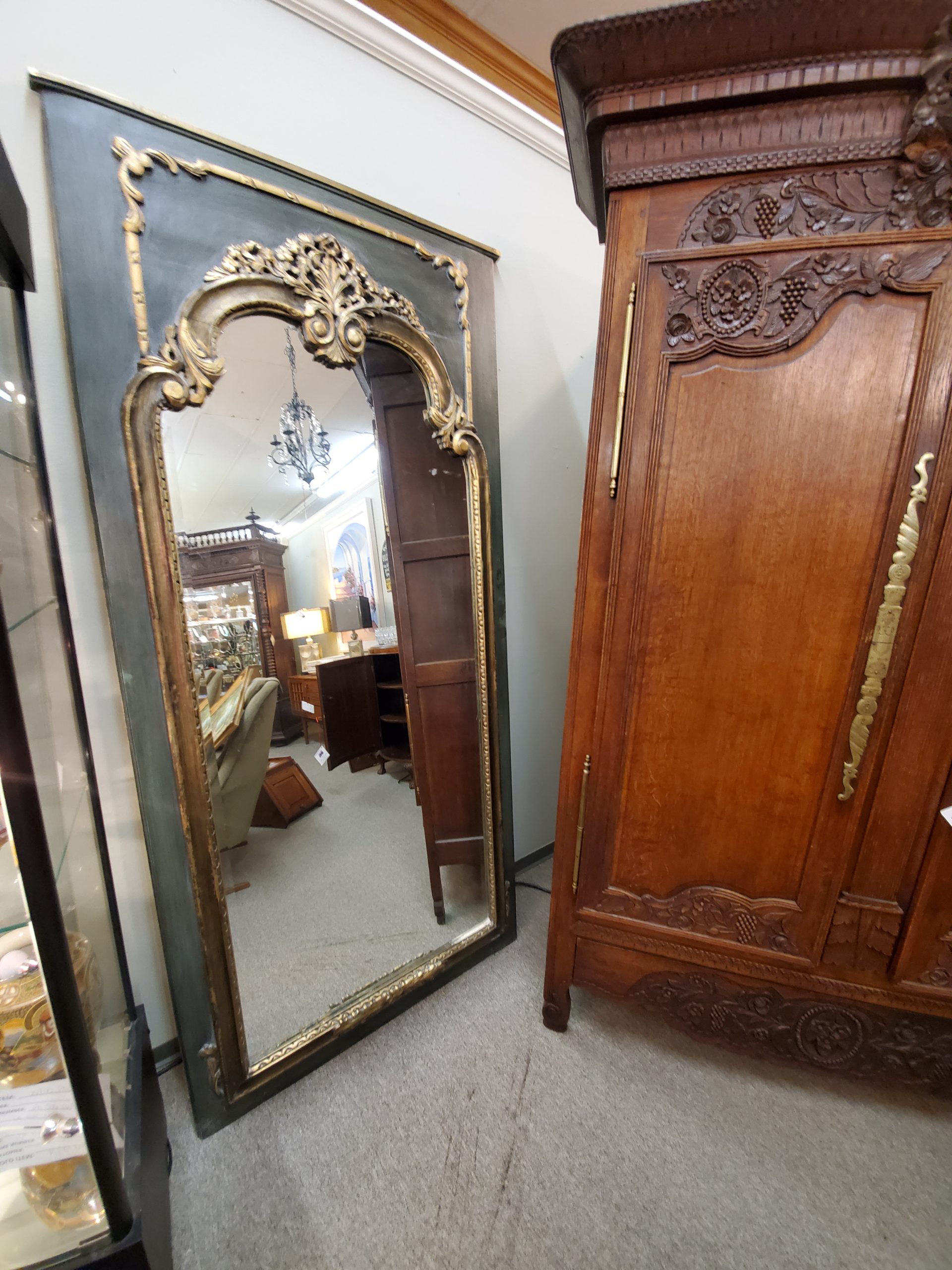 Vintage floor length mirror with beveled edge on a green wood frame and gold trim.